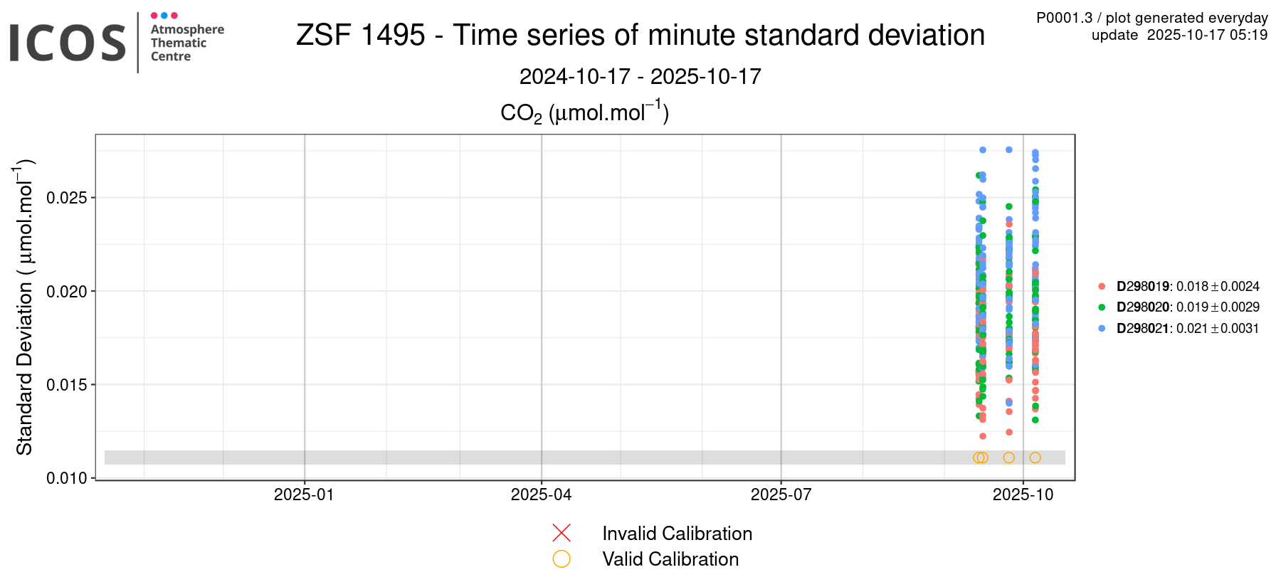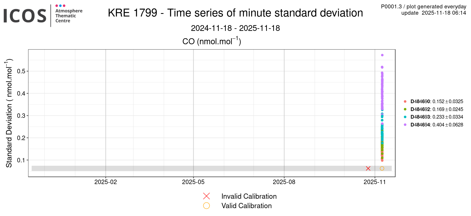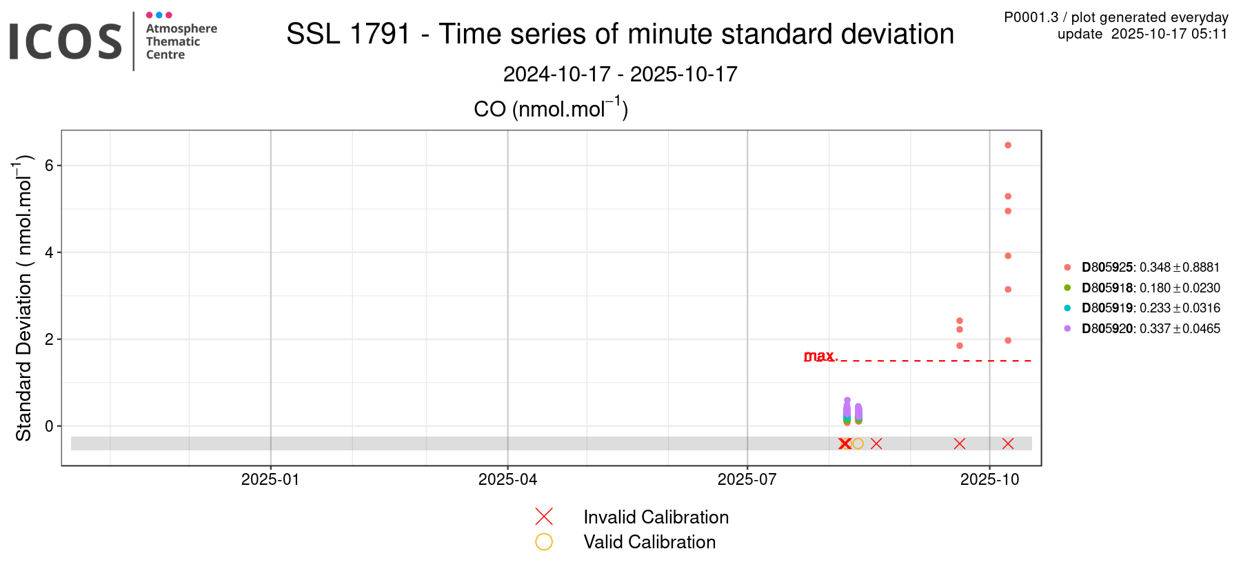 P0001.3 product displays a timeseries of calibration's tanks' minute standard deviation (SD). Each point is the minute mean of a tank's injection. Invalid data are not displayed, except if they are invalidated because the standard deviation exceeds the red-dotted-line threshold. Data used: - Type: calibration data - Timeframe: rolling one-year - Tanks: all calibrations tanks connected to the instrument in the site - Y-axis: standard deviation - Points: each point is the minute mean of a tank's injection - Flag filtering: exclusion of data which have an invalid flag for a reason other than "Minute standard deviation" (i.e. the data flagged invalid because the standard deviation exceeds the defined threshold are displayed in this plot) - Red line: all points above this threshold are automatically flagged invalid