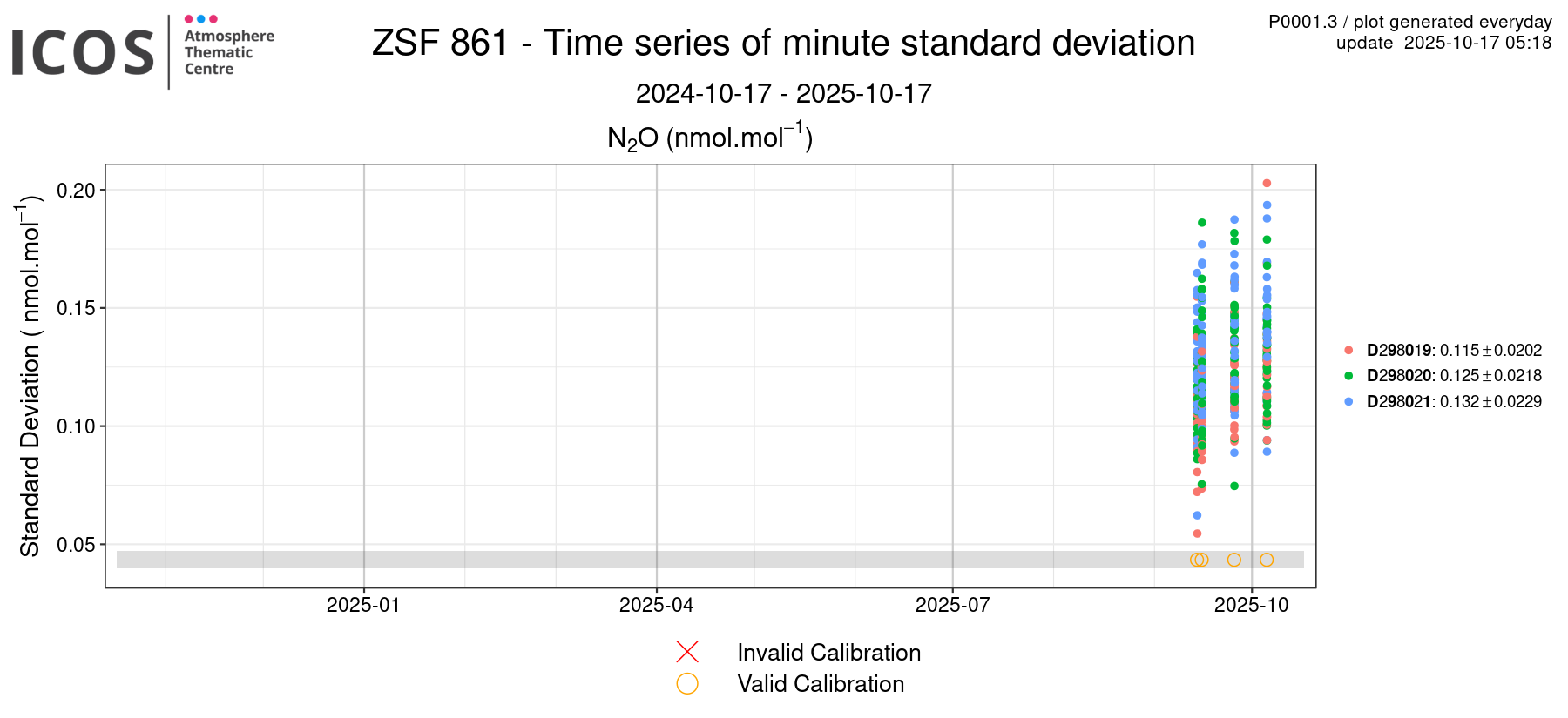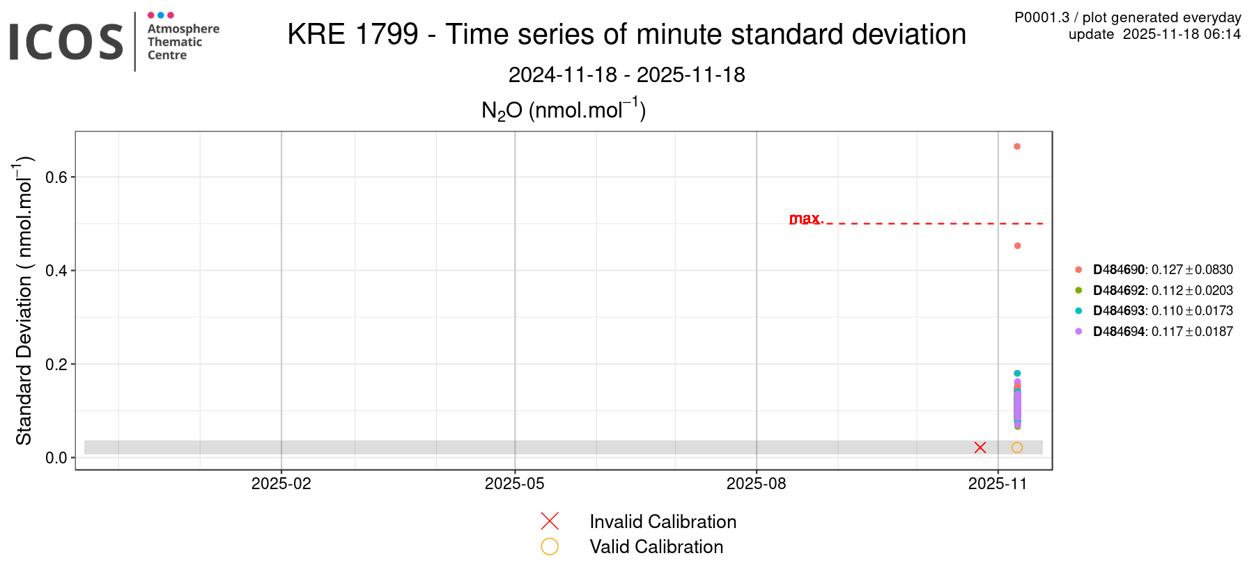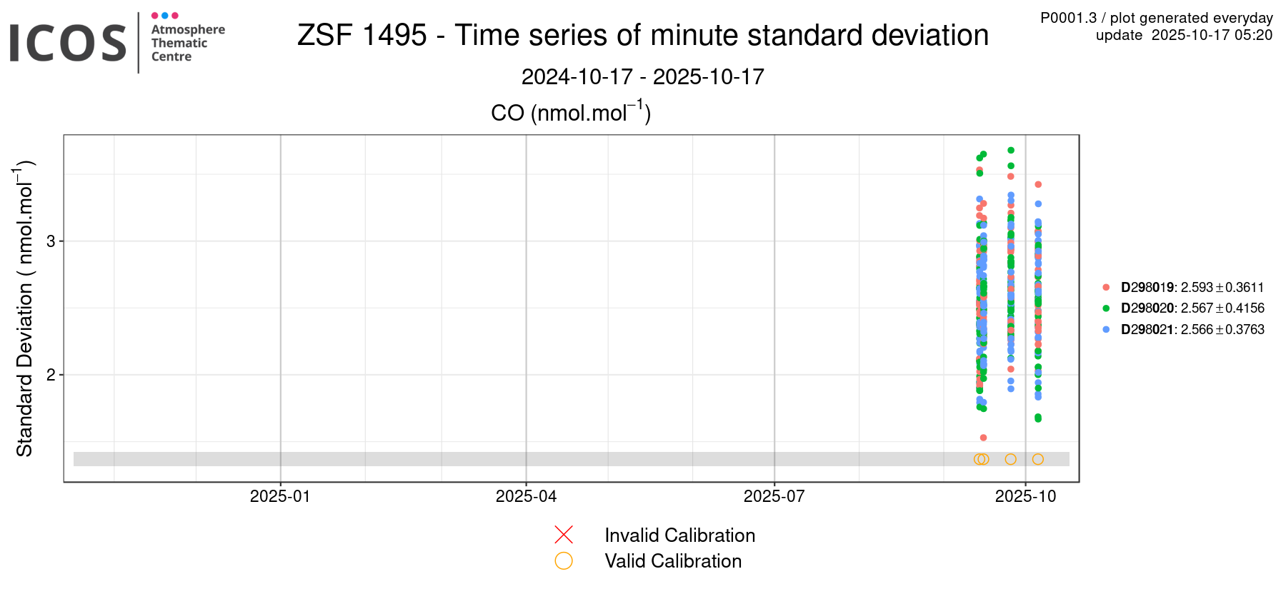 P0001.3 product displays a timeseries of calibration's tanks' minute standard deviation (SD). Each point is the minute mean of a tank's injection. Invalid data are not displayed, except if they are invalidated because the standard deviation exceeds the red-dotted-line threshold. Data used: - Type: calibration data - Timeframe: rolling one-year - Tanks: all calibrations tanks connected to the instrument in the site - Y-axis: standard deviation - Points: each point is the minute mean of a tank's injection - Flag filtering: exclusion of data which have an invalid flag for a reason other than "Minute standard deviation" (i.e. the data flagged invalid because the standard deviation exceeds the defined threshold are displayed in this plot) - Red line: all points above this threshold are automatically flagged invalid