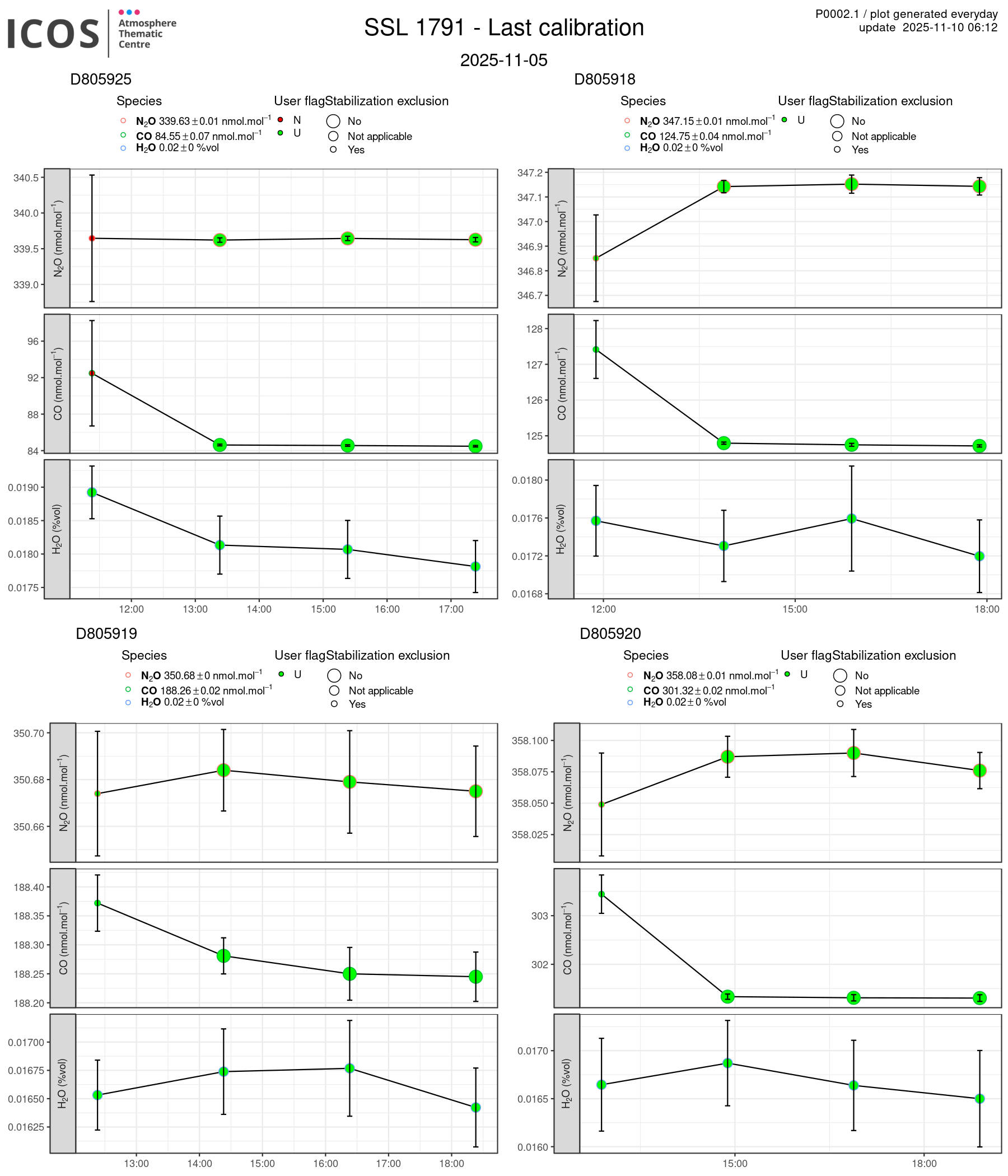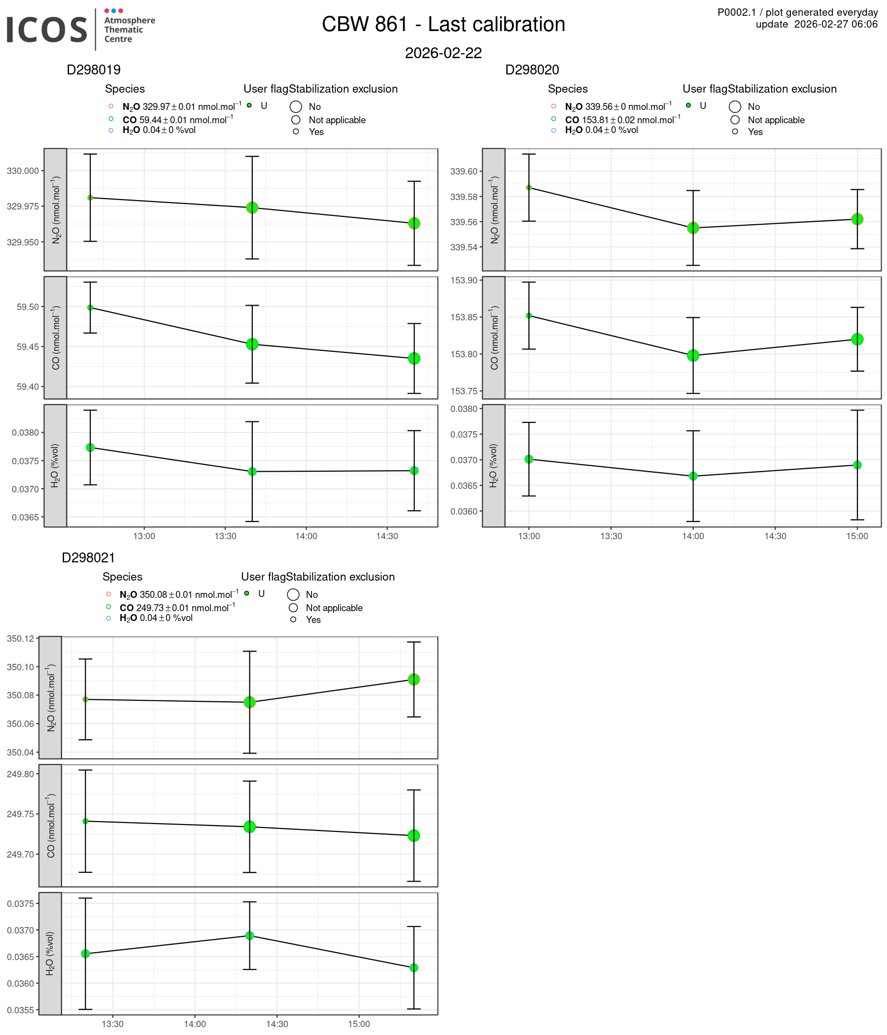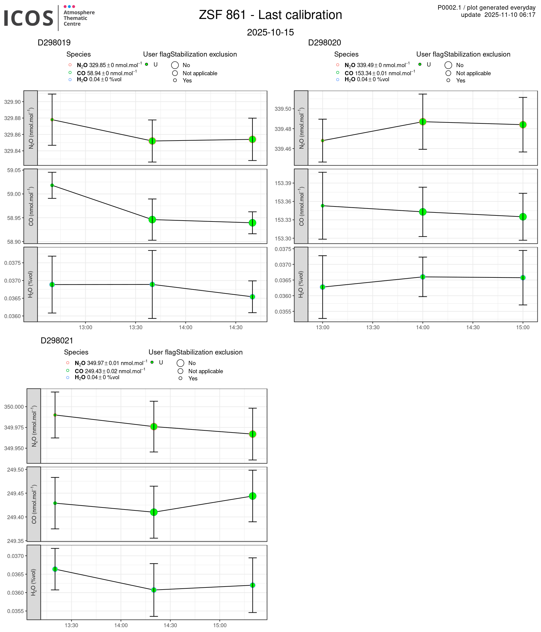 P0002.1 product shows the last calibration sequence of each site/instrument. Each box plot displays the mean and standard deviation of all injections. The points related to the injections excluded due to "number of stabilization cycles" parameter are smaller. Valid injection are displayed green, invalid injection are red.