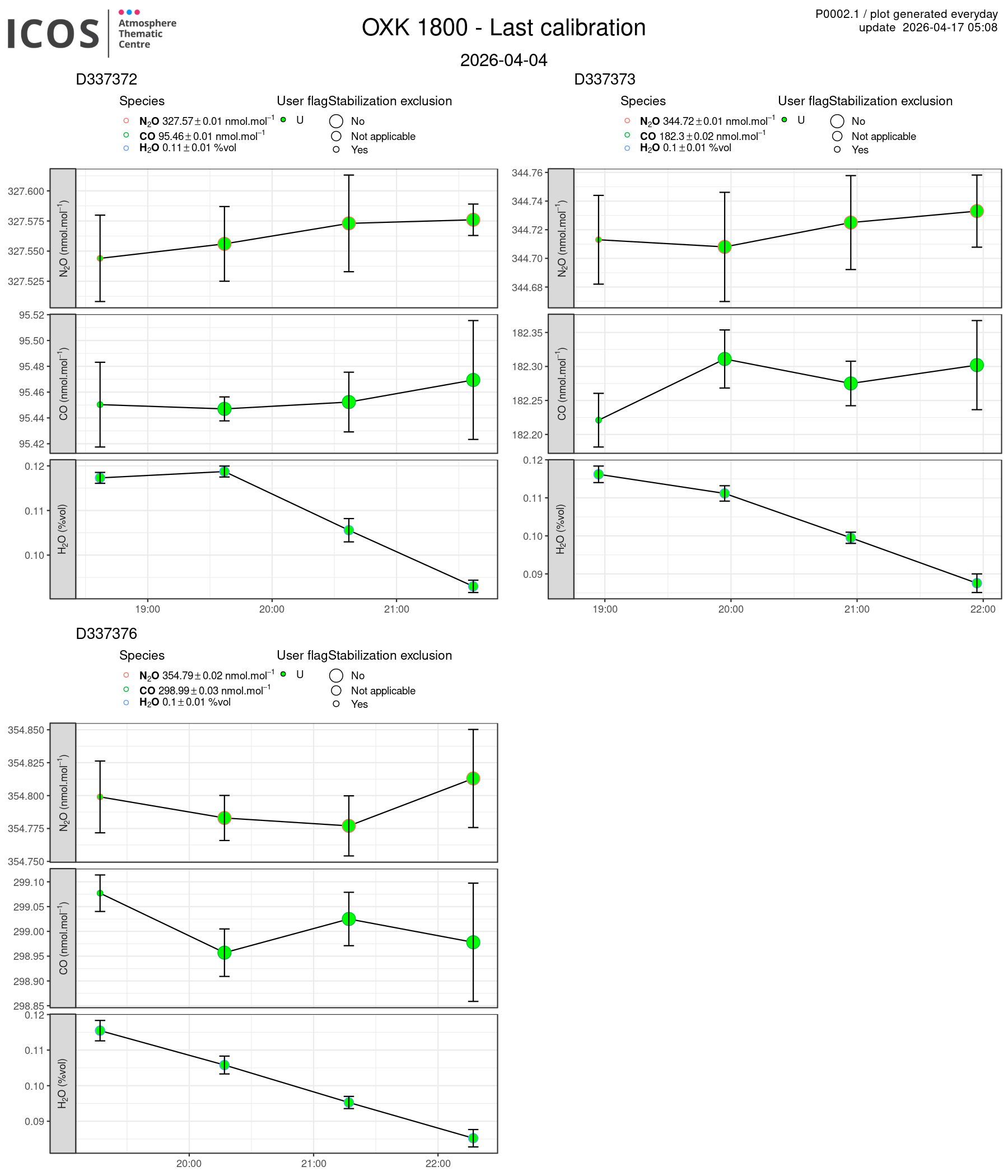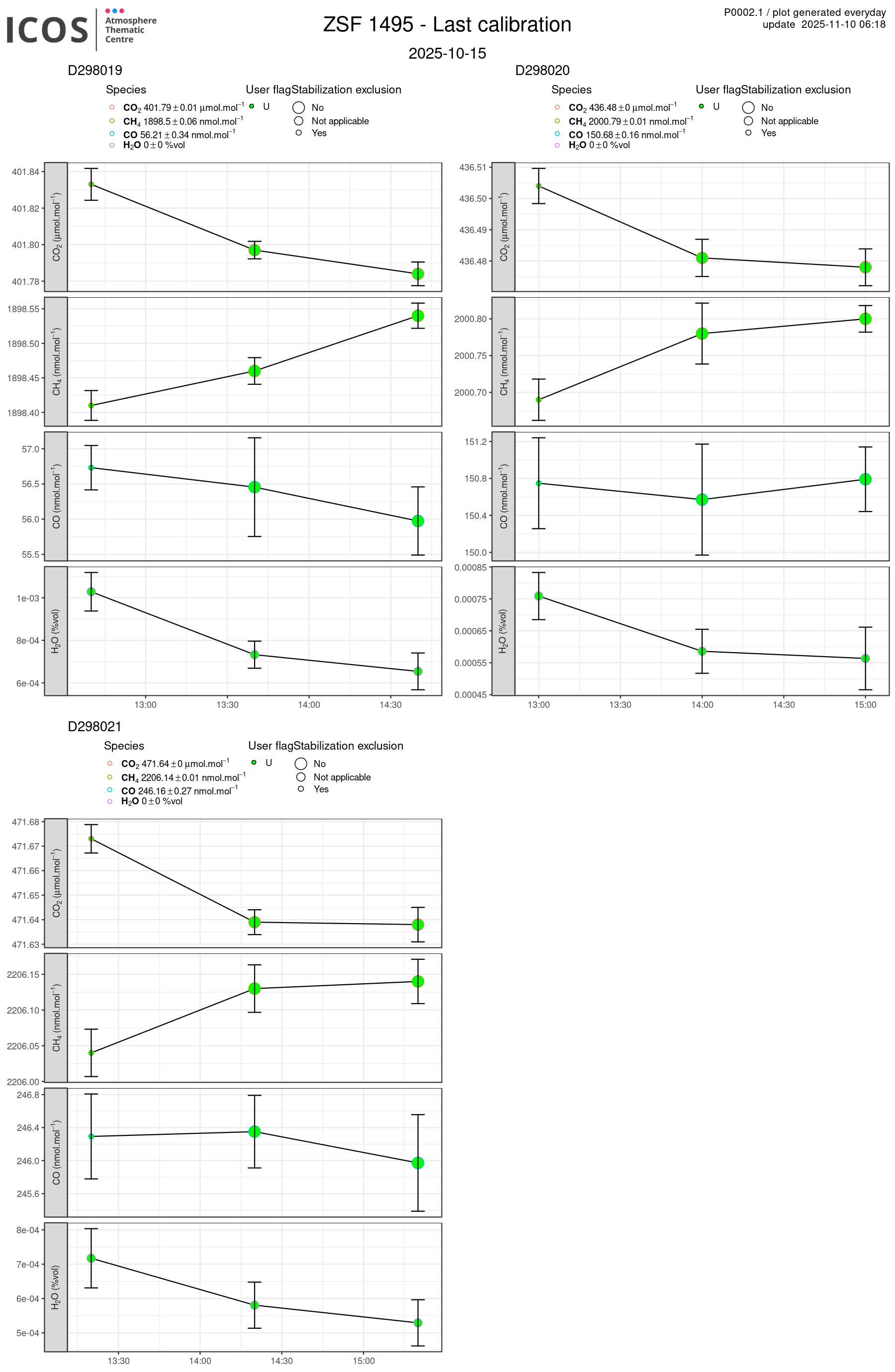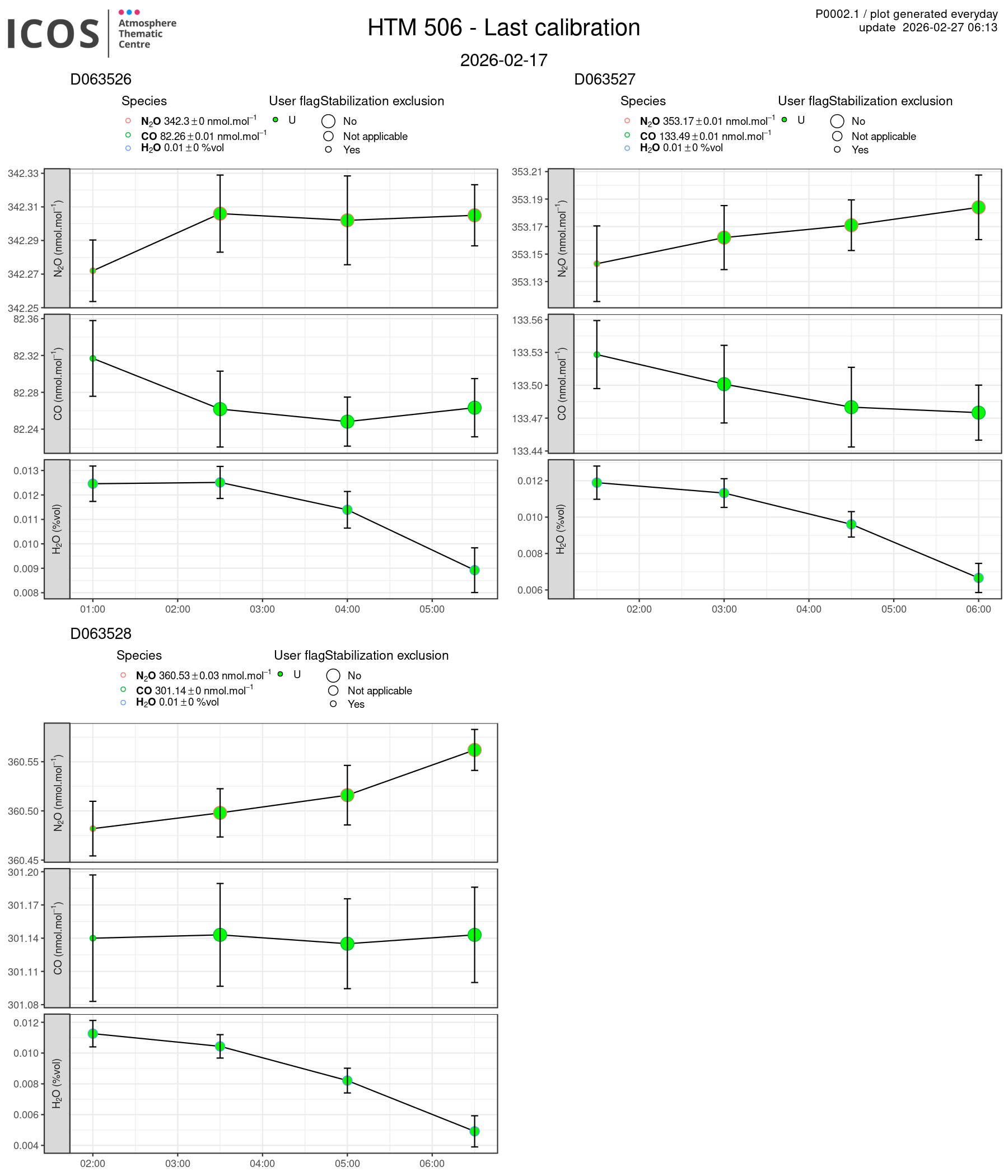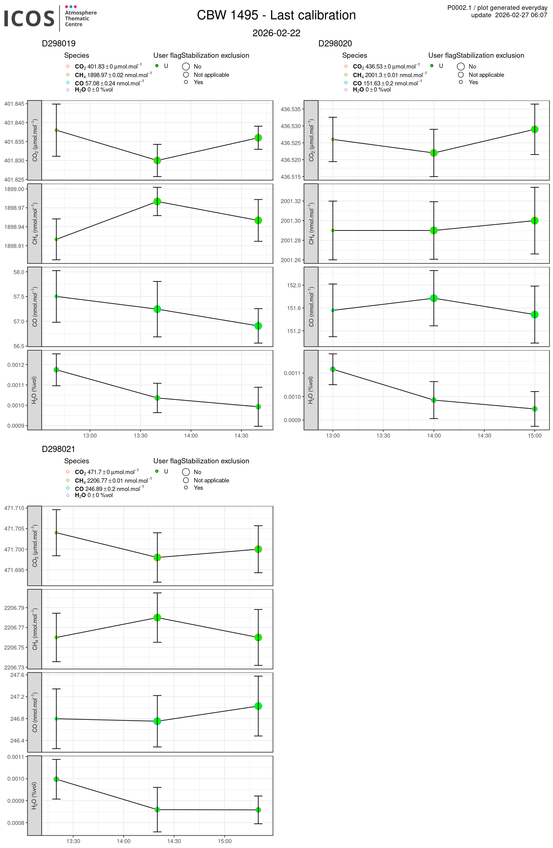 P0002.1 product shows the last calibration sequence of each site/instrument. Each box plot displays the mean and standard deviation of all injections. The points related to the injections excluded due to "number of stabilization cycles" parameter are smaller. Valid injection are displayed green, invalid injection are red.