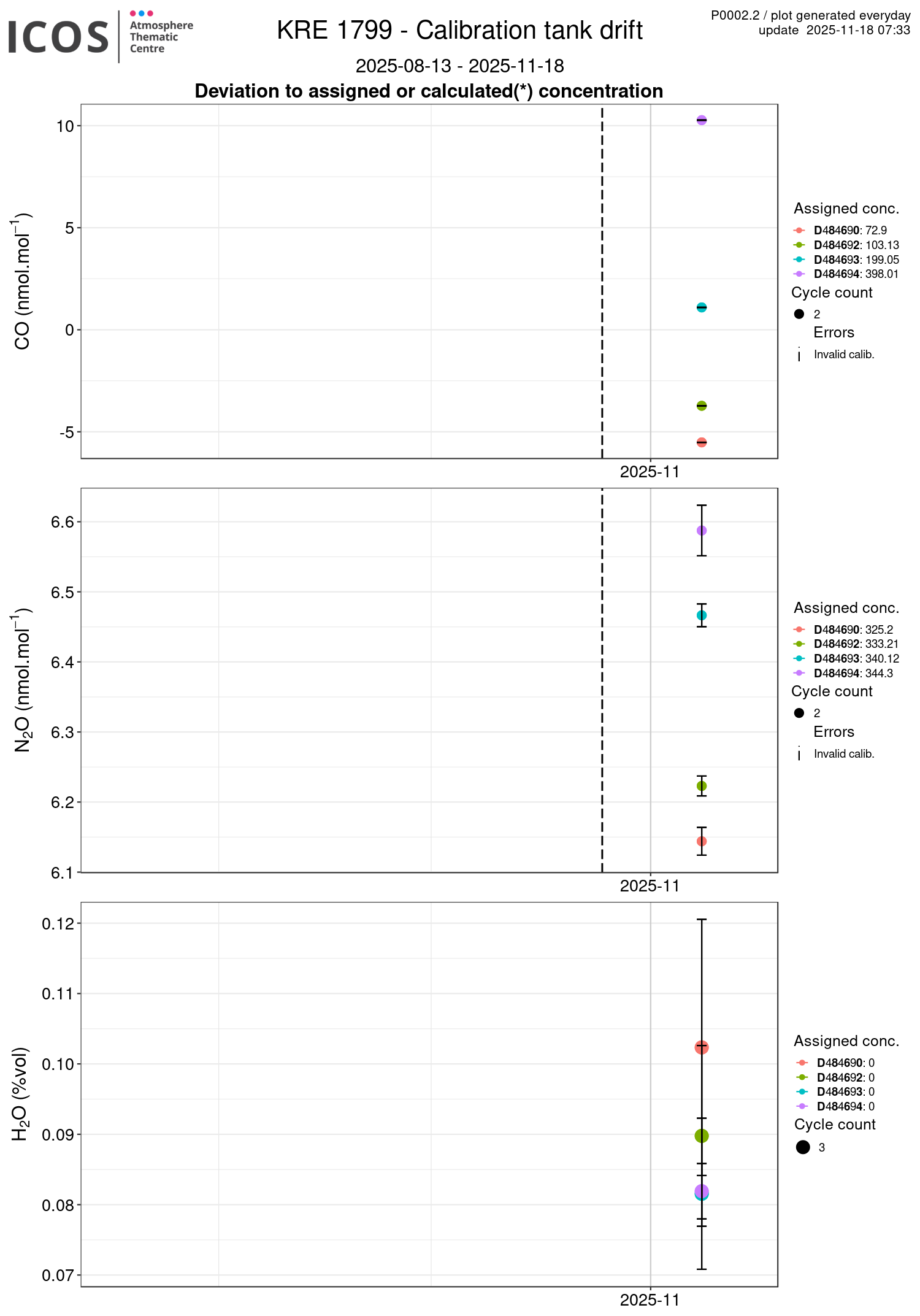 P0002.2 product shows calibration's tanks drift of each site/instrument. Each box plot displays the difference between the assigned or calculated tank's concentration and the mean of each valid and not stabilization-rejected injections of each sequence, for each tank. The number of cycles used to calculate the mean is given by the points size.