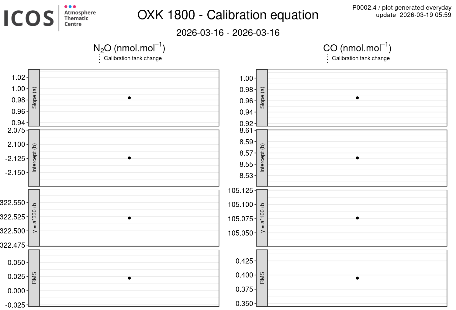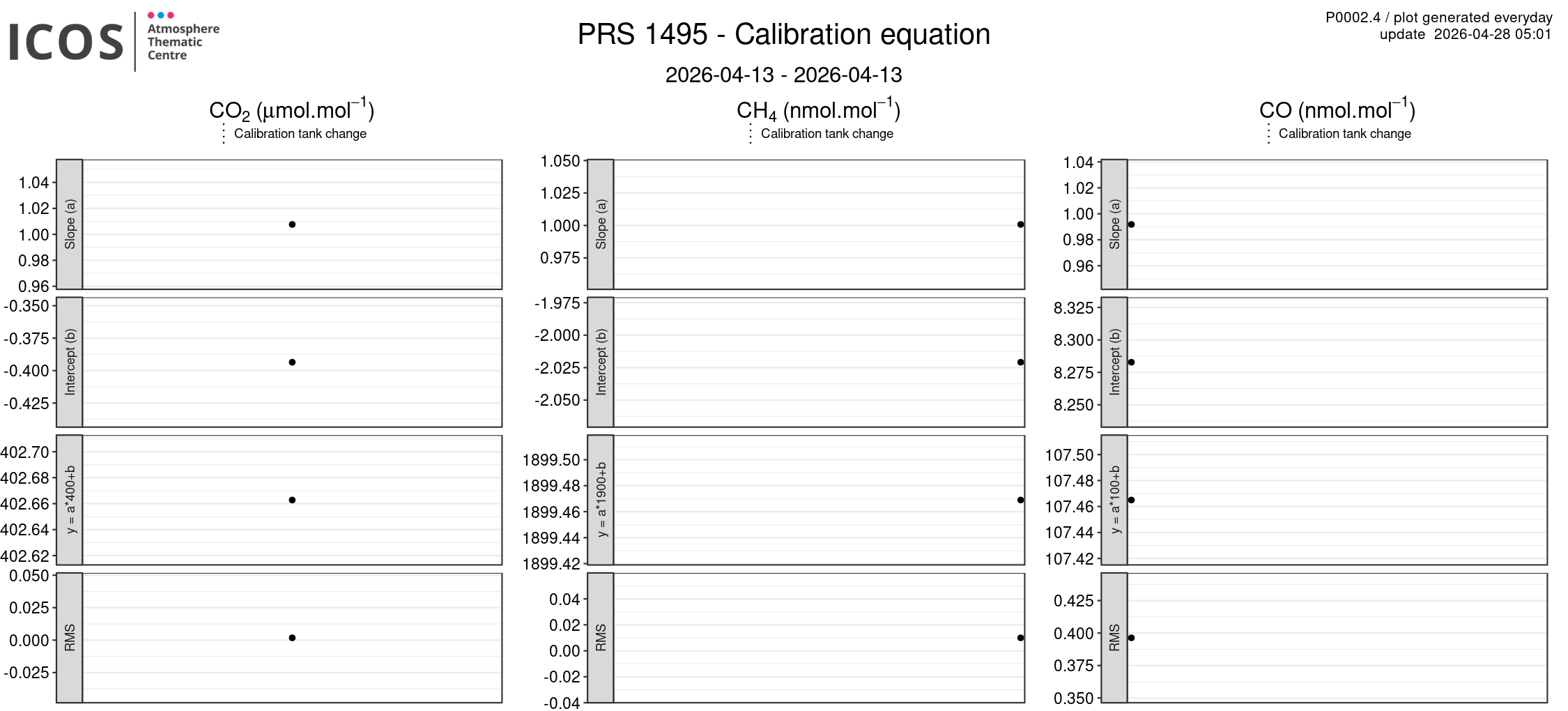 P0002.4 product shows calibration's equation evolution of each site/instrument. Each box plot displays the calibration equation's parameters : slope (a), intercept (b), application to the equation to a "medium" value (y = ax + b) and the root mean square error (RMS). The blue line give the tendency of a parameter for each calibration tank set (i.e. between two changes of one or more calibration tank).