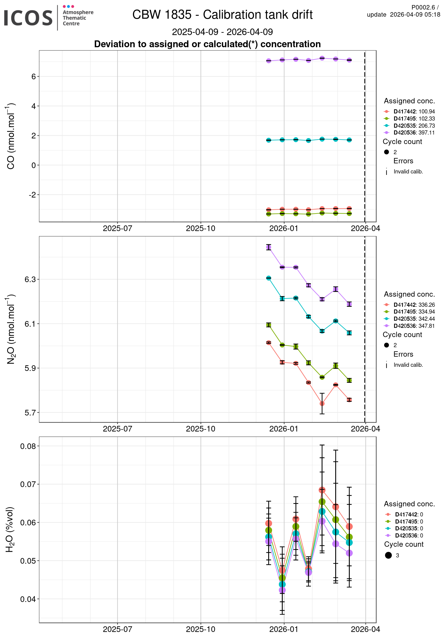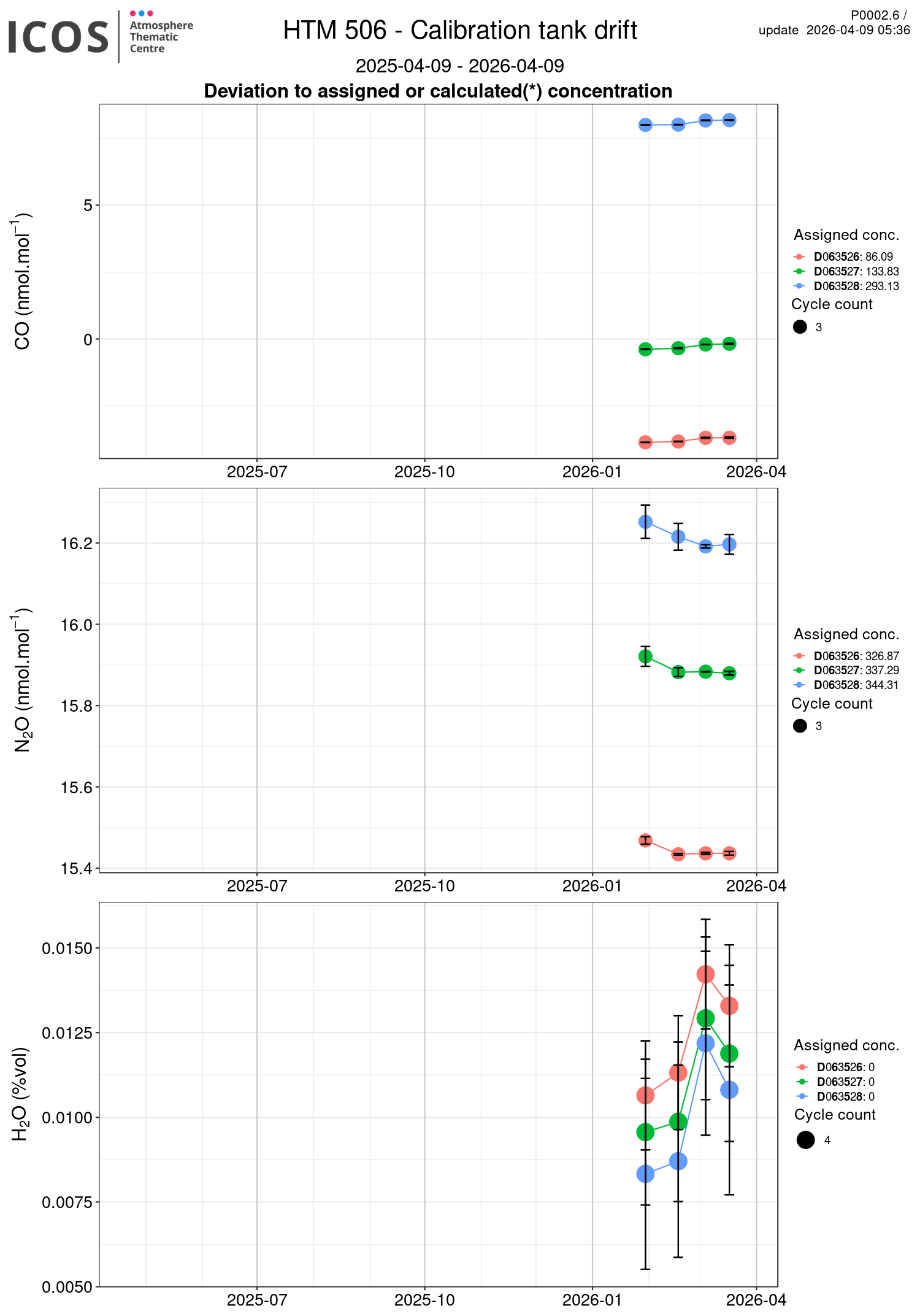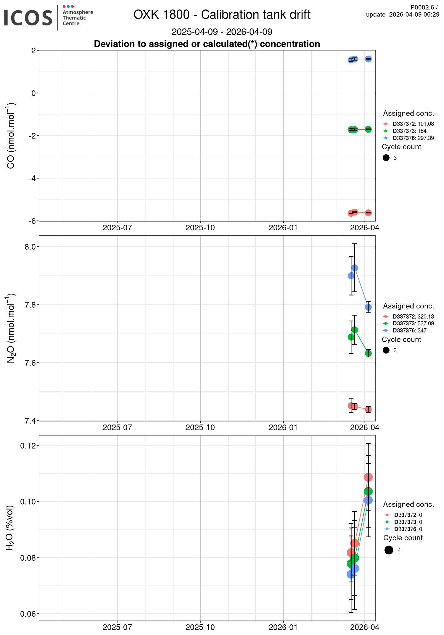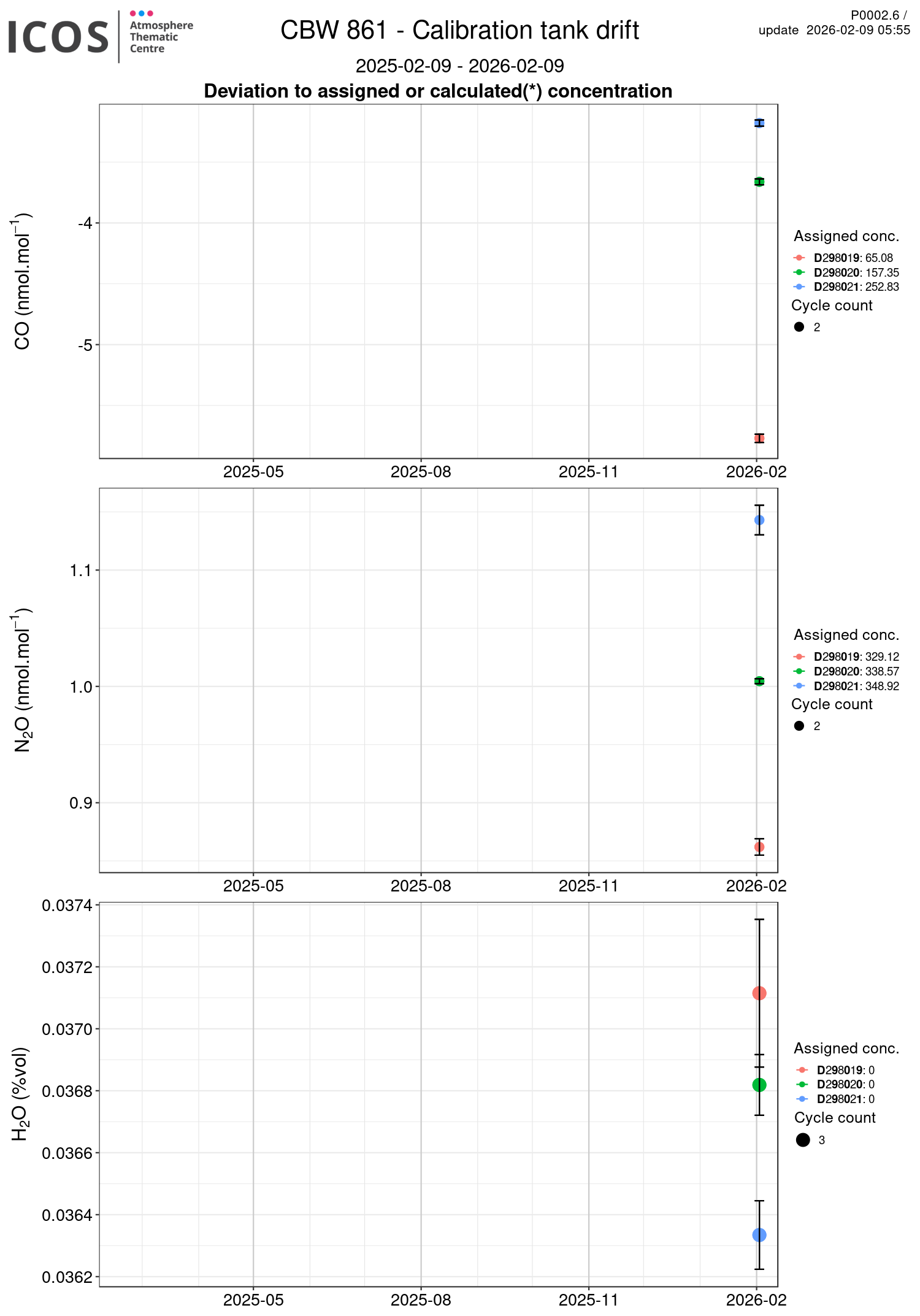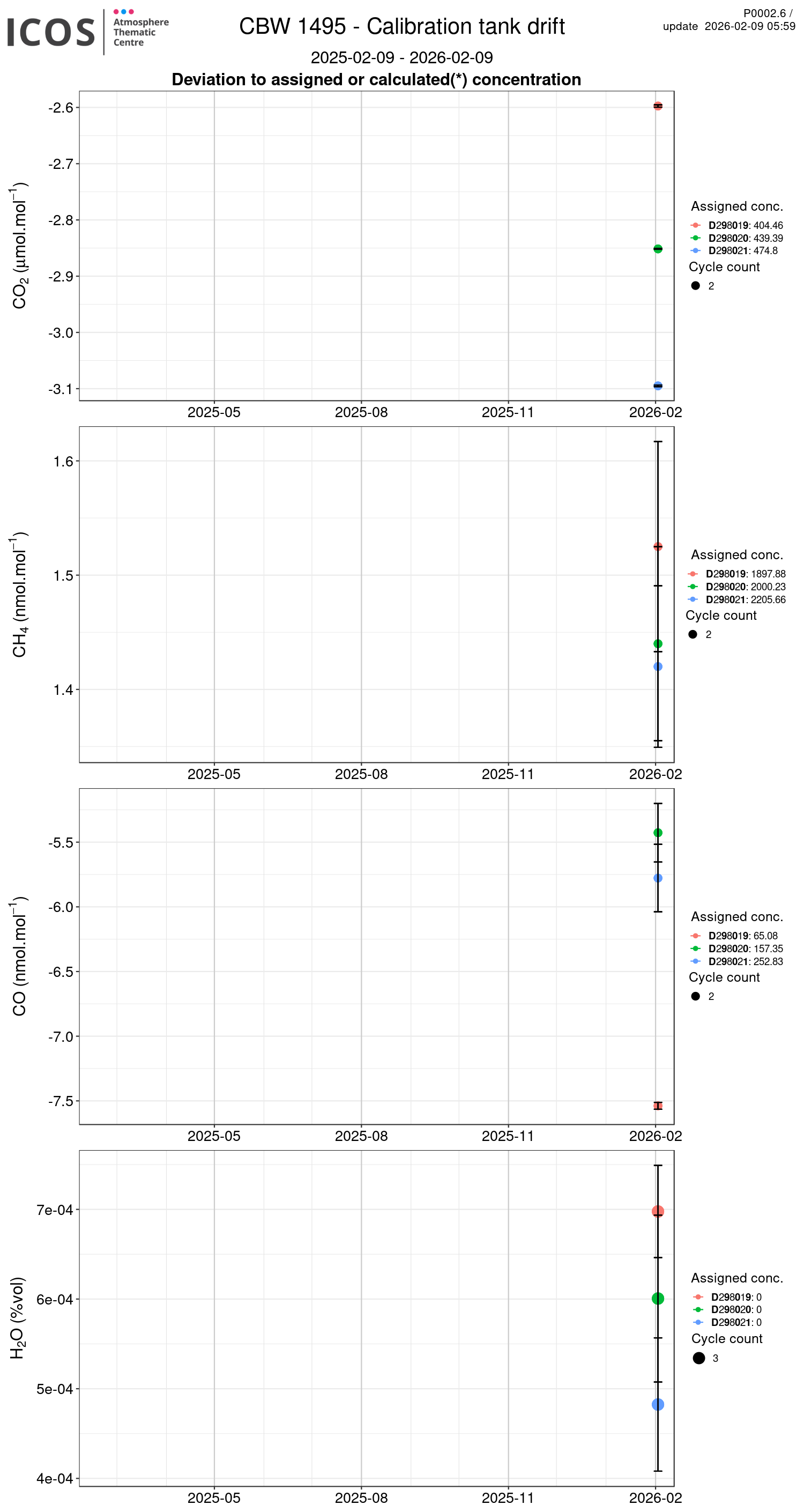 P0002.2 product shows calibration's tanks drift of each site/instrument. Each box plot displays the difference between the assigned or calculated tank's concentration and the mean of each valid and not stabilization-rejected injections of each sequence, for each tank. The number of cycles used to calculate the mean is given by the points size.