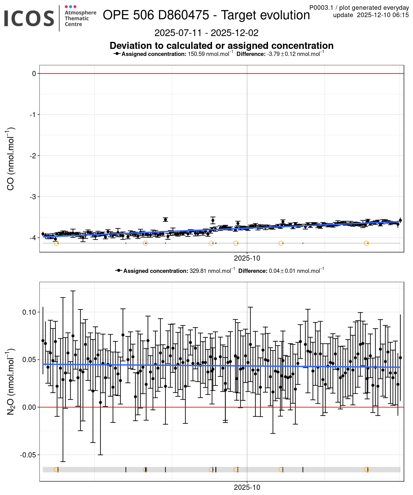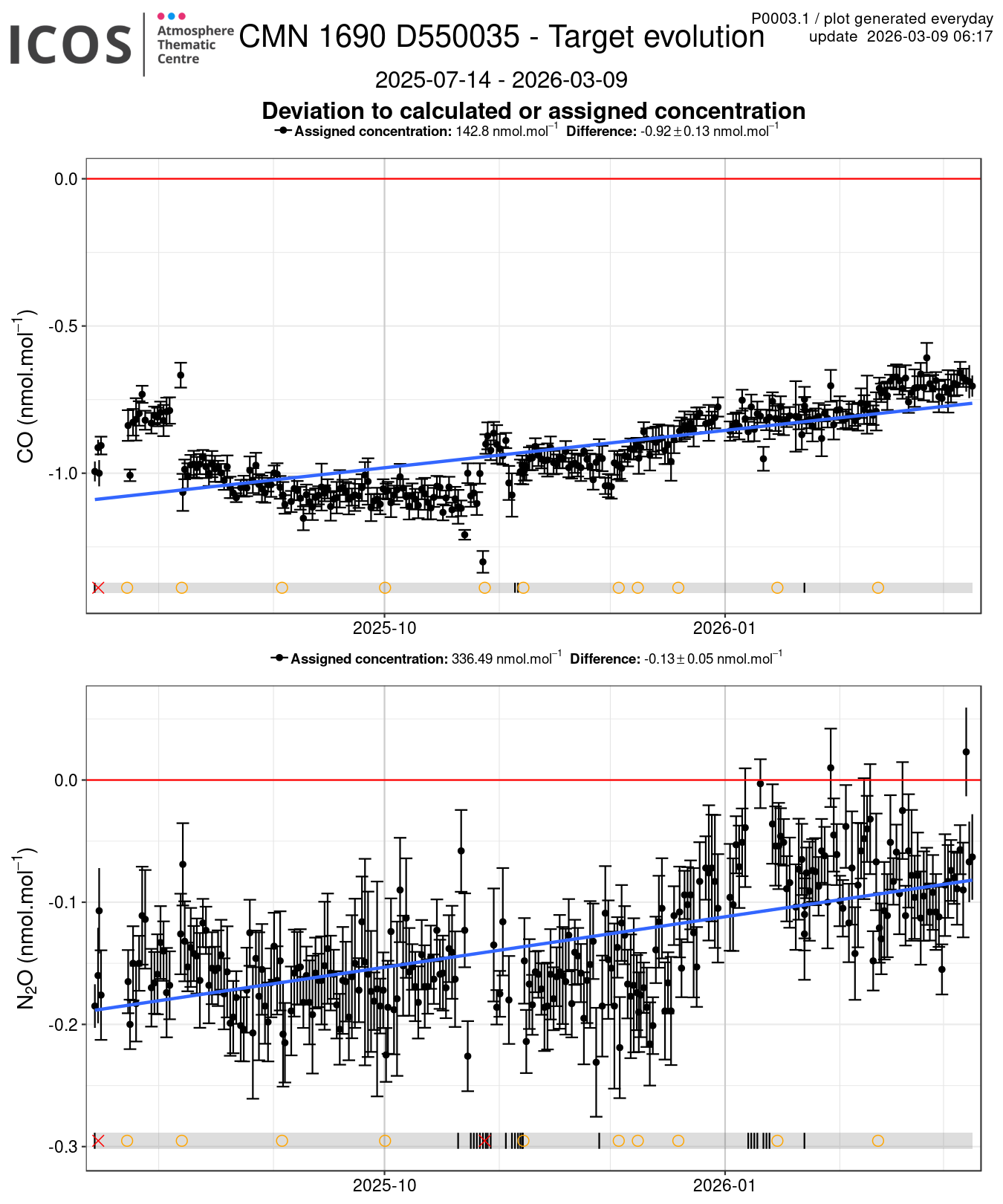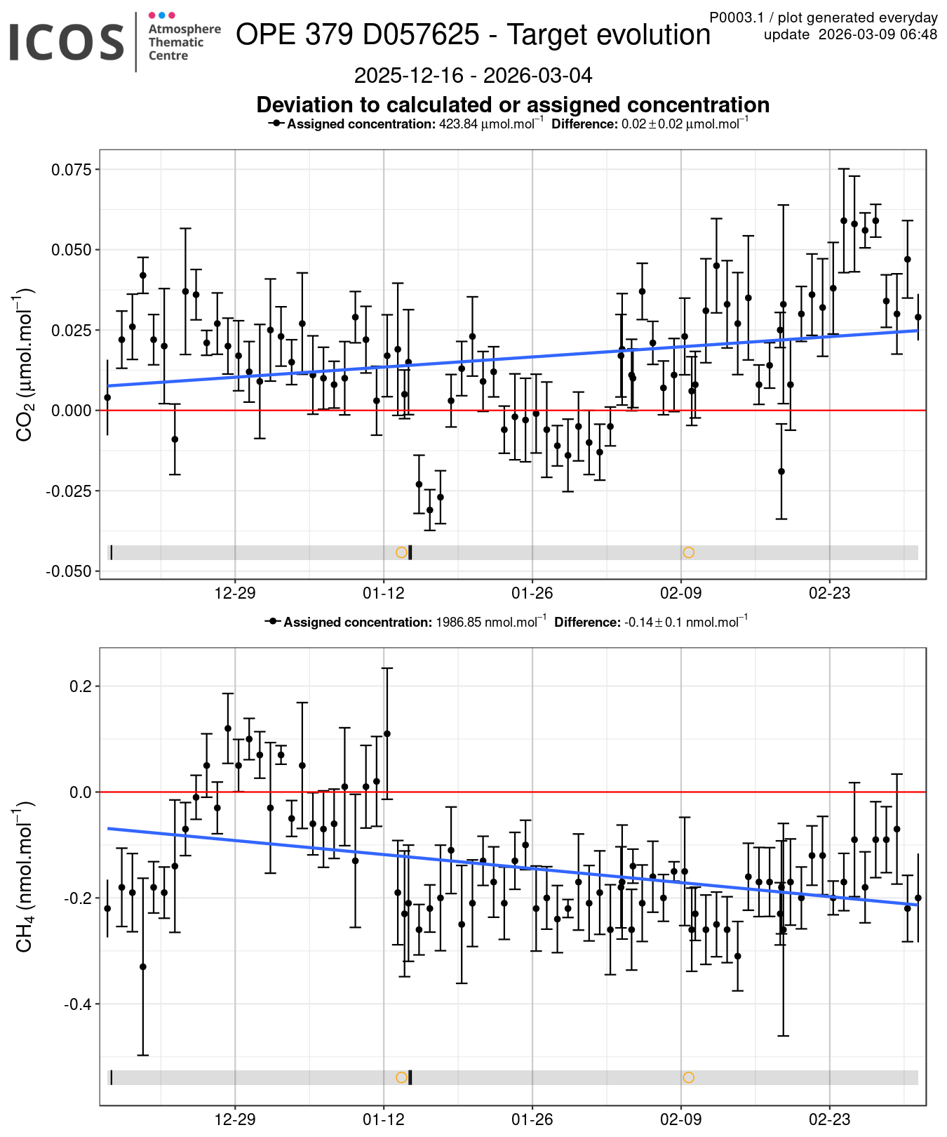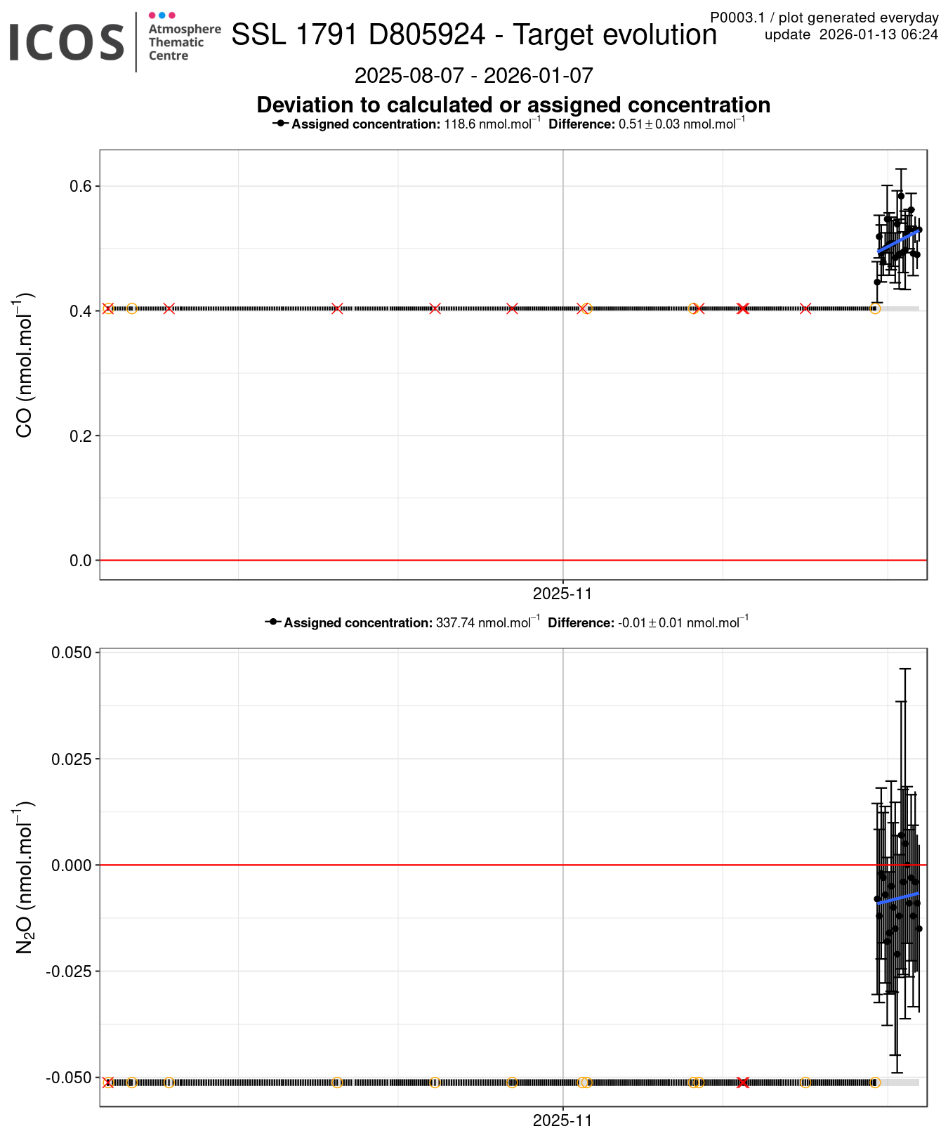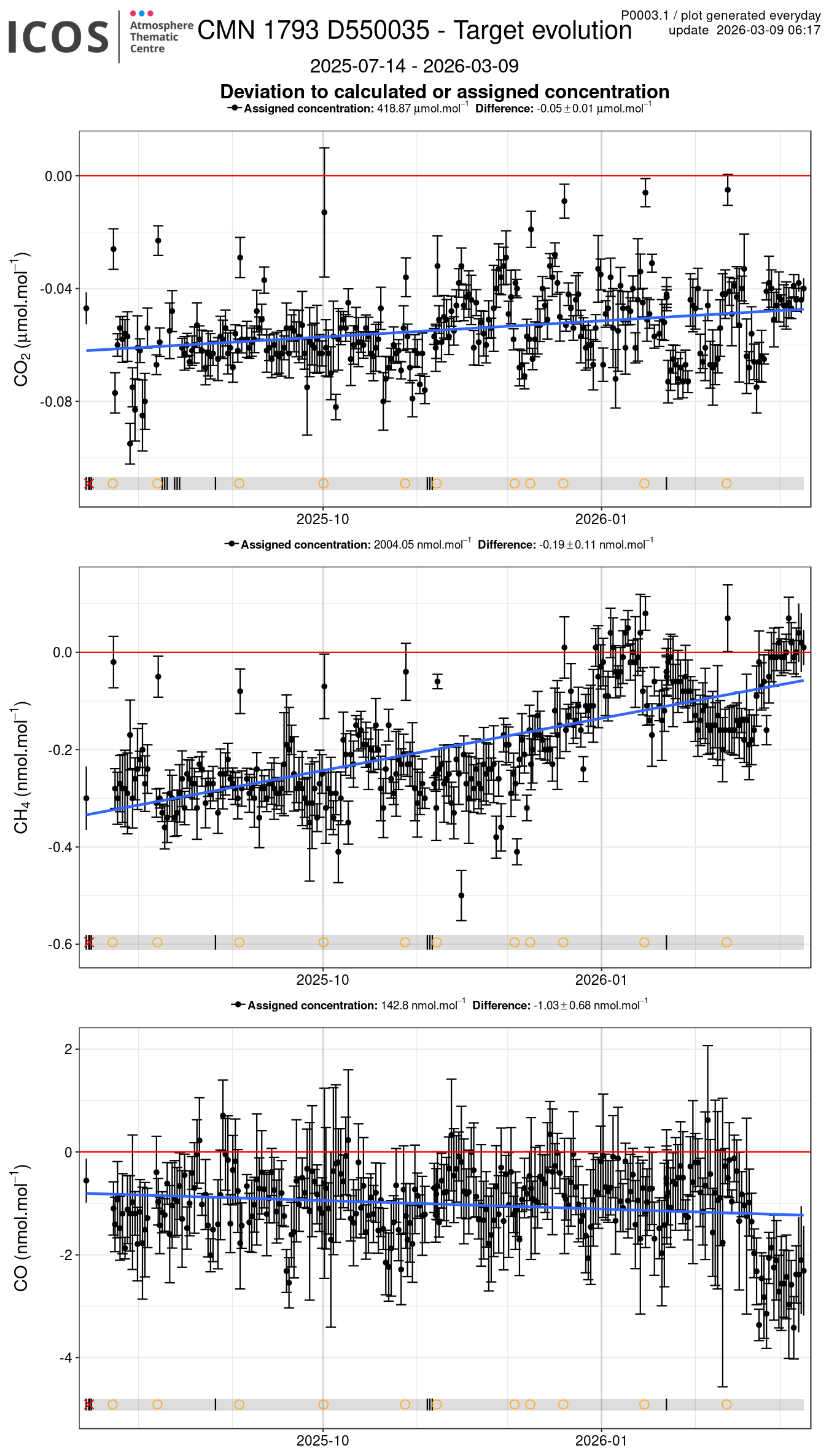 P0003.1 product shows calibration's equation evolution of each site/instrument. Each box plot displays, for a given species, the difference between the injection mean of the tank's concentrations measured by the instrument identified in the plot's header, and the reference concentration for this tank which is either assigned or calculated (see product P0000.3 for details).