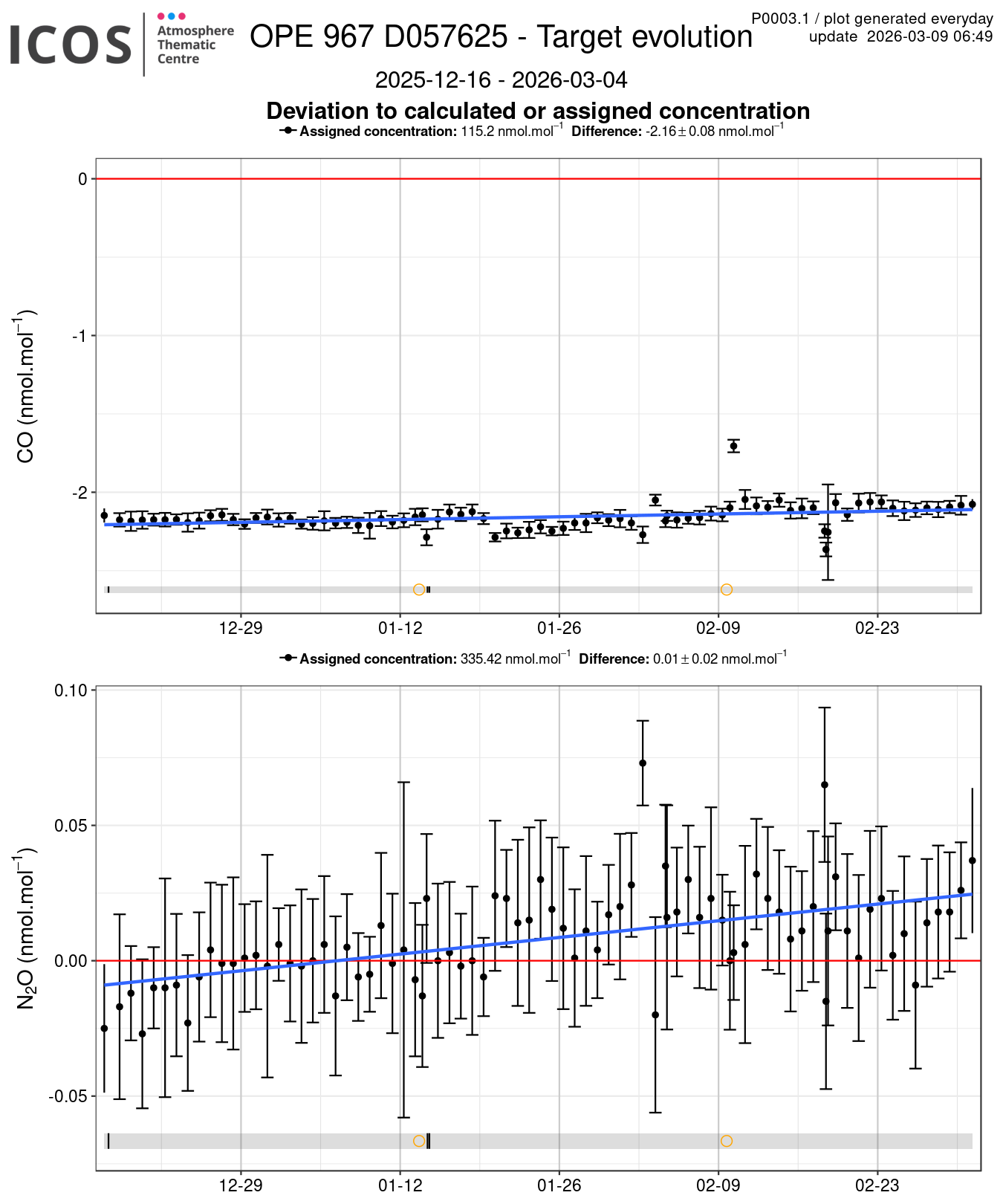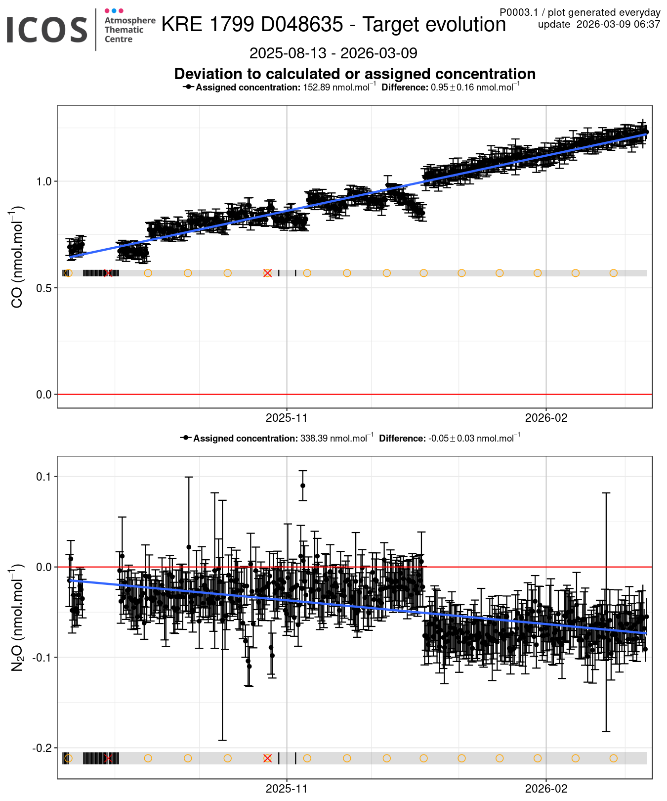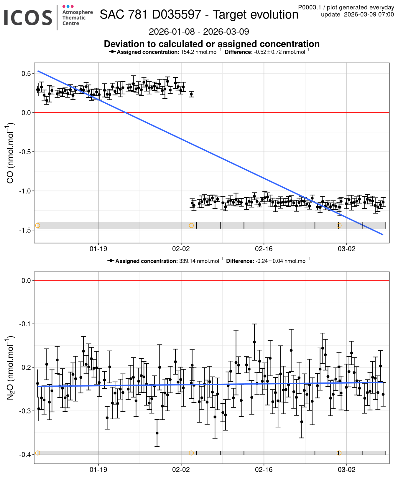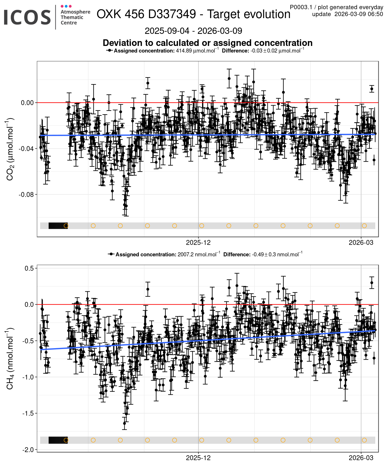 P0003.1 product shows calibration's equation evolution of each site/instrument. Each box plot displays, for a given species, the difference between the injection mean of the tank's concentrations measured by the instrument identified in the plot's header, and the reference concentration for this tank which is either assigned or calculated (see product P0000.3 for details).