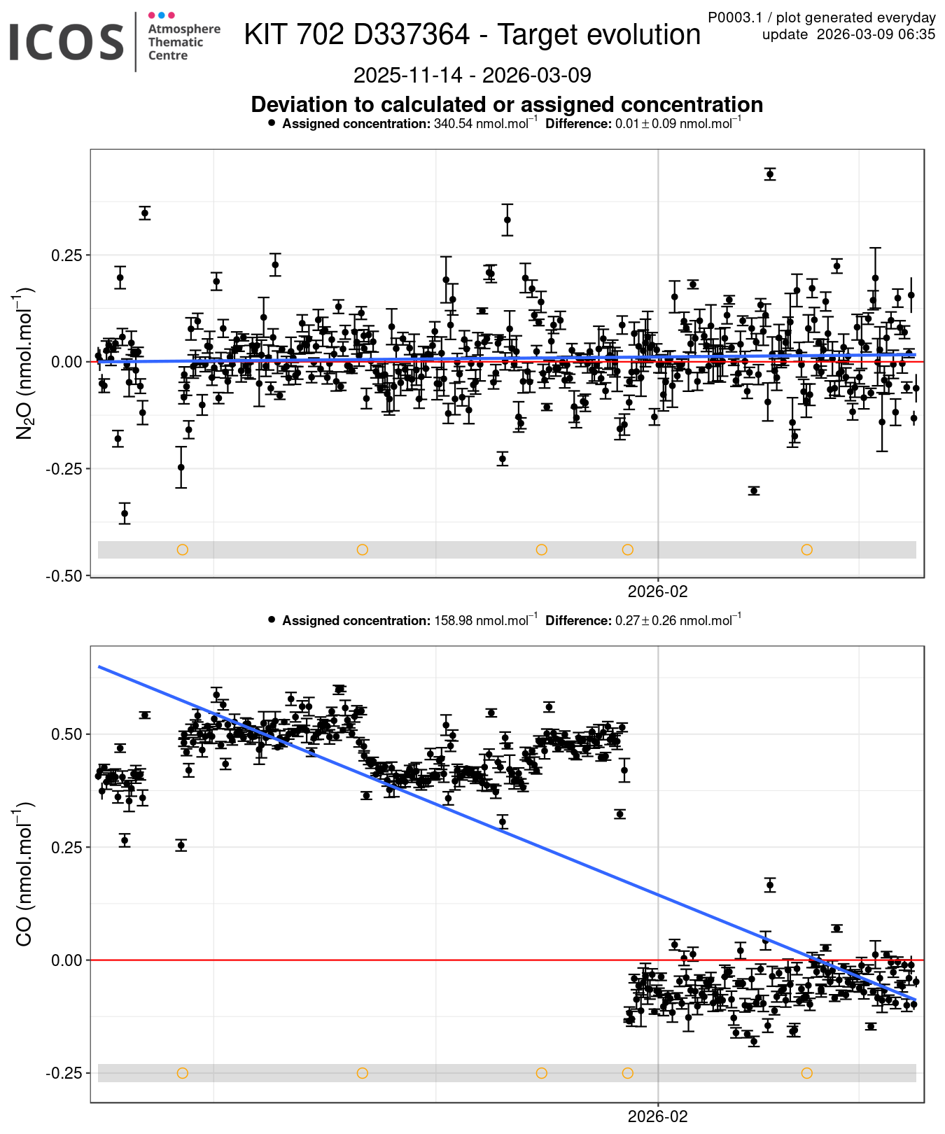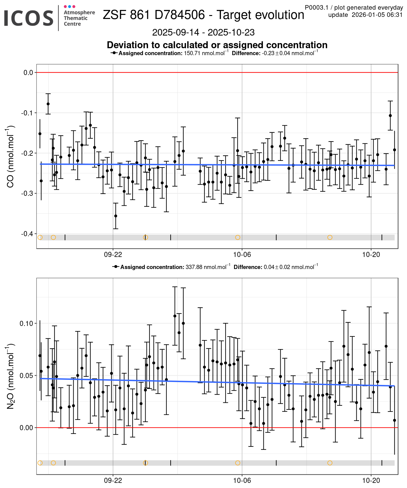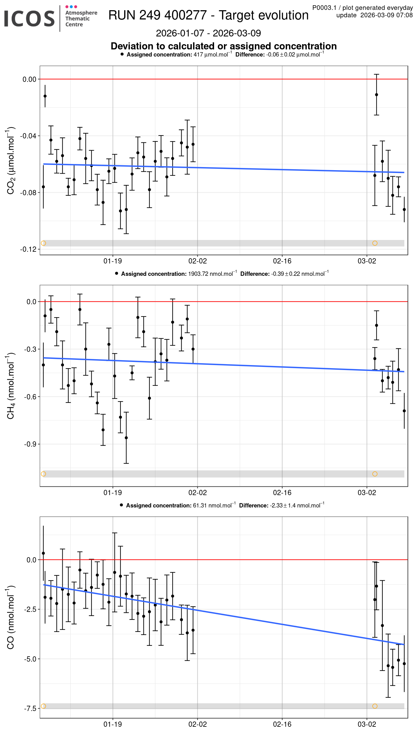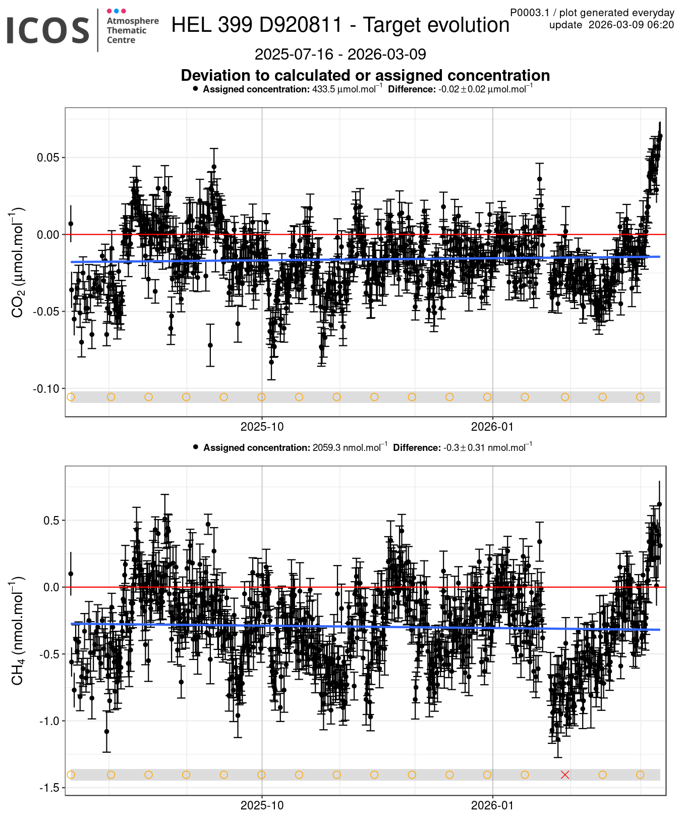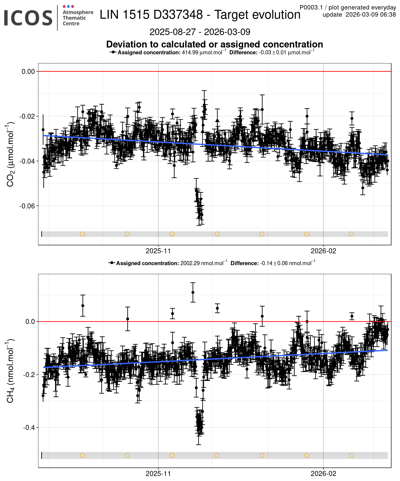 P0003.1 product shows calibration's equation evolution of each site/instrument. Each box plot displays, for a given species, the difference between the injection mean of the tank's concentrations measured by the instrument identified in the plot's header, and the reference concentration for this tank which is either assigned or calculated (see product P0000.3 for details).