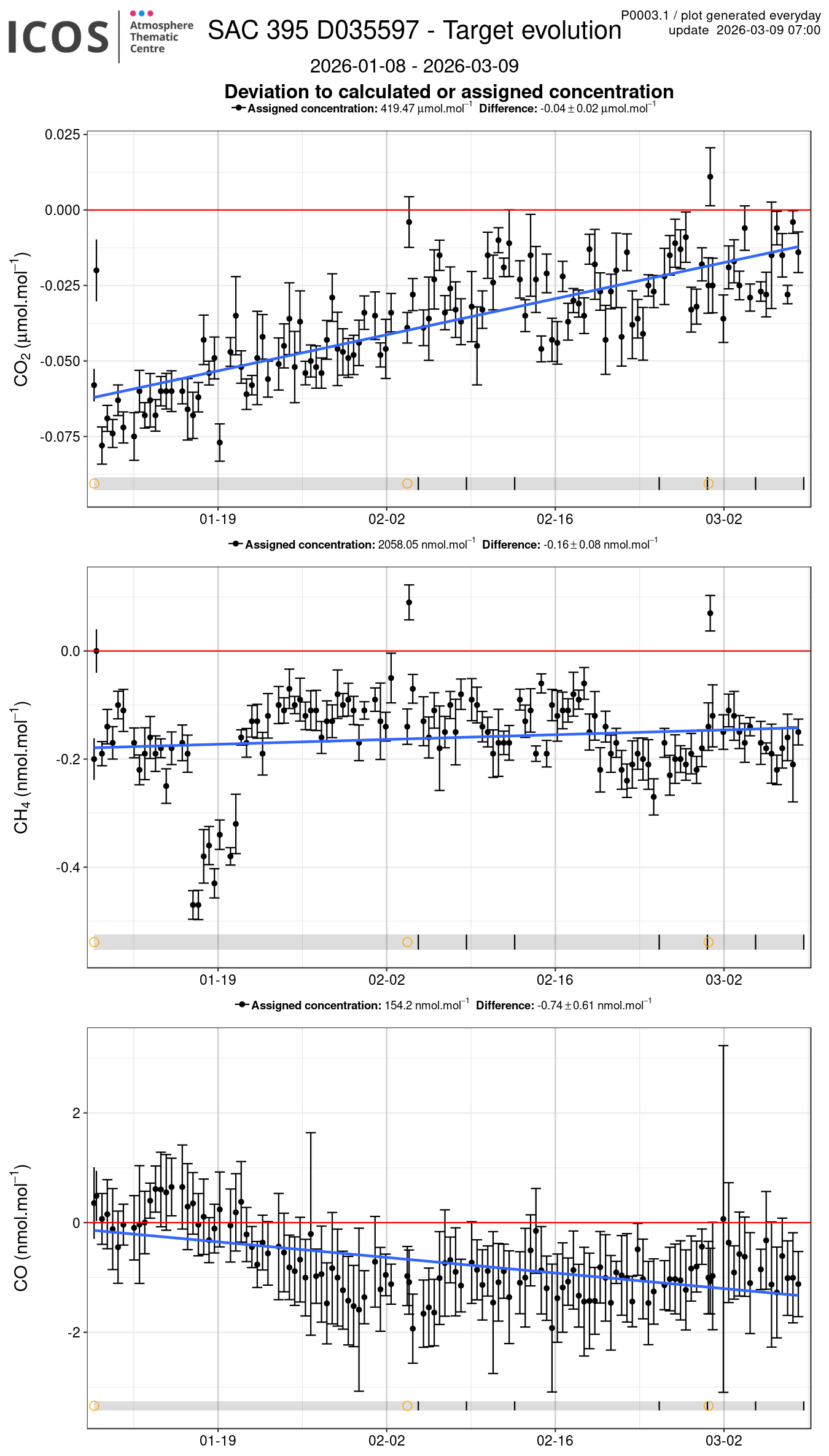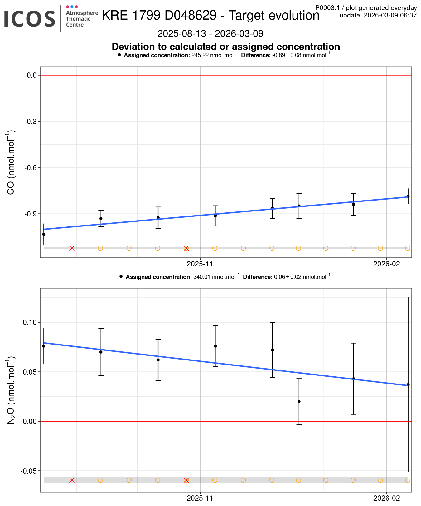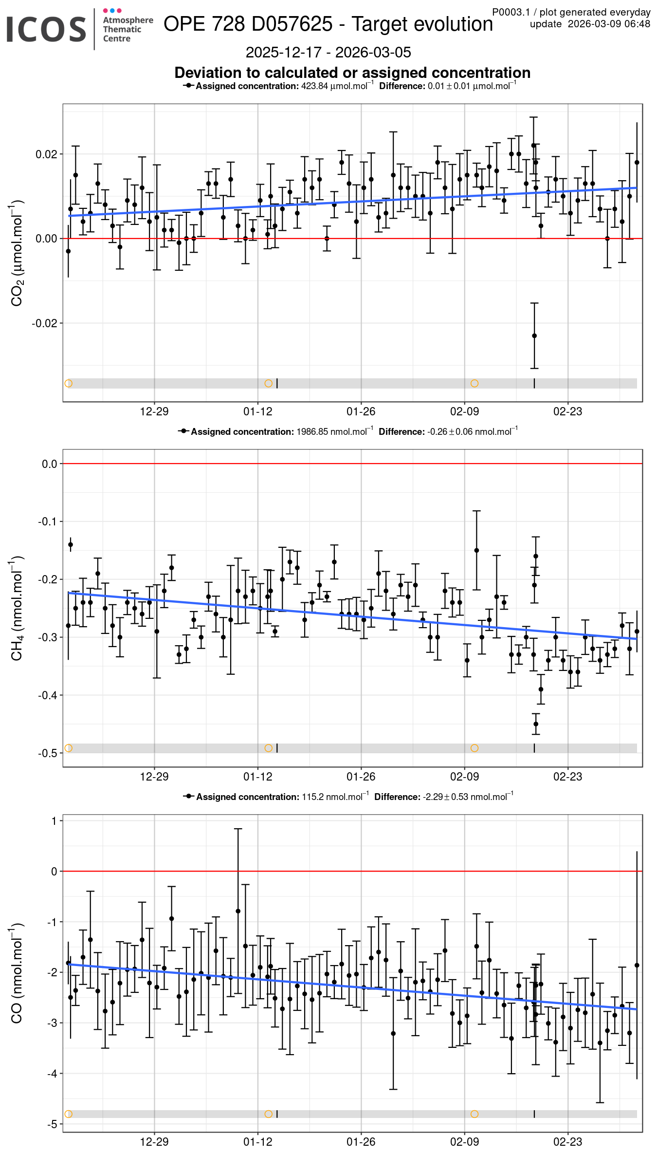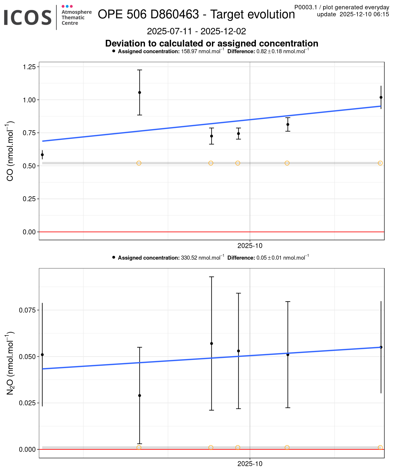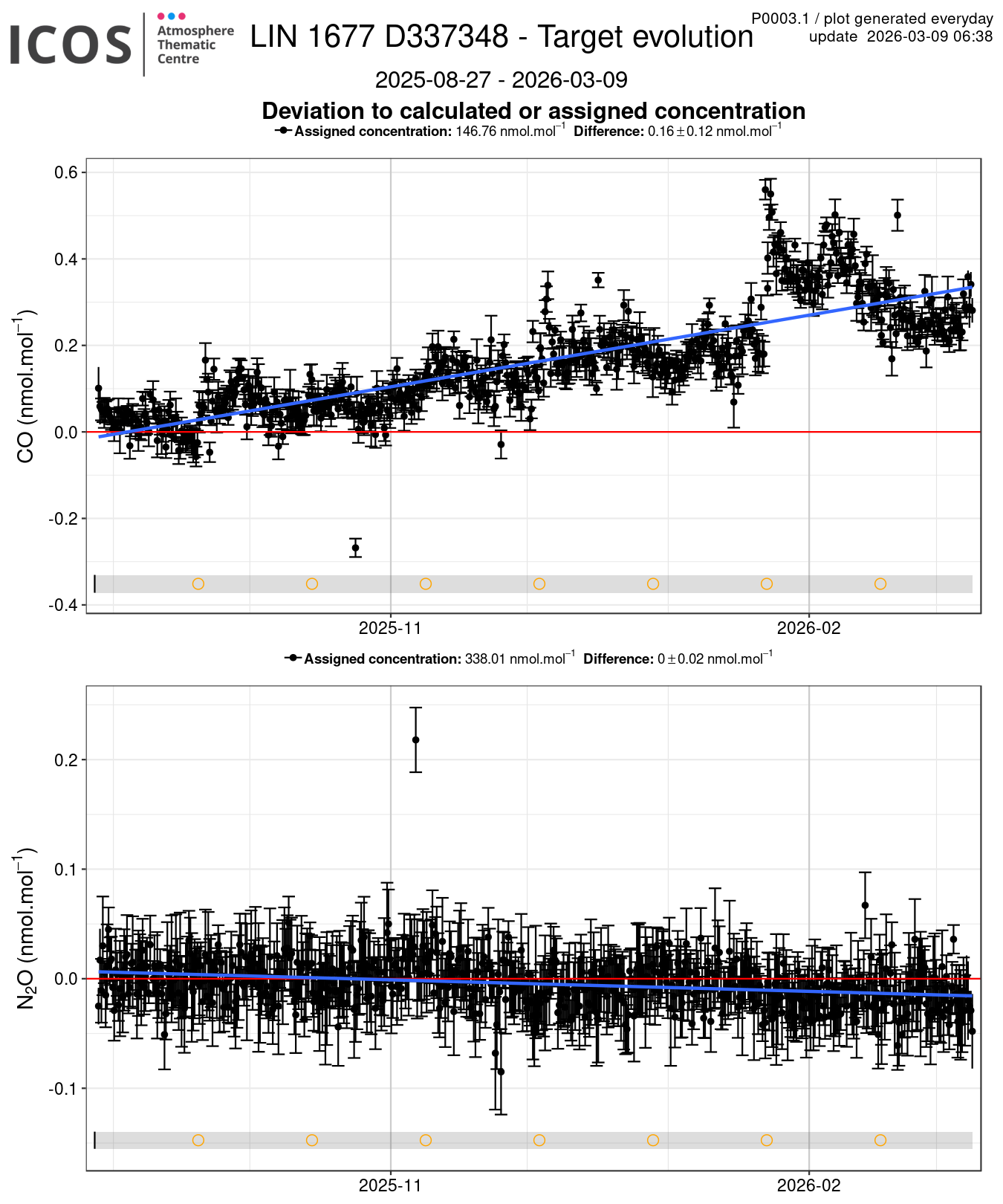 P0003.1 product shows calibration's equation evolution of each site/instrument. Each box plot displays, for a given species, the difference between the injection mean of the tank's concentrations measured by the instrument identified in the plot's header, and the reference concentration for this tank which is either assigned or calculated (see product P0000.3 for details).