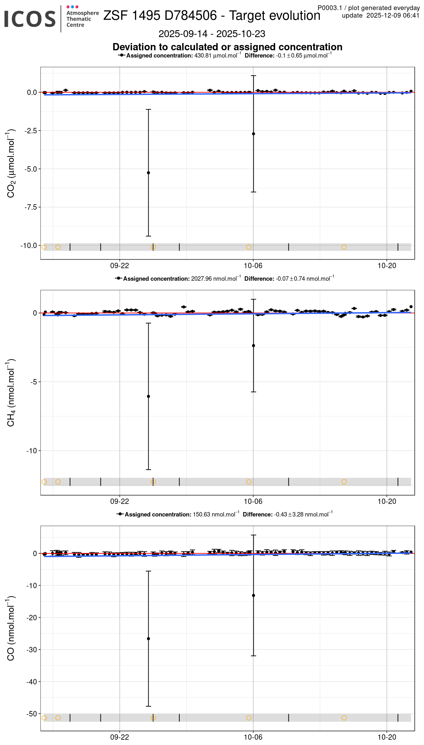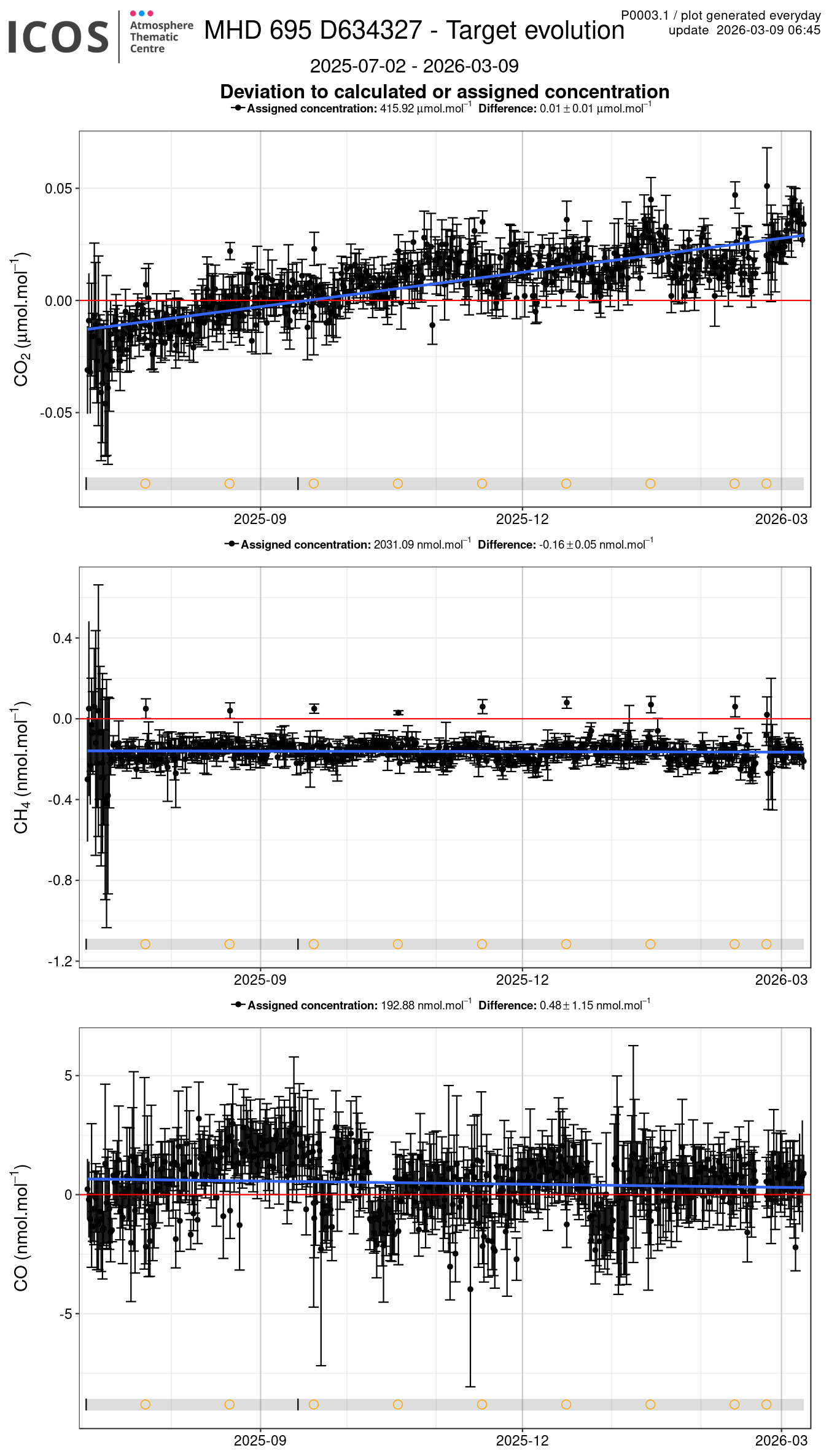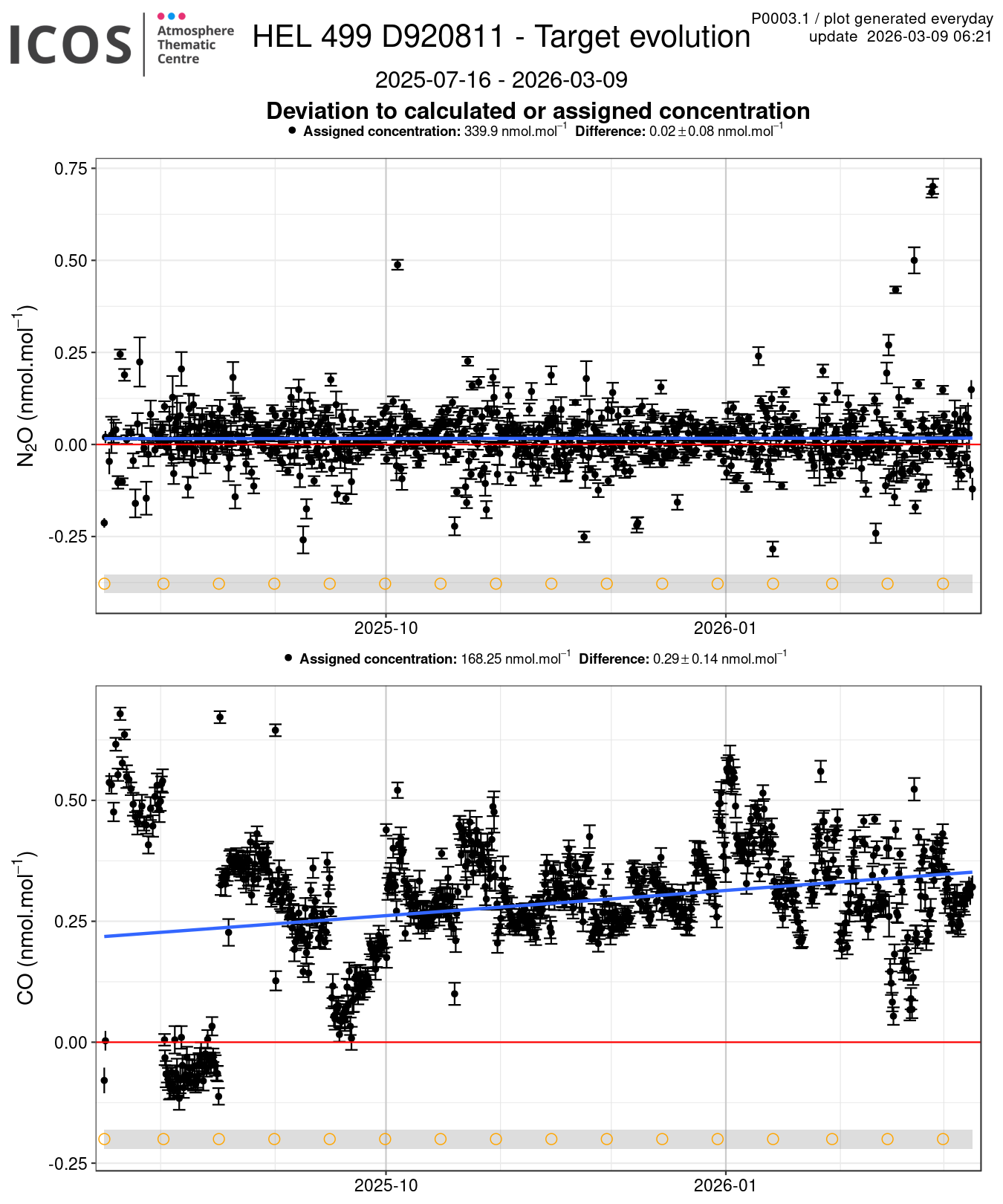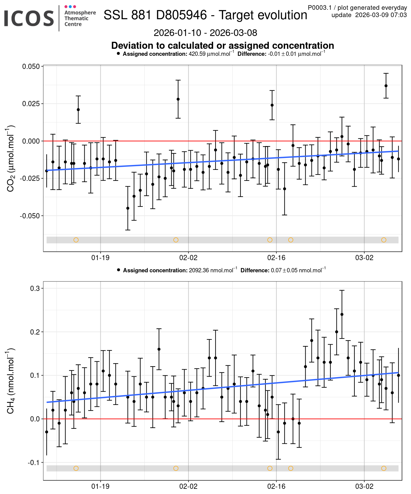 P0003.1 product shows calibration's equation evolution of each site/instrument. Each box plot displays, for a given species, the difference between the injection mean of the tank's concentrations measured by the instrument identified in the plot's header, and the reference concentration for this tank which is either assigned or calculated (see product P0000.3 for details).