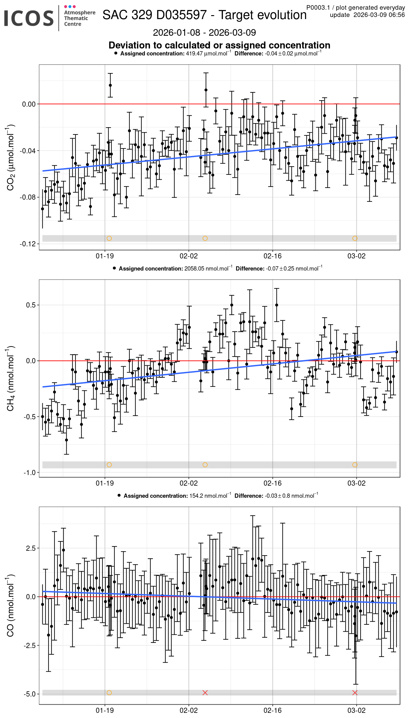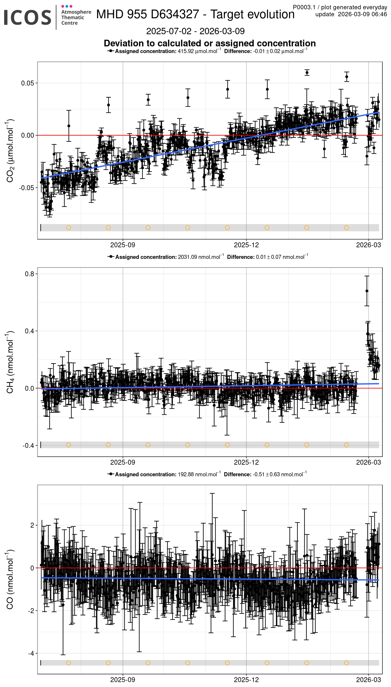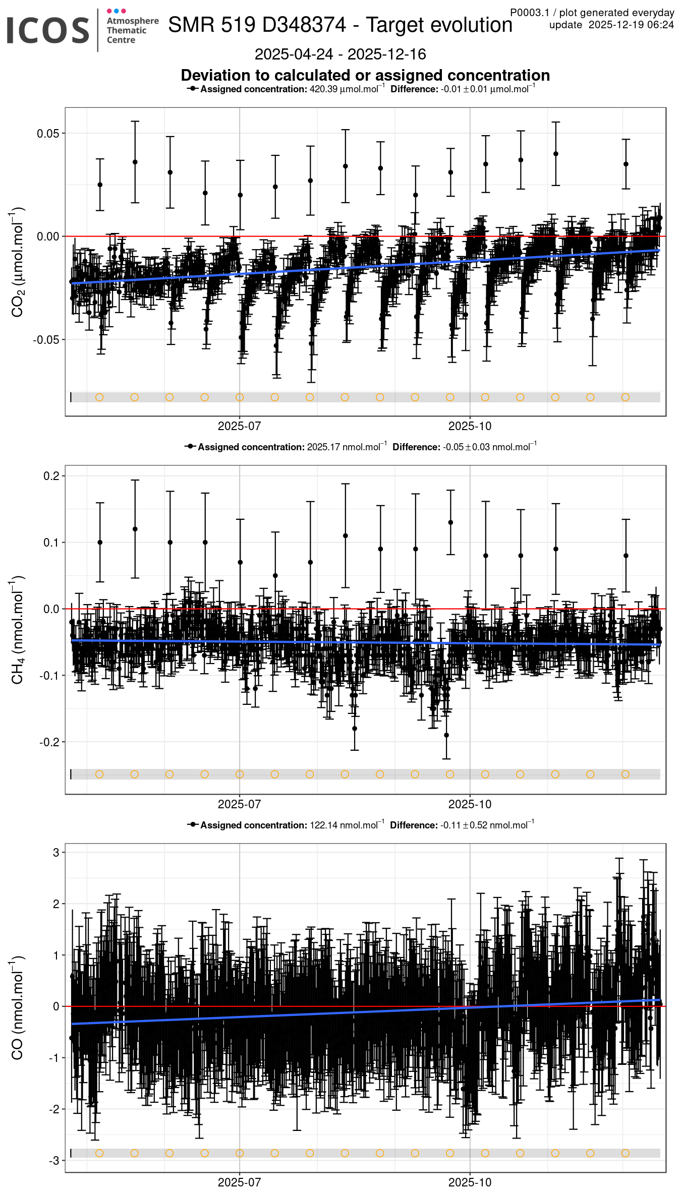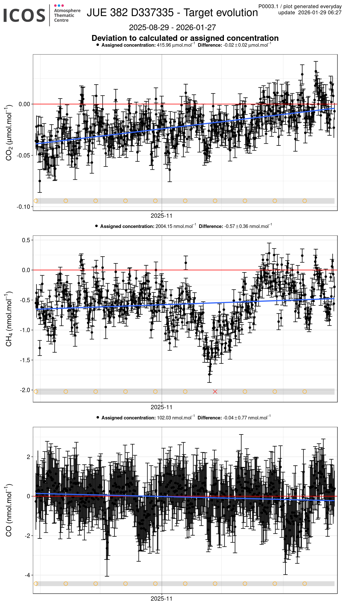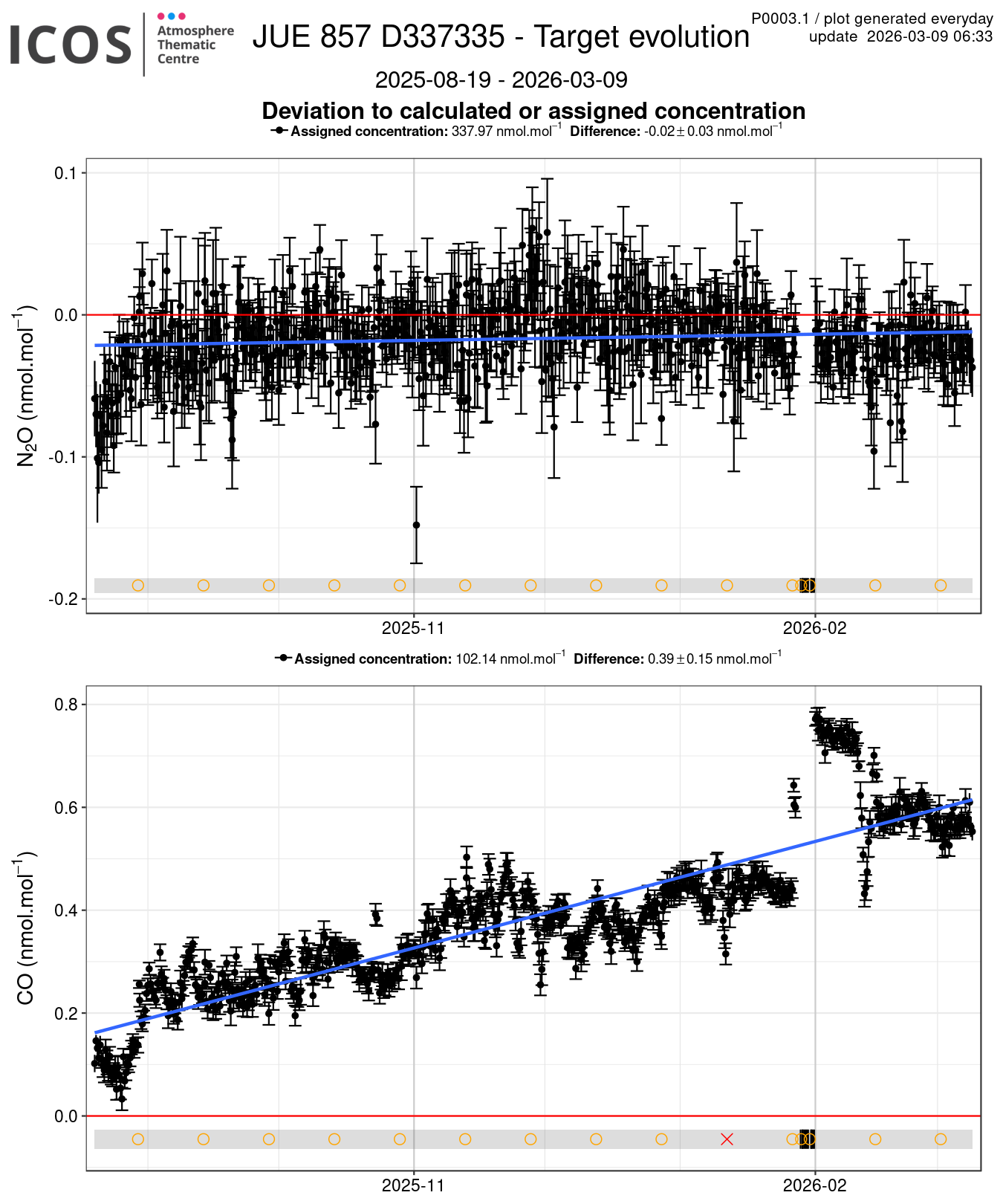 P0003.1 product shows calibration's equation evolution of each site/instrument. Each box plot displays, for a given species, the difference between the injection mean of the tank's concentrations measured by the instrument identified in the plot's header, and the reference concentration for this tank which is either assigned or calculated (see product P0000.3 for details).