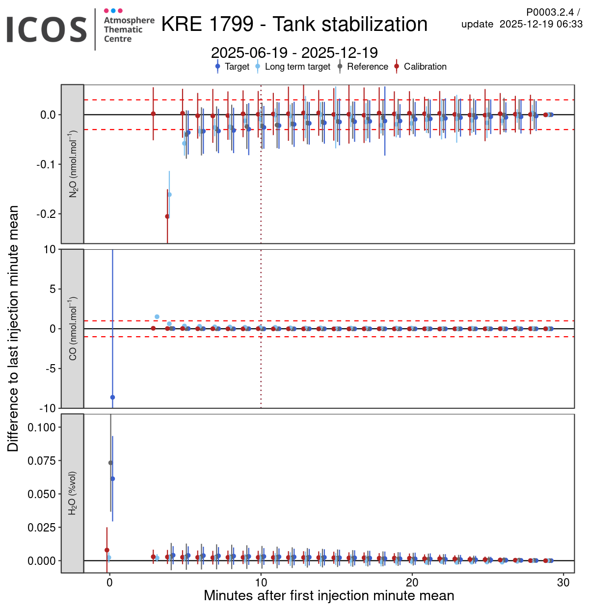 P0003.2.4 product shows the tanks stabilization pattern of each site/instrument. Each box plot displays, for a given species, the difference between the injections' minute mean of the tank's concentrations measured by the instrument identified in the plot's header, and the last injection's minute mean.