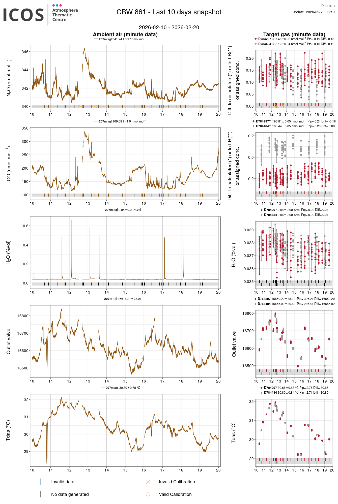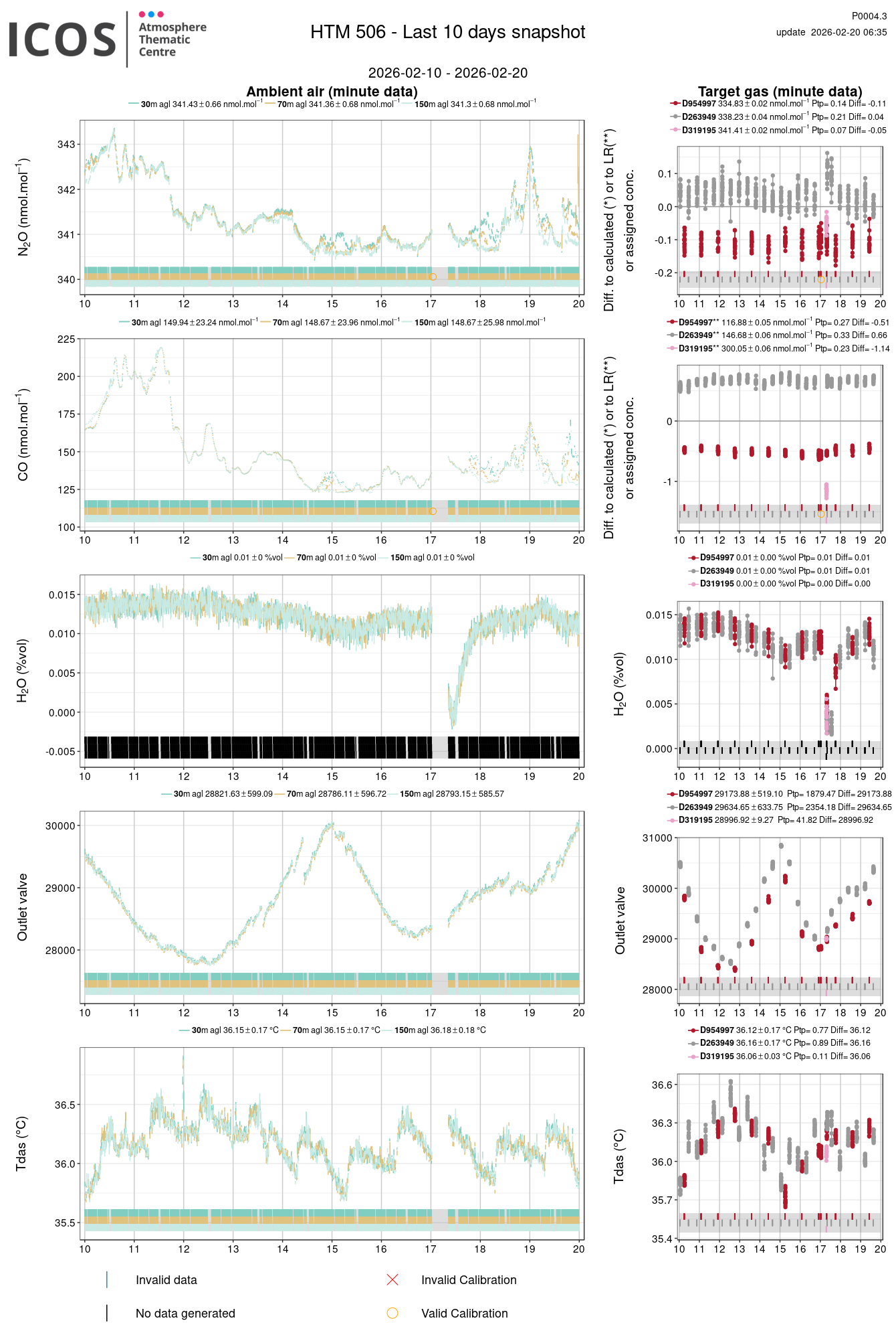 P0004.3 product shows the last 10 days air timeseries. For the given site and instrument, each left box plot displays the timeseries of a air species while ambient air is measured ; and each right box plot displays the timeseries of a air species while a target air is measured. Colors on the left plots represents sampling heights, colors on the right plot represents target tanks.