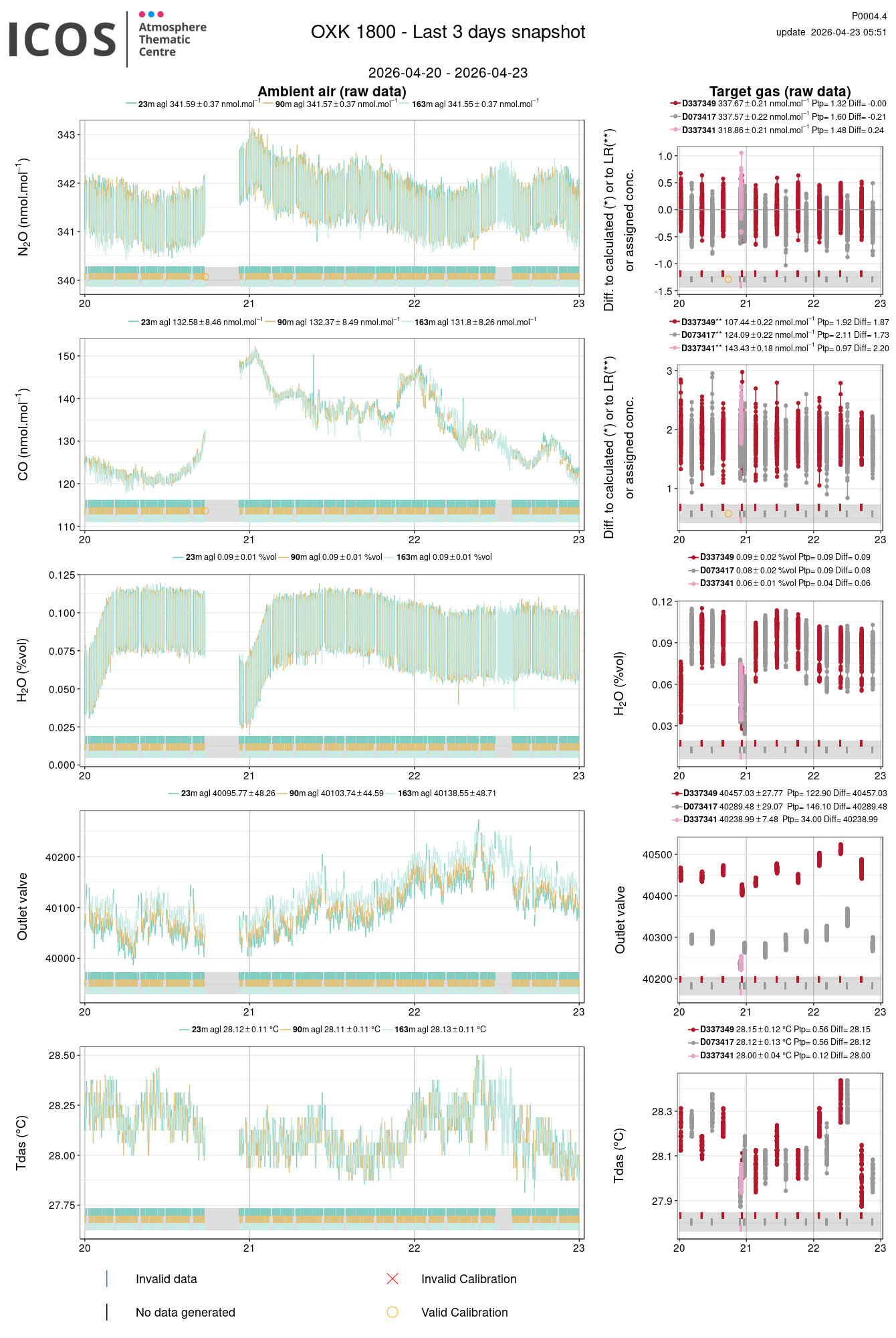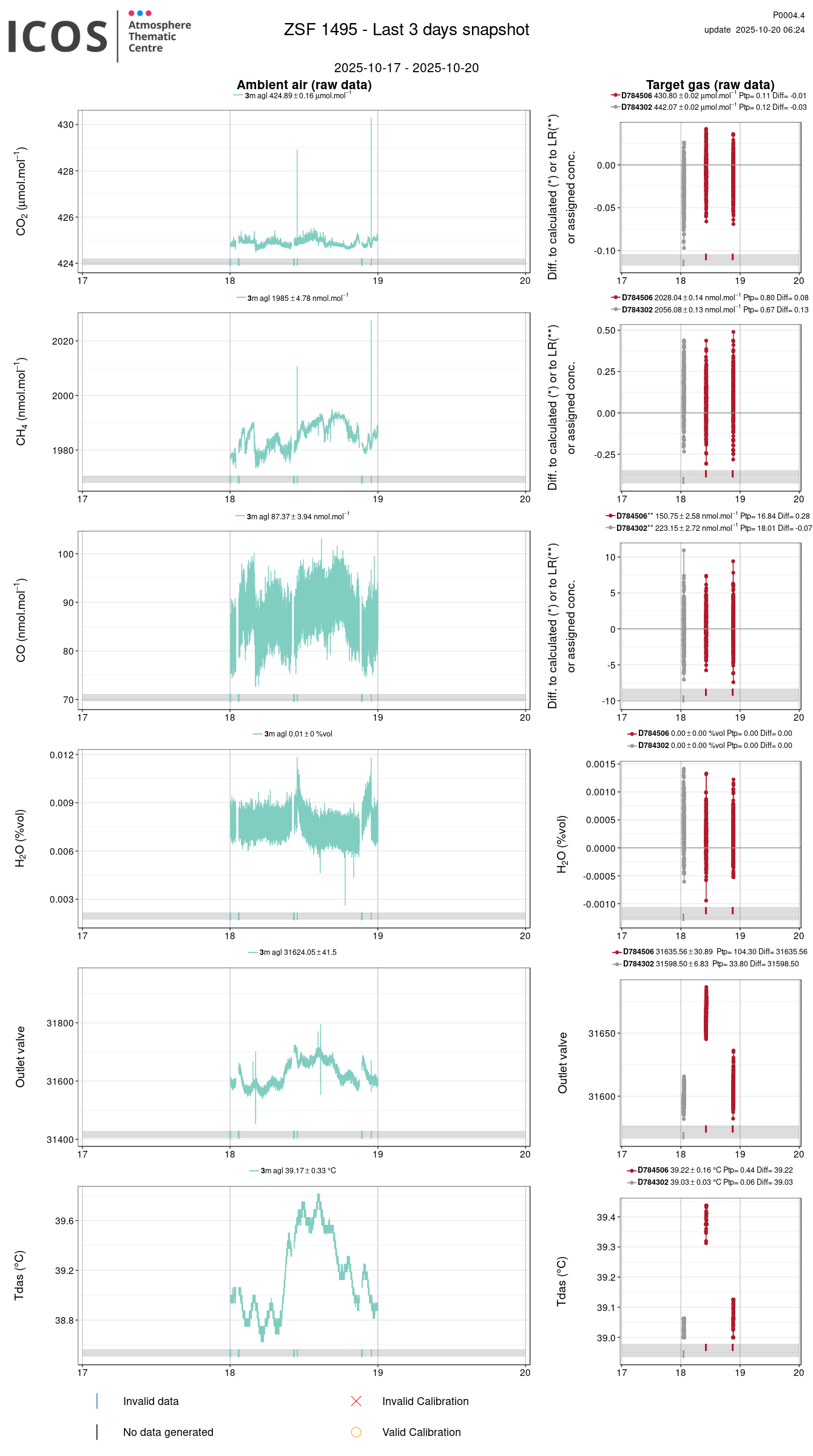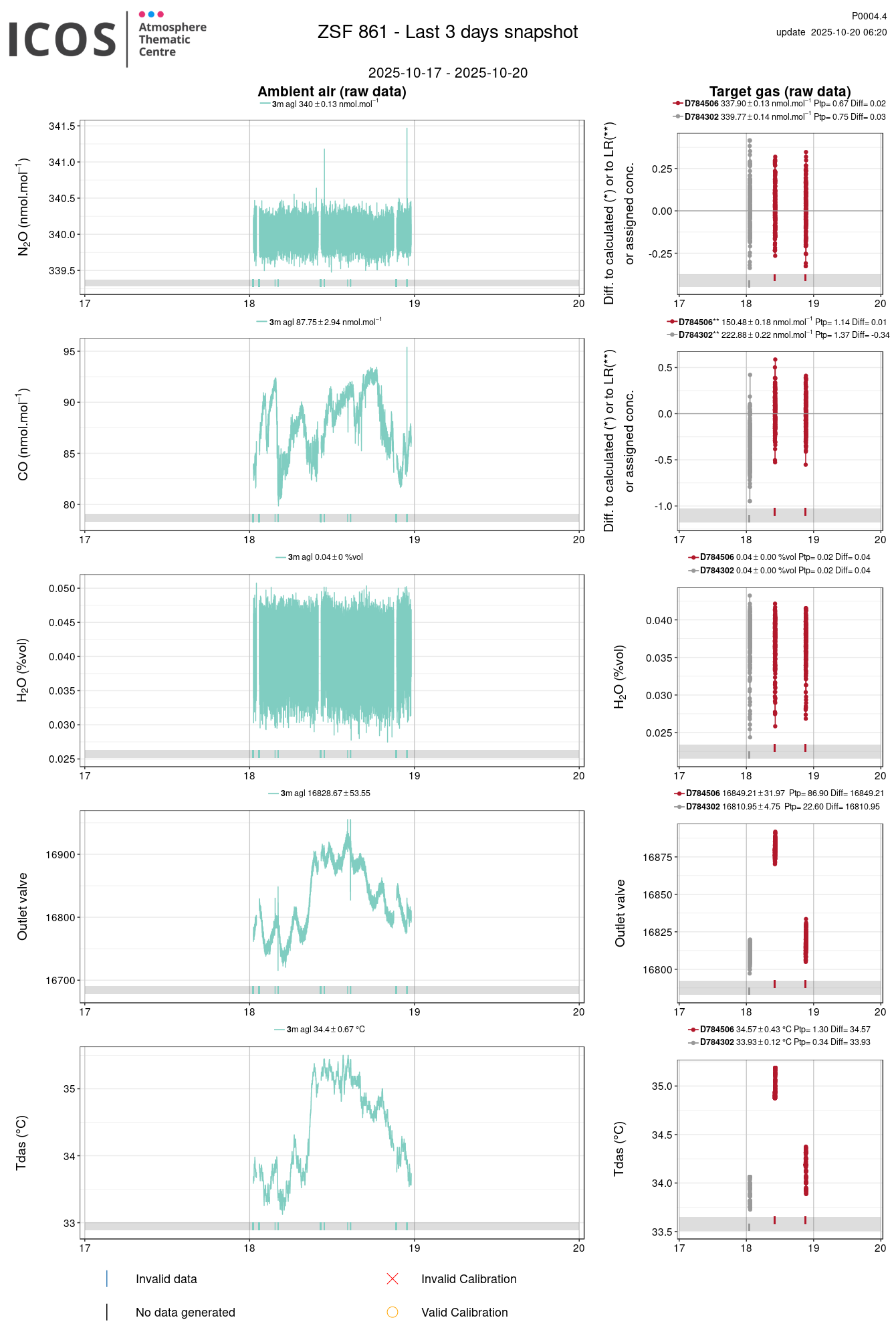 P0004.4 product shows the last 3 days air timeseries. For the given site and instrument, each left box plot displays the timeseries of a air species while ambient air is measured ; and each right box plot displays the timeseries of a air species while a target air is measured. Colors on the left plots represents sampling heights, colors on the right plot represents target tanks.