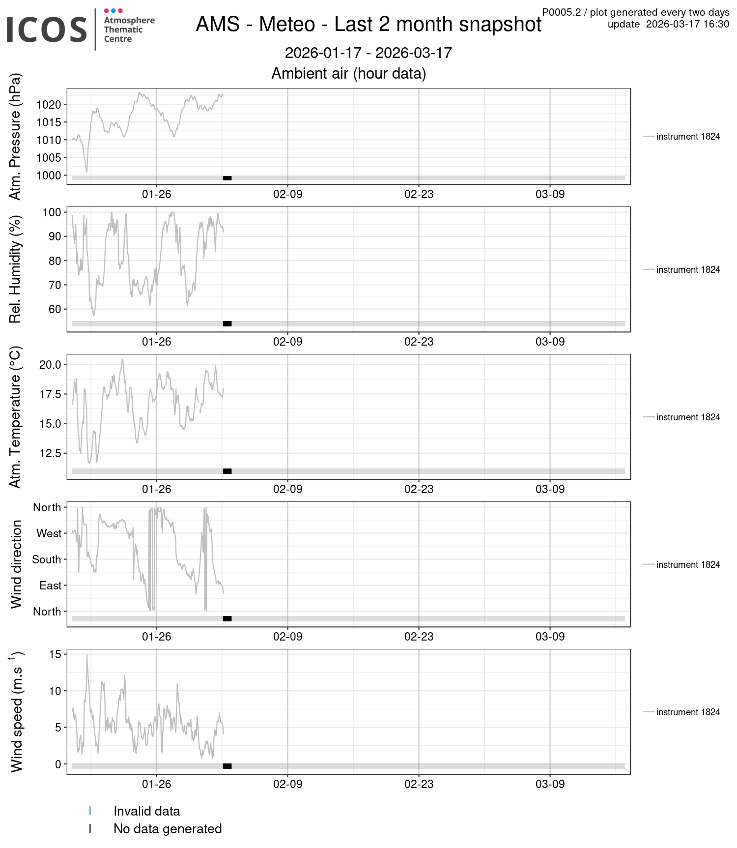 P0005.2 product shows the last month meteo timeseries. For the given site, each box plot displays the timeseries of a meteo parameter, each line representing the measure at a given sampling height.
