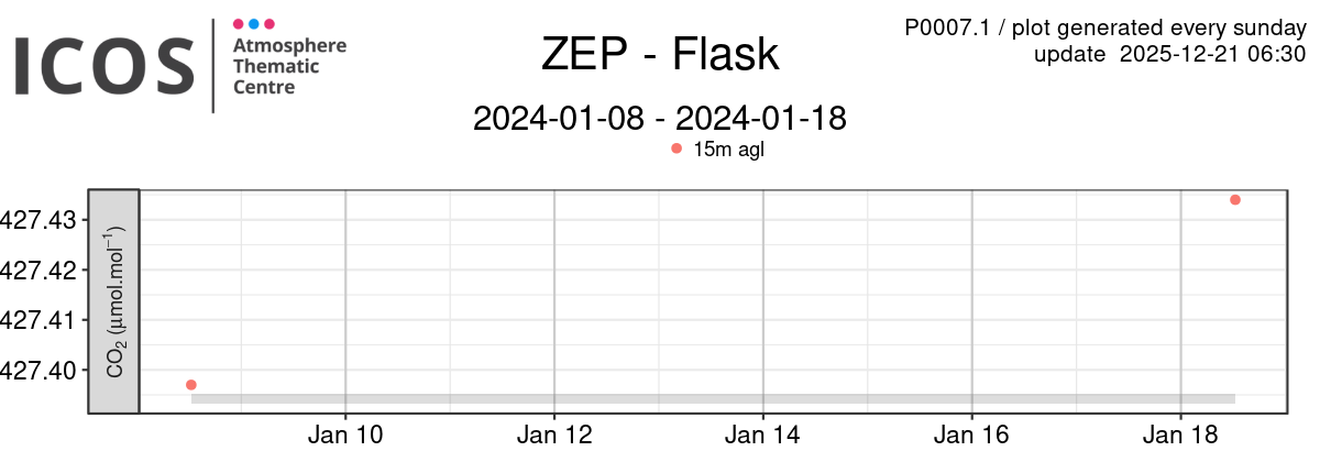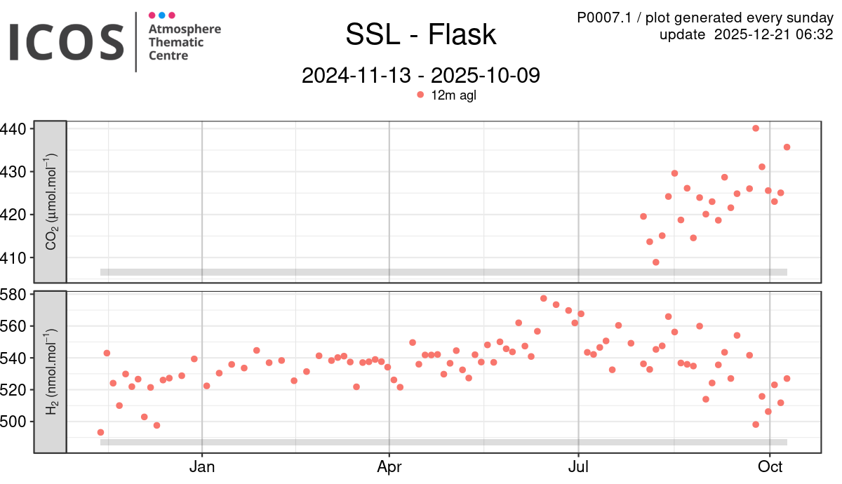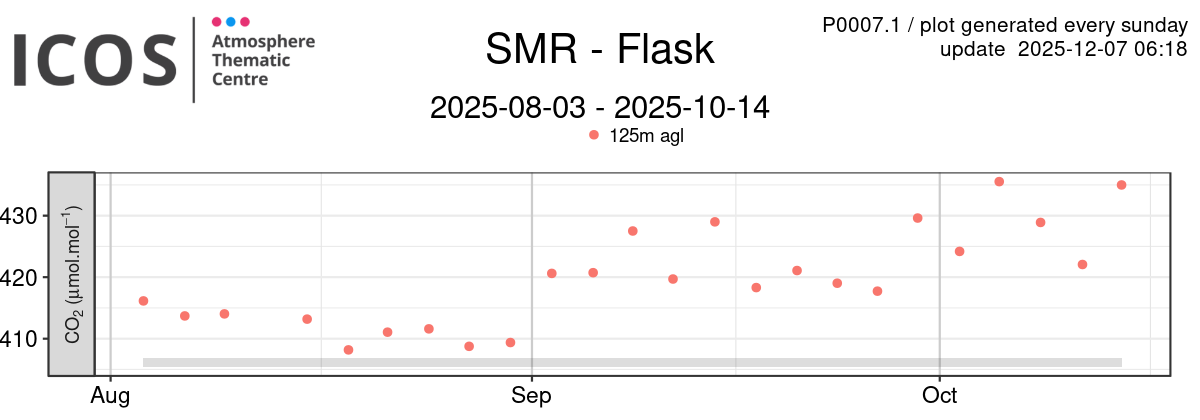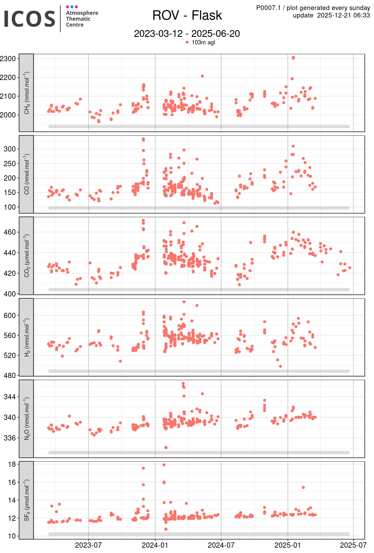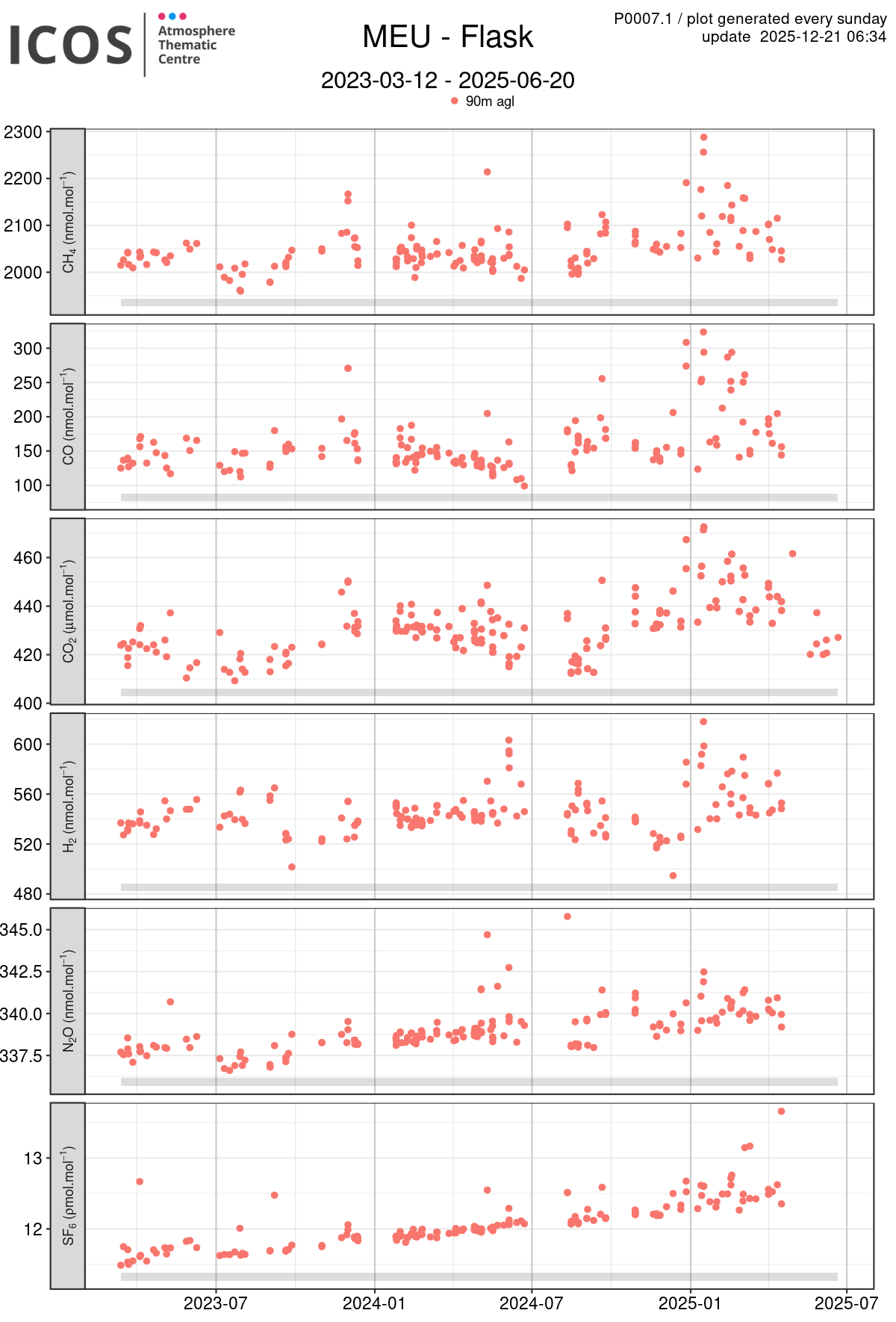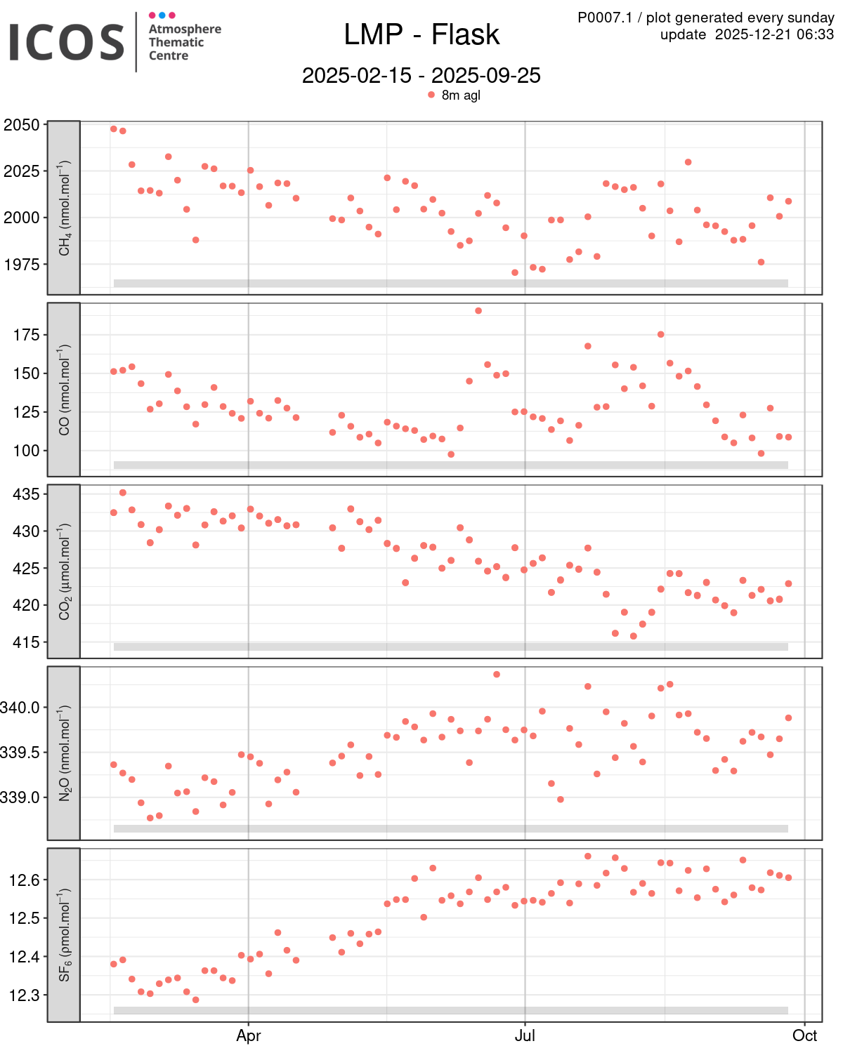 P0007.1 product shows the timeseries of the GHG measured from air sampled in flasks. For the given site, each box plot displays the timeseries of a GHG species. The sampling height is given by the points' color.