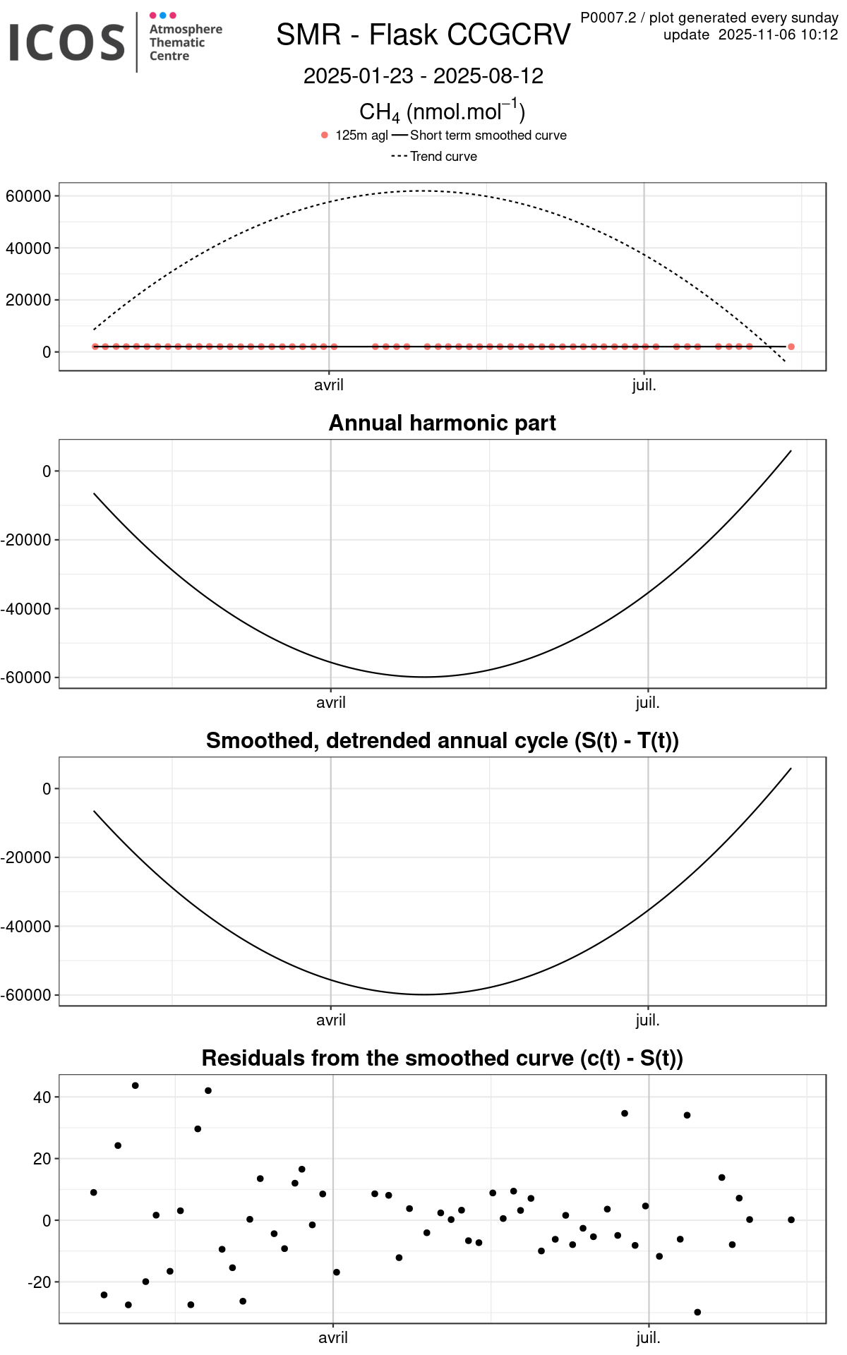 P0007.2 product show various NOAA's CCGCRV fitting for flasks GHG data. For the given site and species, the original flasks' data is displayed, as well as the short term smooth curve, the trend curve, the annual harmonic part, the smoothed and detrended annual cycle ant the residuals from the smoothed curve. These values (trend, harmonics, residuals, etc.) are calculated using NOAA's CCGCRV program (see this page for details)