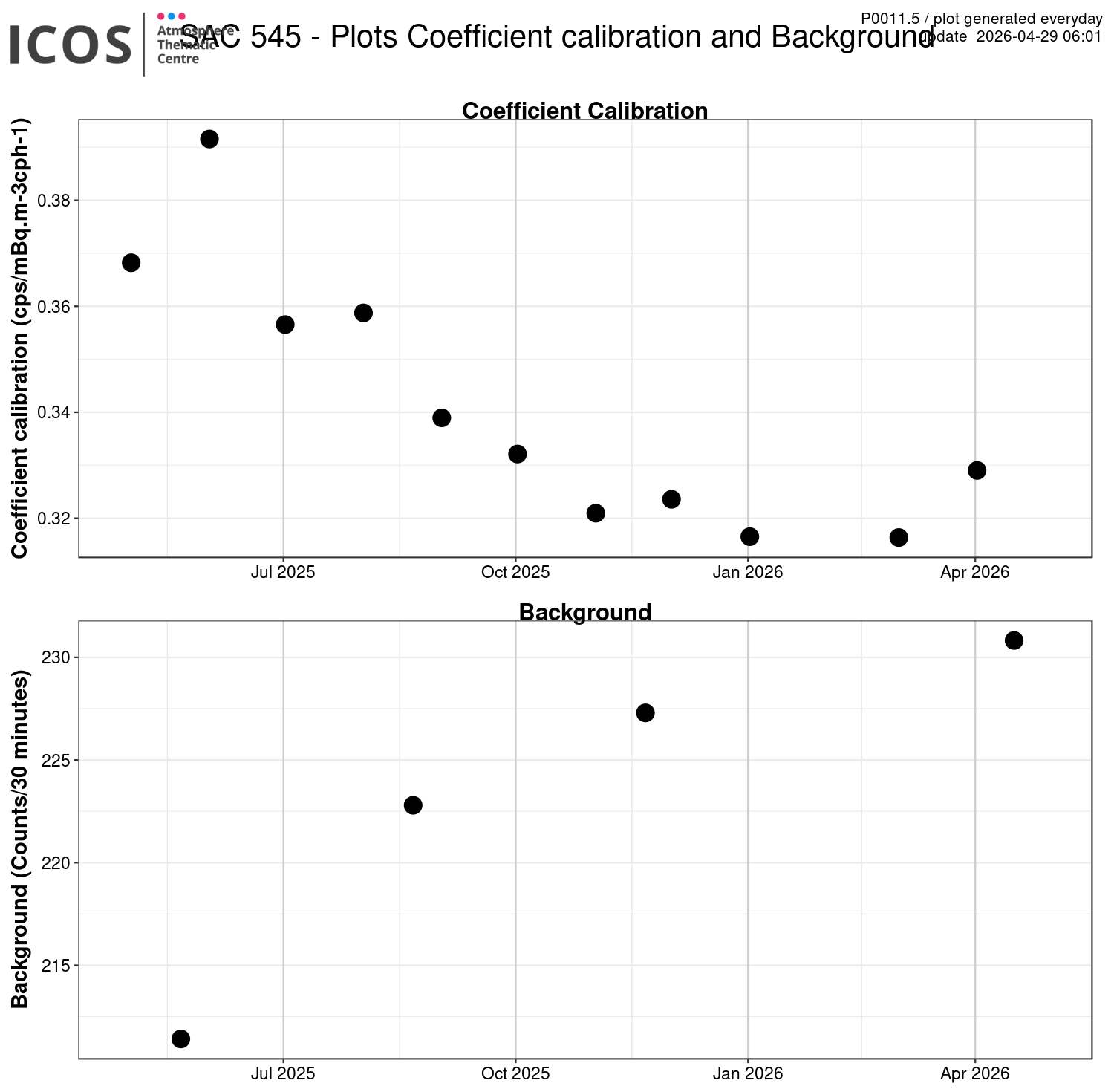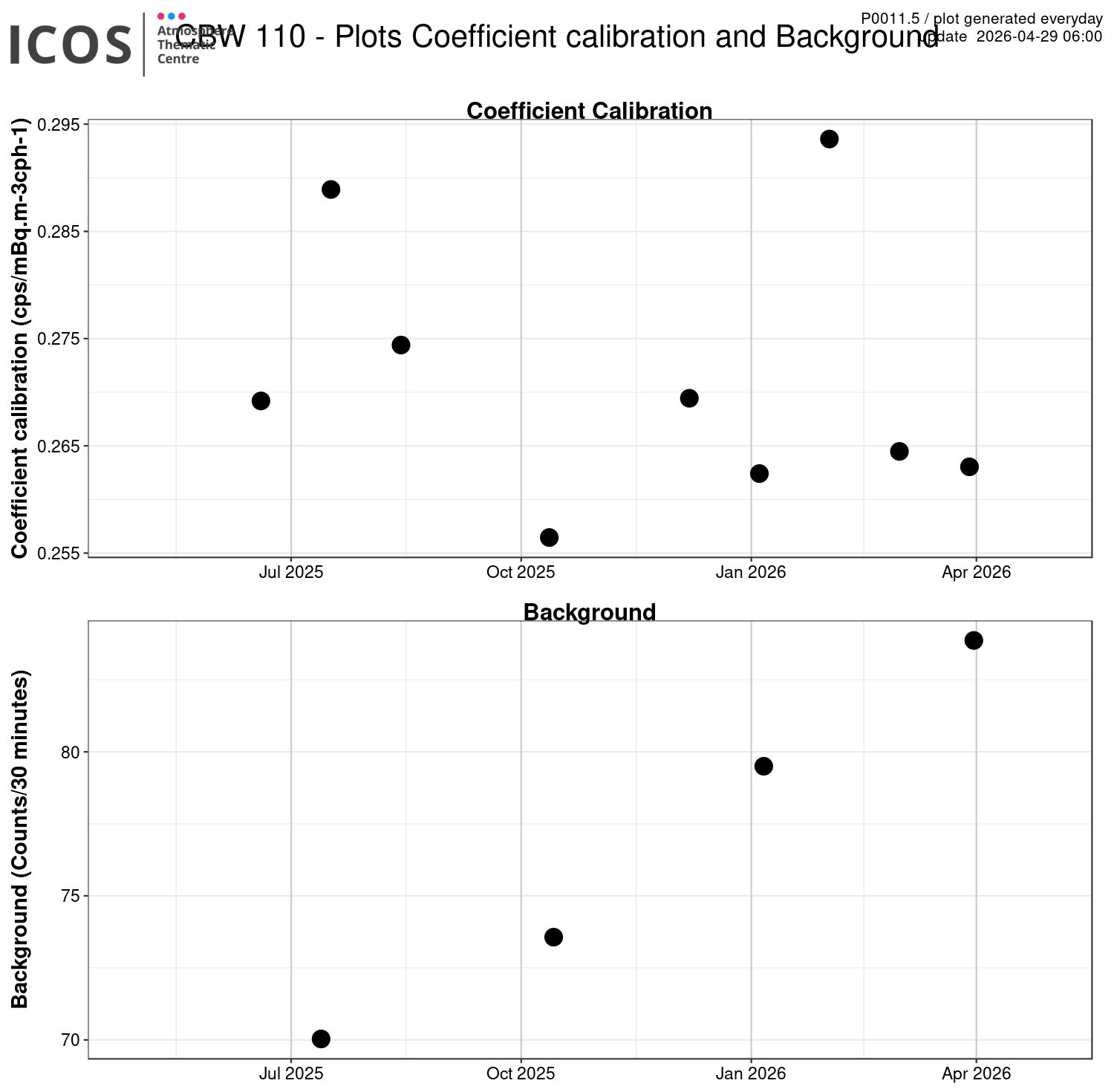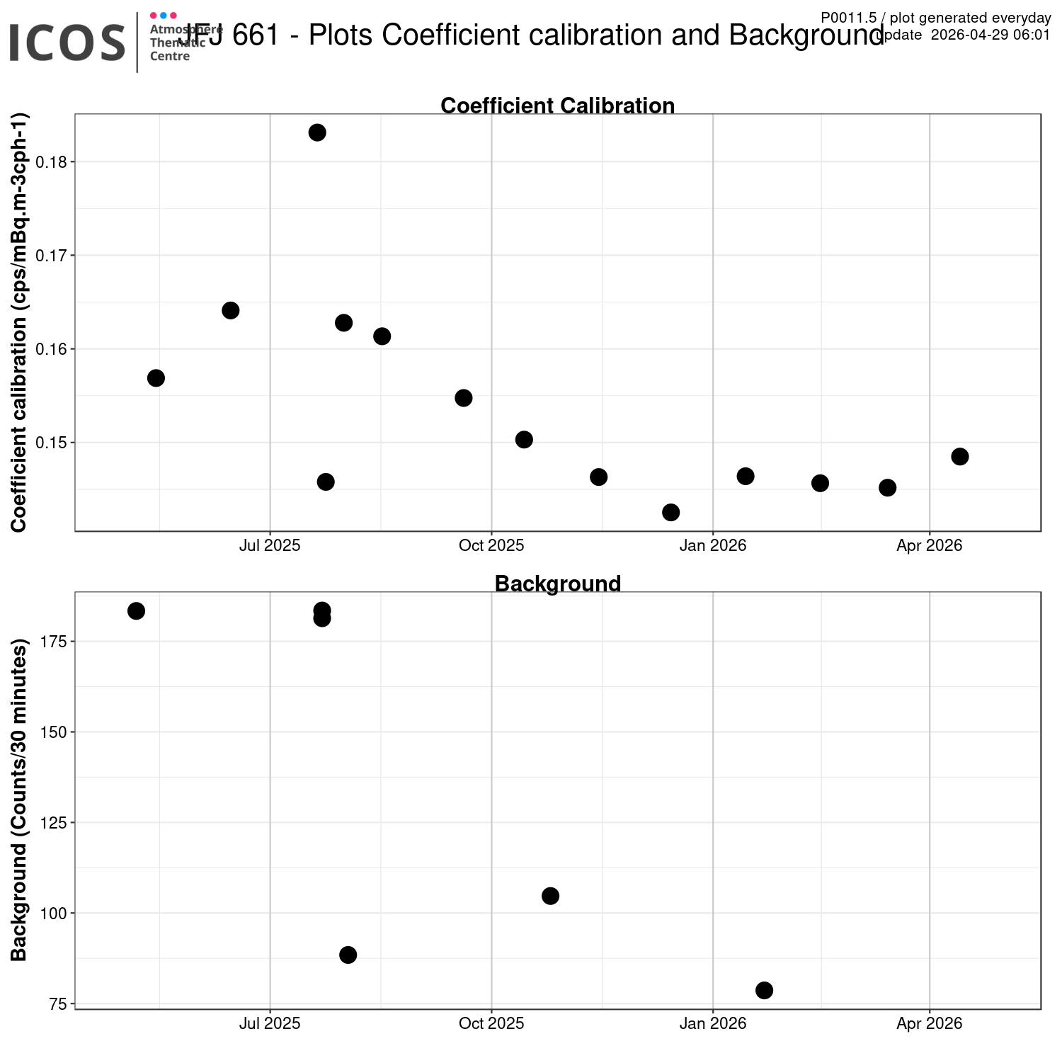P0011.5 show the calibration coefficient and background for the ANSTO radon over the last year.