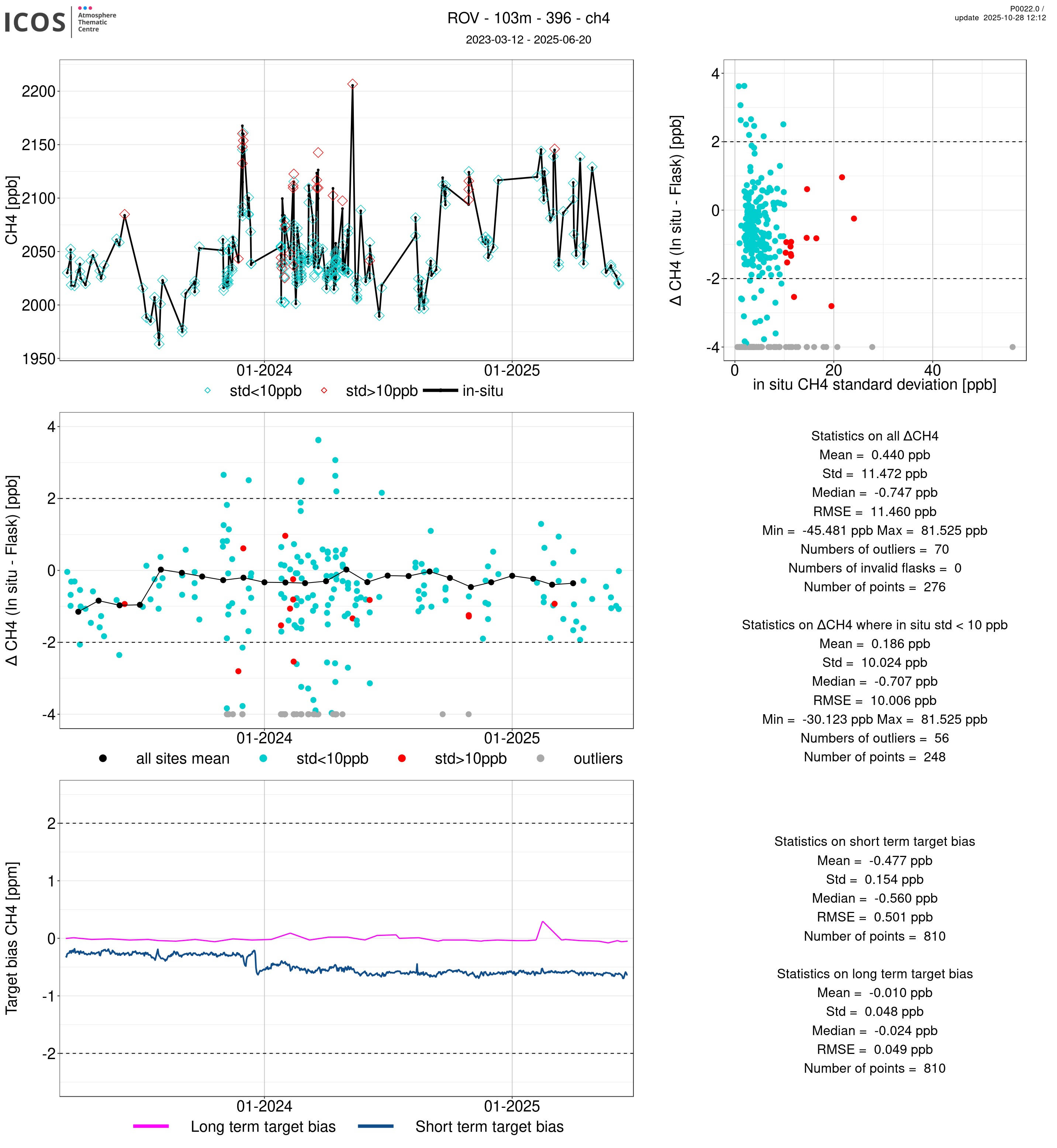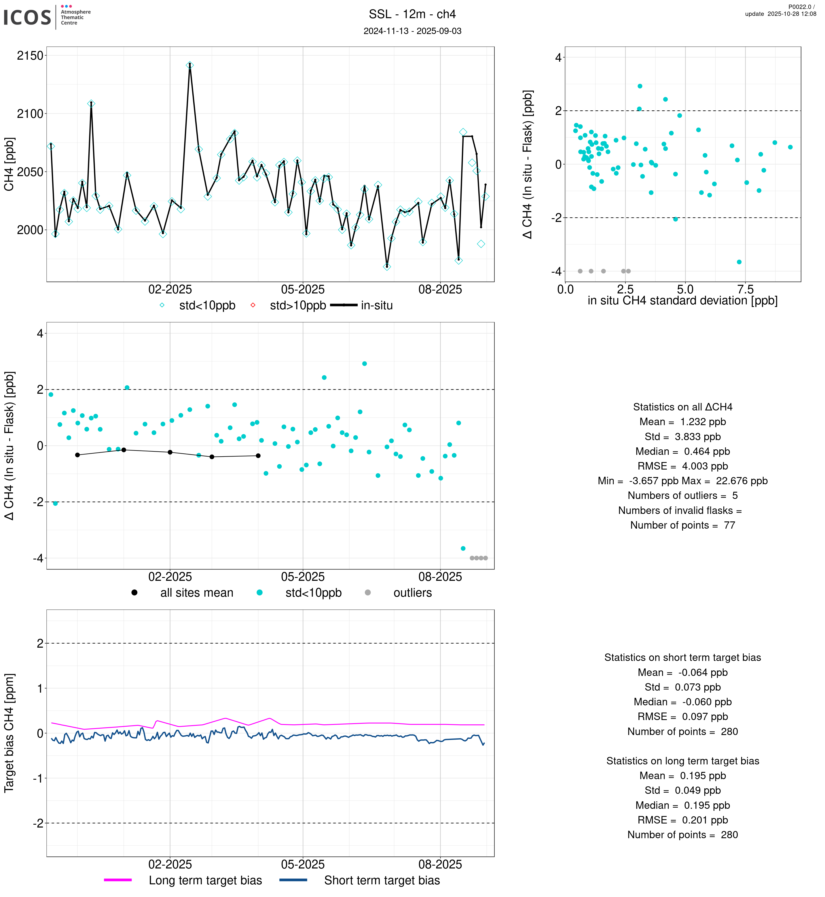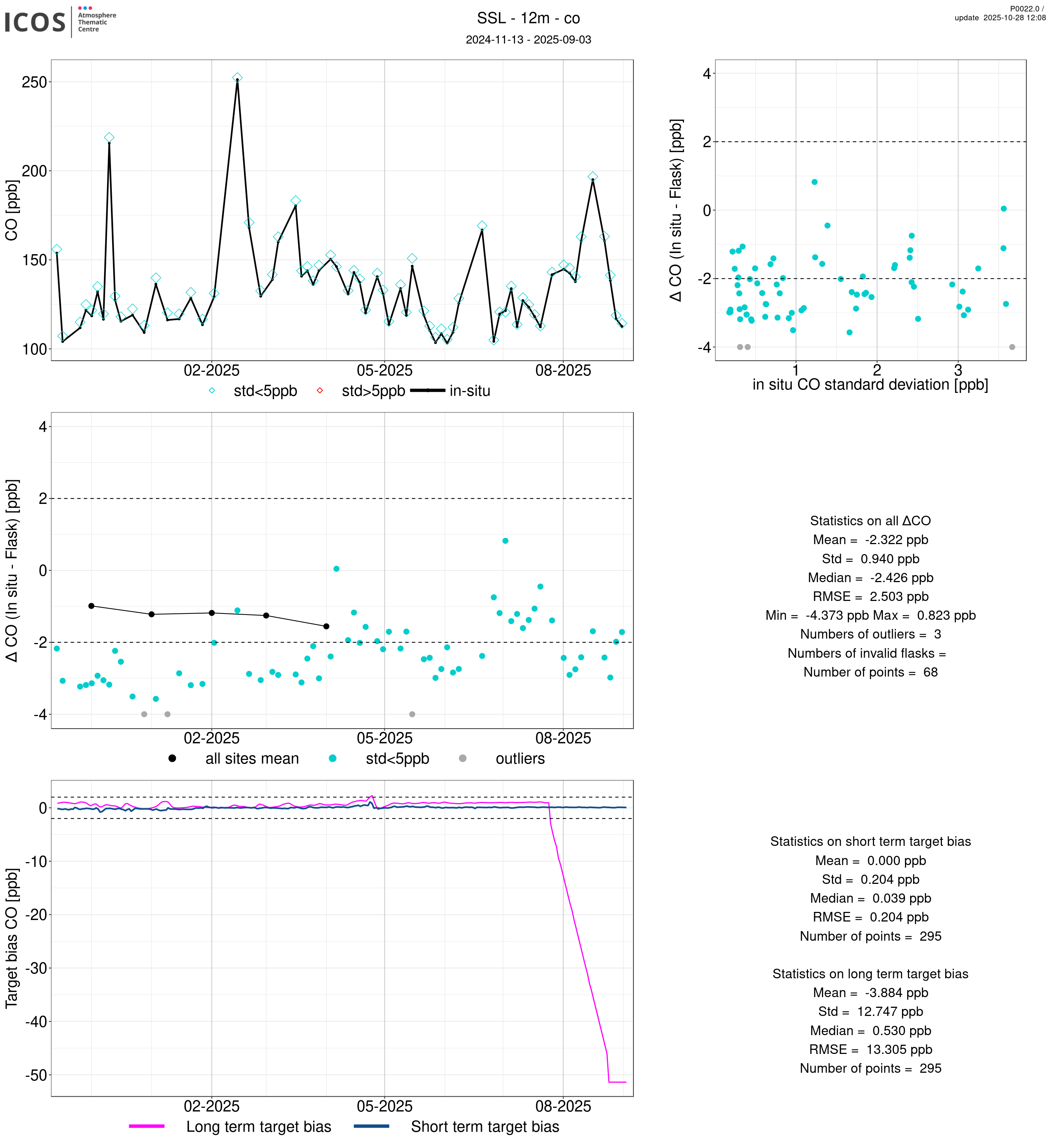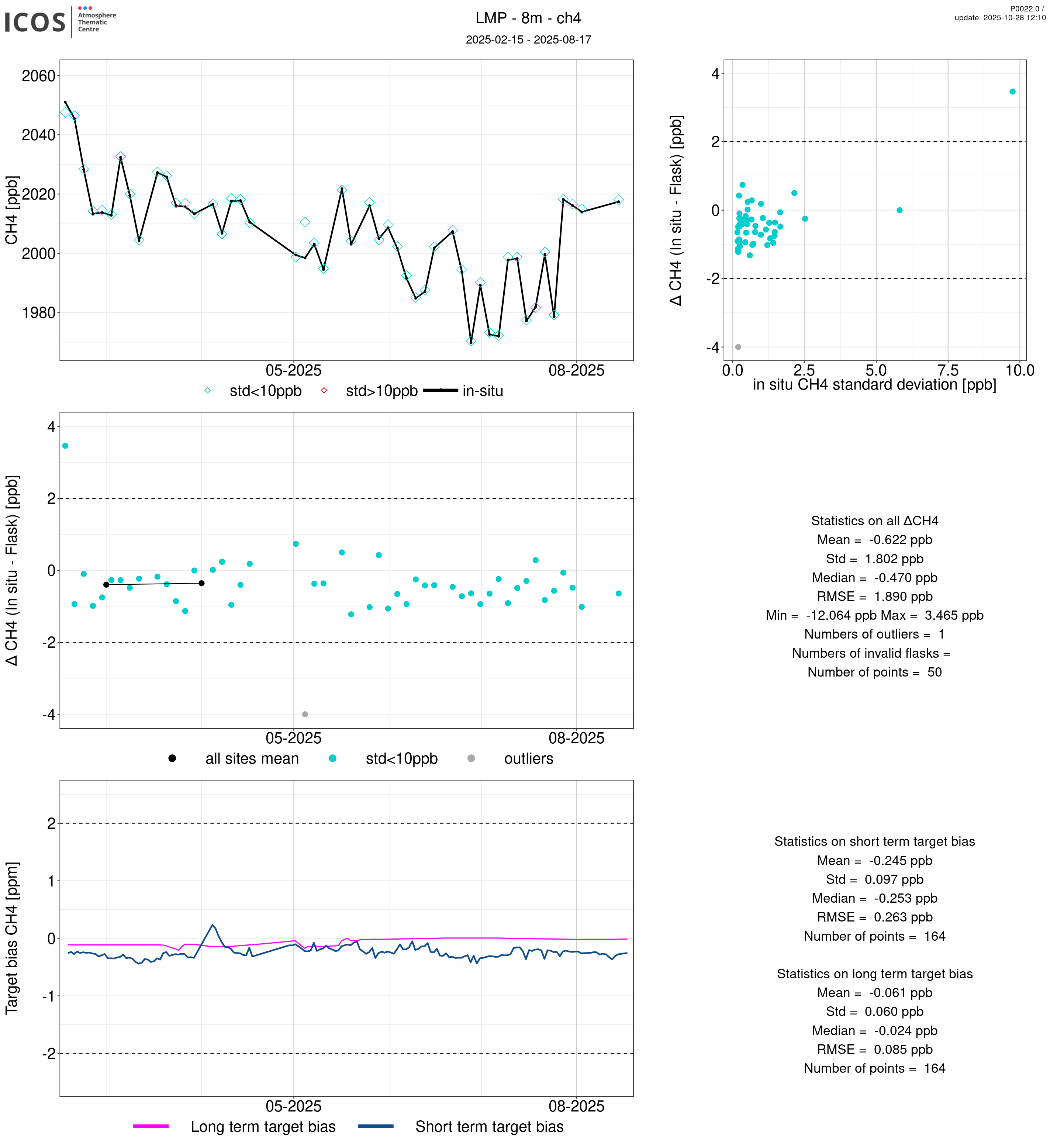 P0022.0 product shows the ambient air -flask difference over the station whole timeseries. For the given site and instrument/CTS, the upper left box plot displays the timeseries of air and flask species ; the middle left box shows the air-flask difference over time while the lower left box plot shows the LT and ST bias. The upper right box plot shows the air- flask difference versus the air standard deviation. Colors show the standard deviation categories. Grey points indicates data that are outside the y-axis.