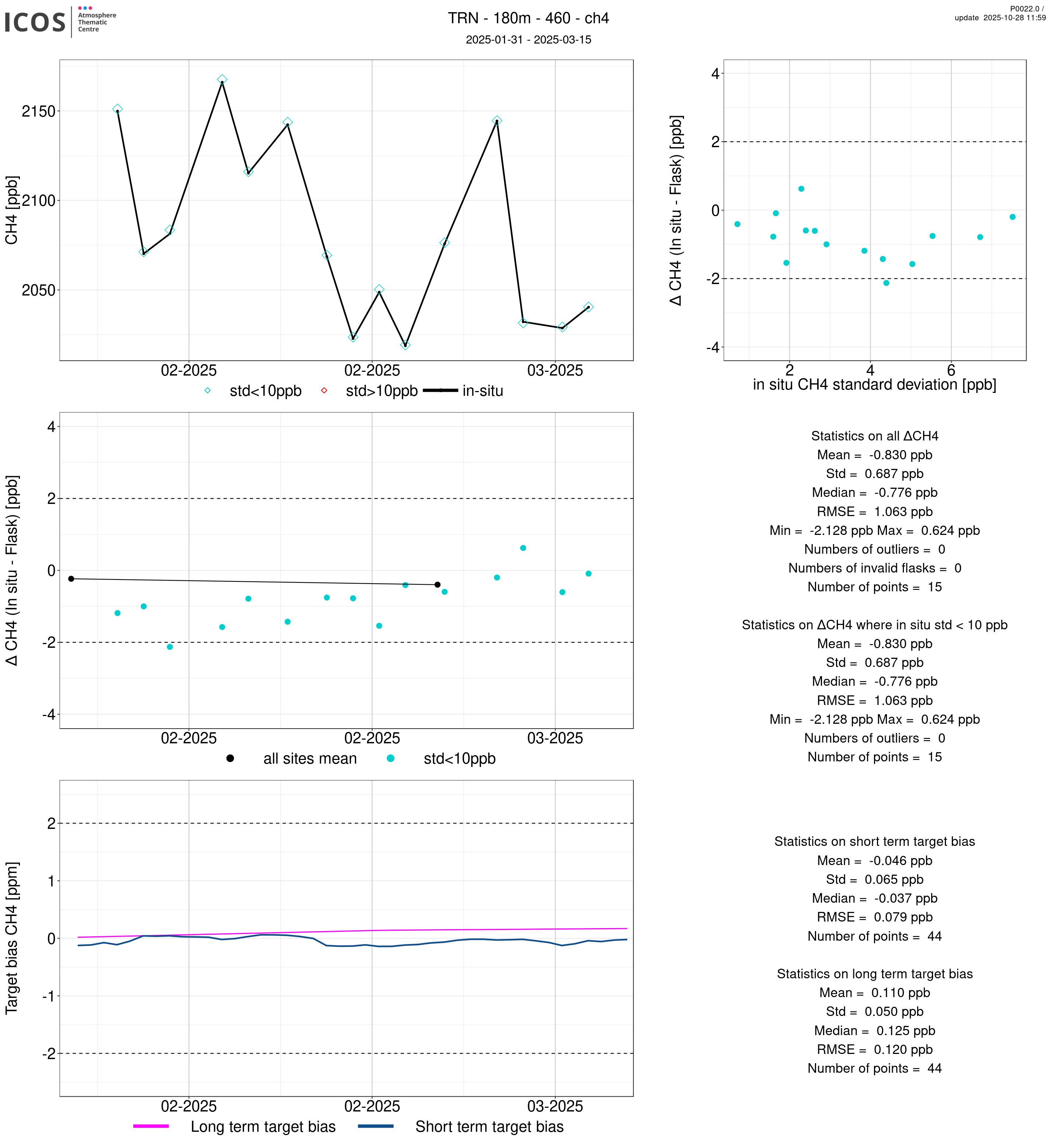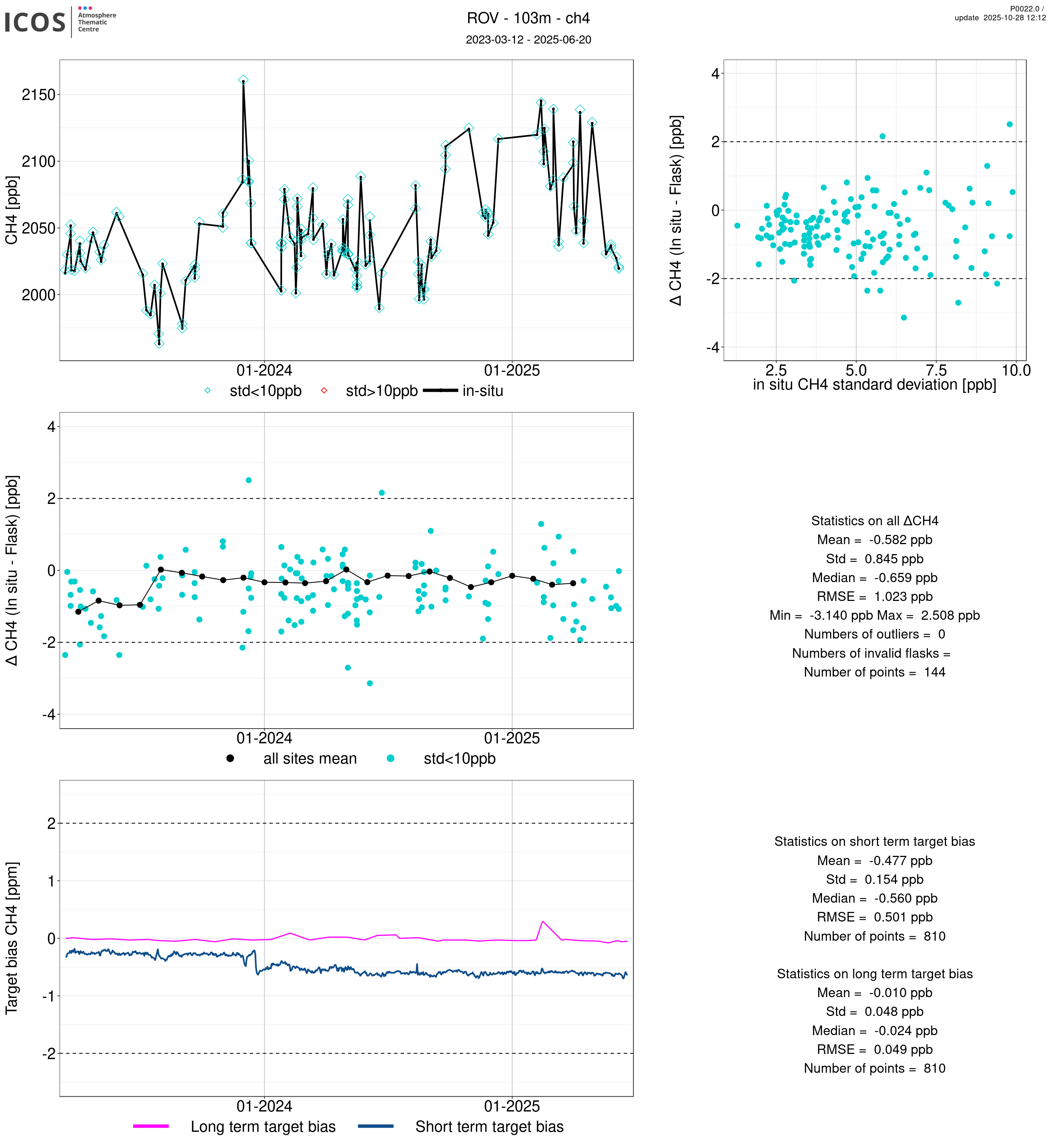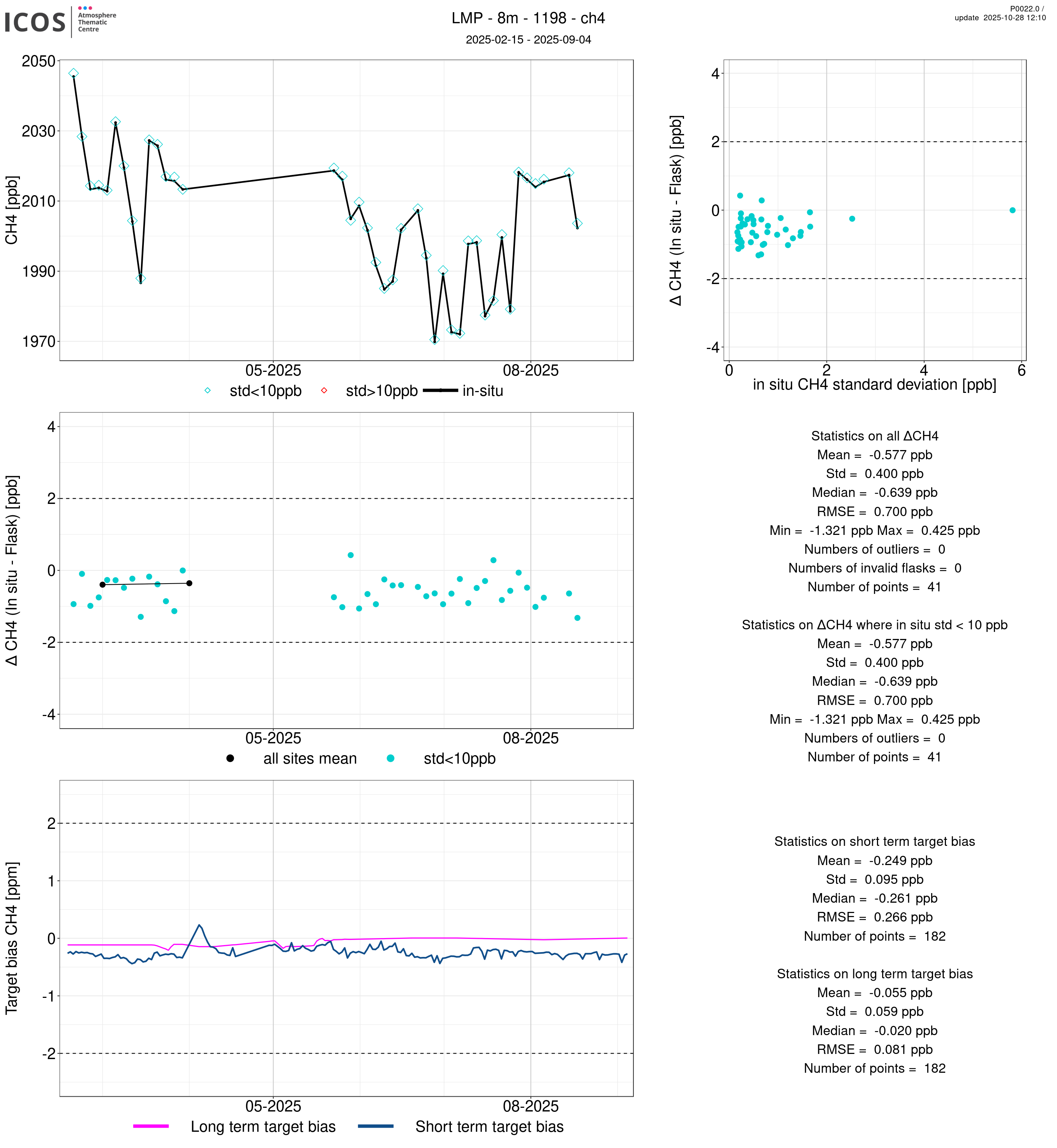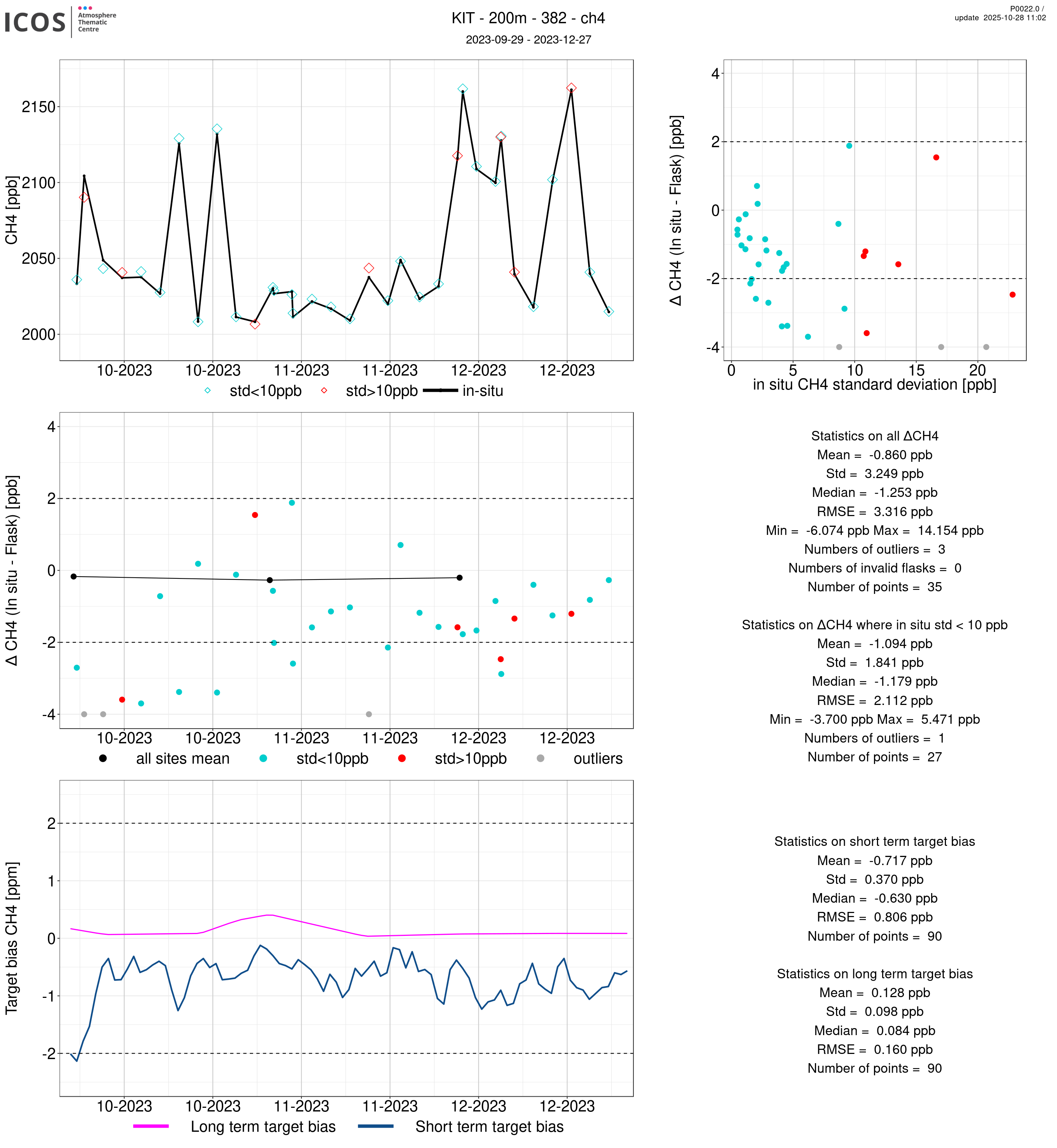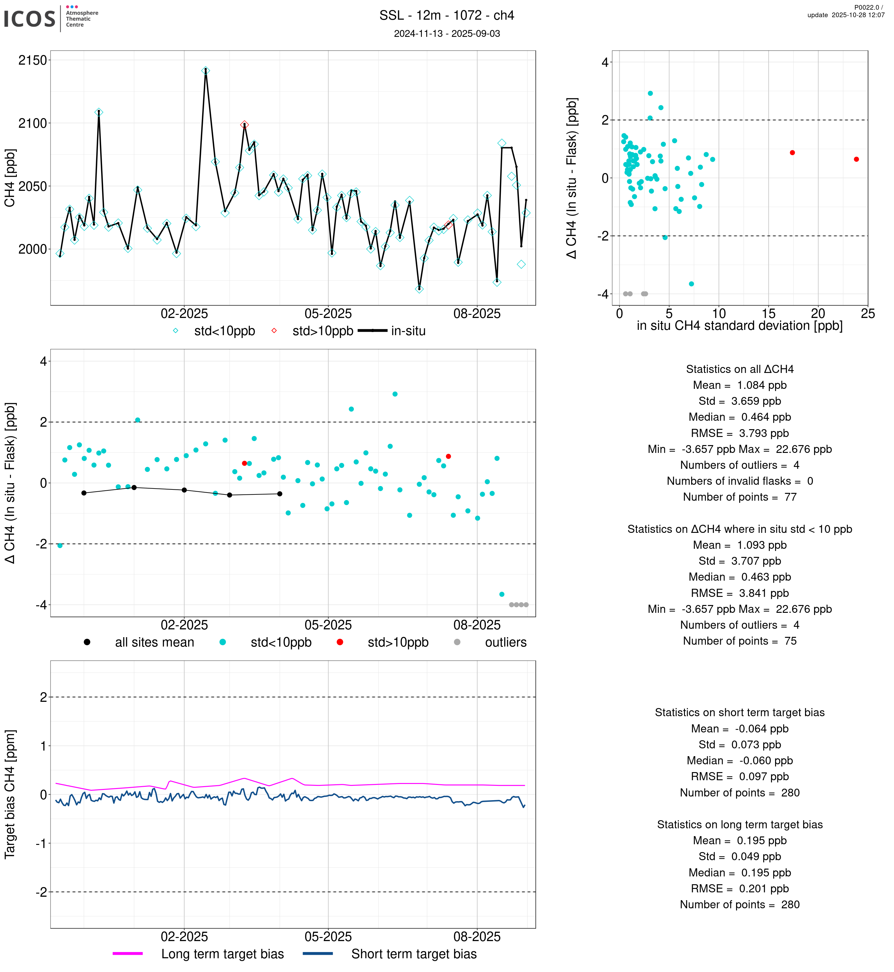 P0022.0 product shows the ambient air -flask difference over the station whole timeseries. For the given site and instrument/CTS, the upper left box plot displays the timeseries of air and flask species ; the middle left box shows the air-flask difference over time while the lower left box plot shows the LT and ST bias. The upper right box plot shows the air- flask difference versus the air standard deviation. Colors show the standard deviation categories. Grey points indicates data that are outside the y-axis.