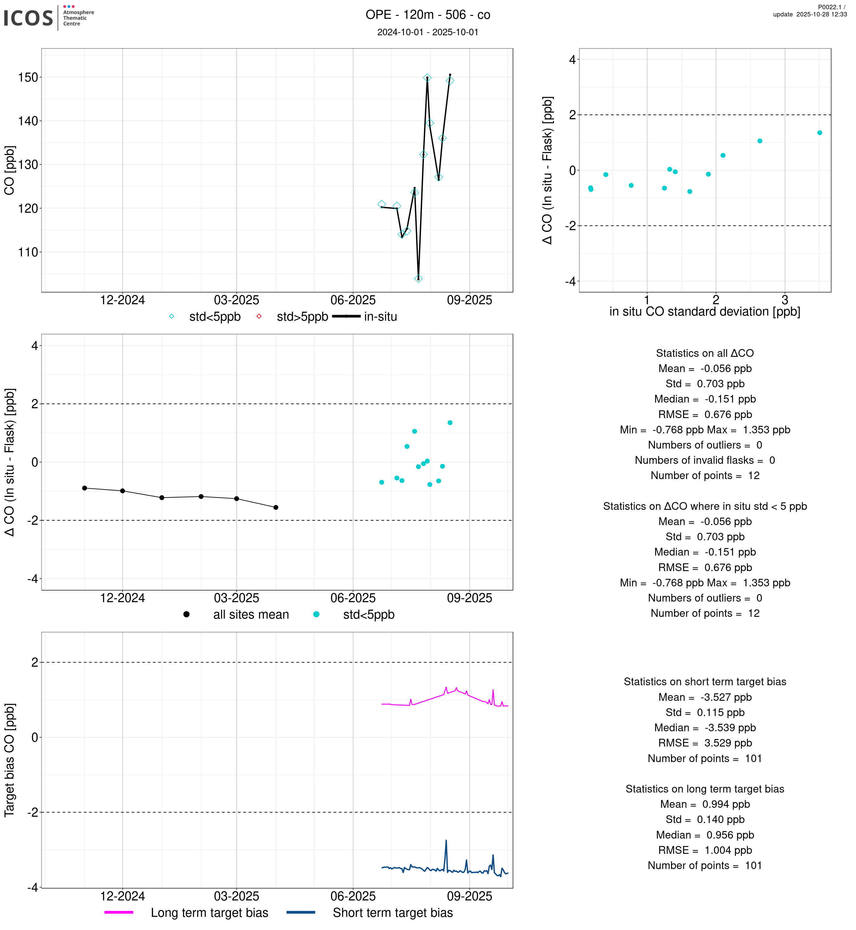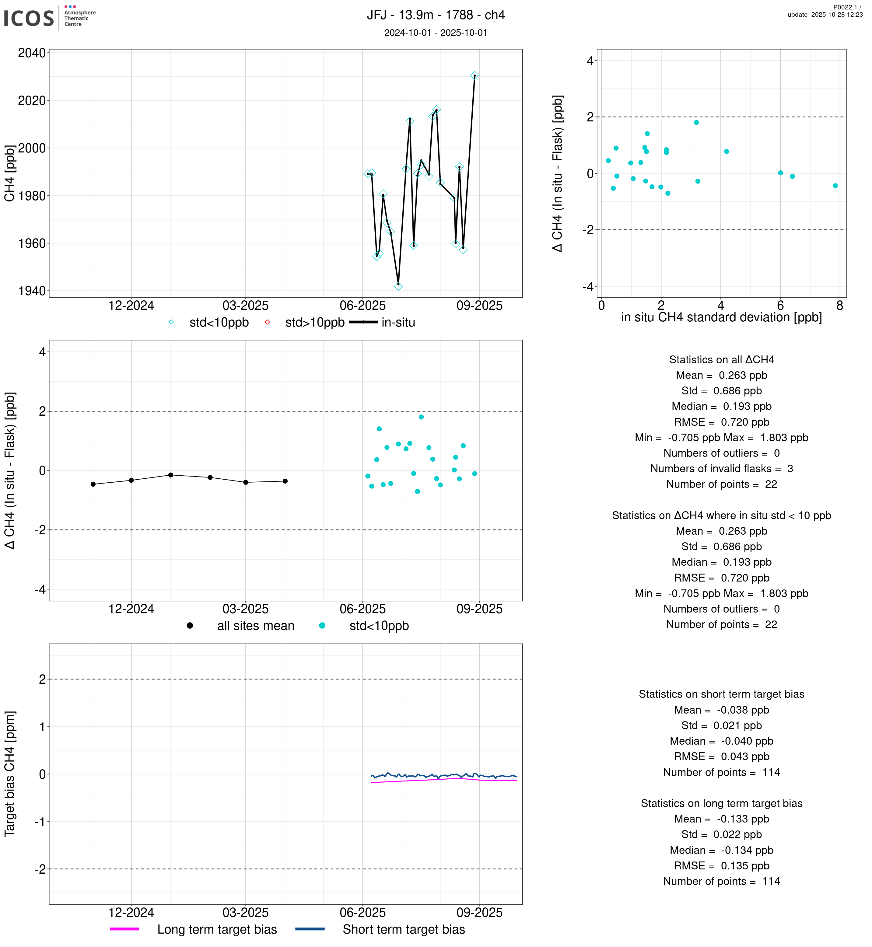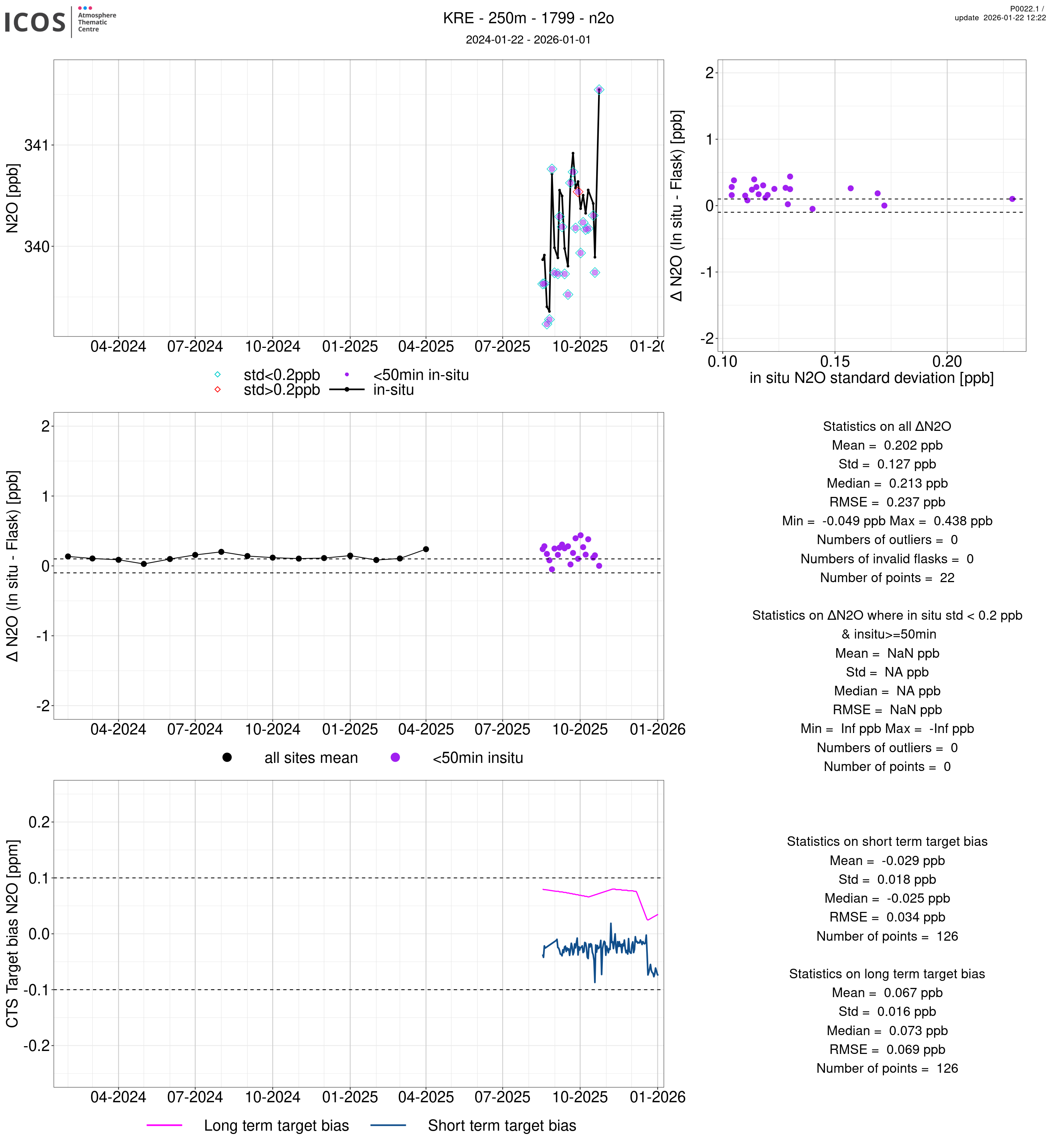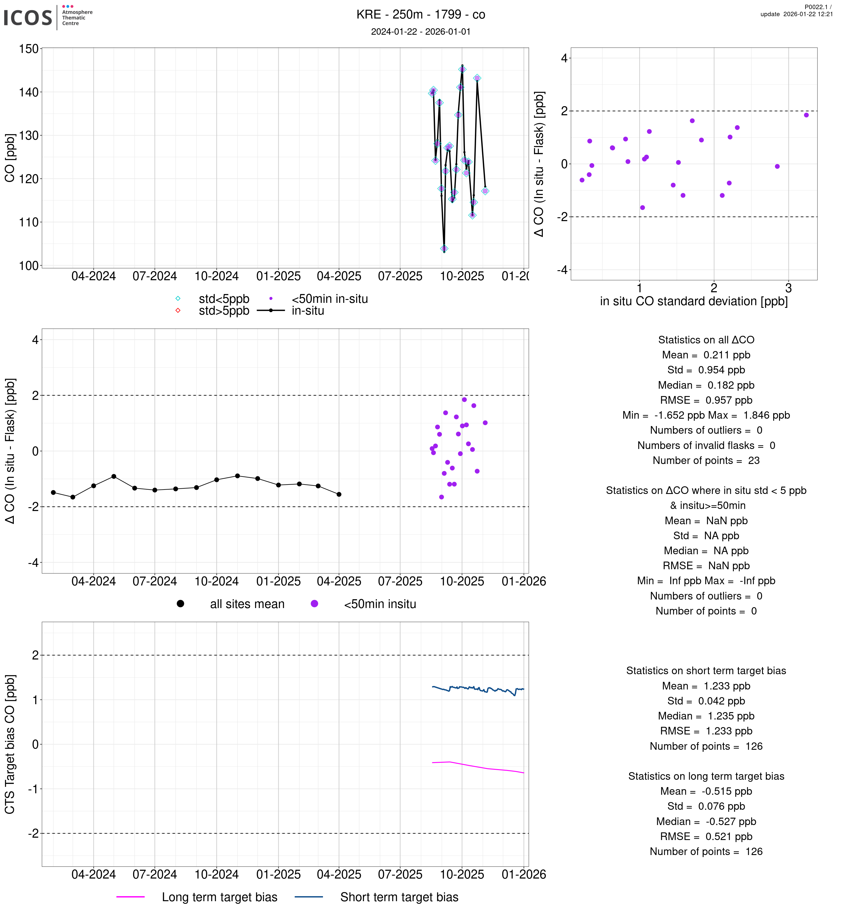 P0022.1 product shows the ambient air -flask difference over one year. For the given site and instrument/CTS, the upper left box plot displays the timeseries of air and flask species ; the middle left box shows the air-flask difference over time while the lower left box plot shows the LT and ST bias. The upper right box plot shows the air- flask difference versus the air standard deviation. Colors show the standard deviation categories. Grey points indicates data that are outside the y-axis.