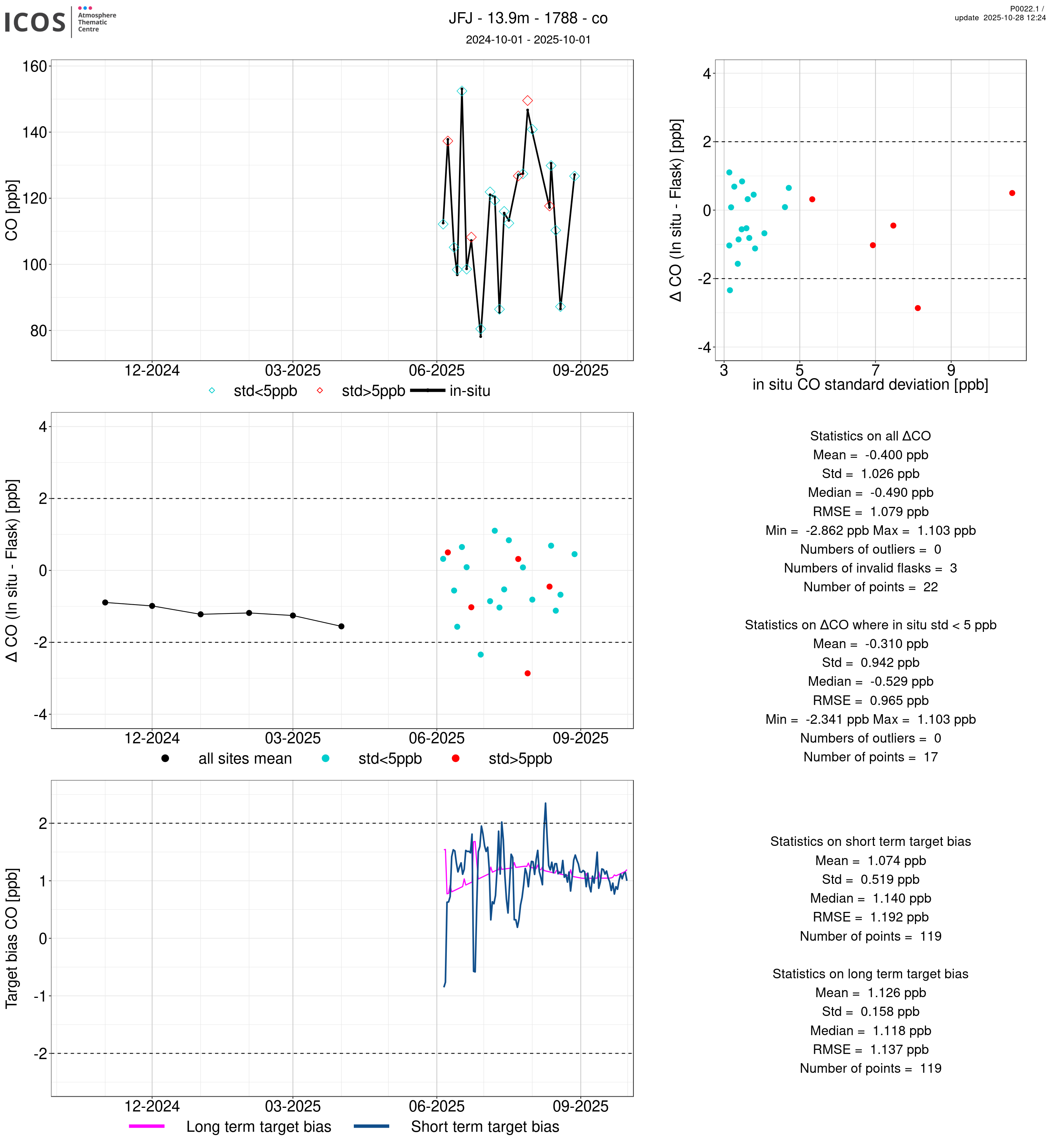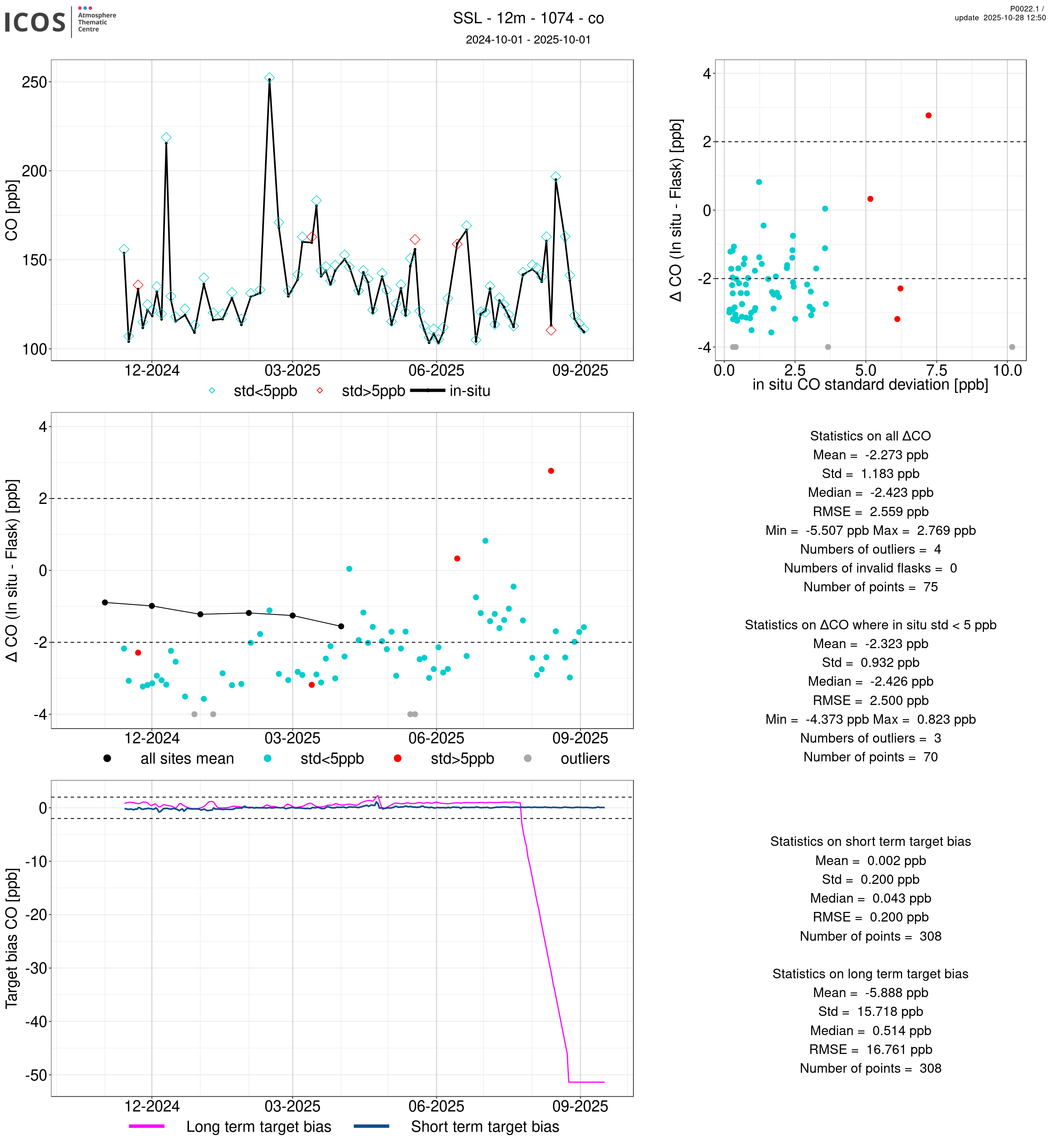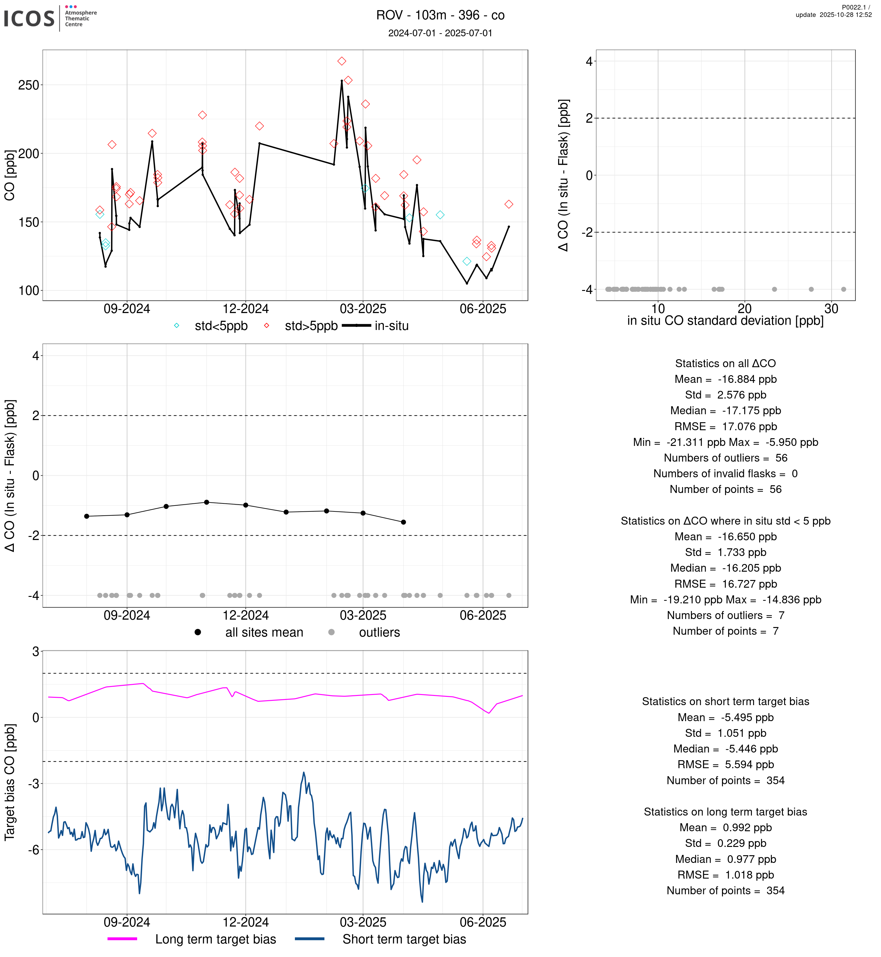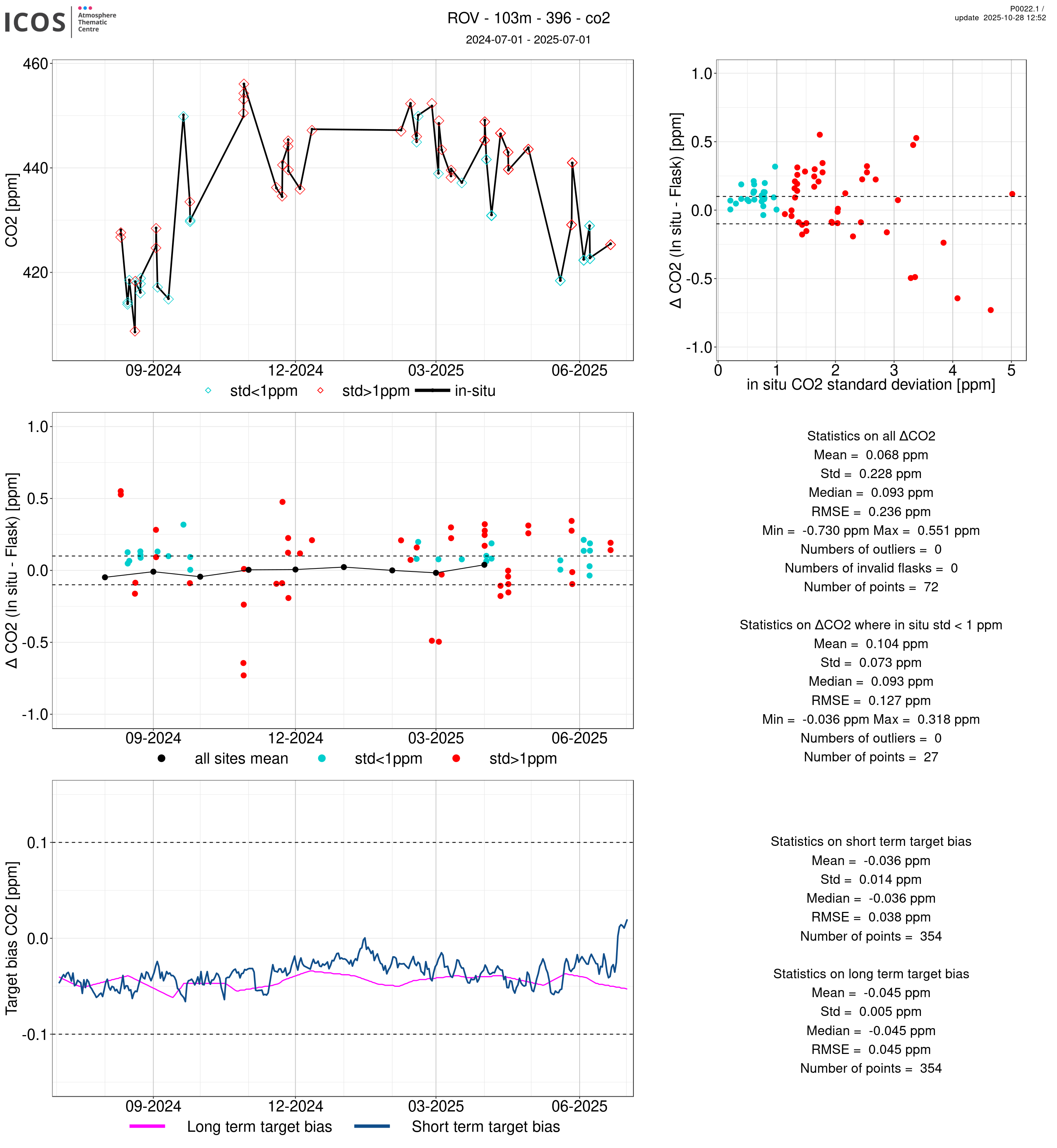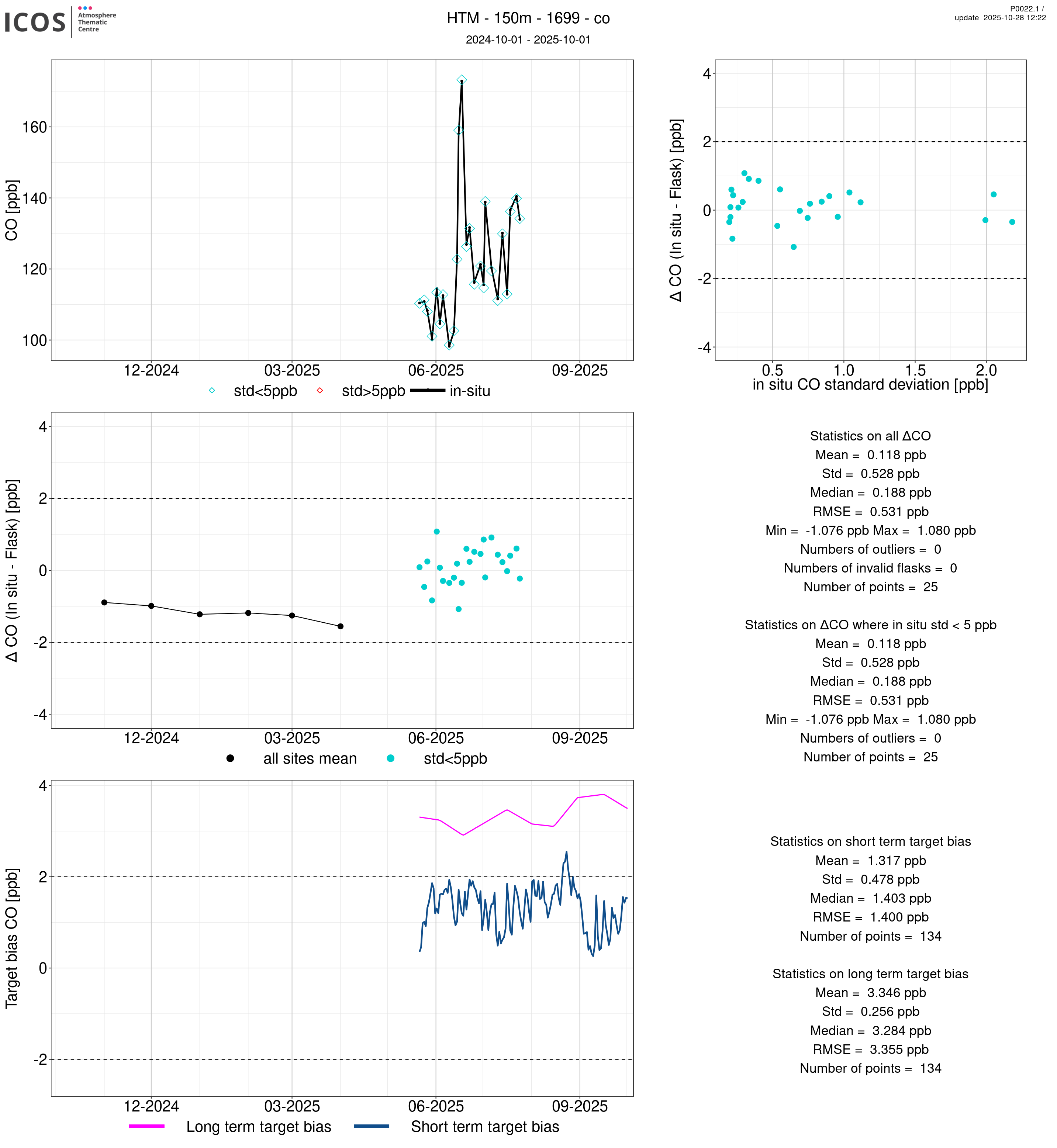 P0022.1 product shows the ambient air -flask difference over one year. For the given site and instrument/CTS, the upper left box plot displays the timeseries of air and flask species ; the middle left box shows the air-flask difference over time while the lower left box plot shows the LT and ST bias. The upper right box plot shows the air- flask difference versus the air standard deviation. Colors show the standard deviation categories. Grey points indicates data that are outside the y-axis.