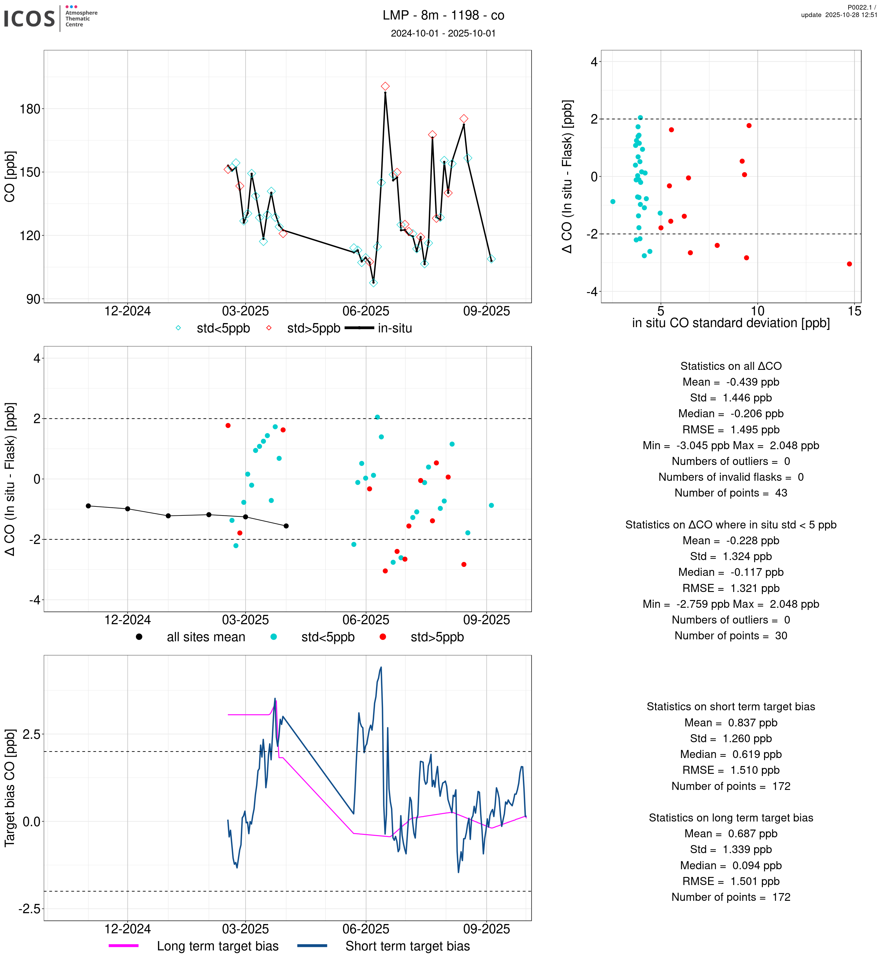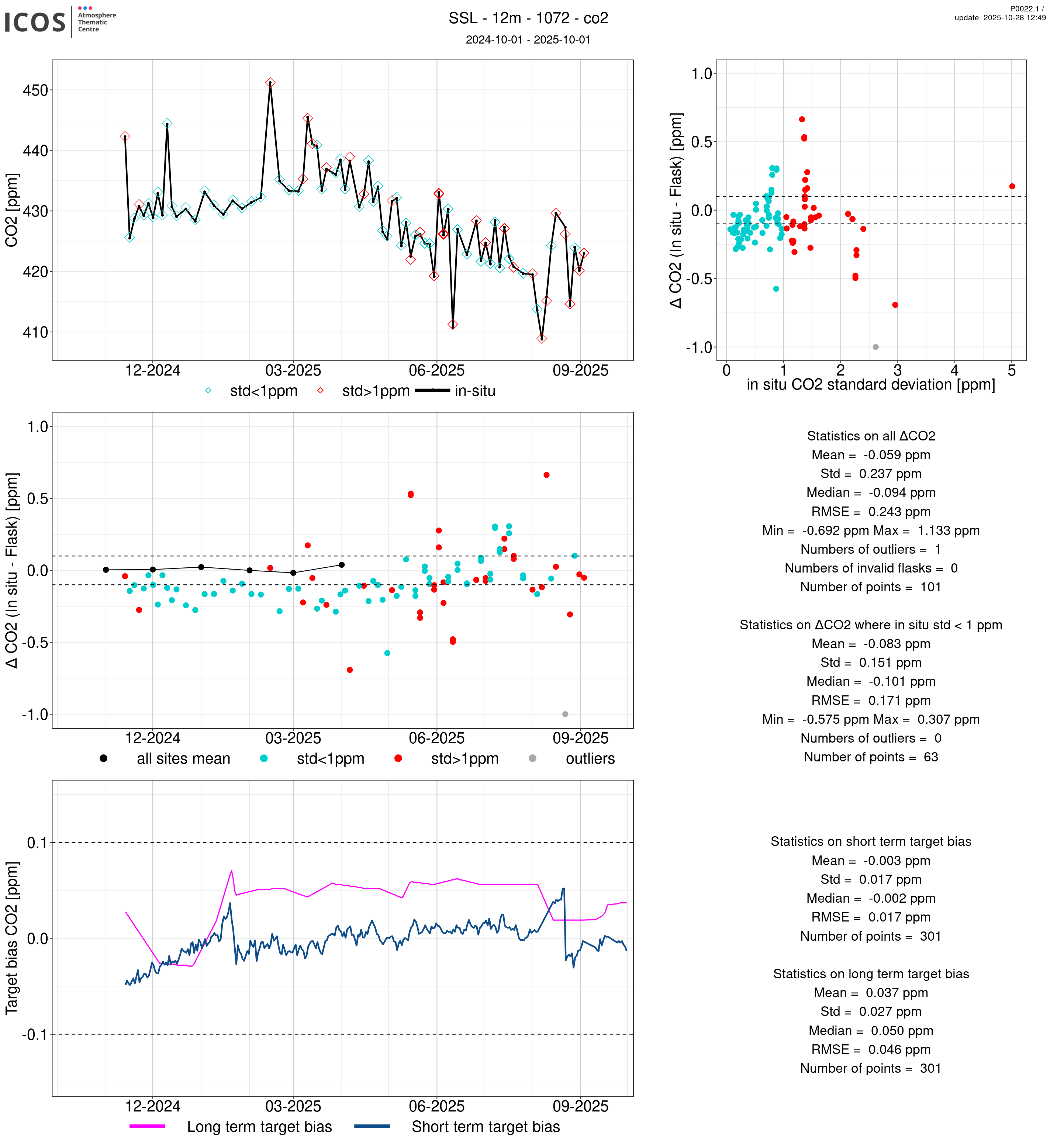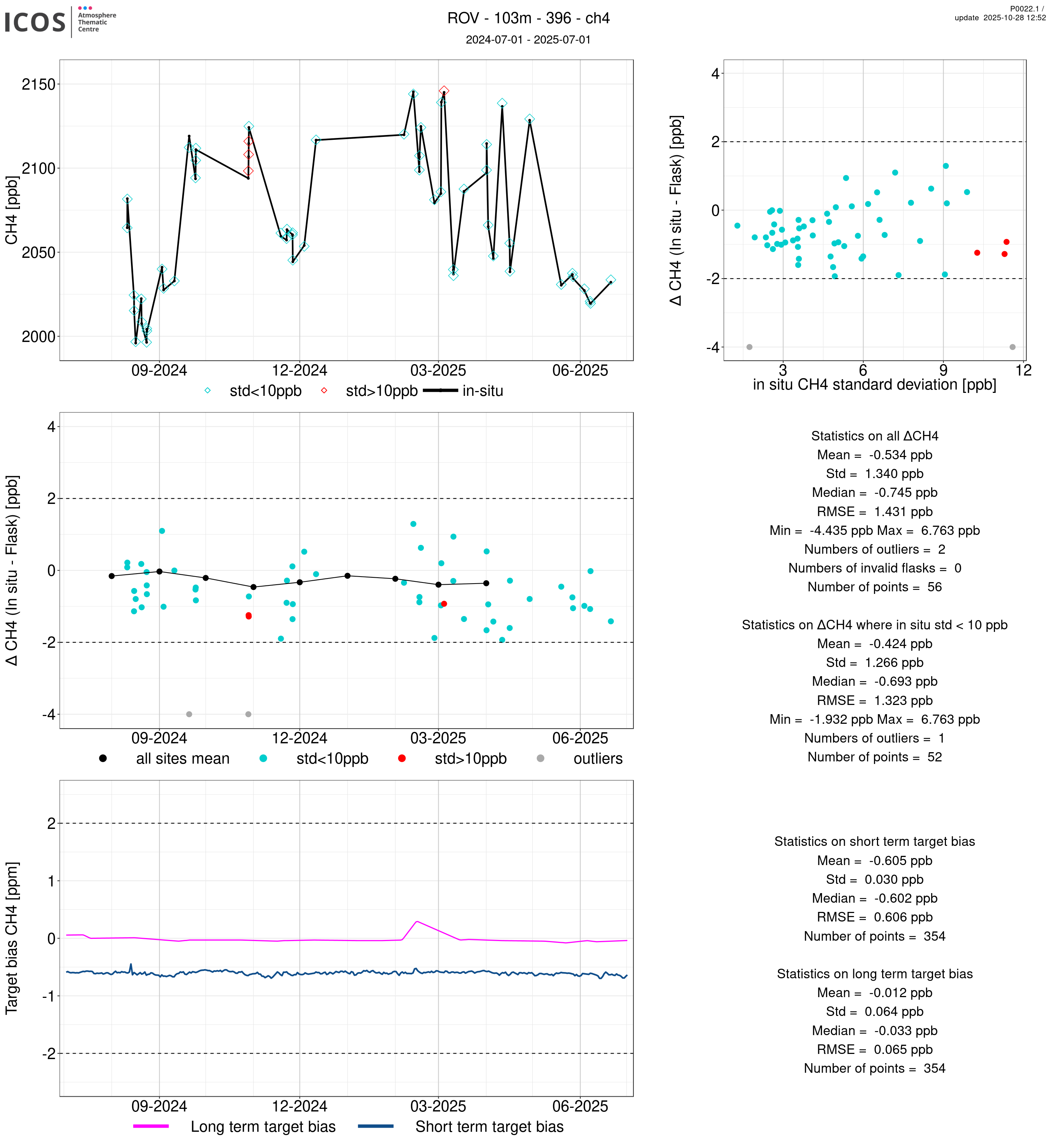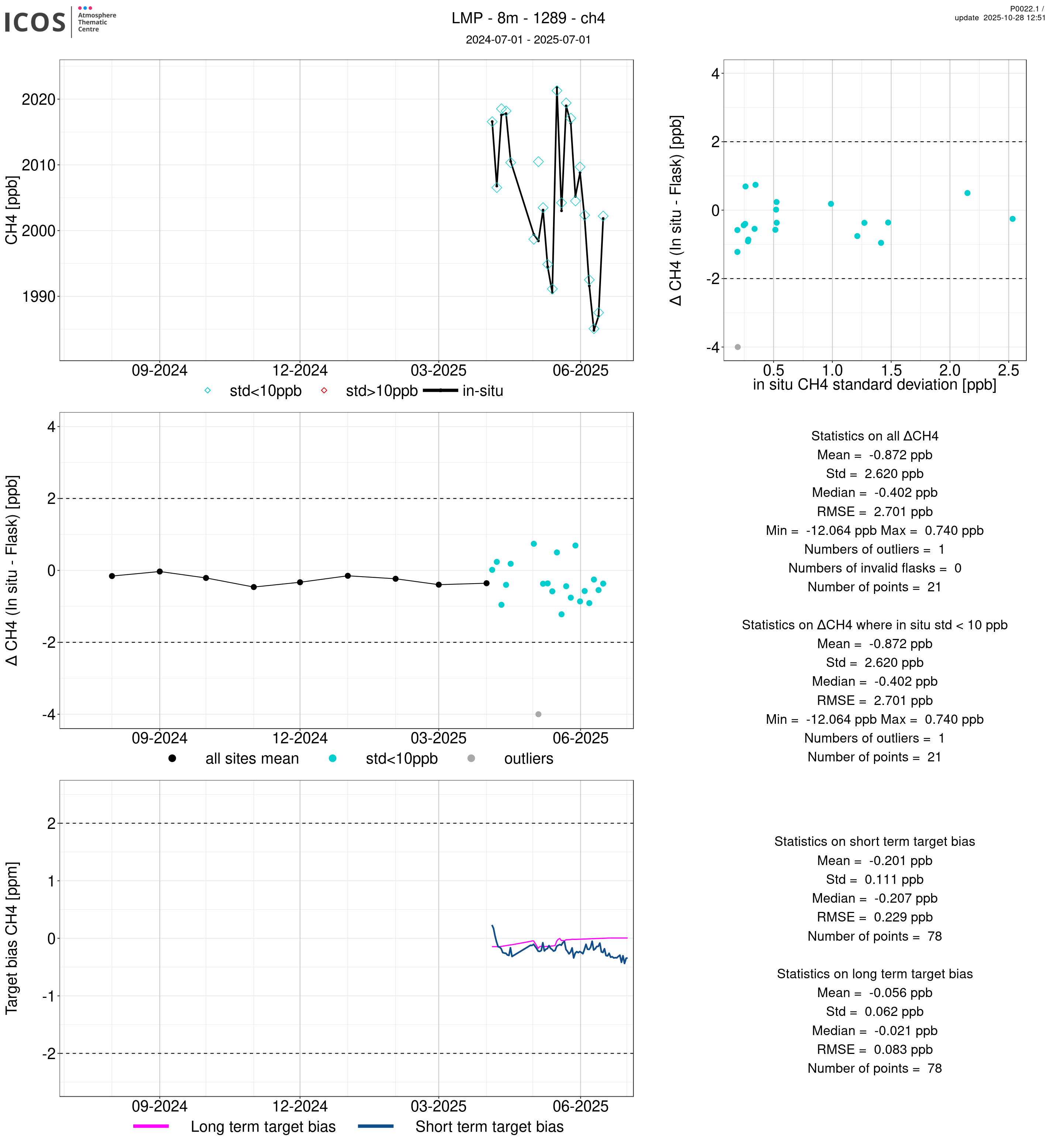 P0022.1 product shows the ambient air -flask difference over one year. For the given site and instrument/CTS, the upper left box plot displays the timeseries of air and flask species ; the middle left box shows the air-flask difference over time while the lower left box plot shows the LT and ST bias. The upper right box plot shows the air- flask difference versus the air standard deviation. Colors show the standard deviation categories. Grey points indicates data that are outside the y-axis.