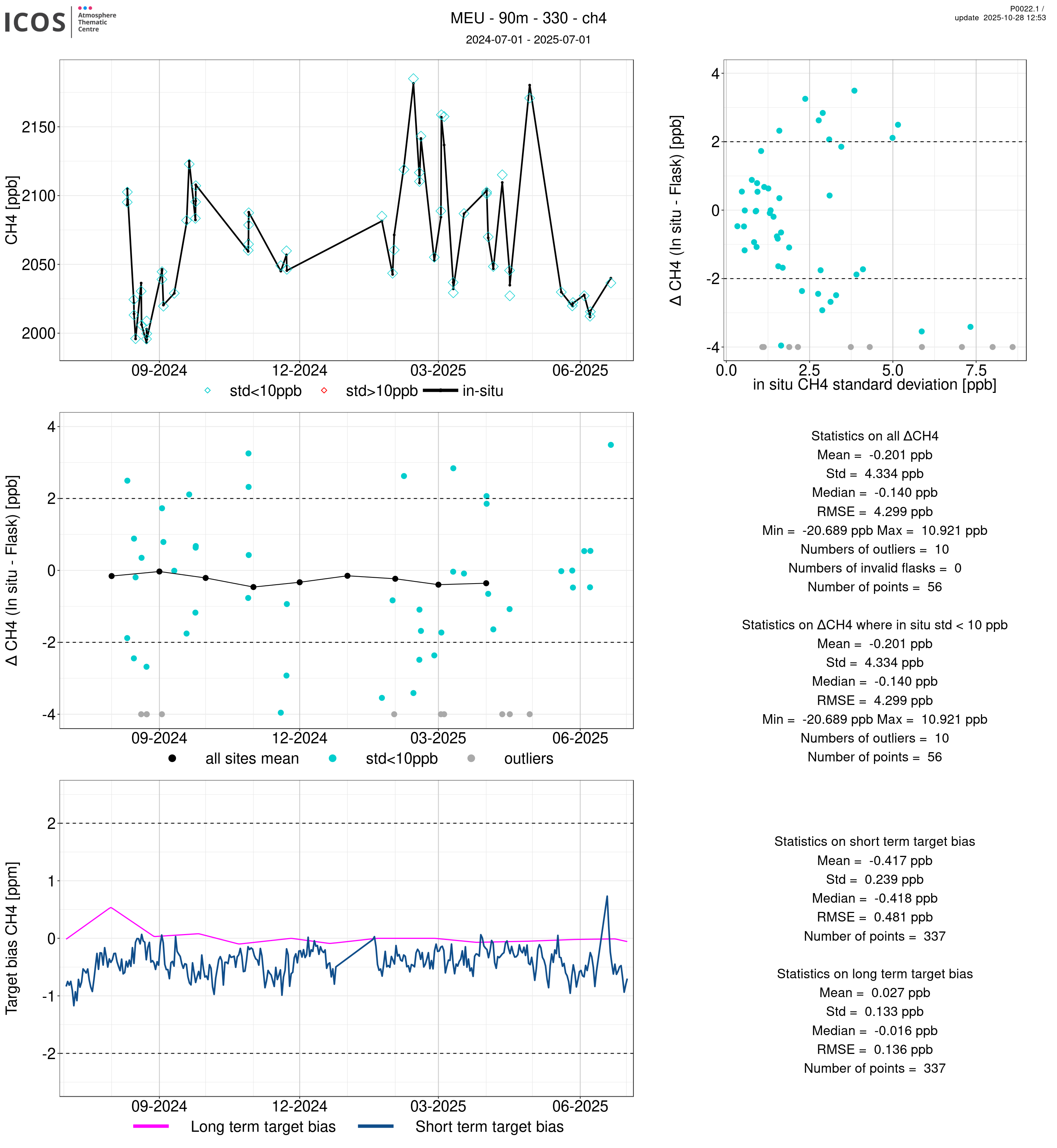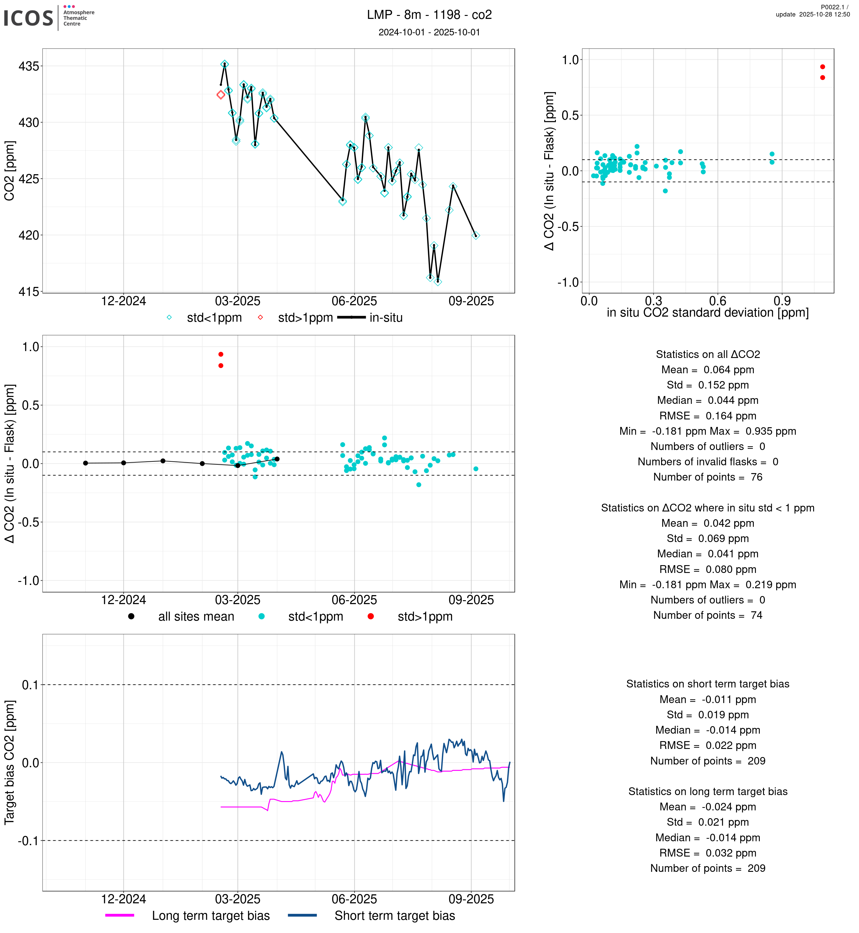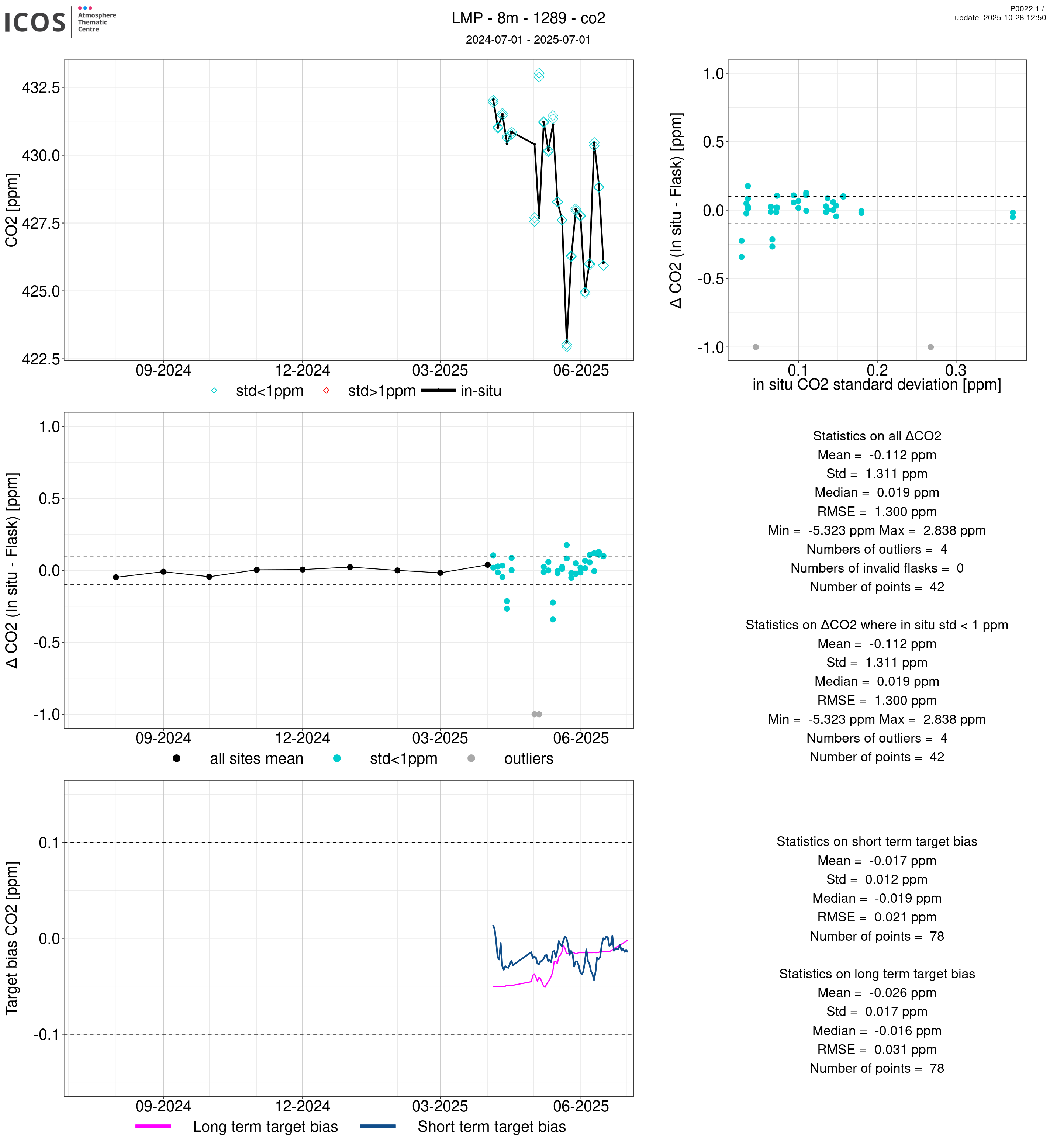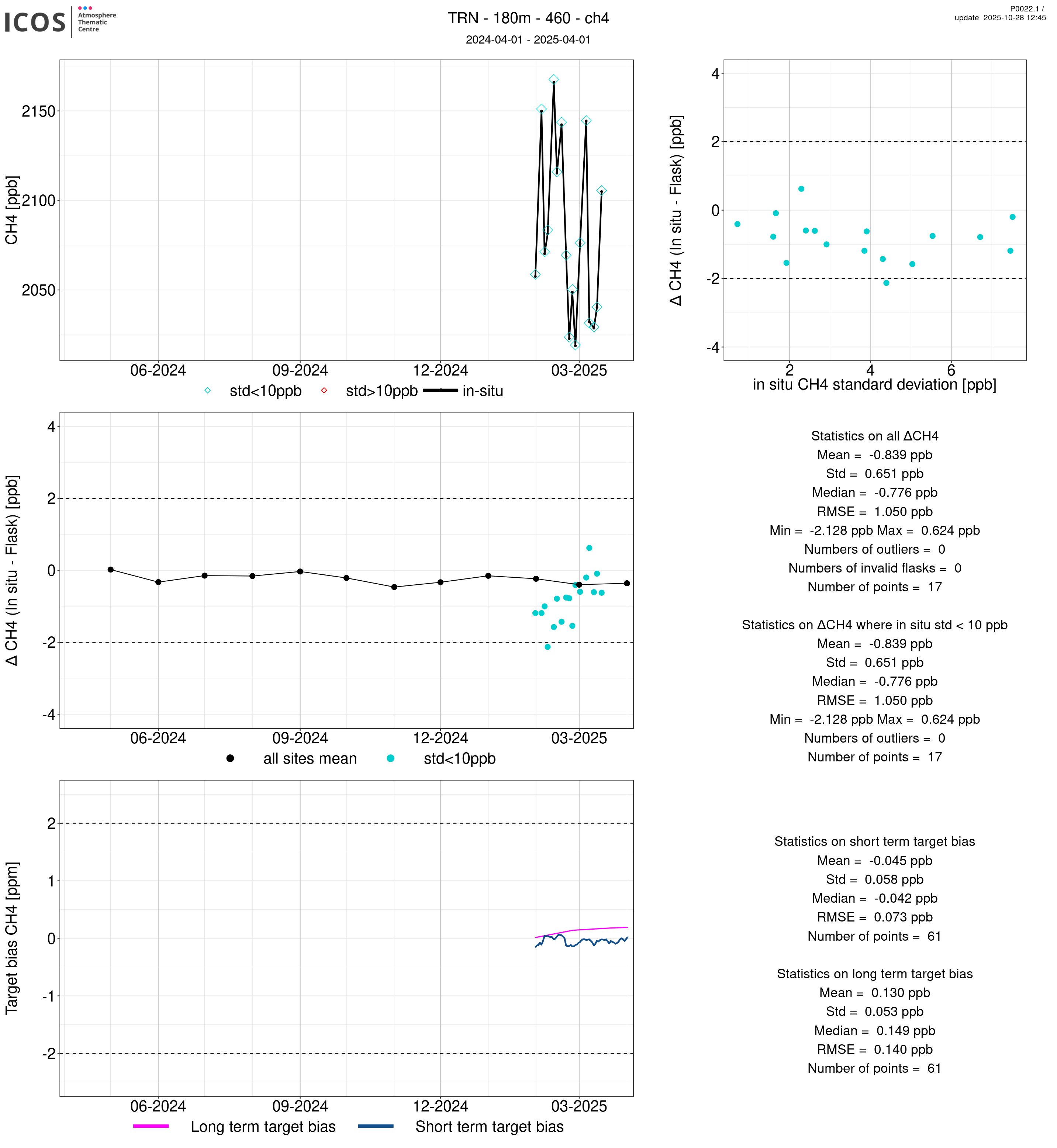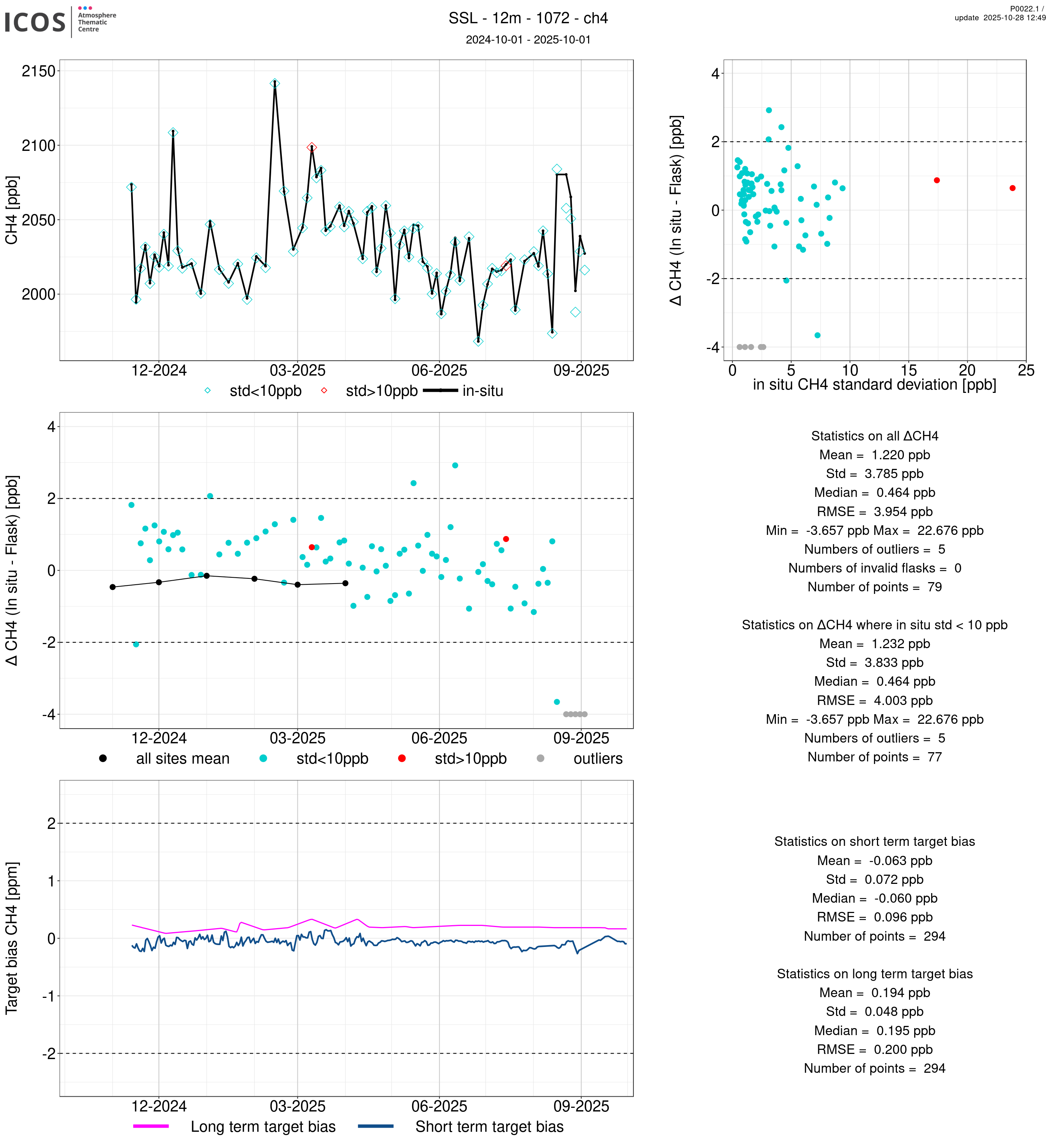 P0022.1 product shows the ambient air -flask difference over one year. For the given site and instrument/CTS, the upper left box plot displays the timeseries of air and flask species ; the middle left box shows the air-flask difference over time while the lower left box plot shows the LT and ST bias. The upper right box plot shows the air- flask difference versus the air standard deviation. Colors show the standard deviation categories. Grey points indicates data that are outside the y-axis.
