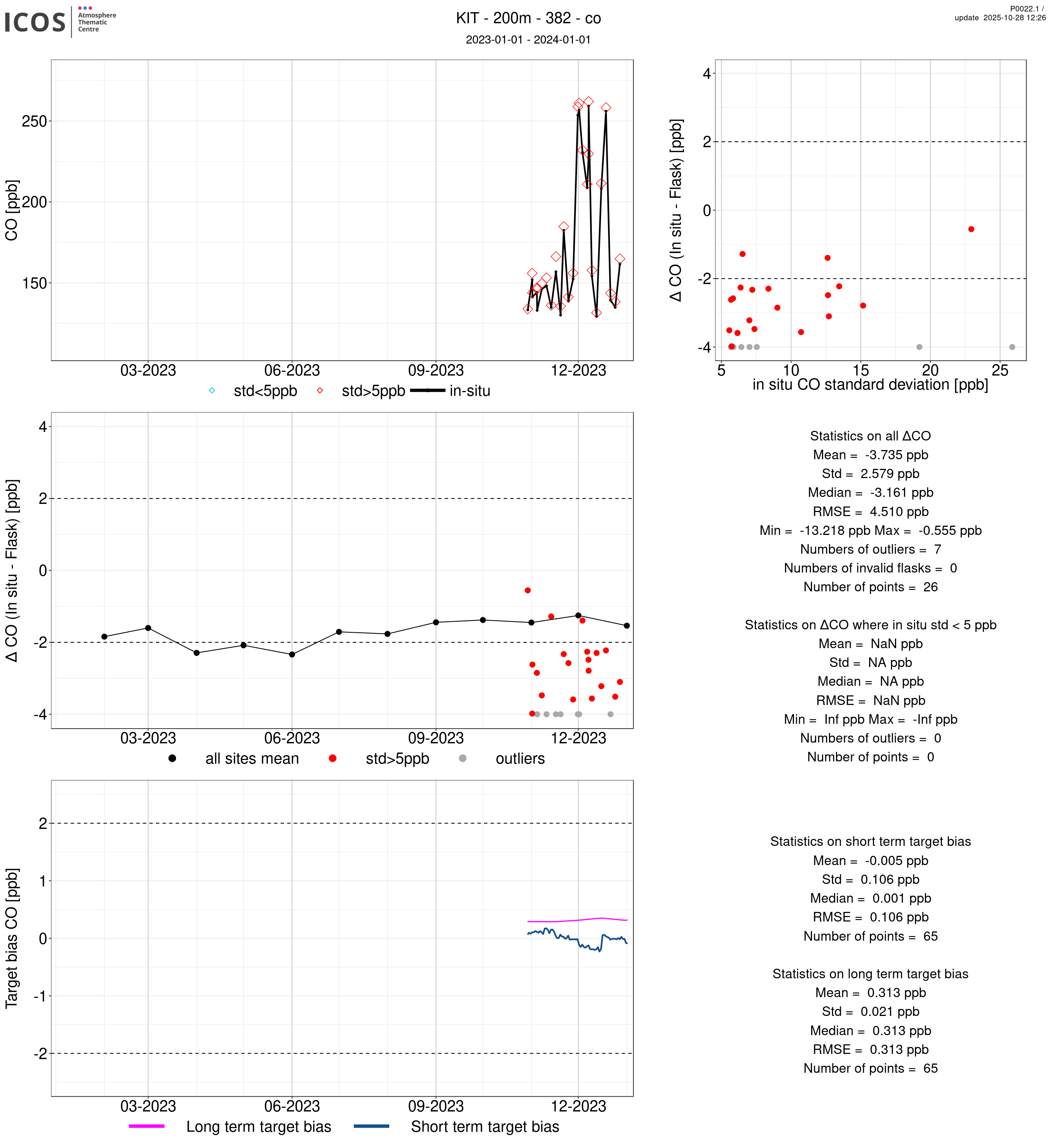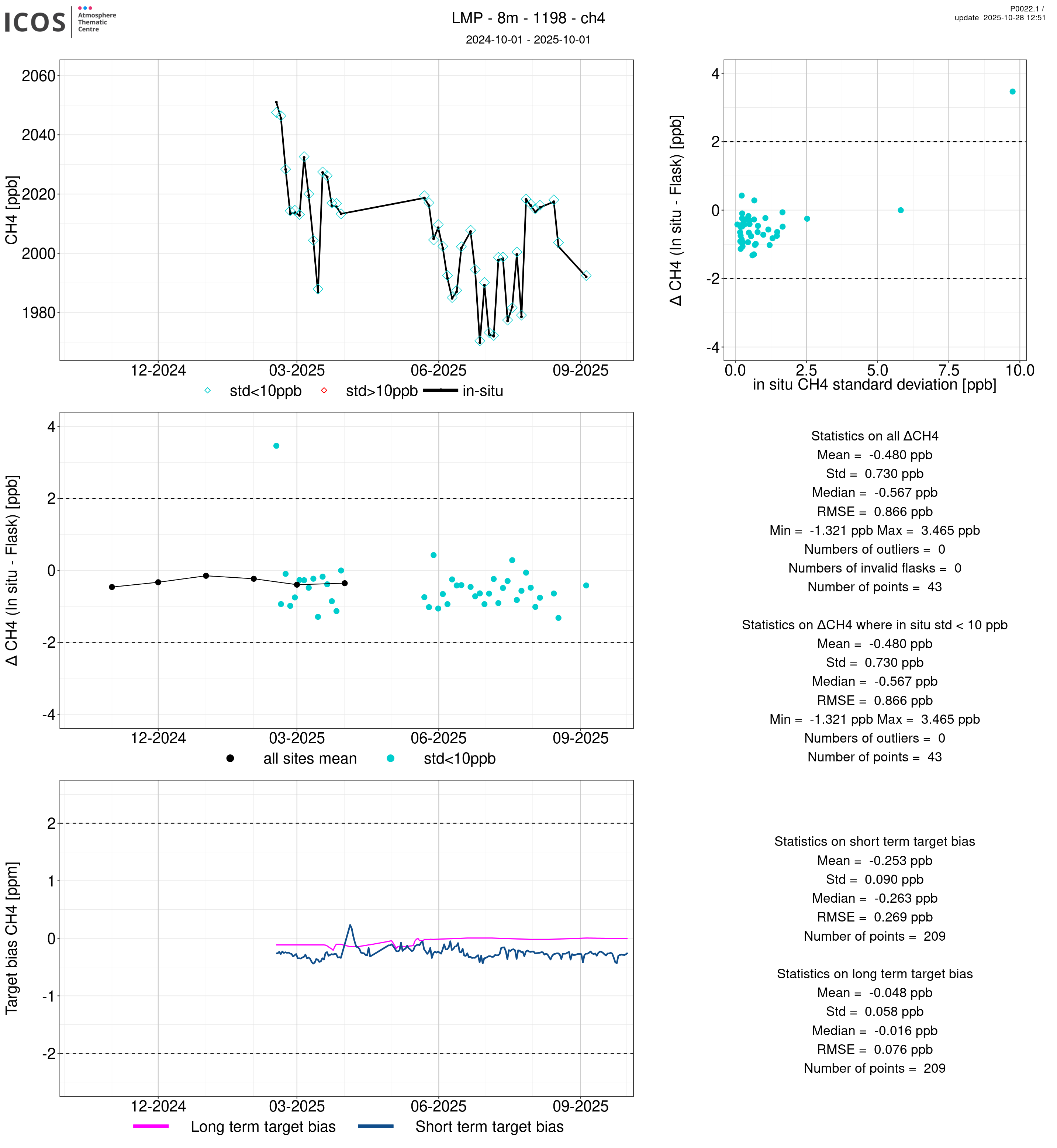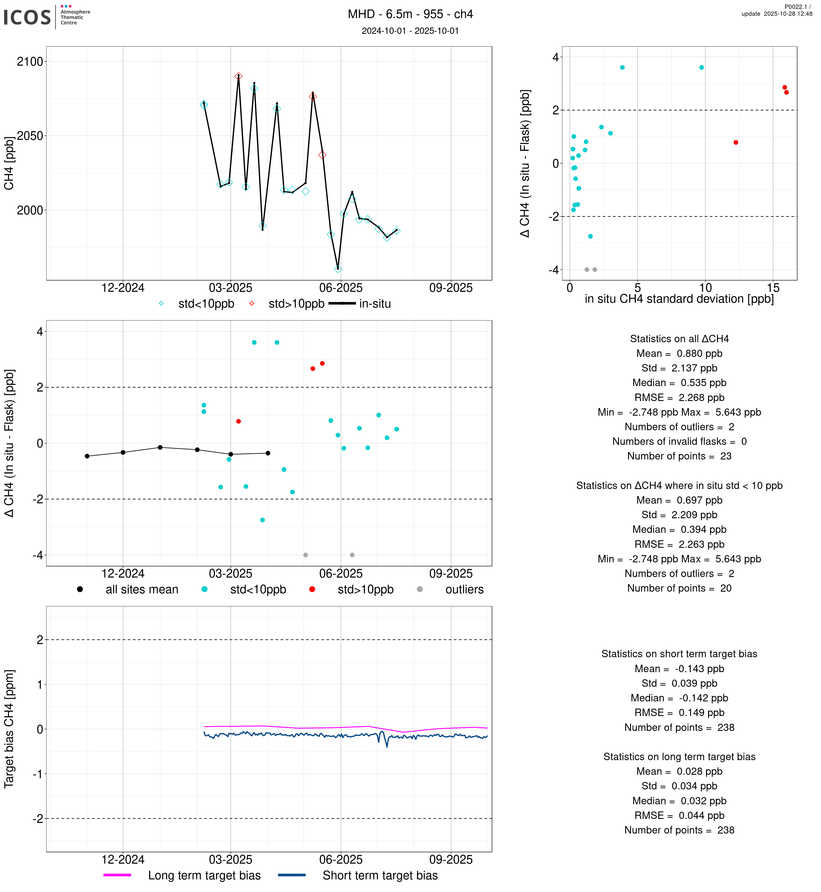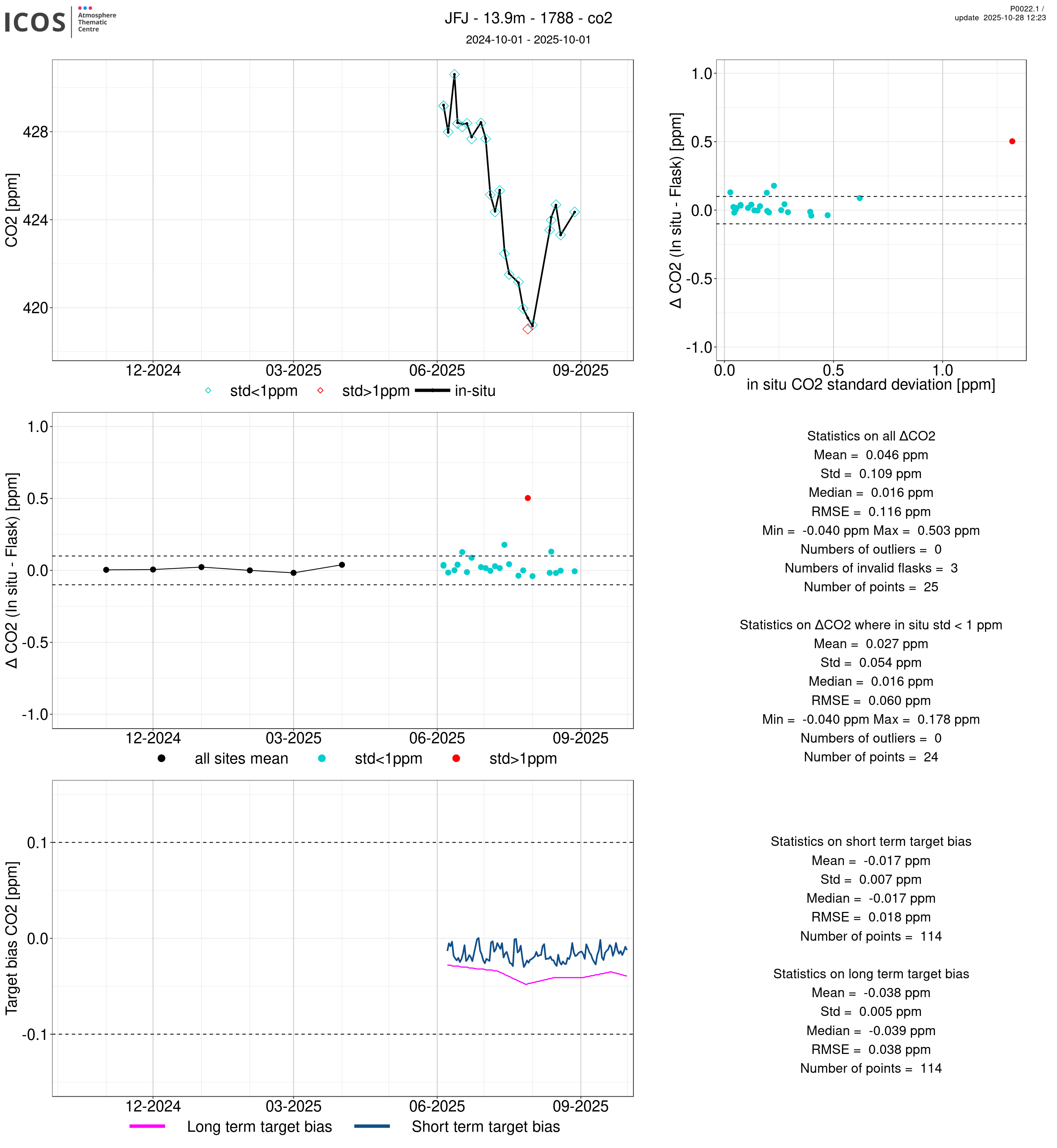 P0022.1 product shows the ambient air -flask difference over one year. For the given site and instrument/CTS, the upper left box plot displays the timeseries of air and flask species ; the middle left box shows the air-flask difference over time while the lower left box plot shows the LT and ST bias. The upper right box plot shows the air- flask difference versus the air standard deviation. Colors show the standard deviation categories. Grey points indicates data that are outside the y-axis.