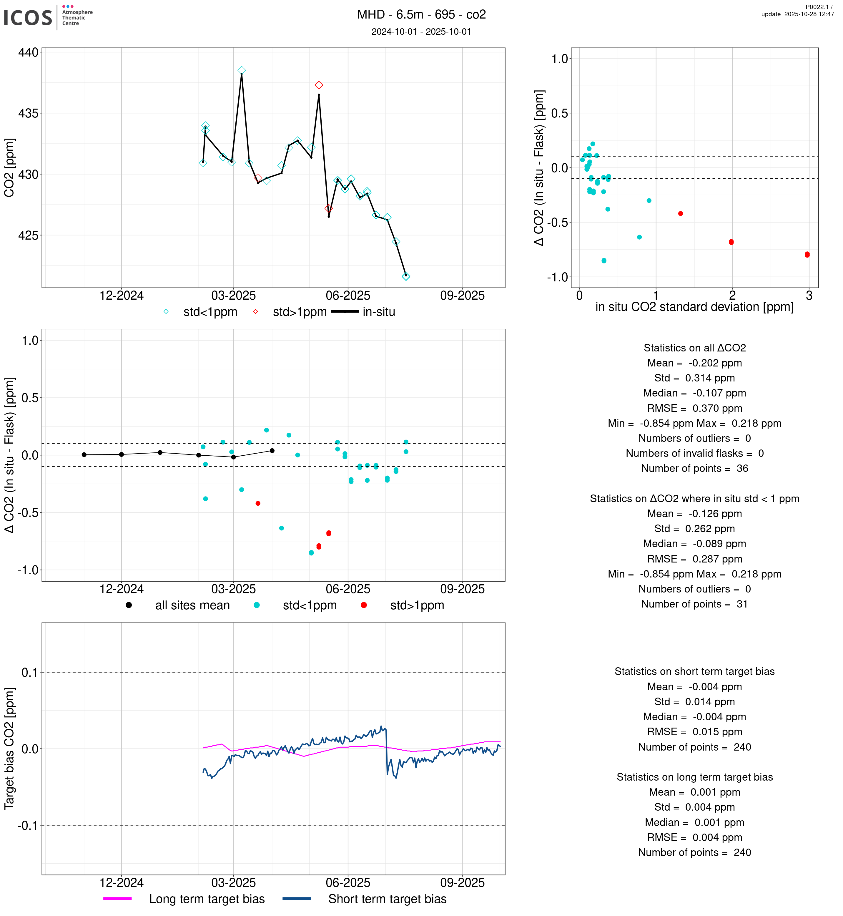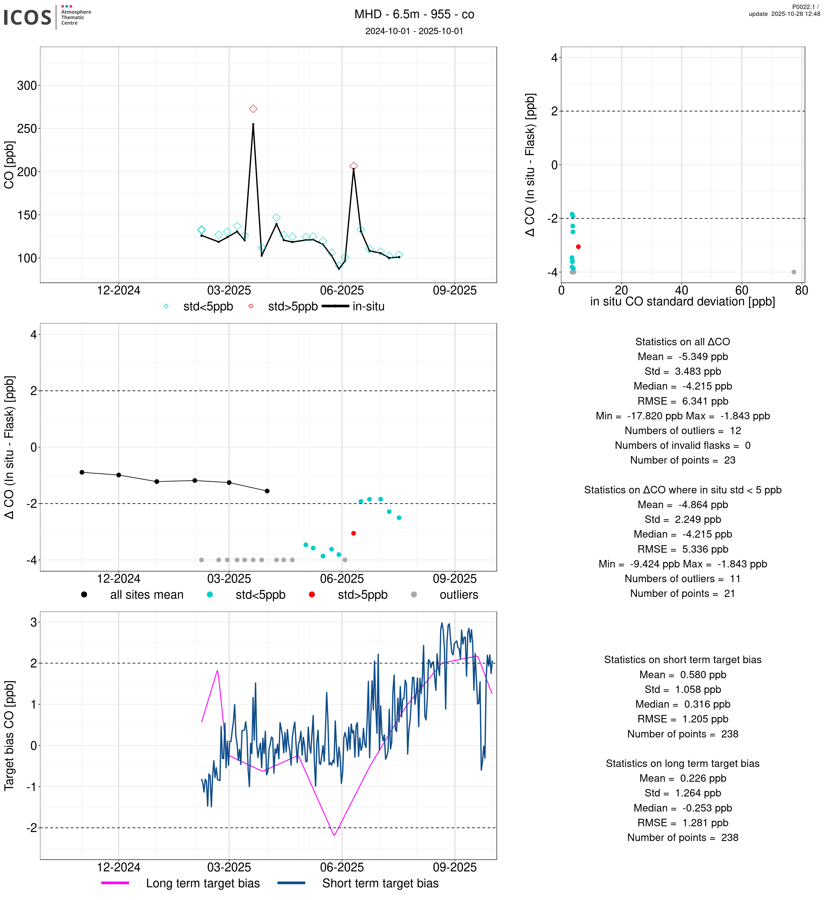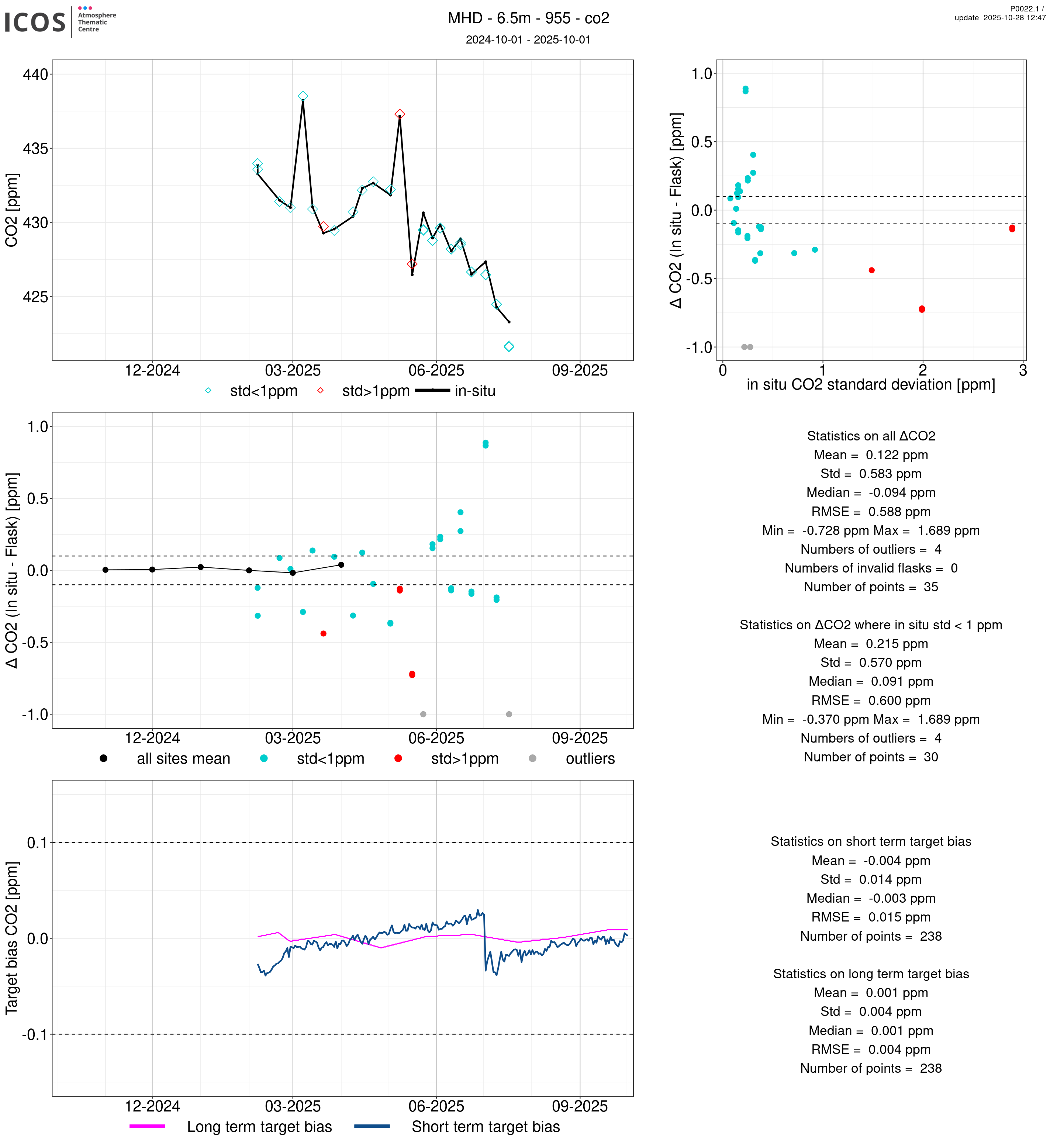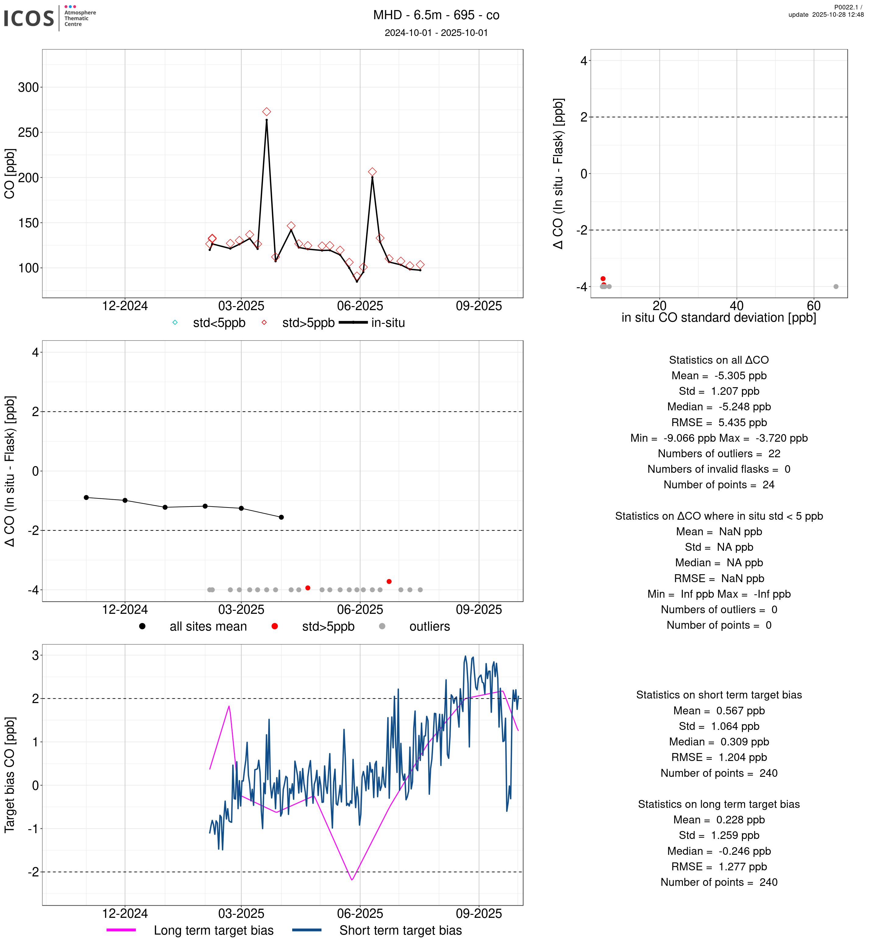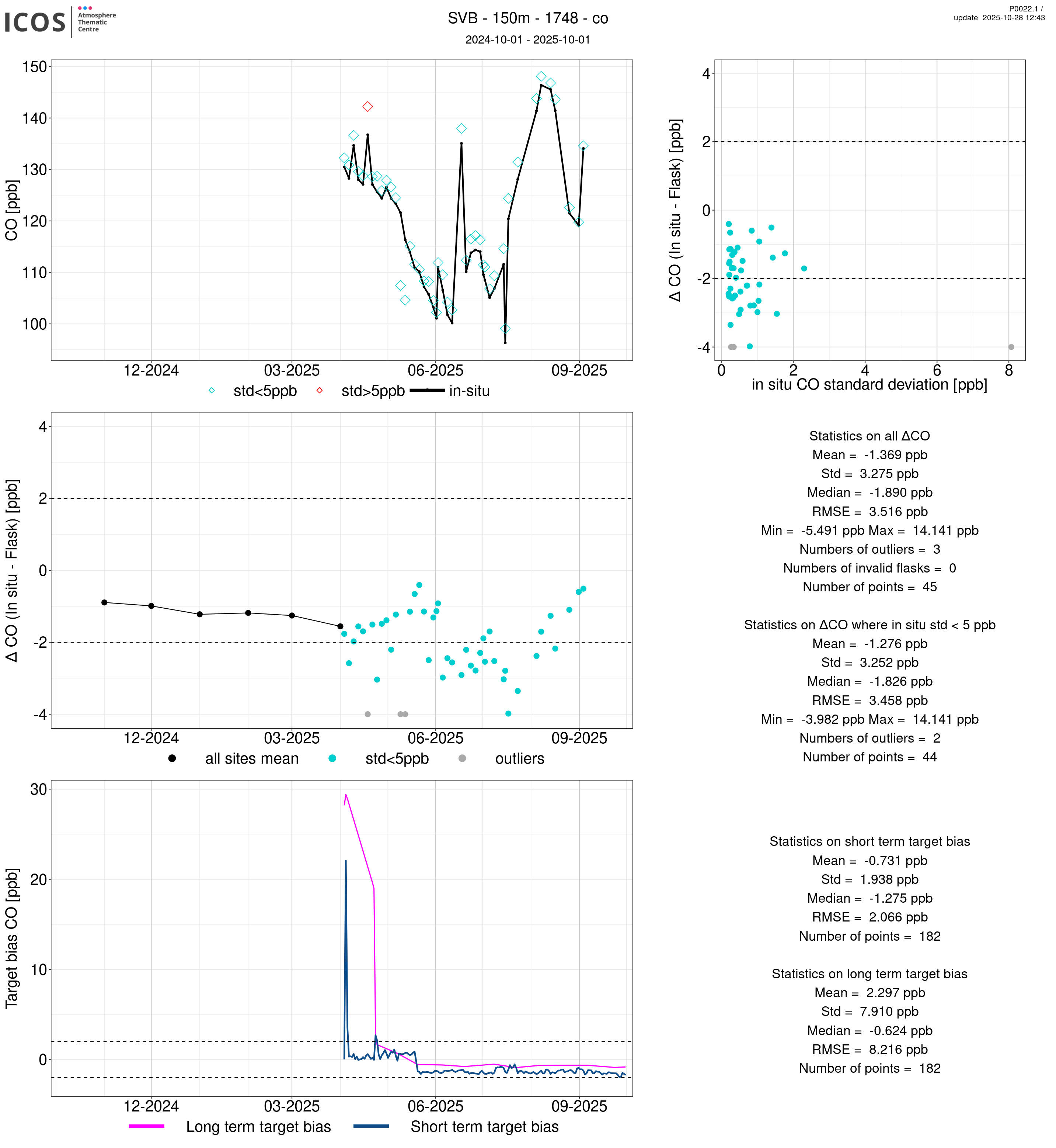 P0022.1 product shows the ambient air -flask difference over one year. For the given site and instrument/CTS, the upper left box plot displays the timeseries of air and flask species ; the middle left box shows the air-flask difference over time while the lower left box plot shows the LT and ST bias. The upper right box plot shows the air- flask difference versus the air standard deviation. Colors show the standard deviation categories. Grey points indicates data that are outside the y-axis.