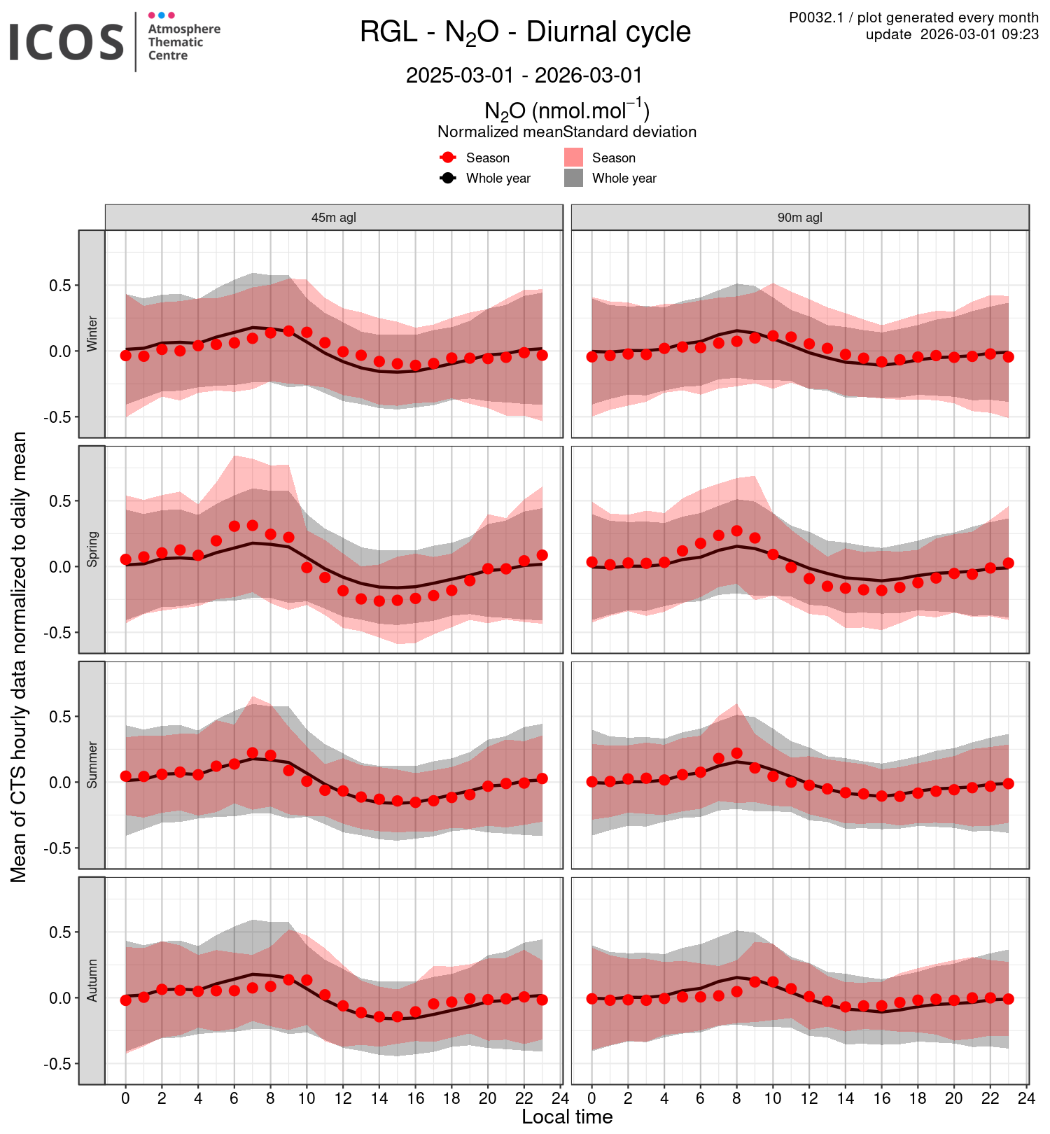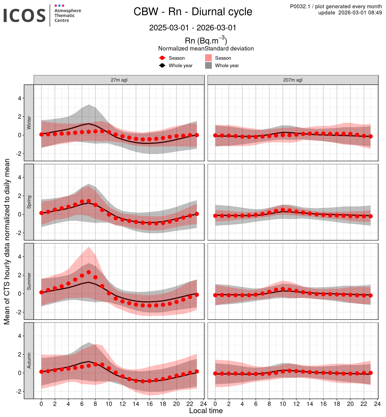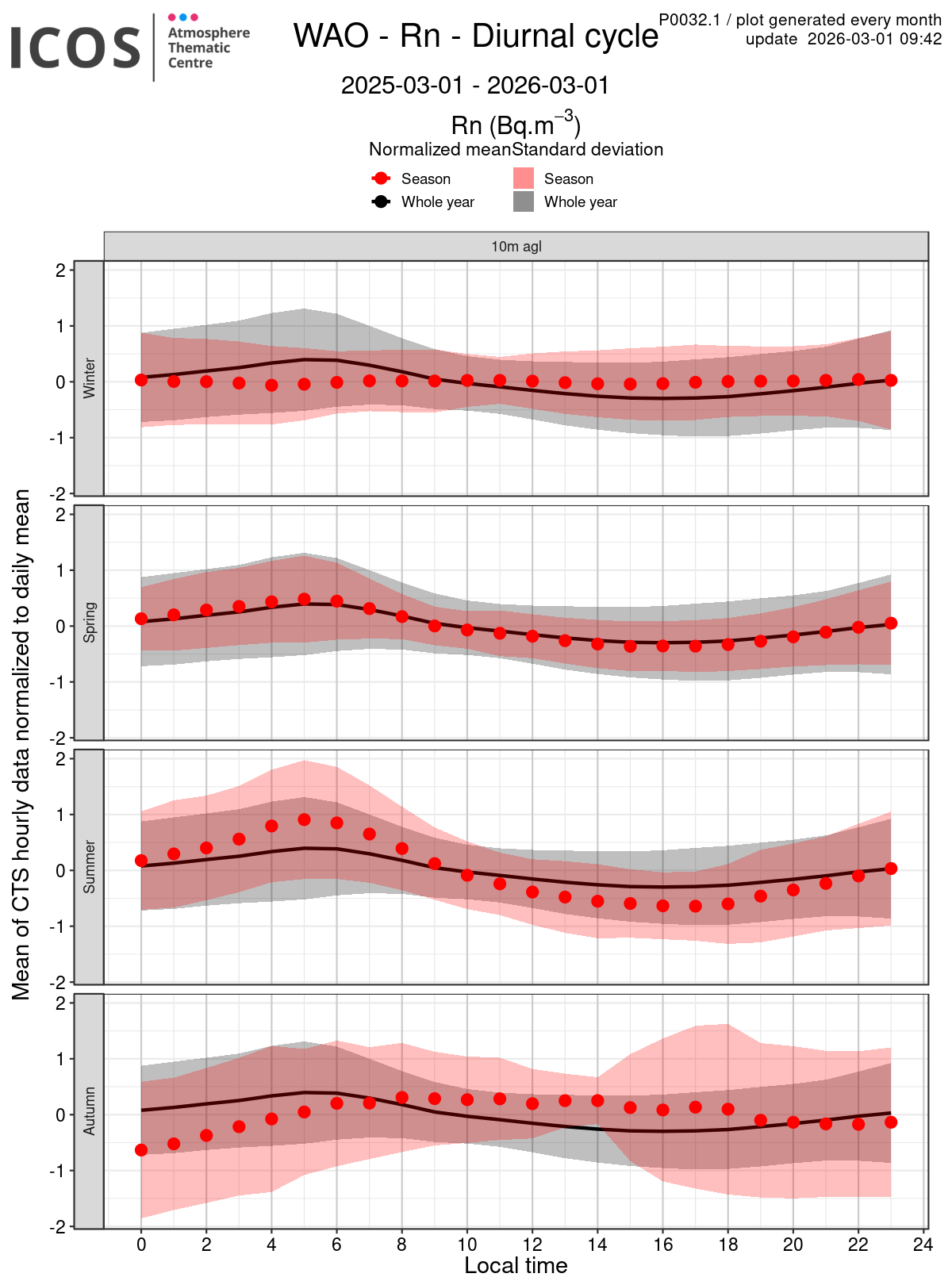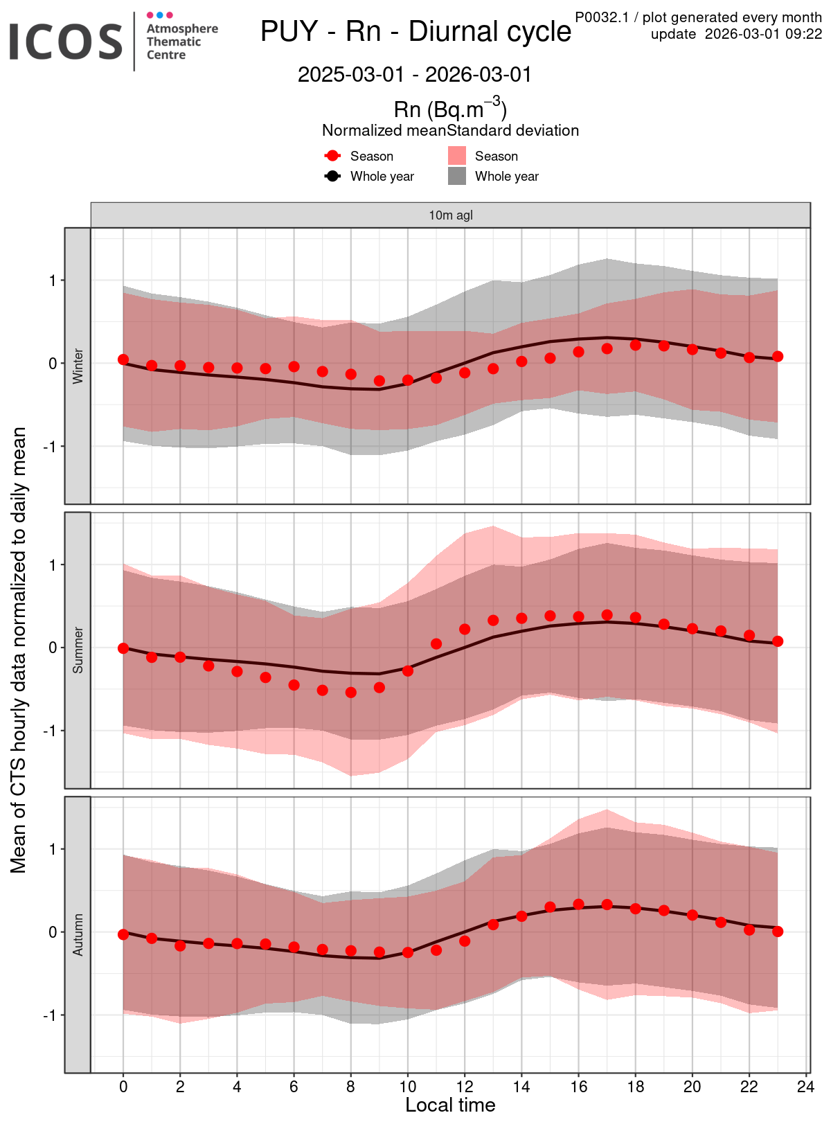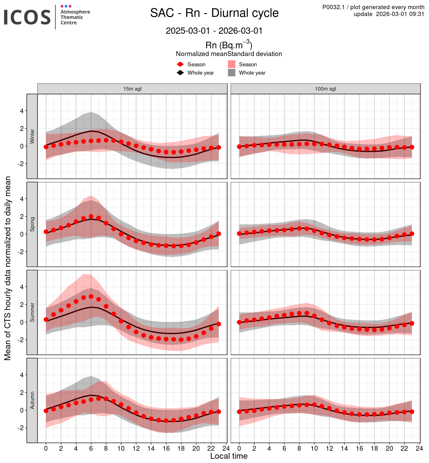 - Red points/surface: each point shows the mean of all measures sampled at the given local hour for the sampling height given by the column's header and for the season given by the line's header ; the surface shows the standard deviation of all daily values around this mean.