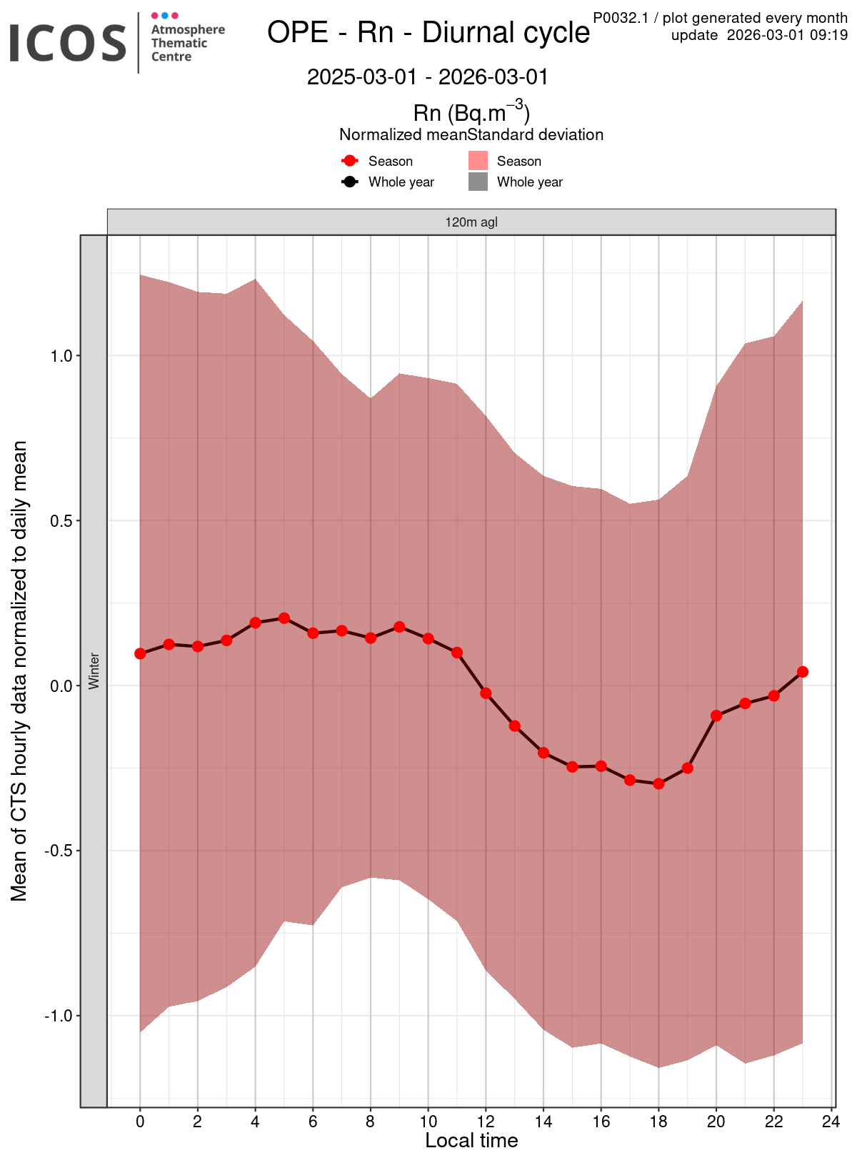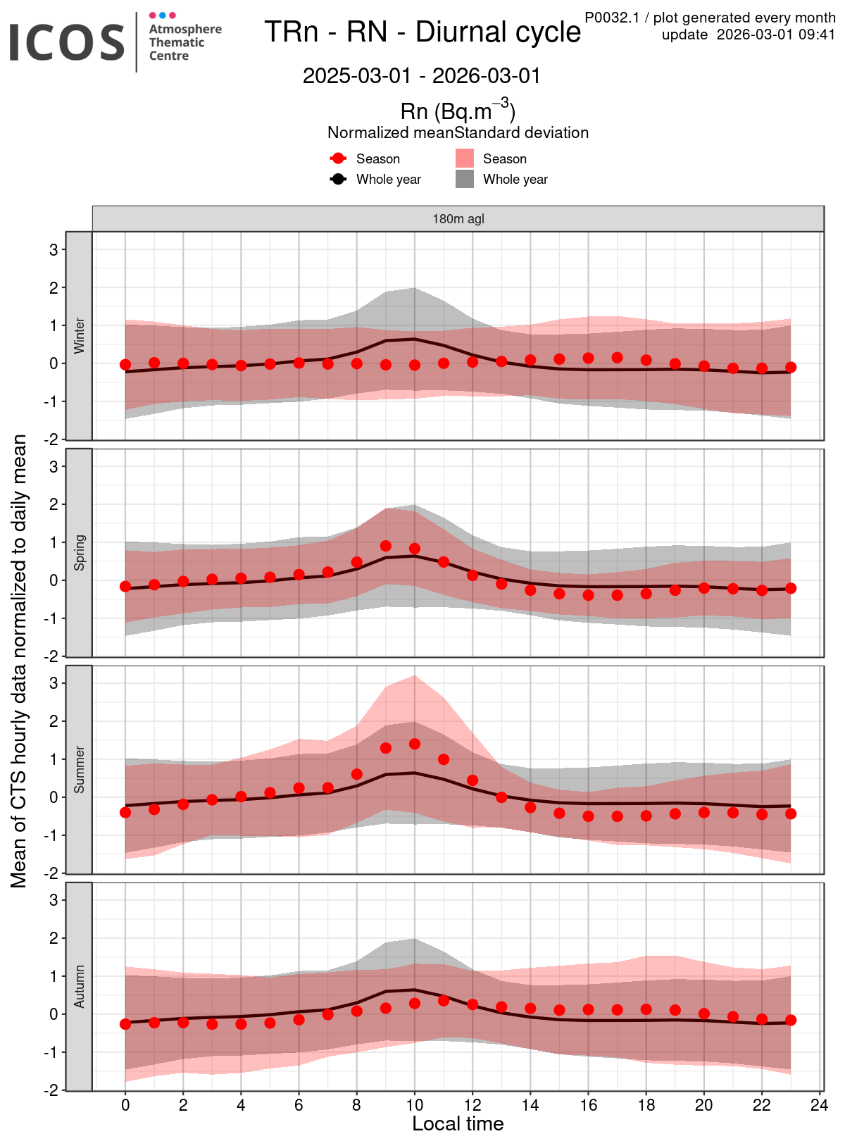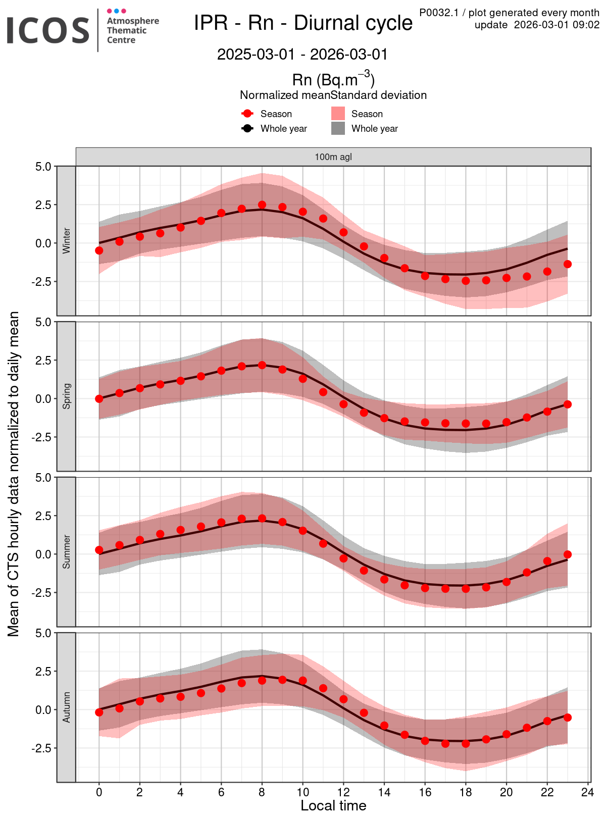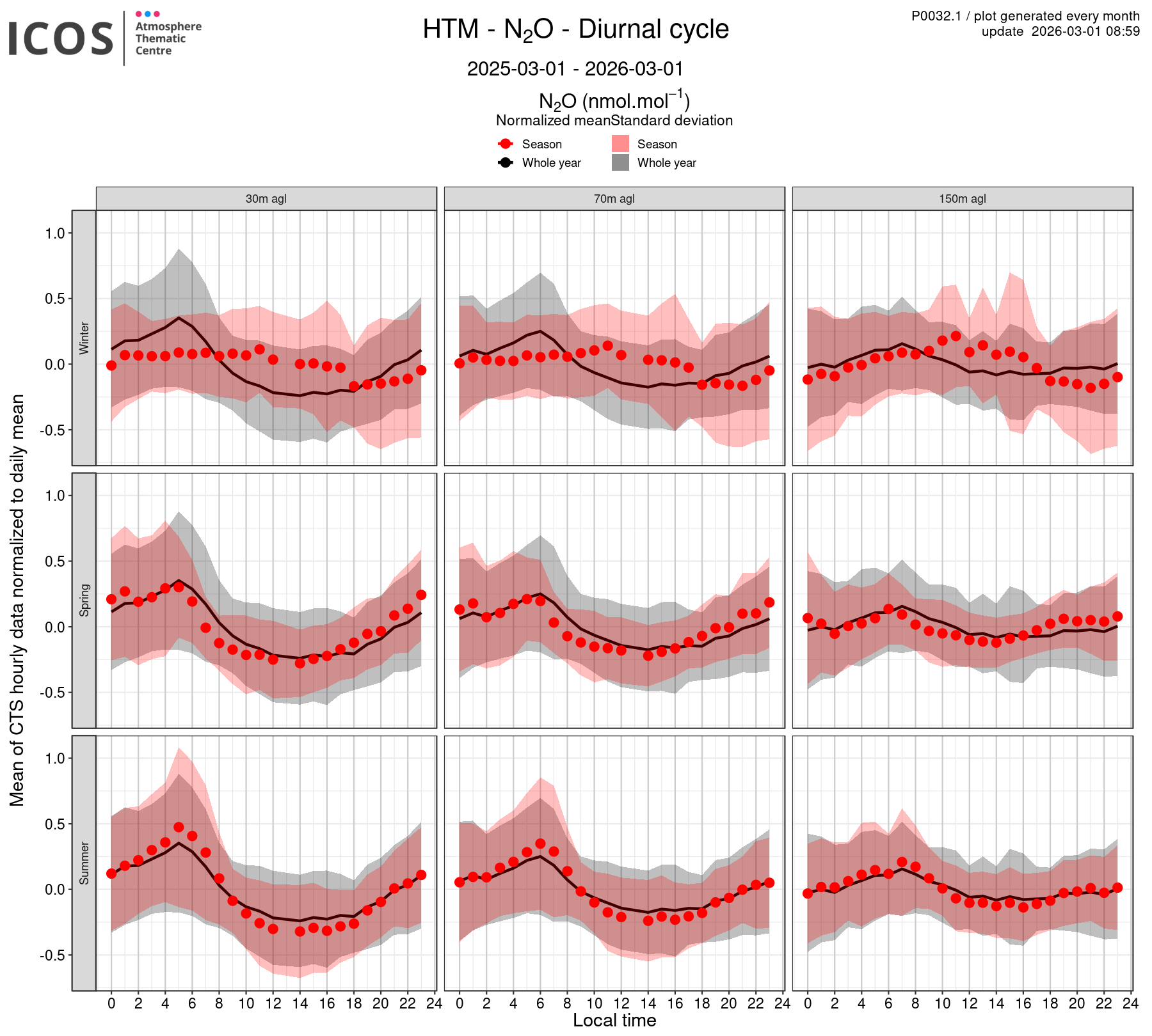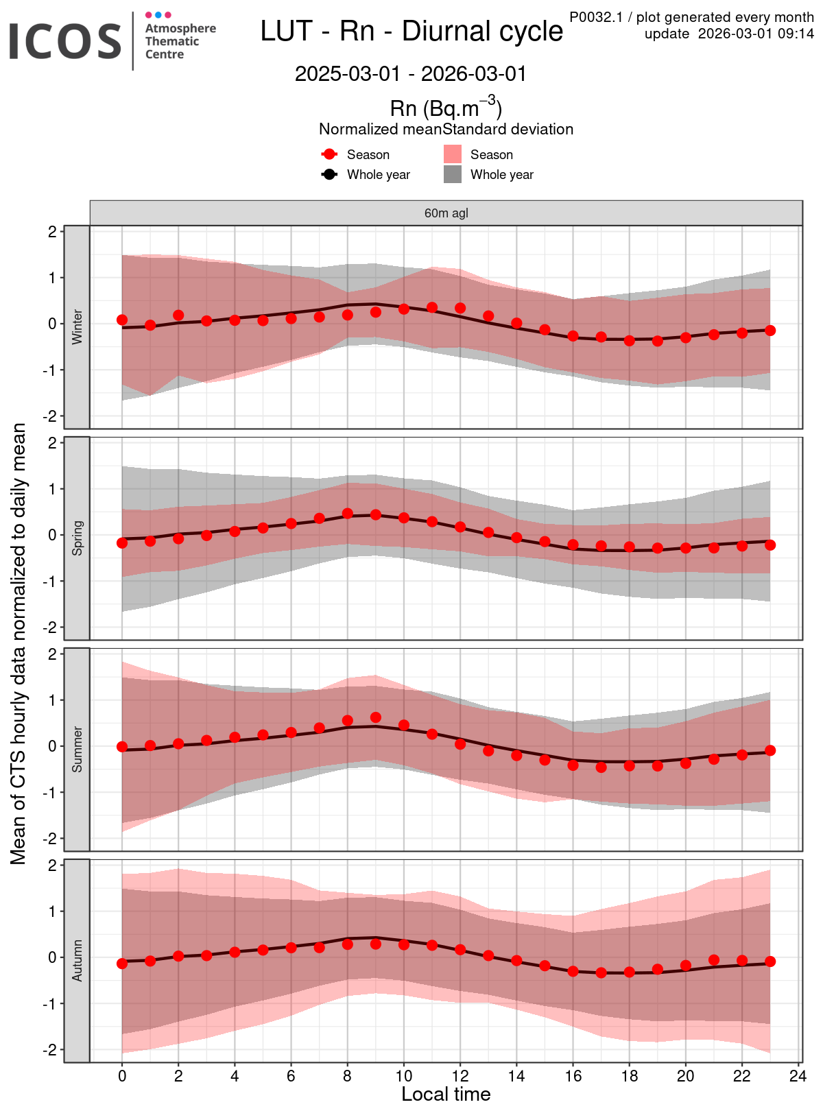 - Red points/surface: each point shows the mean of all measures sampled at the given local hour for the sampling height given by the column's header and for the season given by the line's header ; the surface shows the standard deviation of all daily values around this mean.