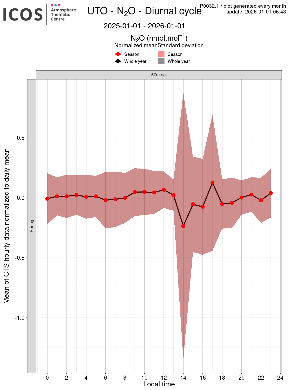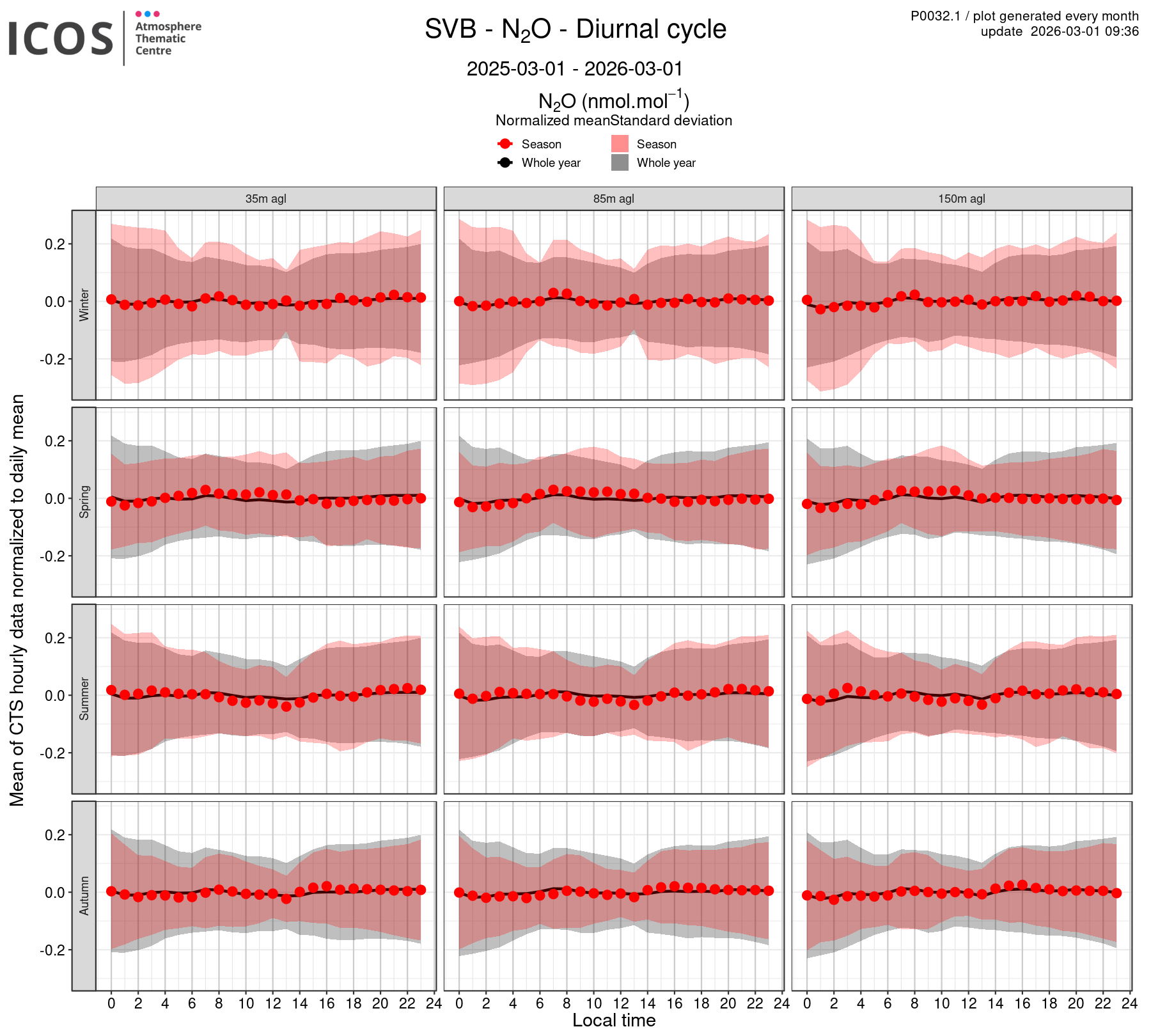 P0032.1 product shows the diurnal cycle, split by season, for each site/species. Each box plot displays, for the species named in plot's title, the diurnal cycle for the sampling height given by the column's header and for the season given by the line's header. The whole year diurnal cycle is also given (in black) to ease the comparison between seasons.