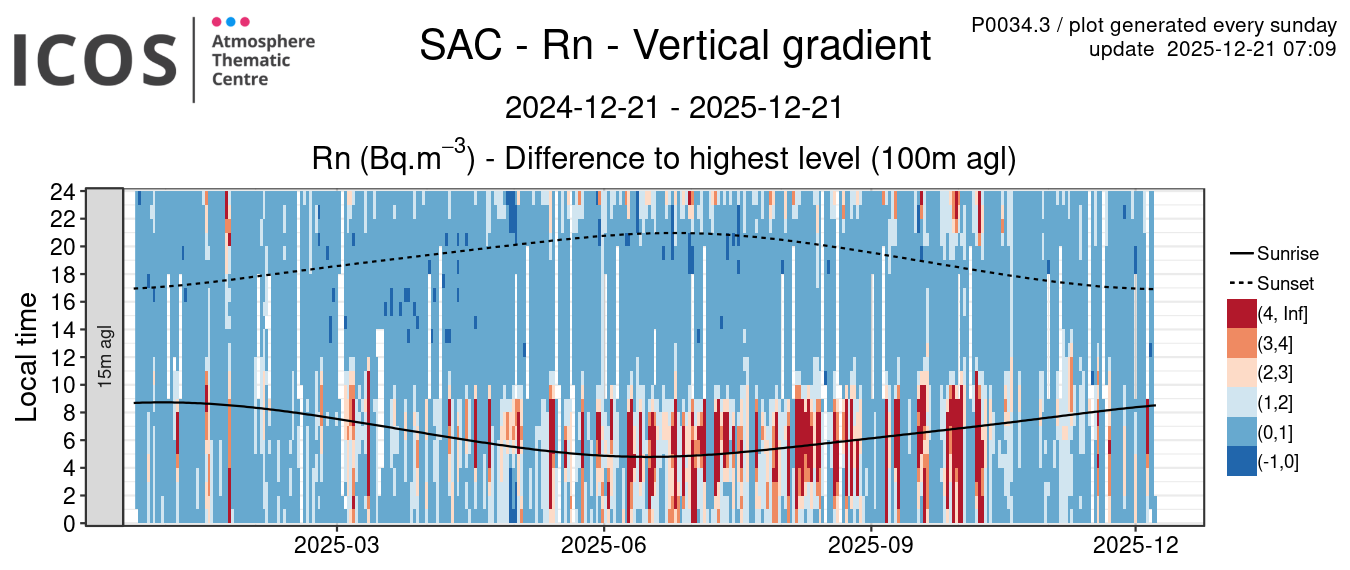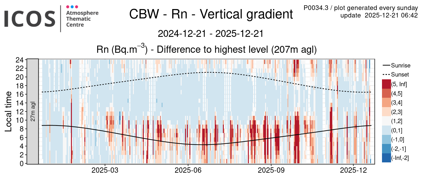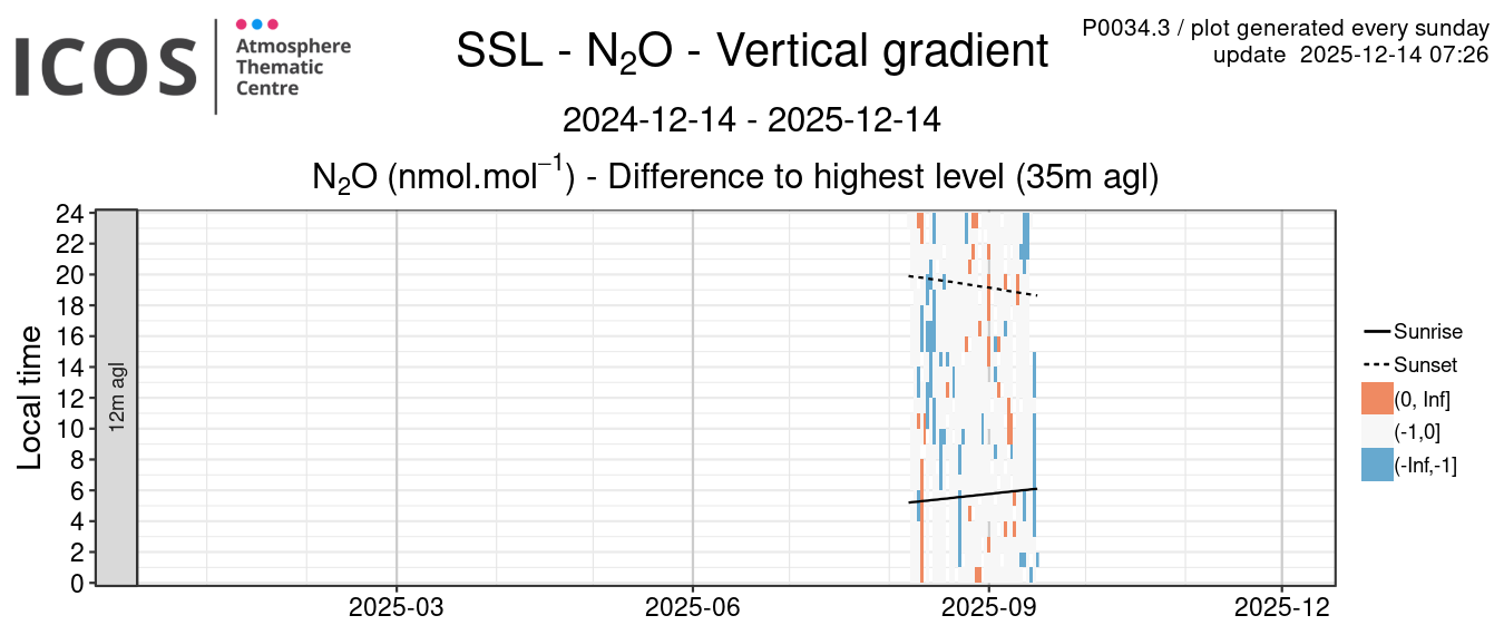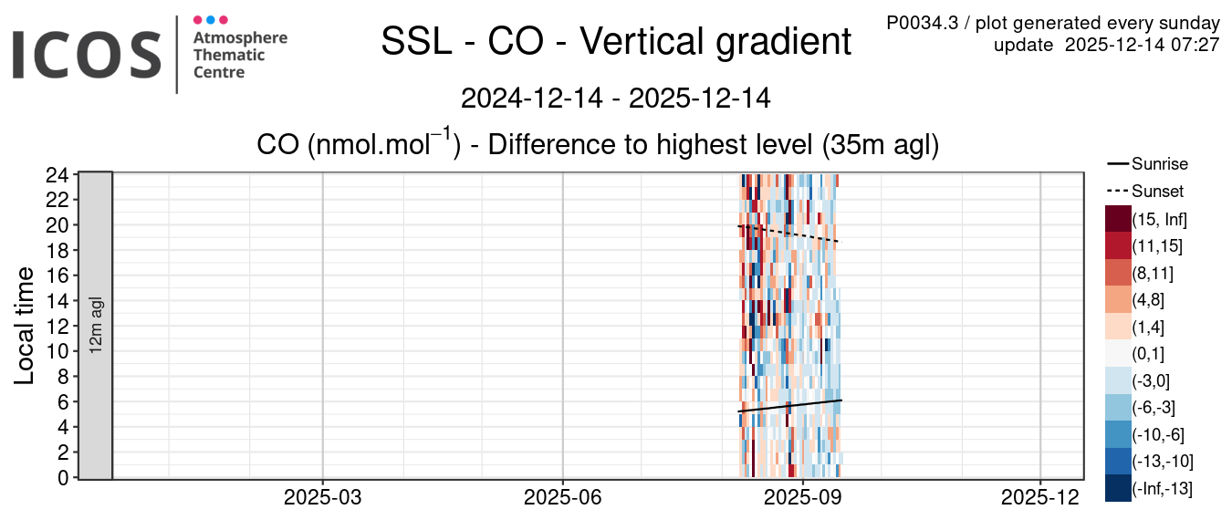 P0034.3 product shows the evolution of the molar fraction difference to highest level hour-by-hour, for each day of the year, for the given site/species. Each box plot displays the difference between the molar fraction of the air measured at the sampling height named in Y-axis title, and the molar fraction of the air measured at the site's maximum sampling height. The black (dotted) lines represents the time of the sunrise and sunset for each day.