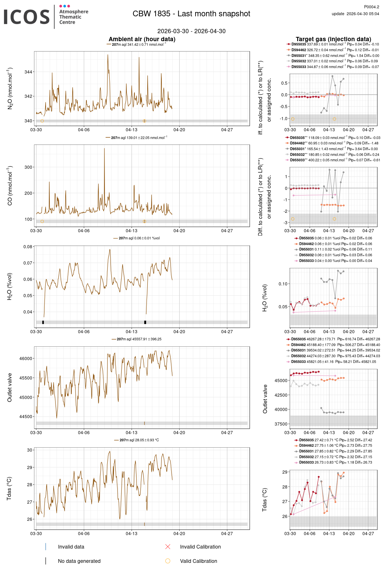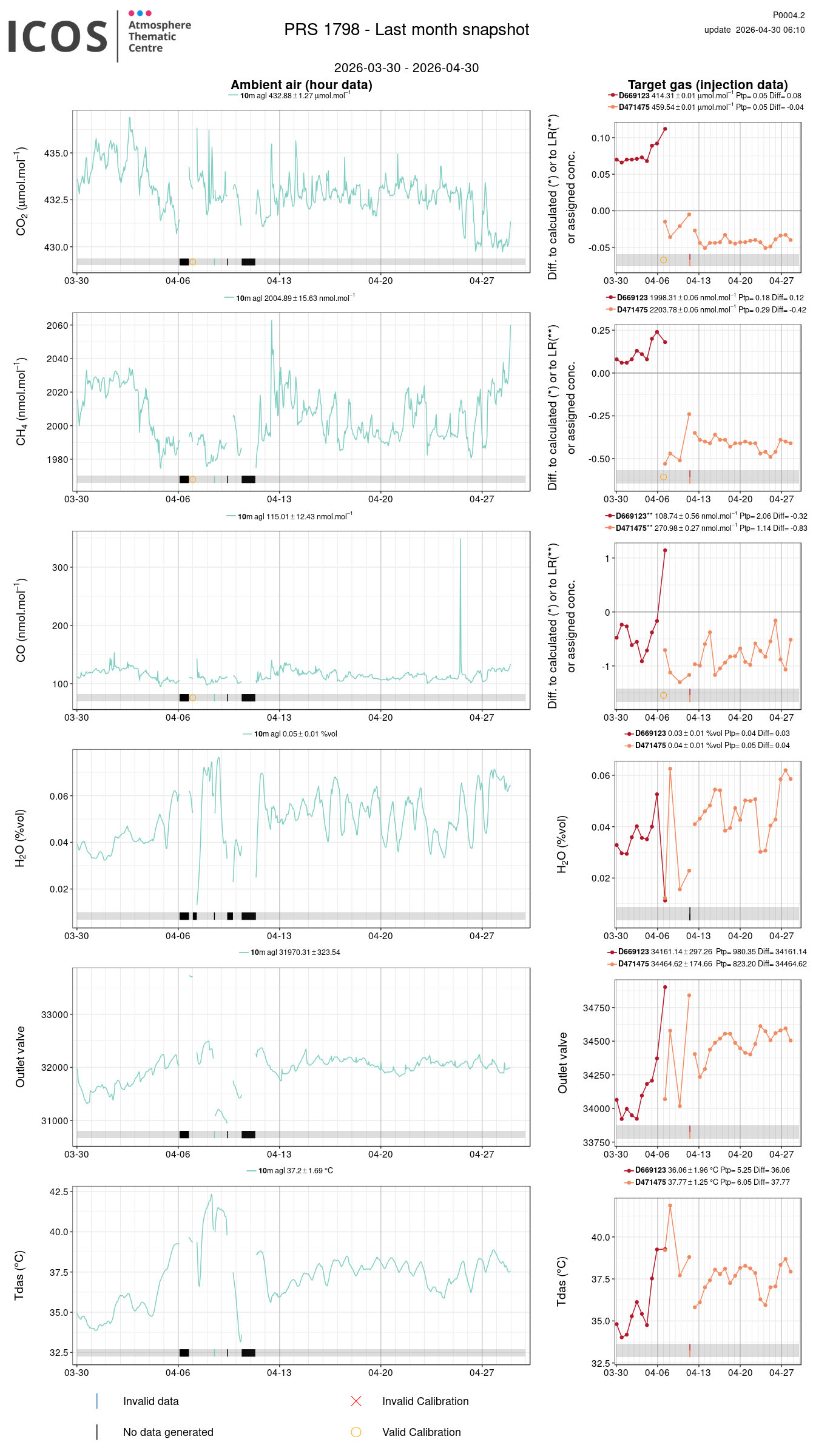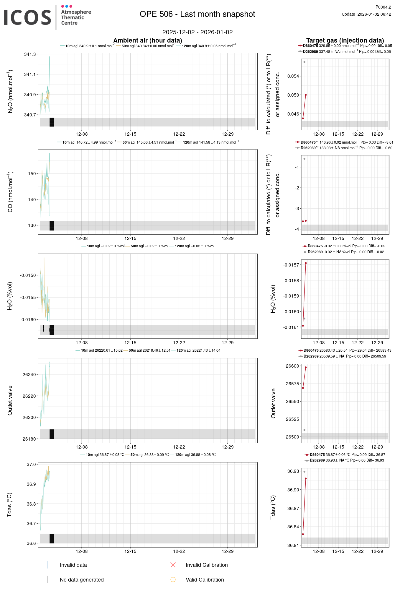 P0004.2 product shows the last month air timeseries. For the given site and instrument, each left box plot displays the timeseries of a air species while ambient air is measured ; and each right box plot displays the timeseries of a air species while a target air is measured. Colors on the left plots represents sampling heights, colors on the right plot represents target tanks.