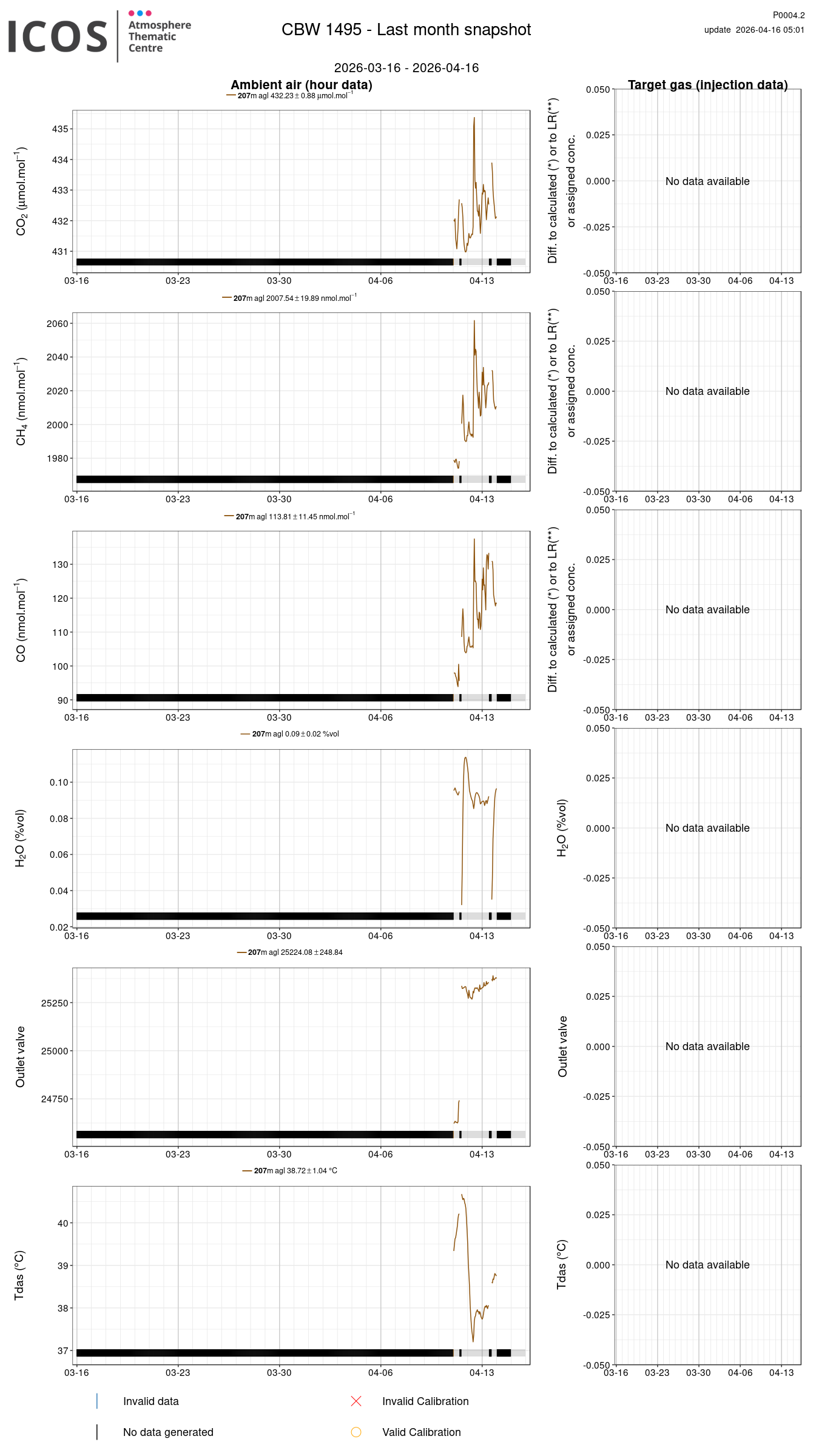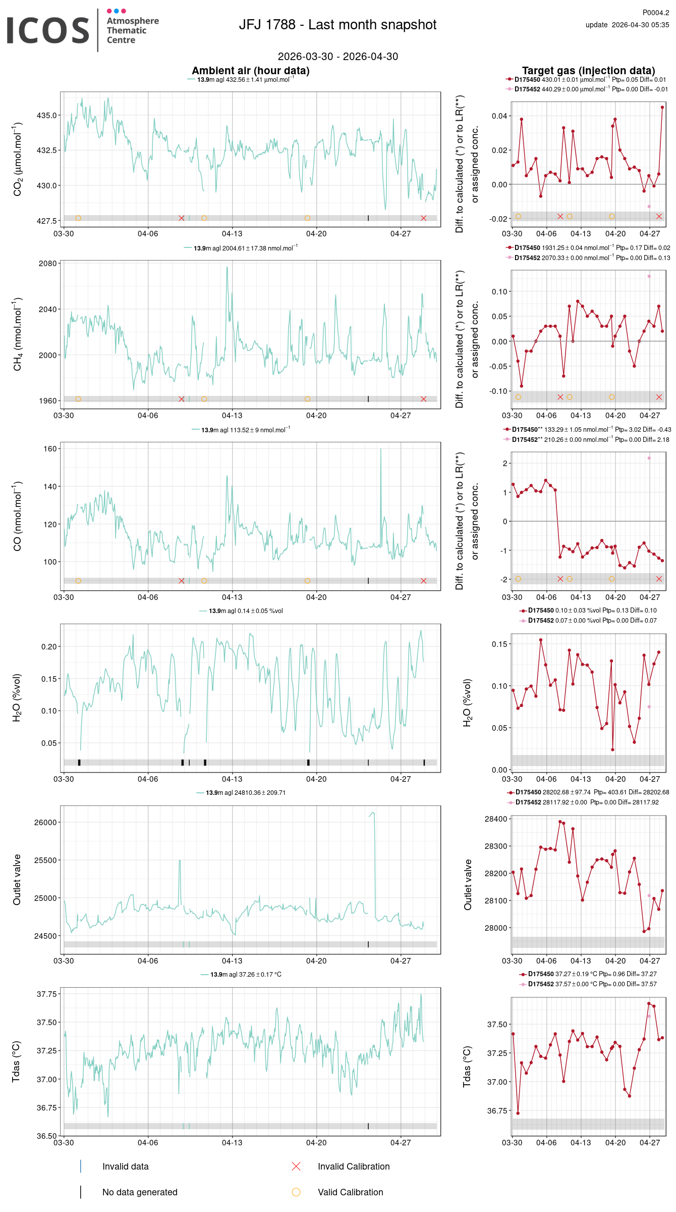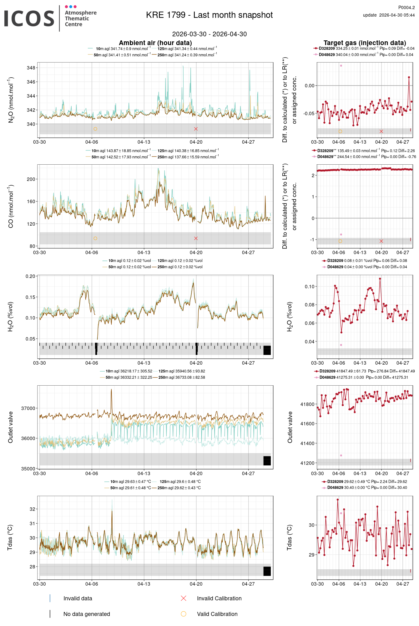 P0004.2 product shows the last month air timeseries. For the given site and instrument, each left box plot displays the timeseries of a air species while ambient air is measured ; and each right box plot displays the timeseries of a air species while a target air is measured. Colors on the left plots represents sampling heights, colors on the right plot represents target tanks.