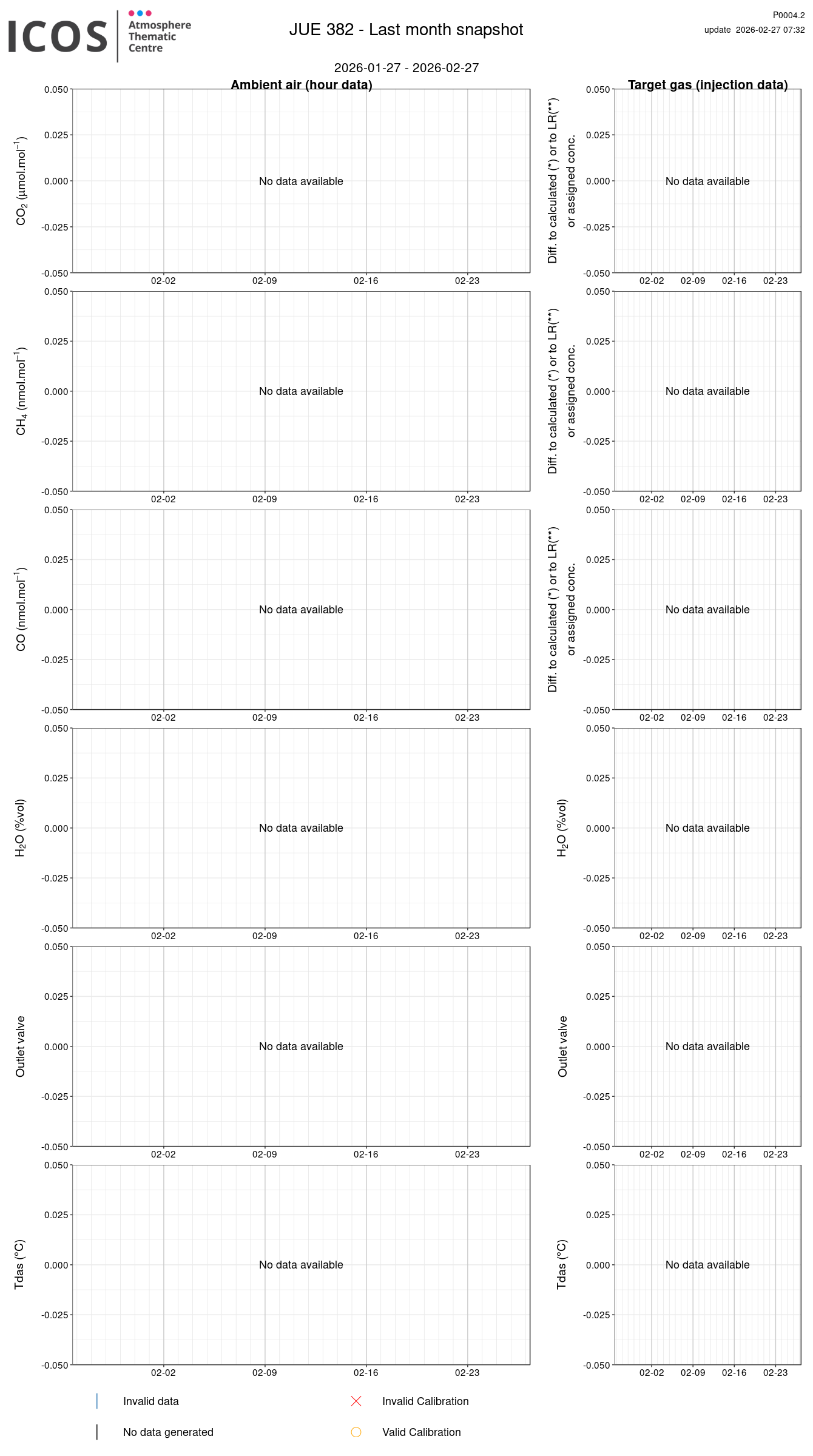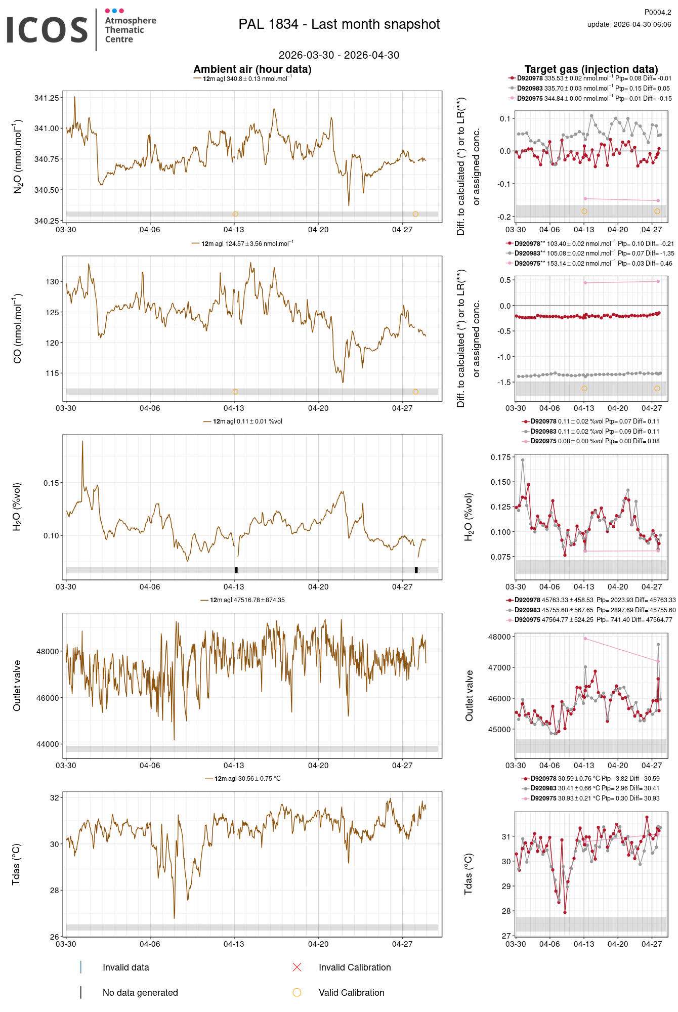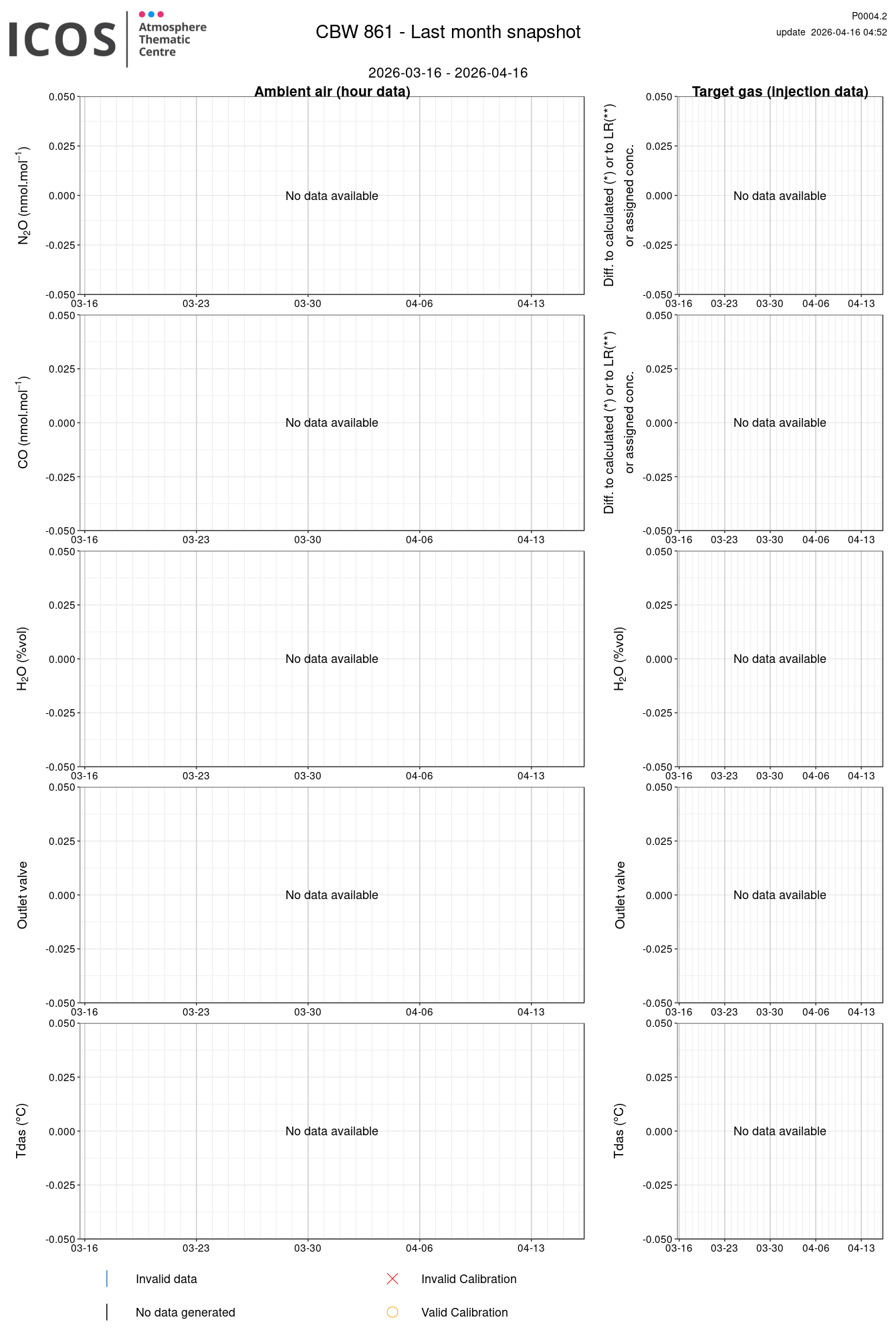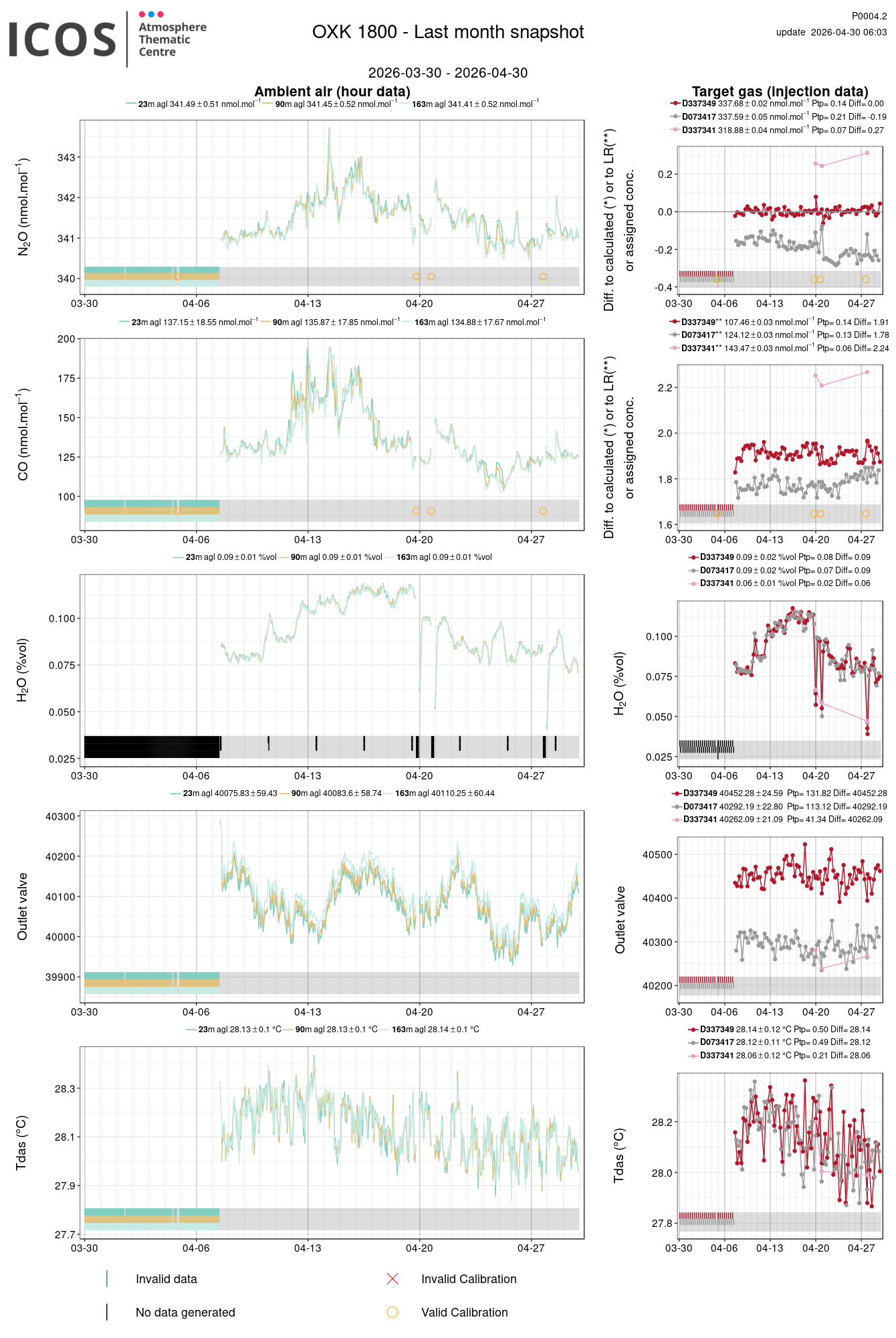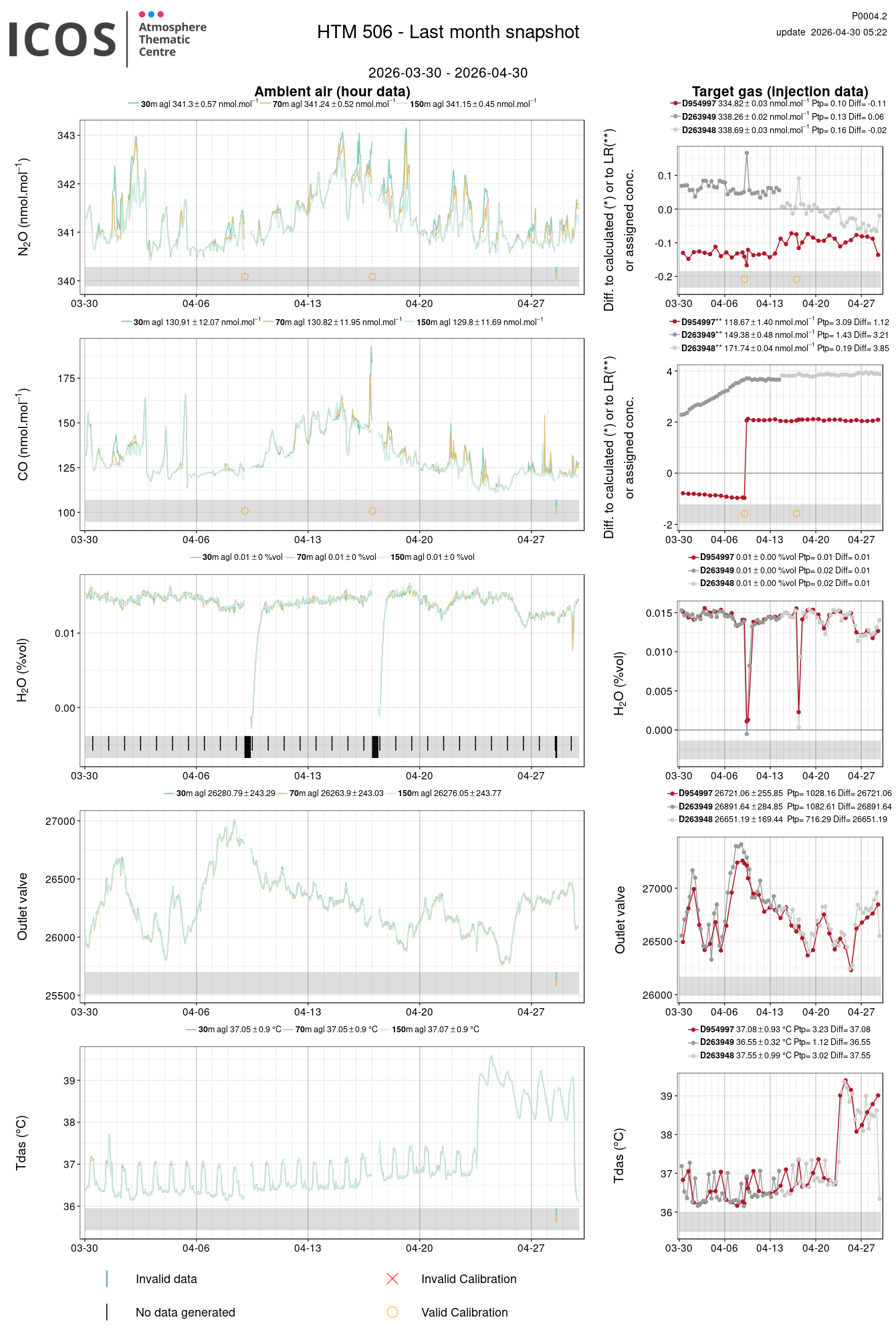 - Y-axis: For GHG species, the difference between the measured value and the calculated (if tank's legend is followed by a star "*") or assigned value is computed. For H2O, the absolute value is plotted.