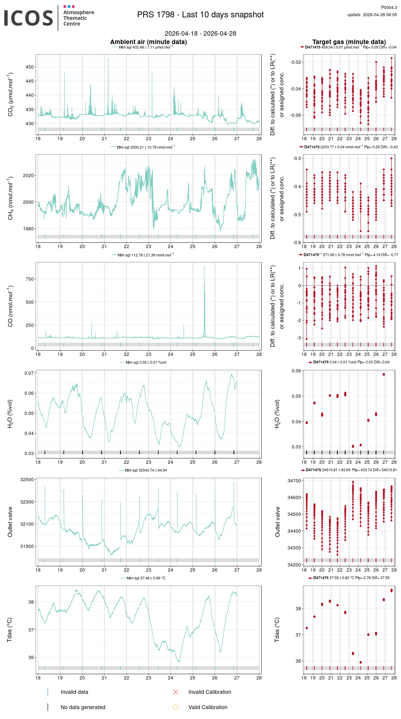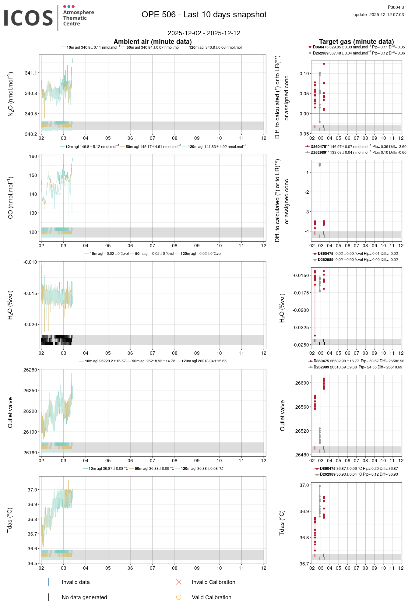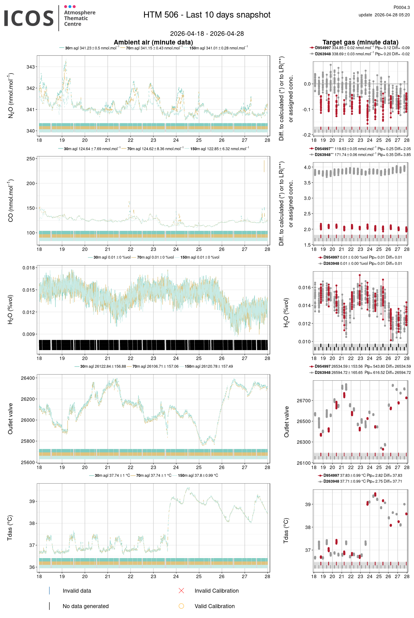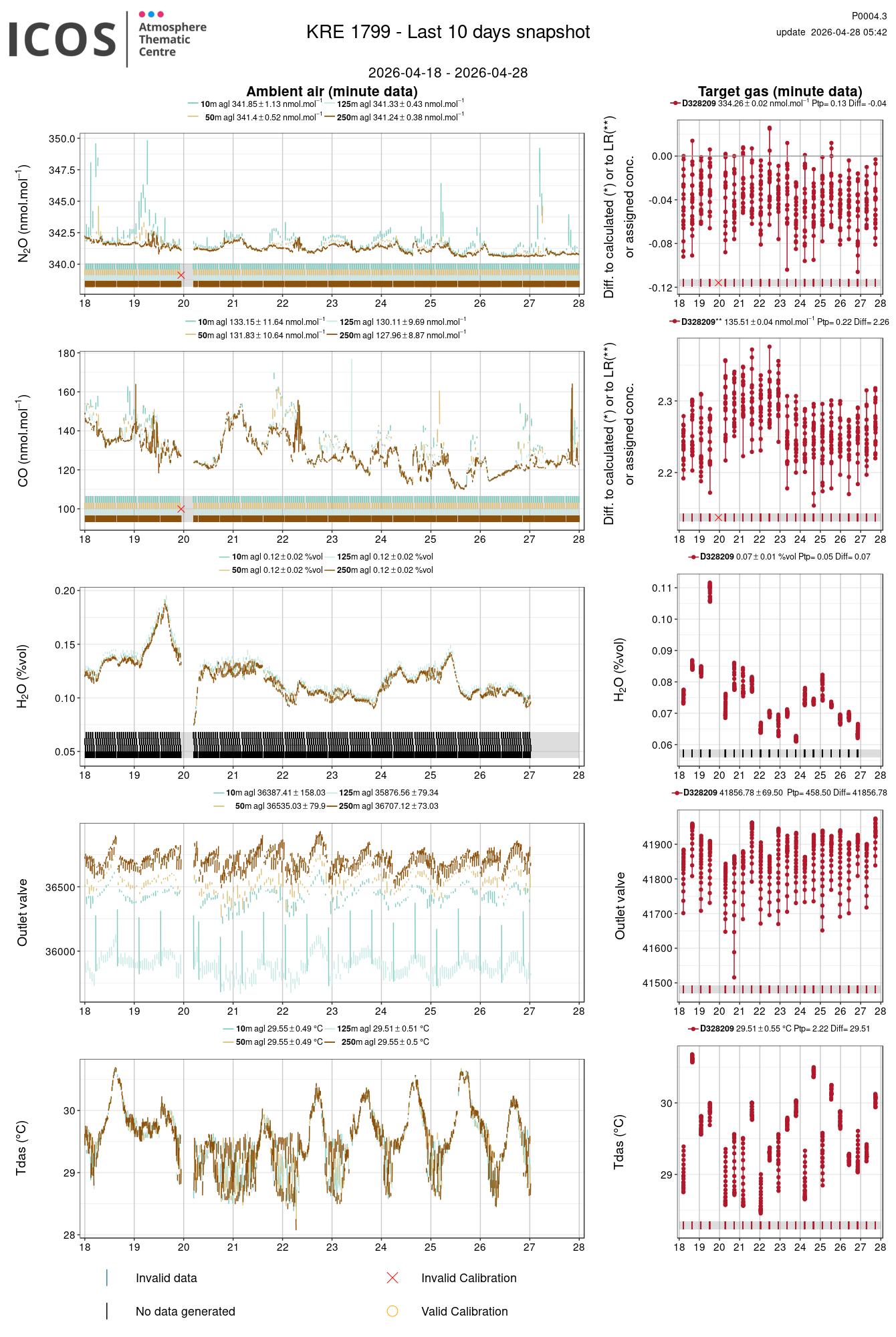 P0004.3 product shows the last 10 days air timeseries. For the given site and instrument, each left box plot displays the timeseries of a air species while ambient air is measured ; and each right box plot displays the timeseries of a air species while a target air is measured. Colors on the left plots represents sampling heights, colors on the right plot represents target tanks.