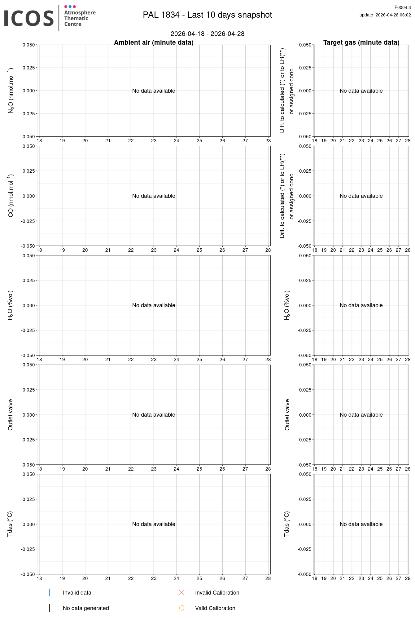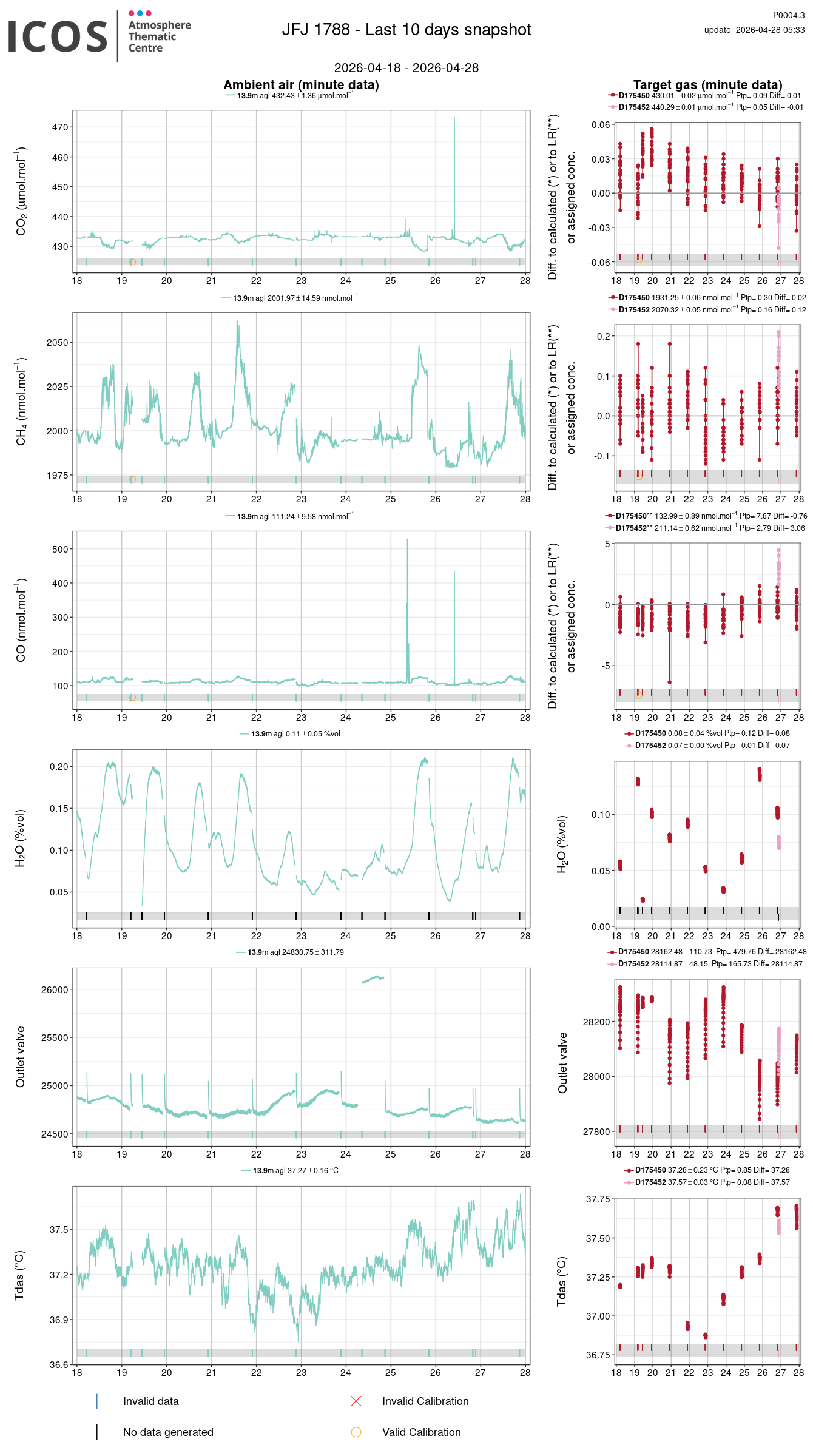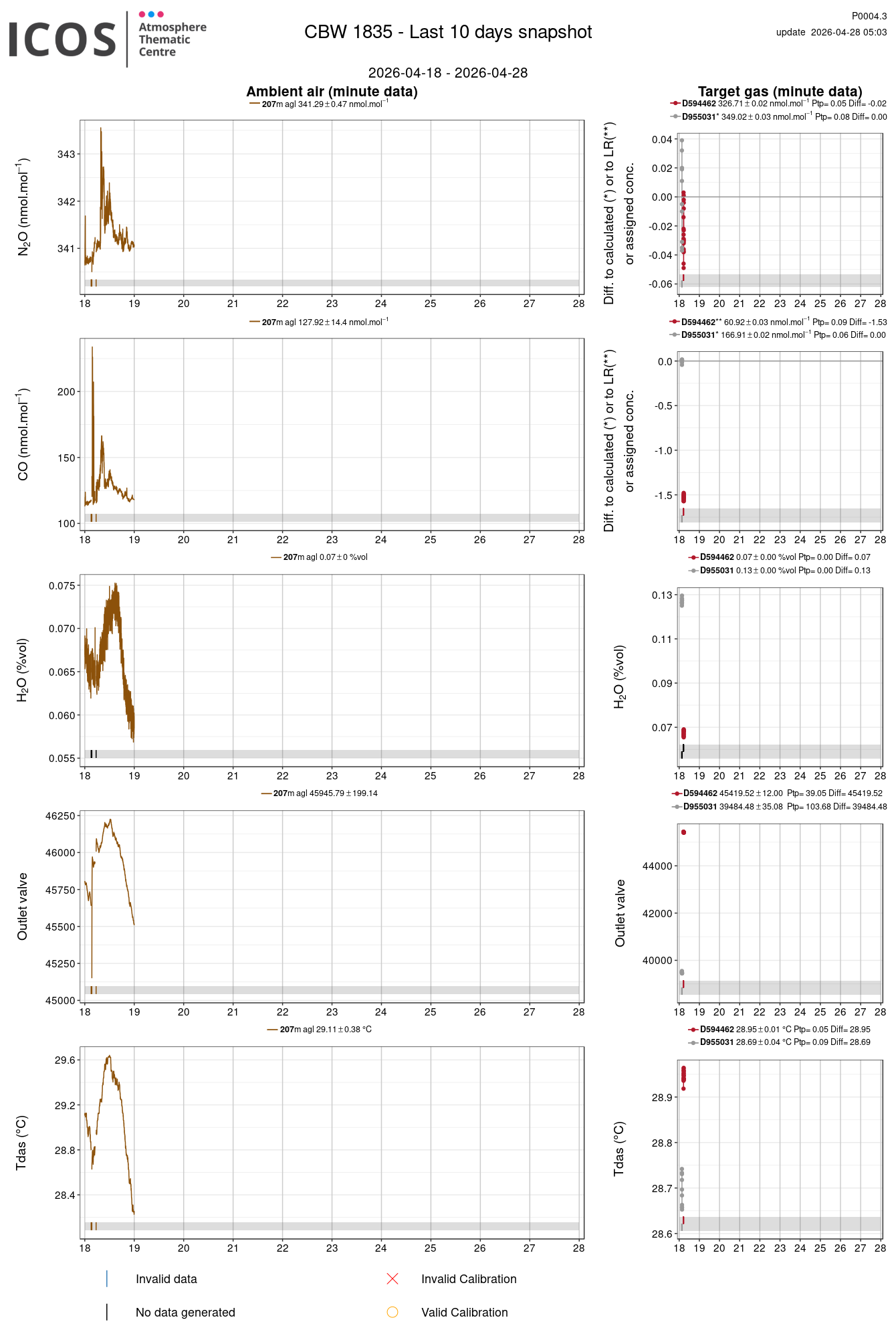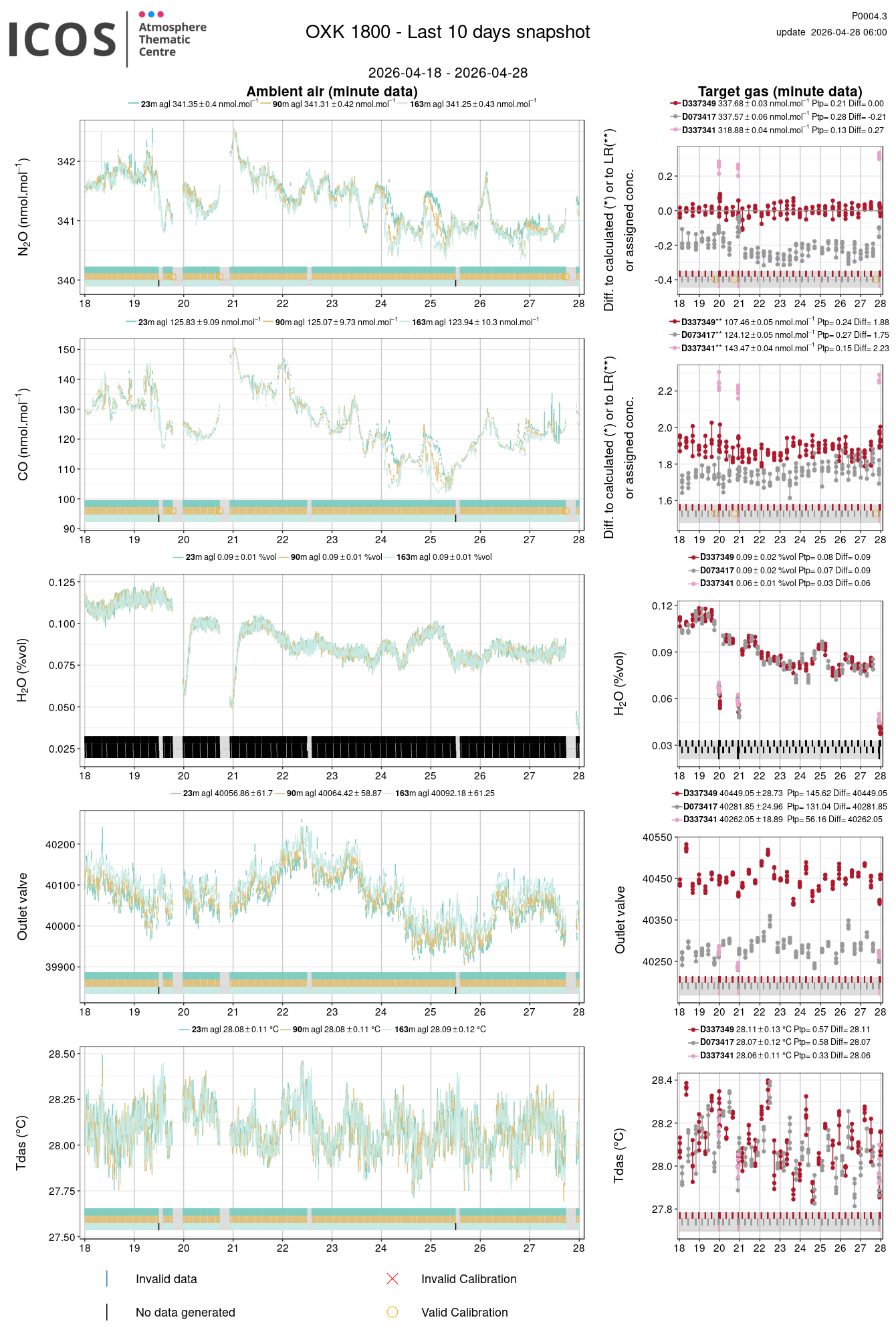 P0004.3 product shows the last 10 days air timeseries. For the given site and instrument, each left box plot displays the timeseries of a air species while ambient air is measured ; and each right box plot displays the timeseries of a air species while a target air is measured. Colors on the left plots represents sampling heights, colors on the right plot represents target tanks.