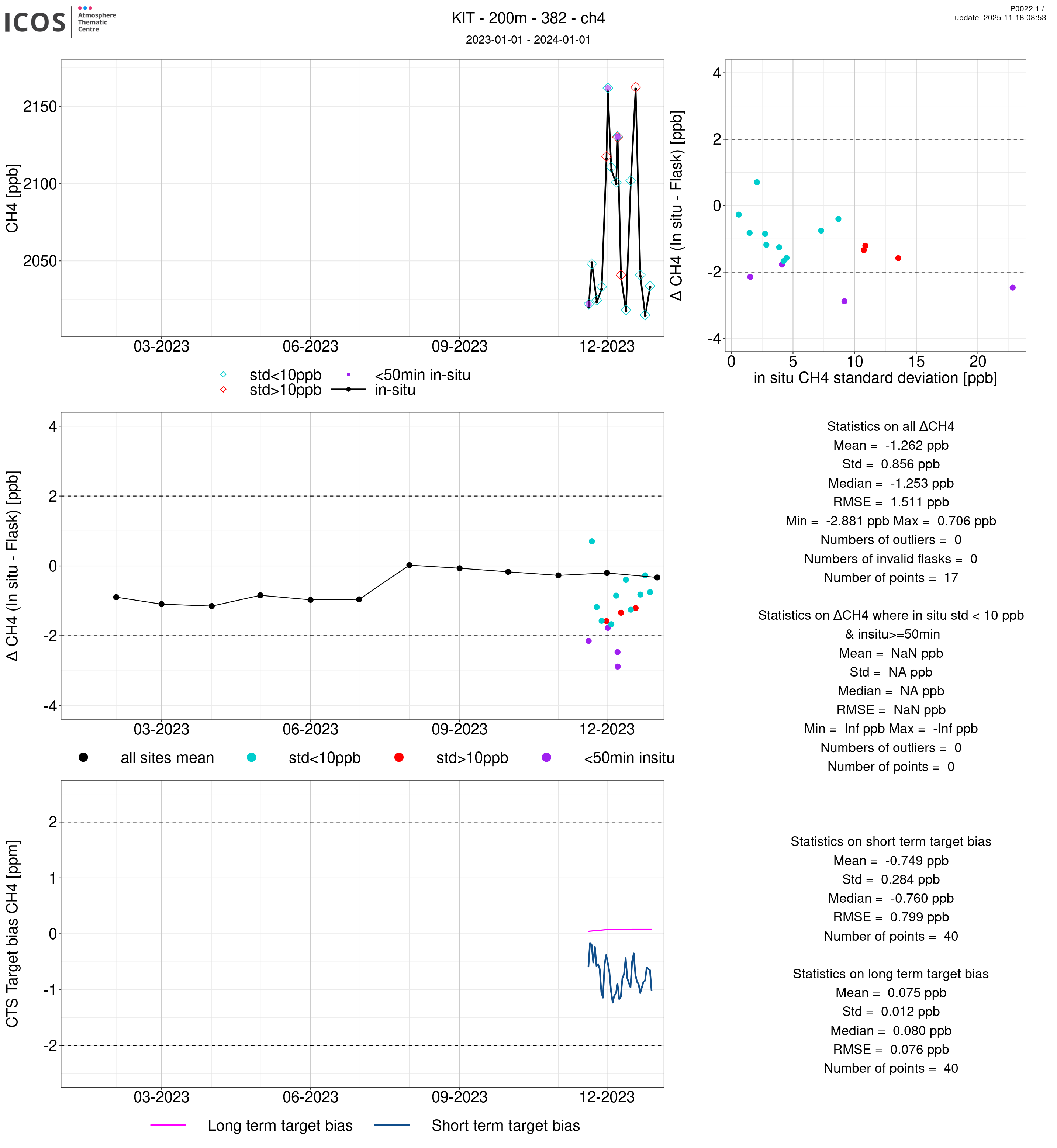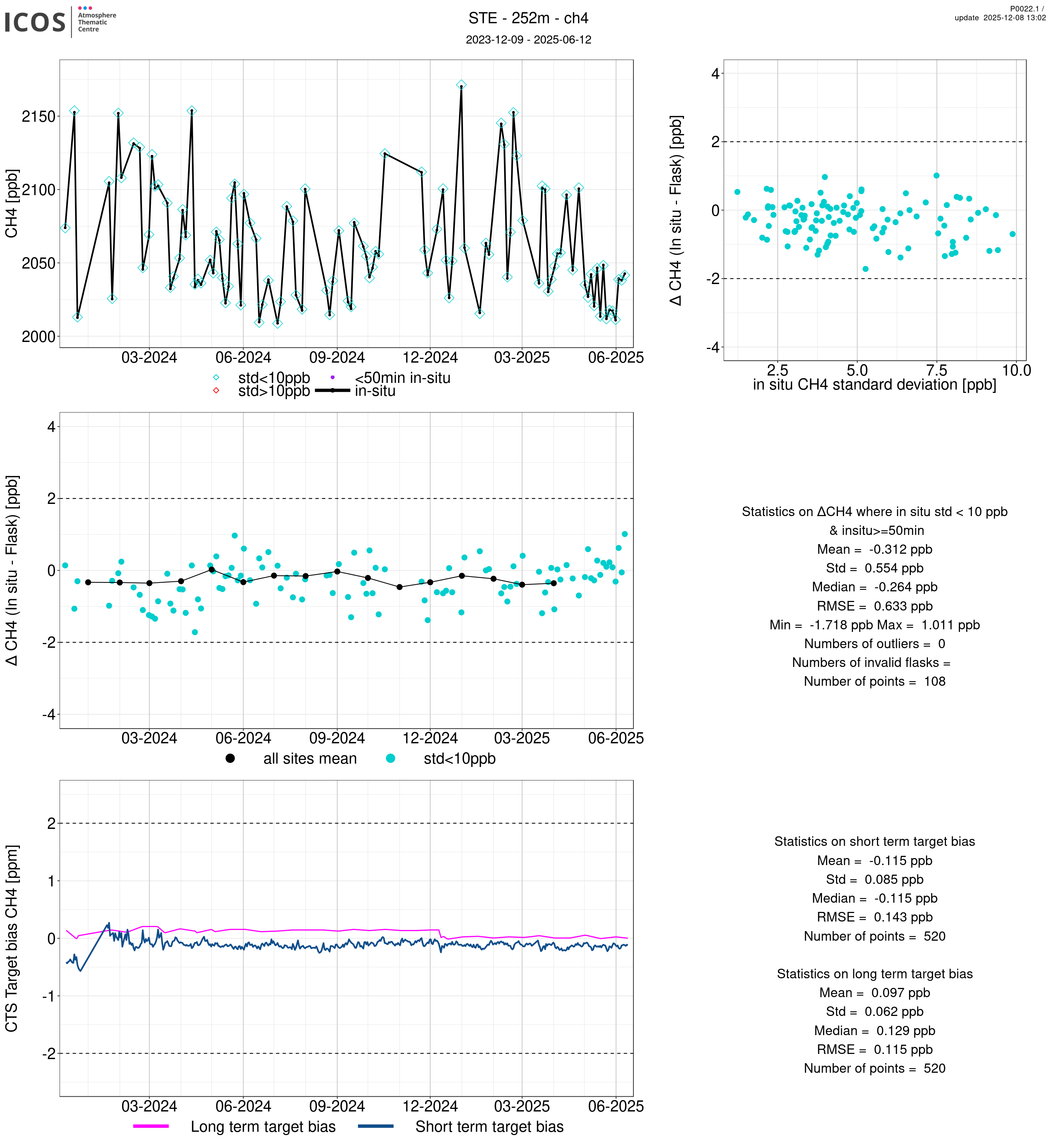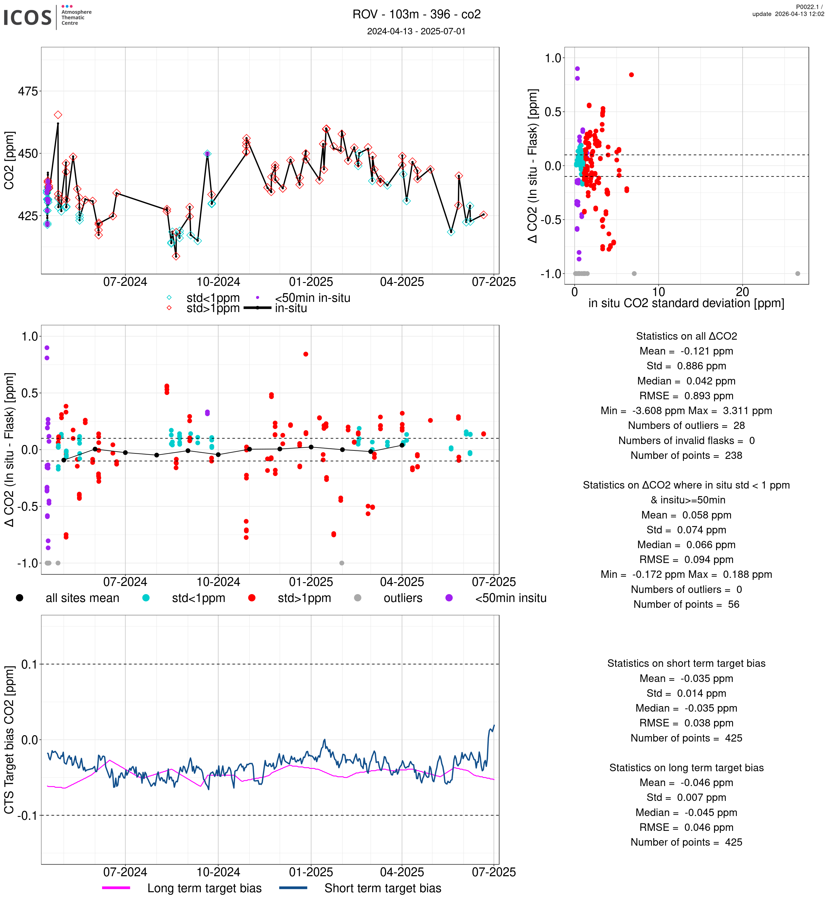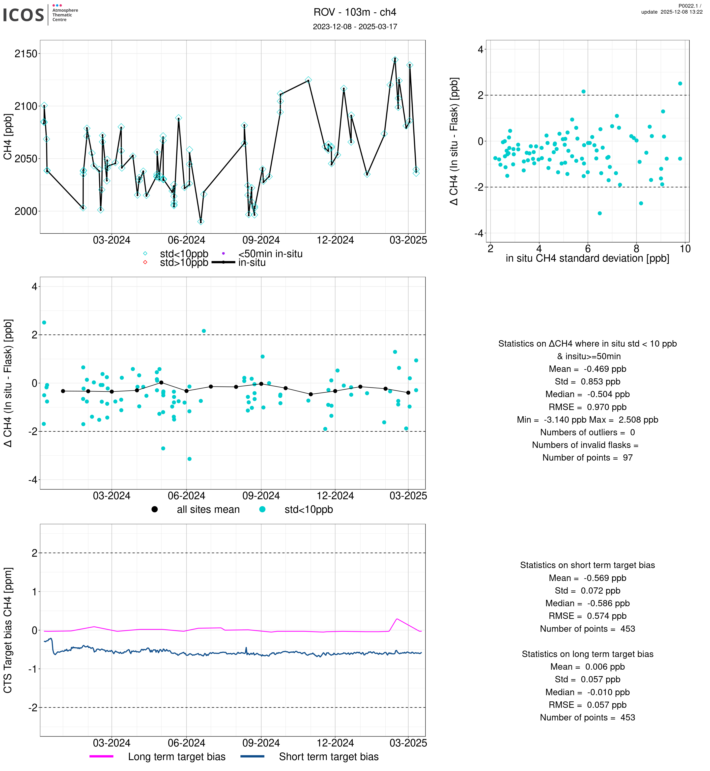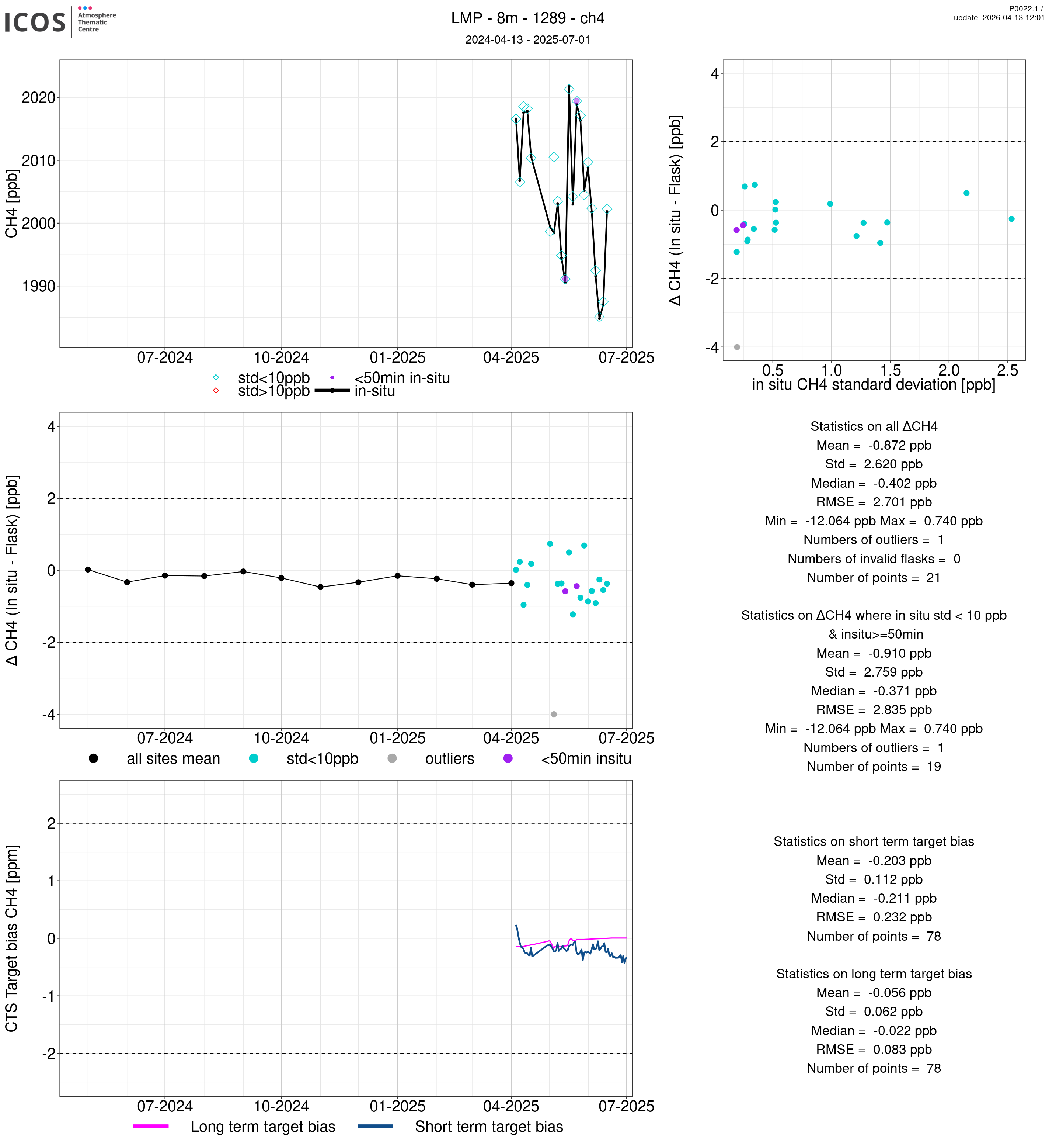 P0022.1 product shows the ambient air -flask difference over one year. For the given site and instrument/CTS, the upper left box plot displays the timeseries of air and flask species ; the middle left box shows the air-flask difference over time while the lower left box plot shows the LT and ST bias. The upper right box plot shows the air- flask difference versus the air standard deviation. Colors show the standard deviation categories. Grey points indicates data that are outside the y-axis.