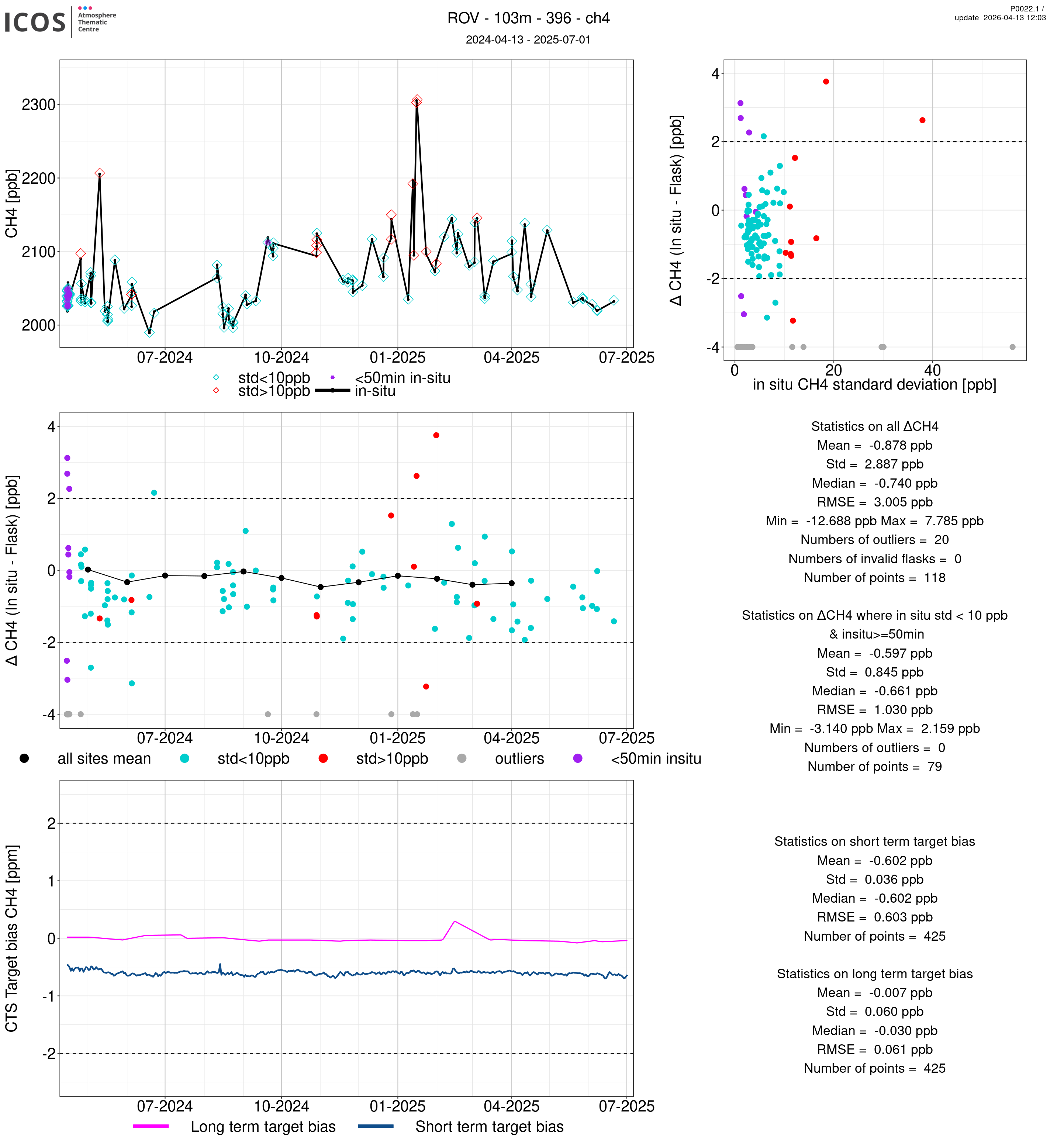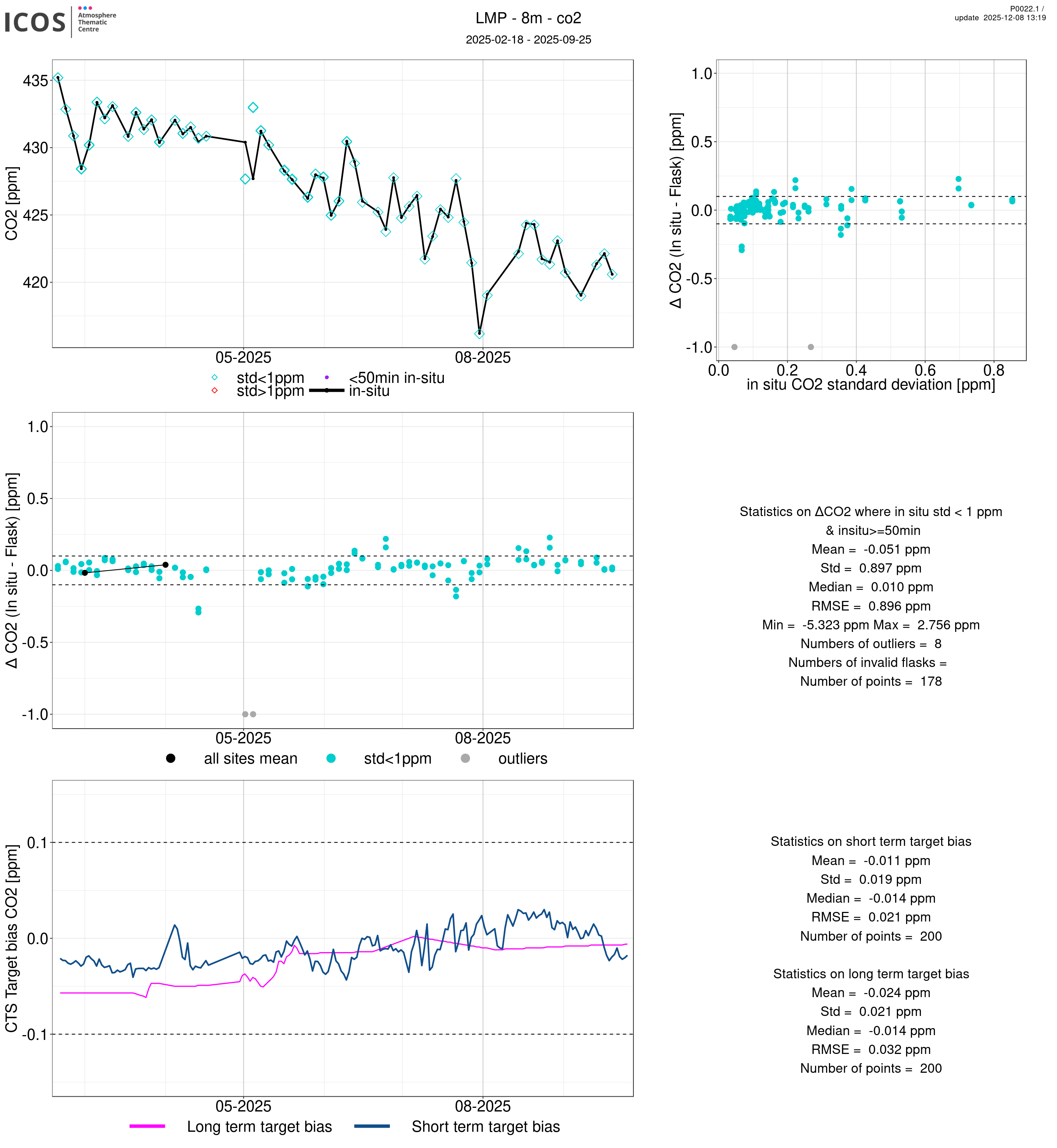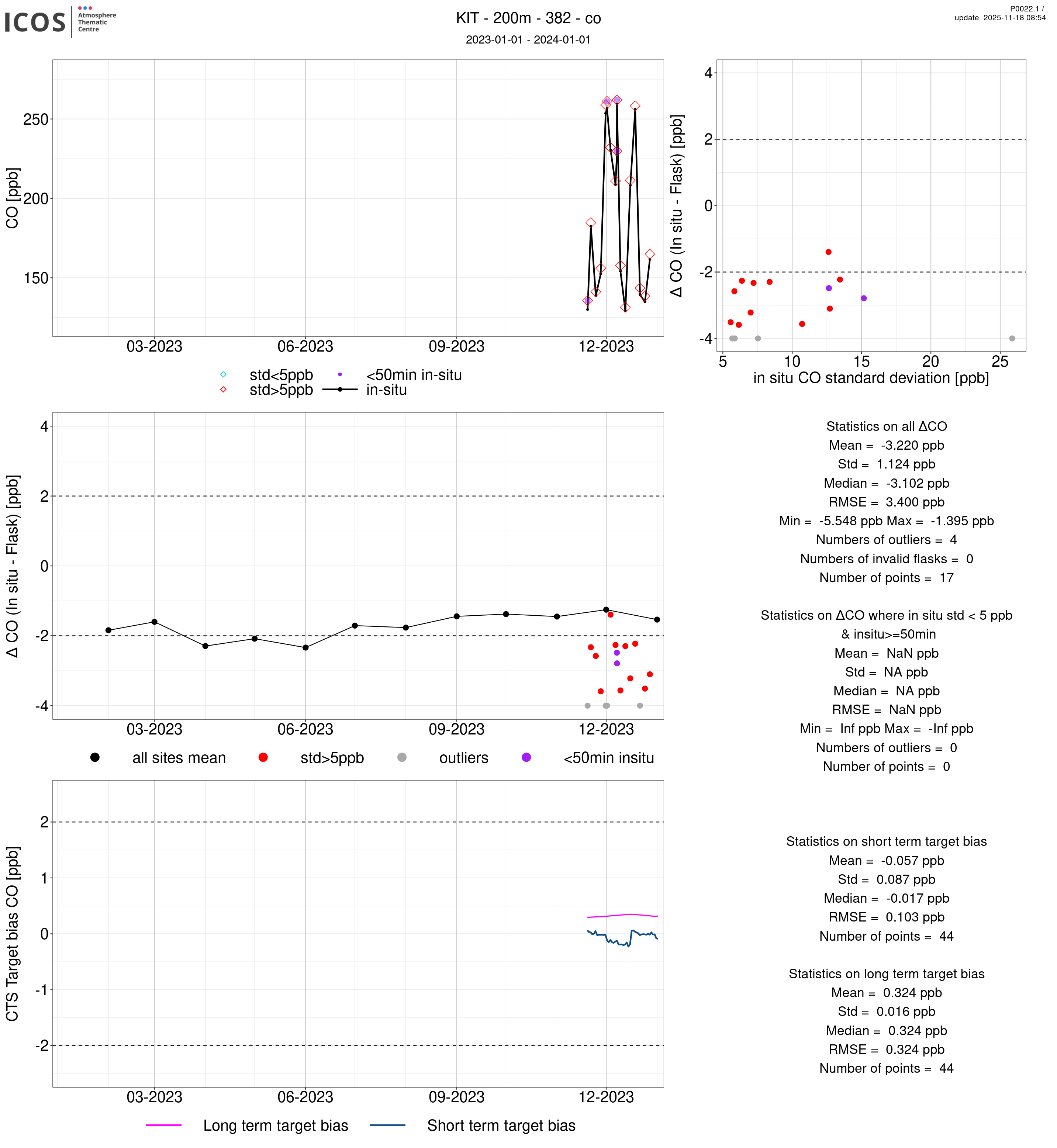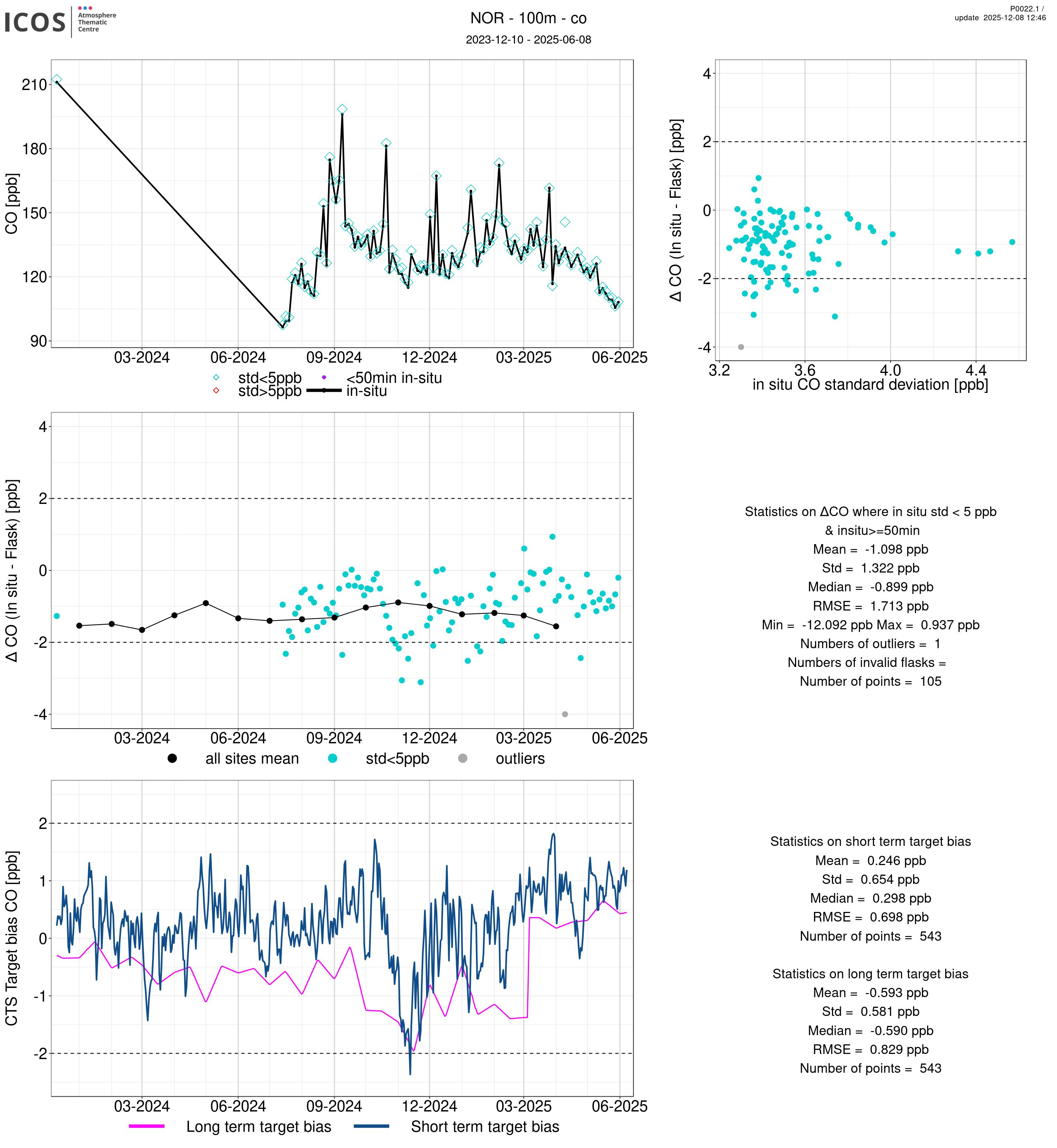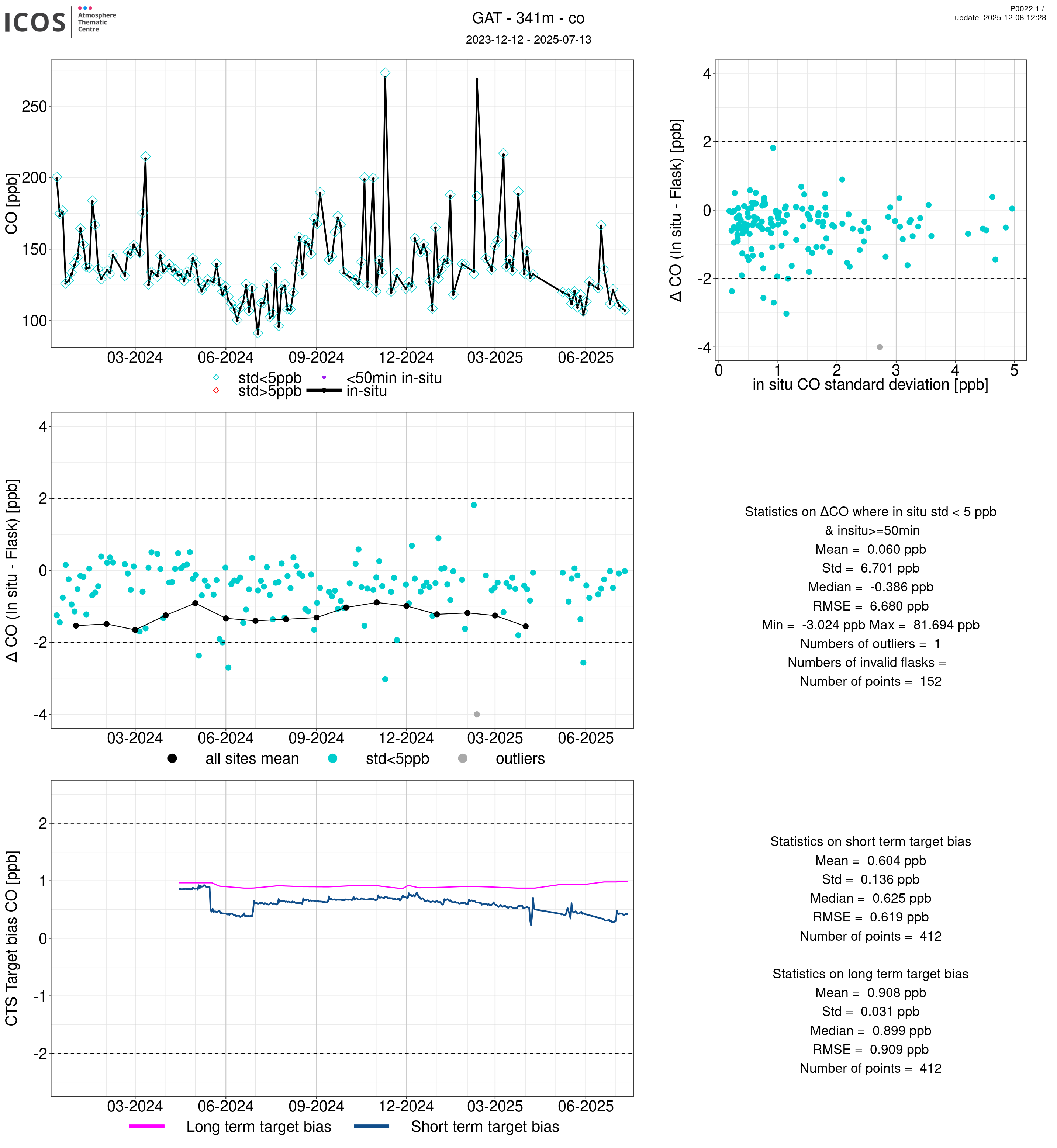 P0022.1 product shows the ambient air -flask difference over one year. For the given site and instrument/CTS, the upper left box plot displays the timeseries of air and flask species ; the middle left box shows the air-flask difference over time while the lower left box plot shows the LT and ST bias. The upper right box plot shows the air- flask difference versus the air standard deviation. Colors show the standard deviation categories. Grey points indicates data that are outside the y-axis.
