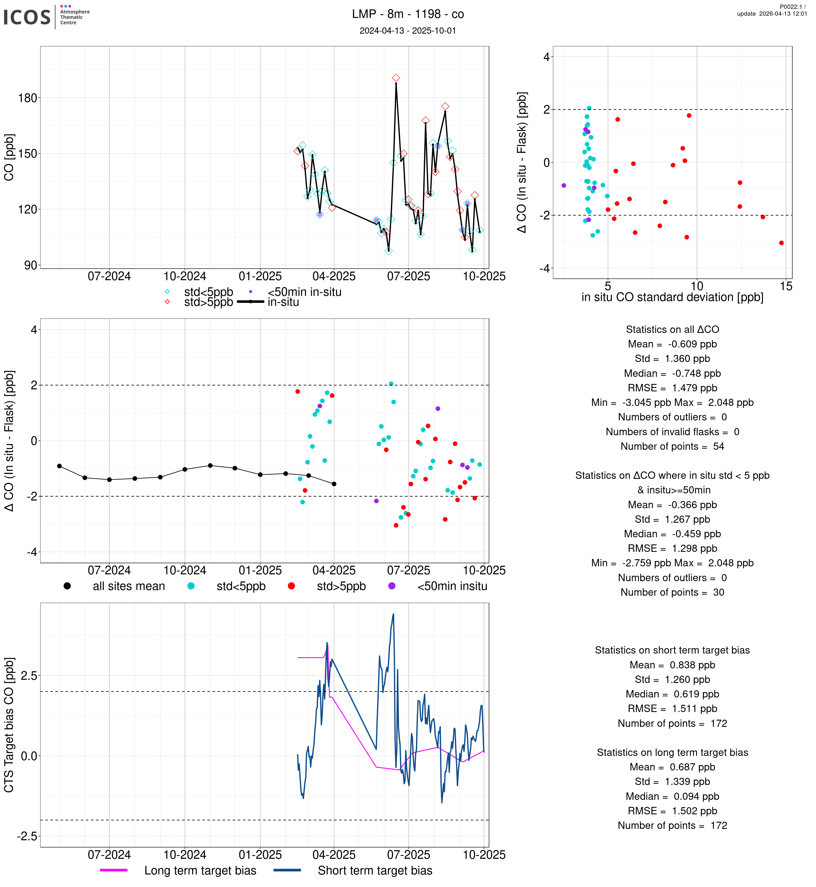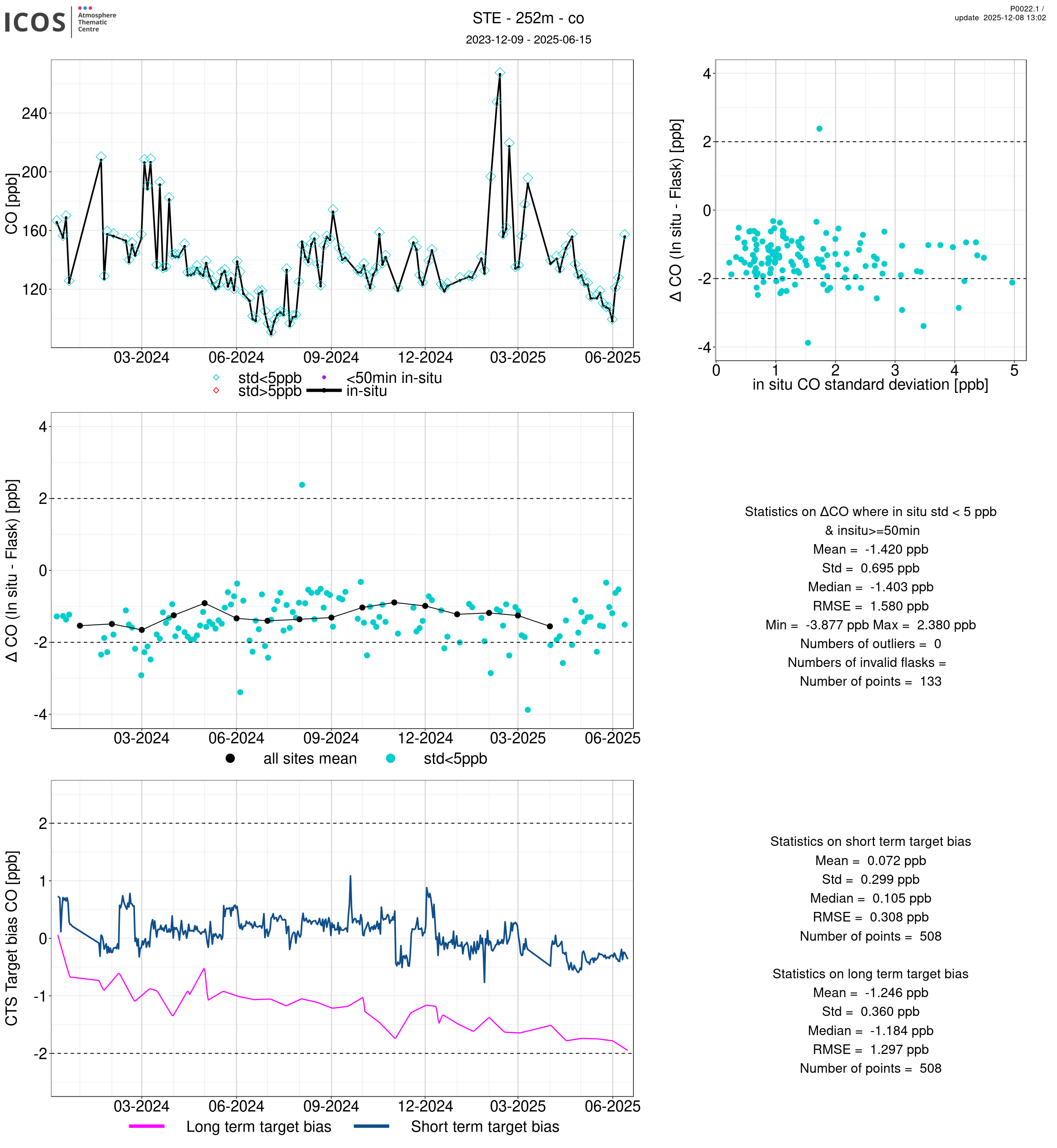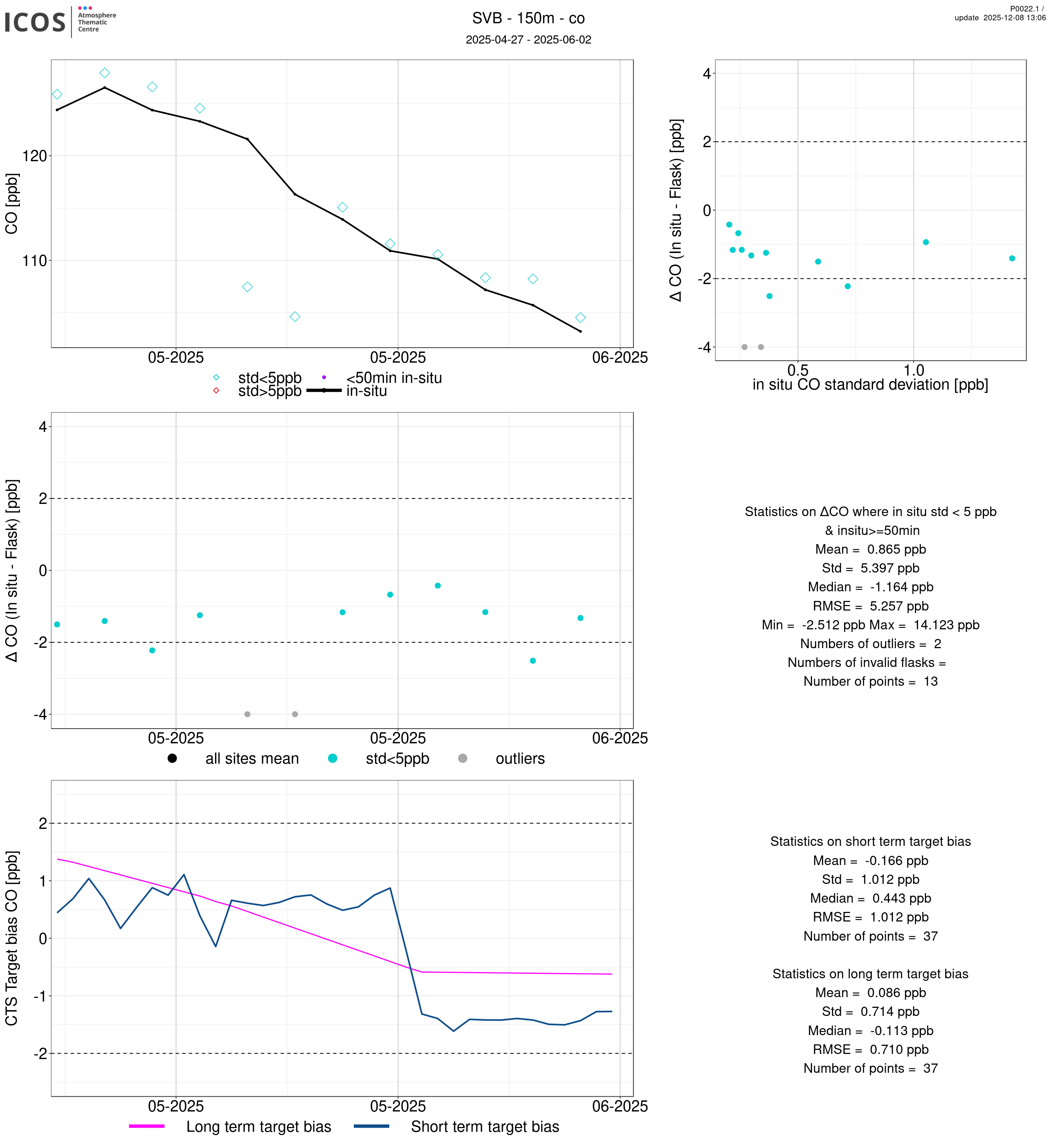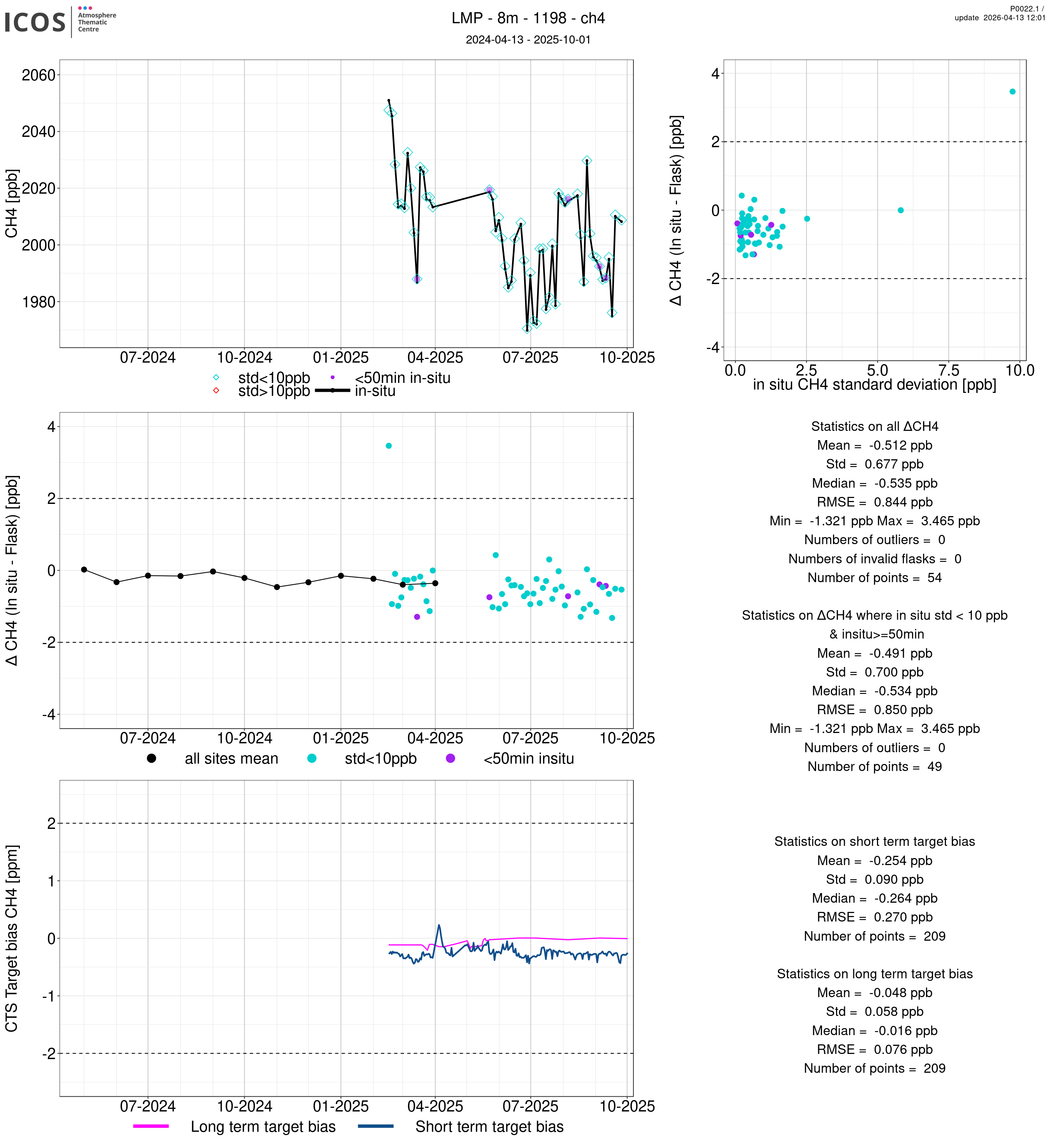 P0022.1 product shows the ambient air -flask difference over one year. For the given site and instrument/CTS, the upper left box plot displays the timeseries of air and flask species ; the middle left box shows the air-flask difference over time while the lower left box plot shows the LT and ST bias. The upper right box plot shows the air- flask difference versus the air standard deviation. Colors show the standard deviation categories. Grey points indicates data that are outside the y-axis.