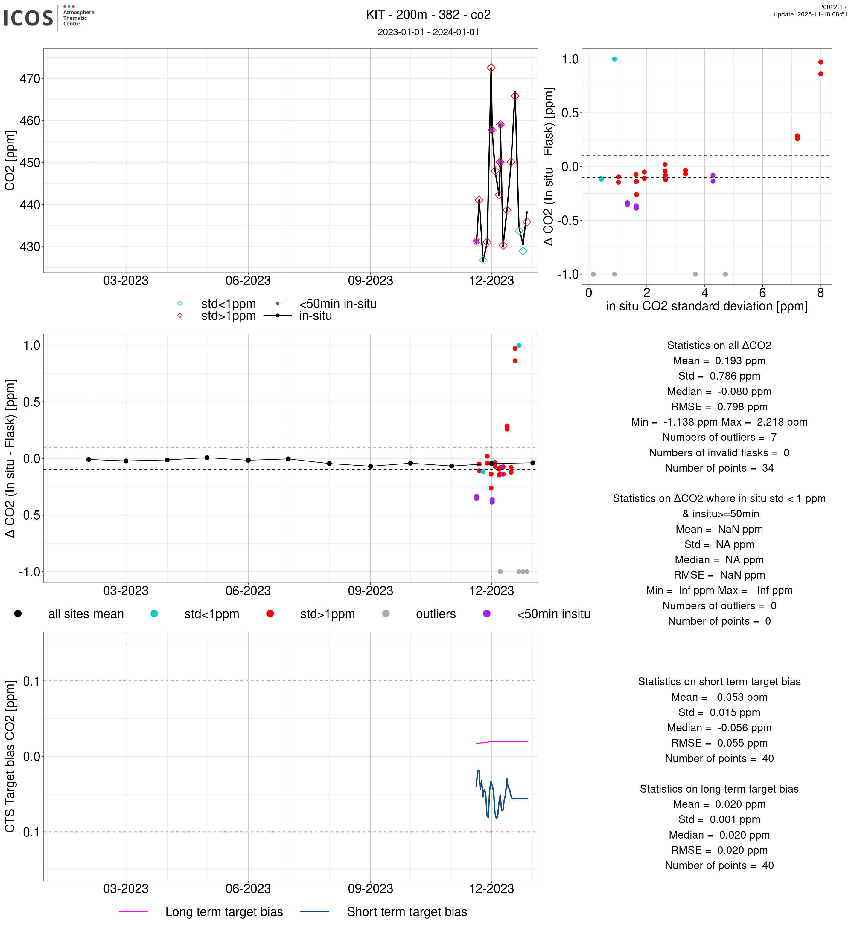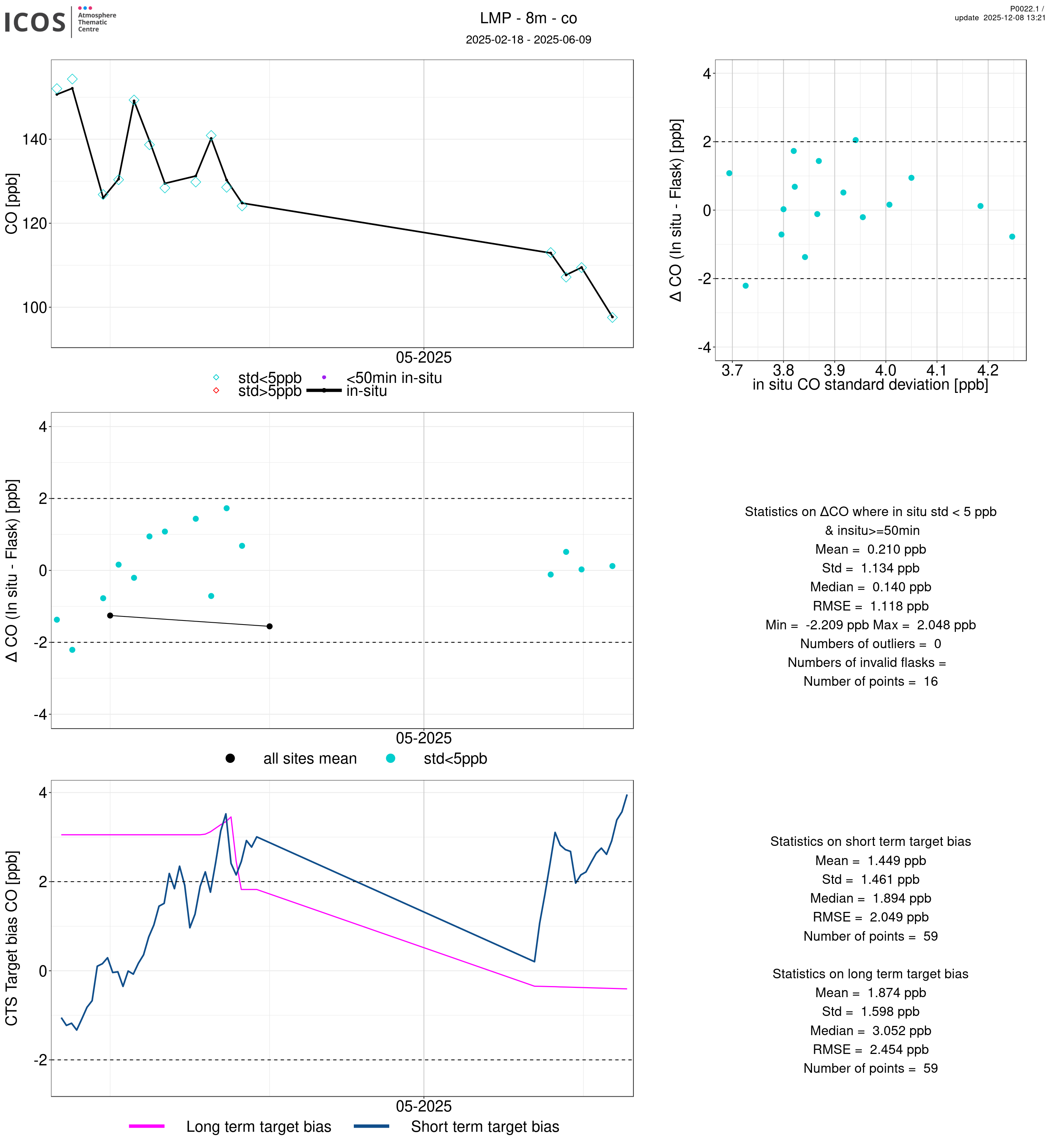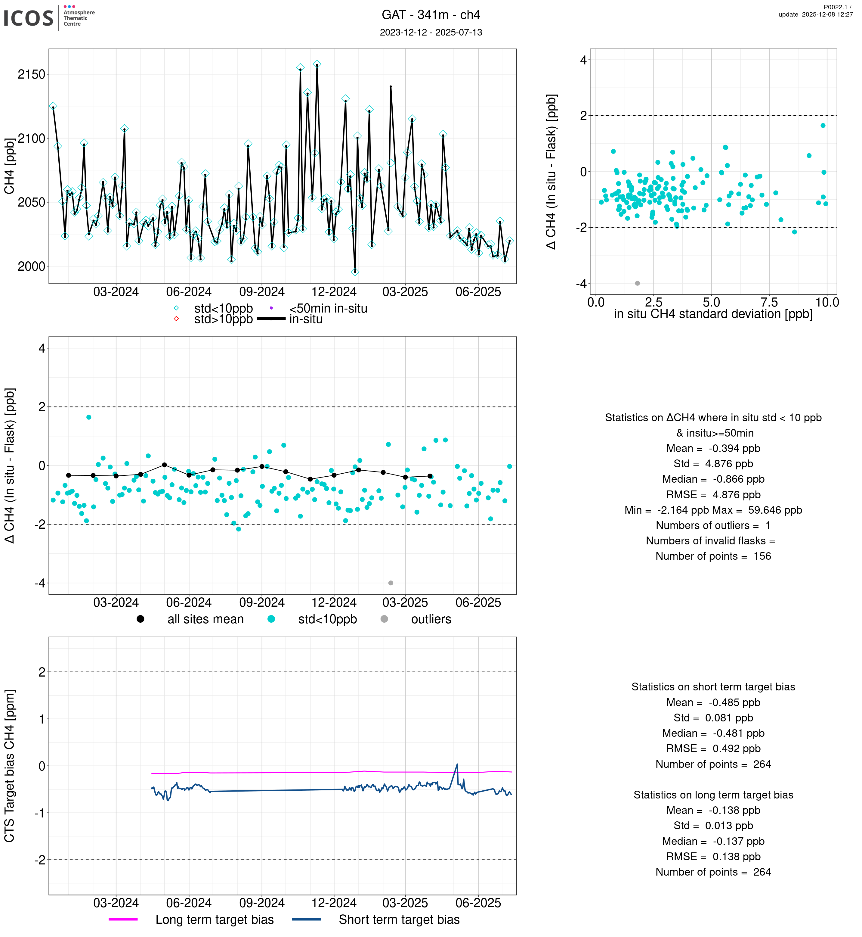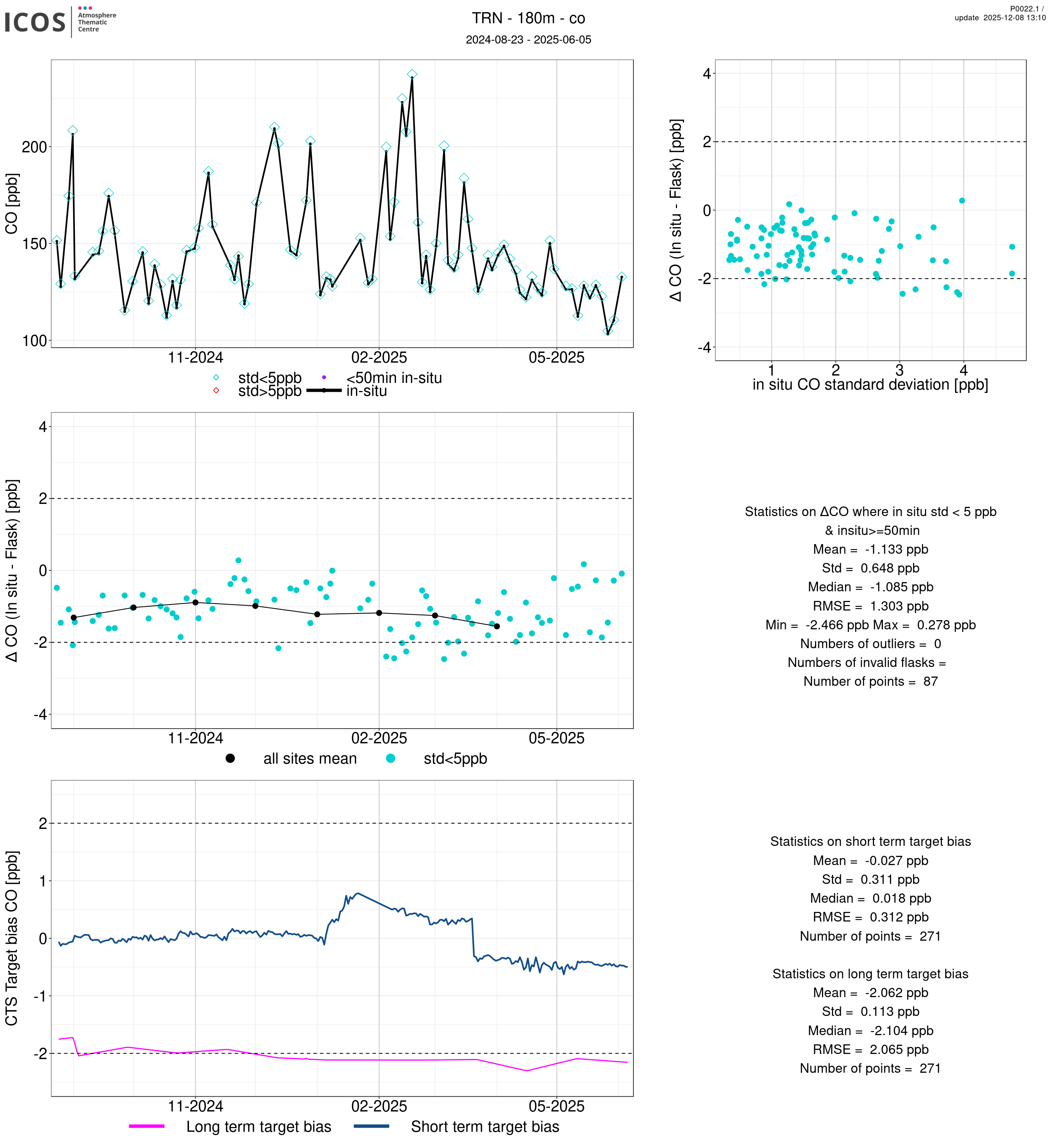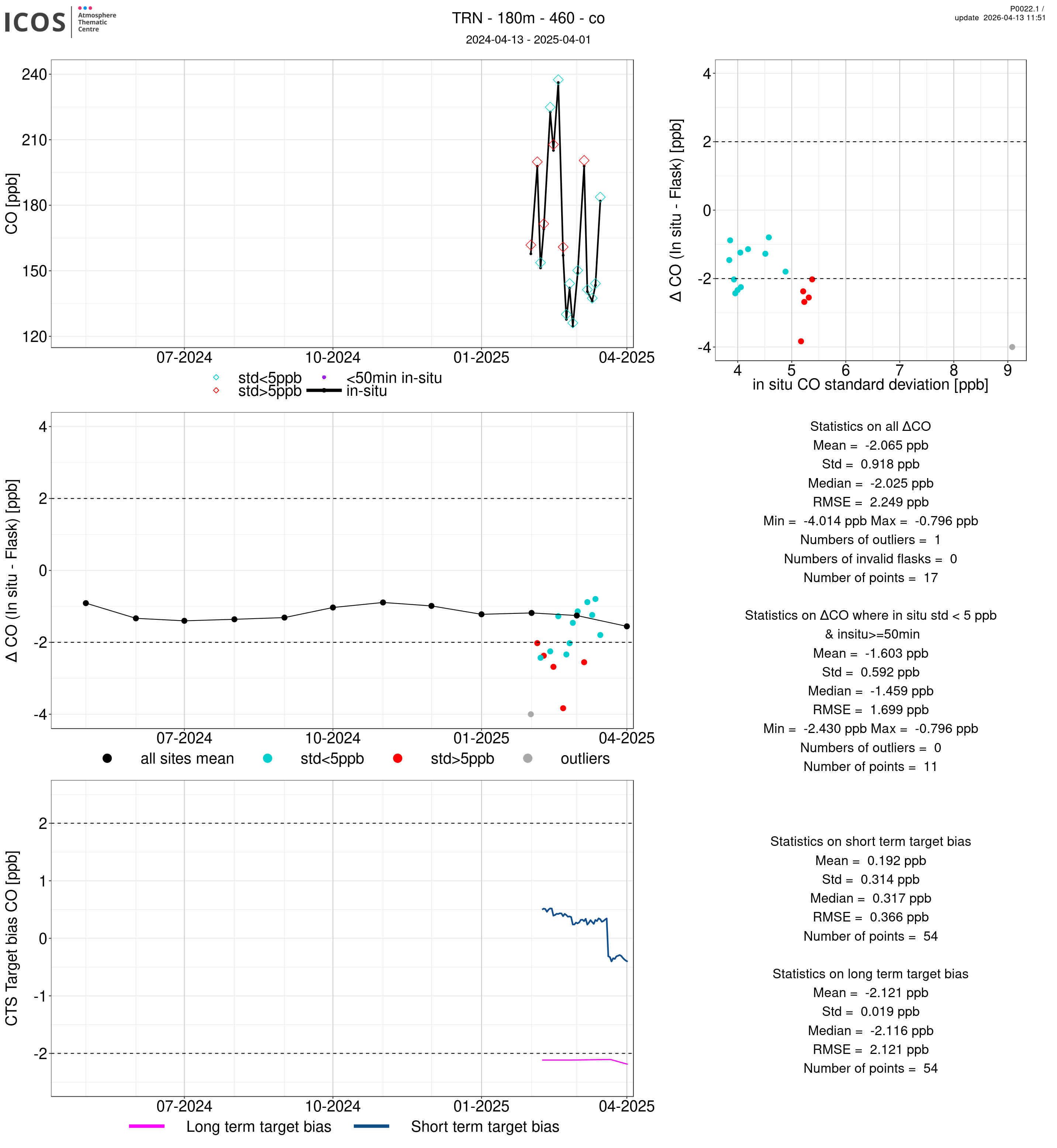 P0022.1 product shows the ambient air -flask difference over one year. For the given site and instrument/CTS, the upper left box plot displays the timeseries of air and flask species ; the middle left box shows the air-flask difference over time while the lower left box plot shows the LT and ST bias. The upper right box plot shows the air- flask difference versus the air standard deviation. Colors show the standard deviation categories. Grey points indicates data that are outside the y-axis.