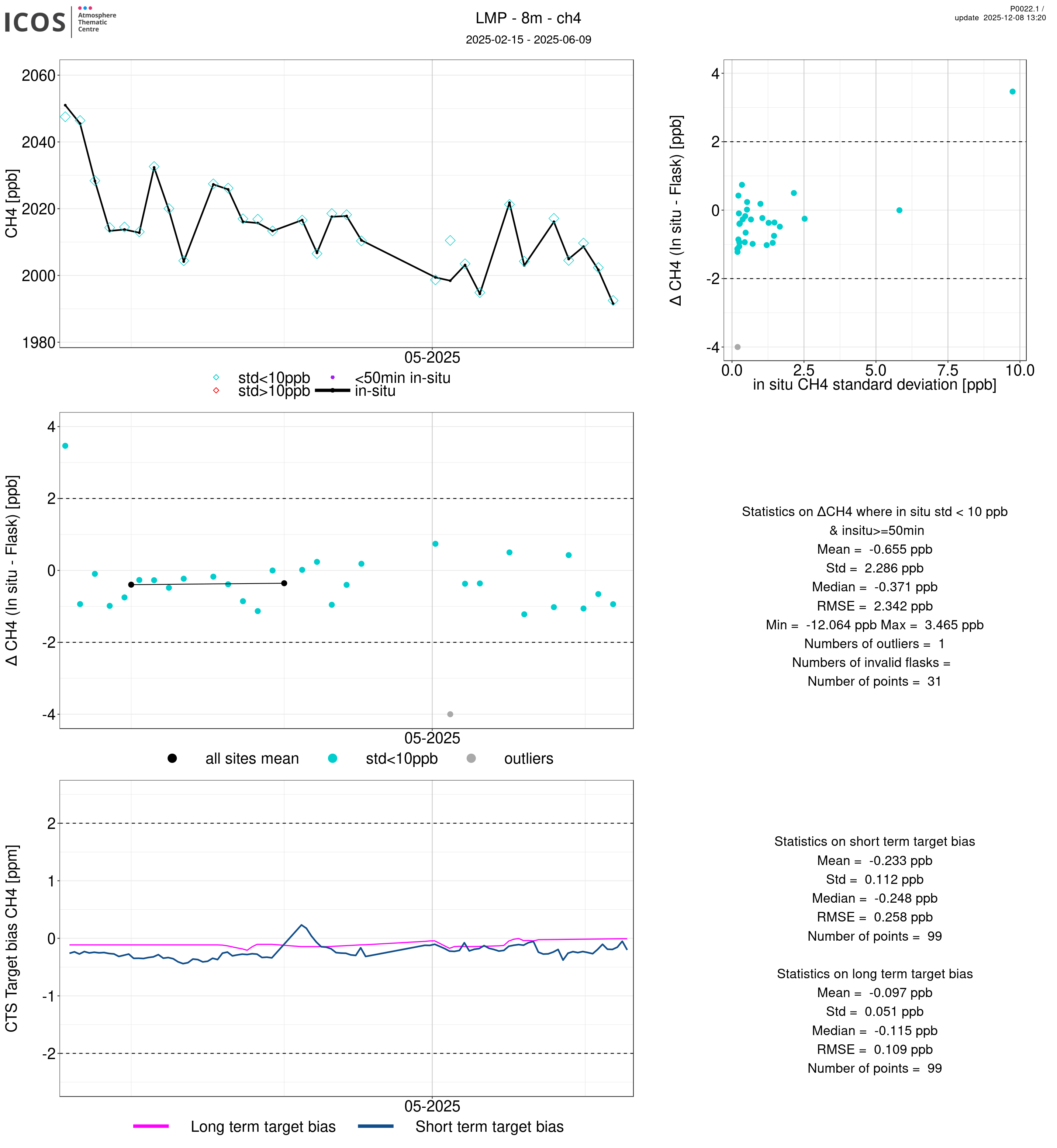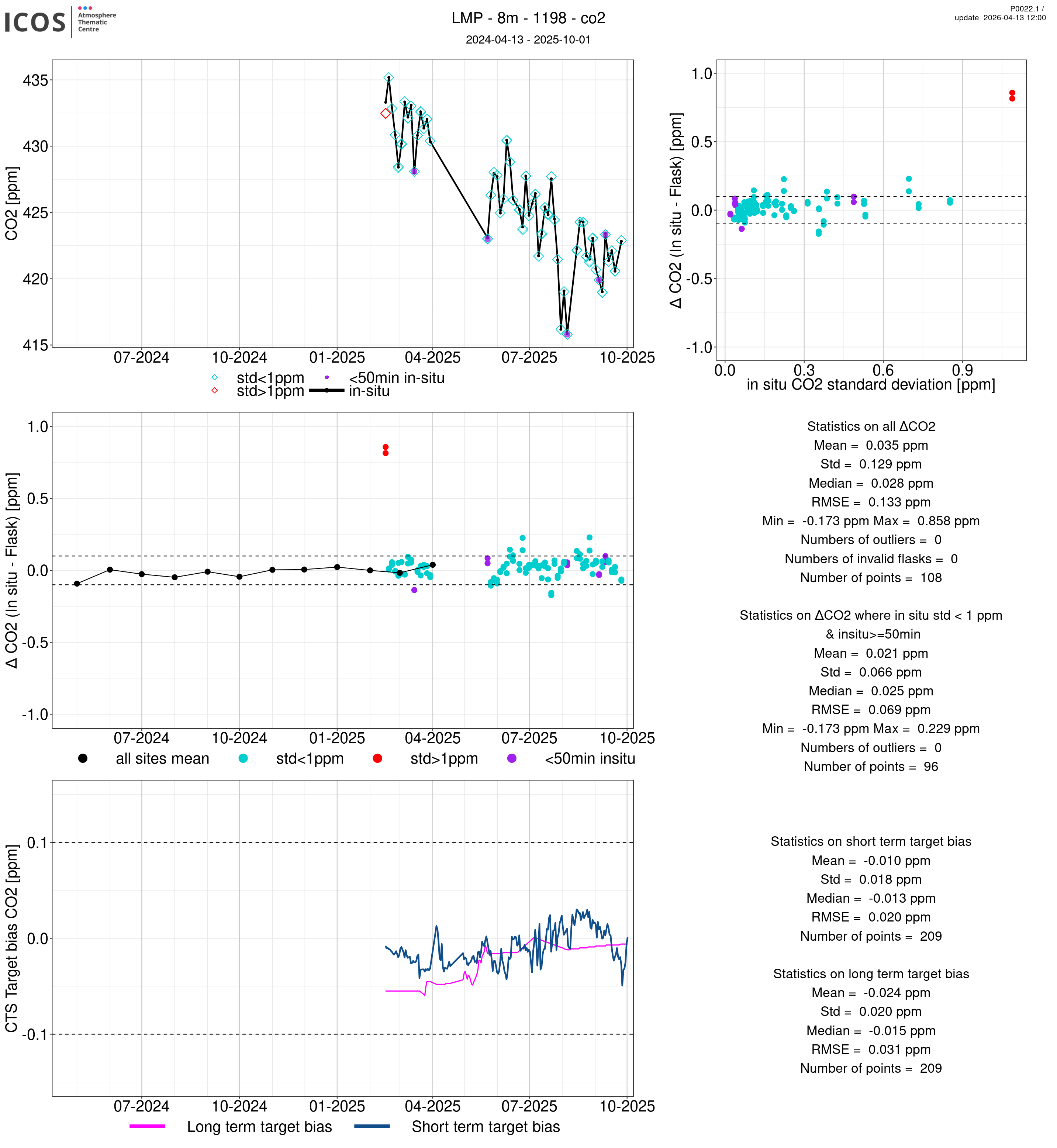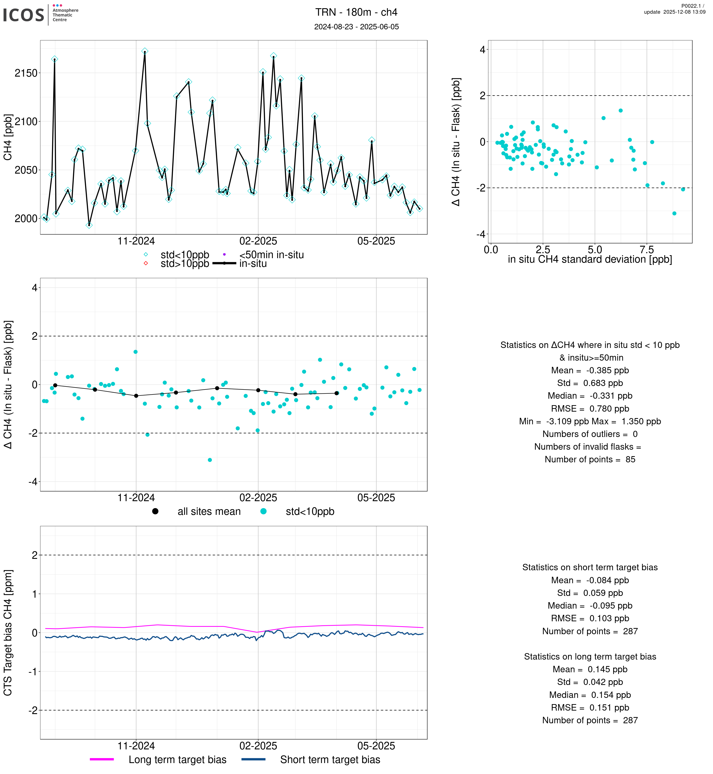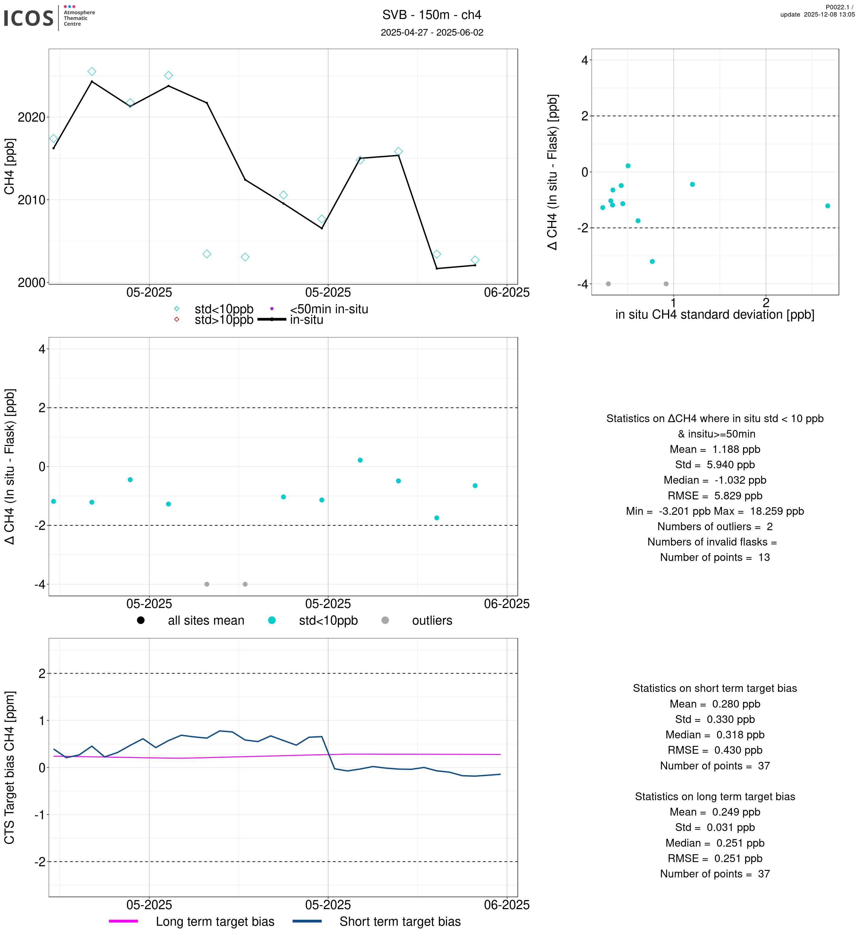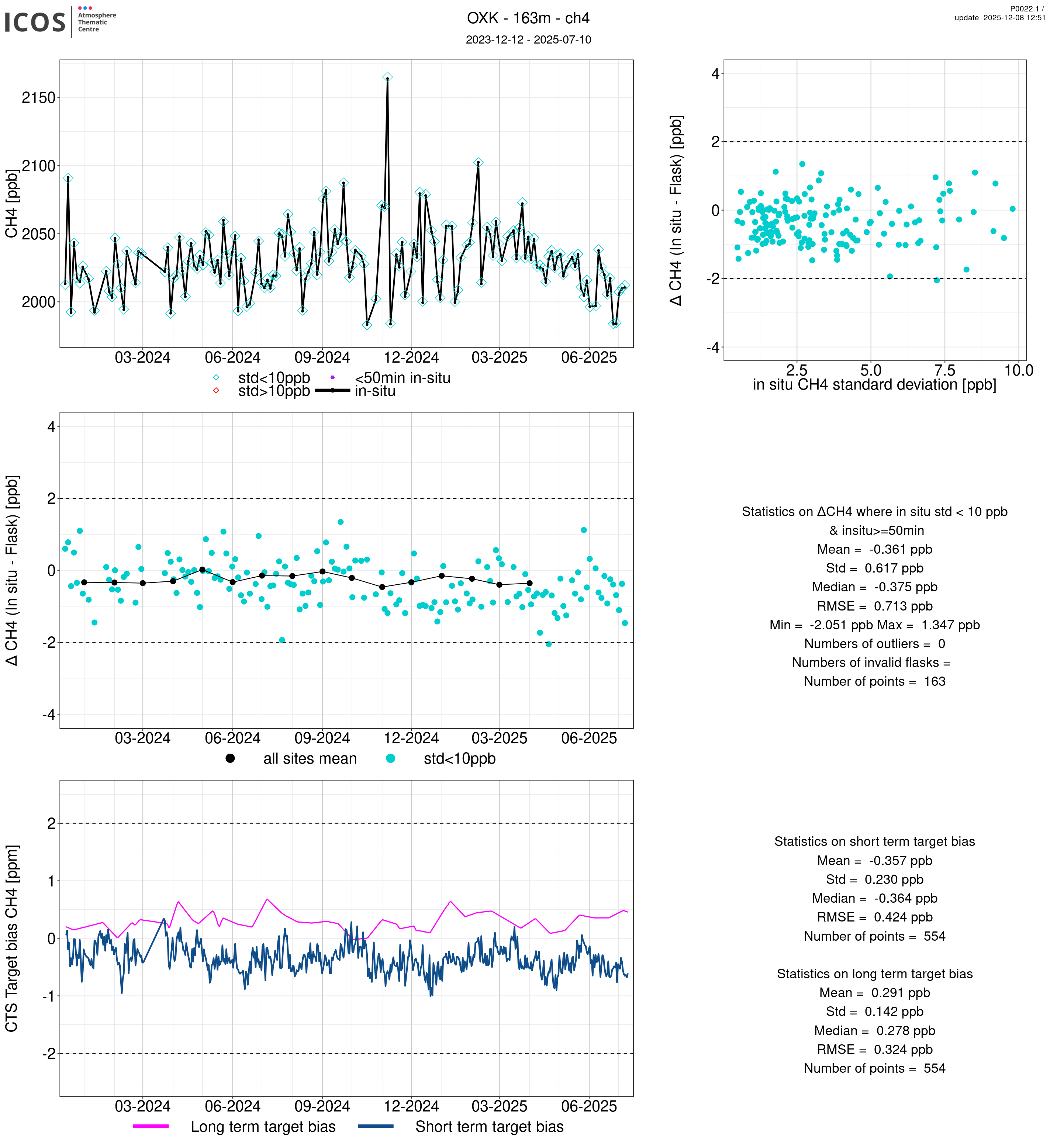P0022.1 product shows the ambient air -flask difference over one year. For the given site and instrument/CTS, the upper left box plot displays the timeseries of air and flask species ; the middle left box shows the air-flask difference over time while the lower left box plot shows the LT and ST bias. The upper right box plot shows the air- flask difference versus the air standard deviation. Colors show the standard deviation categories. Grey points indicates data that are outside the y-axis.