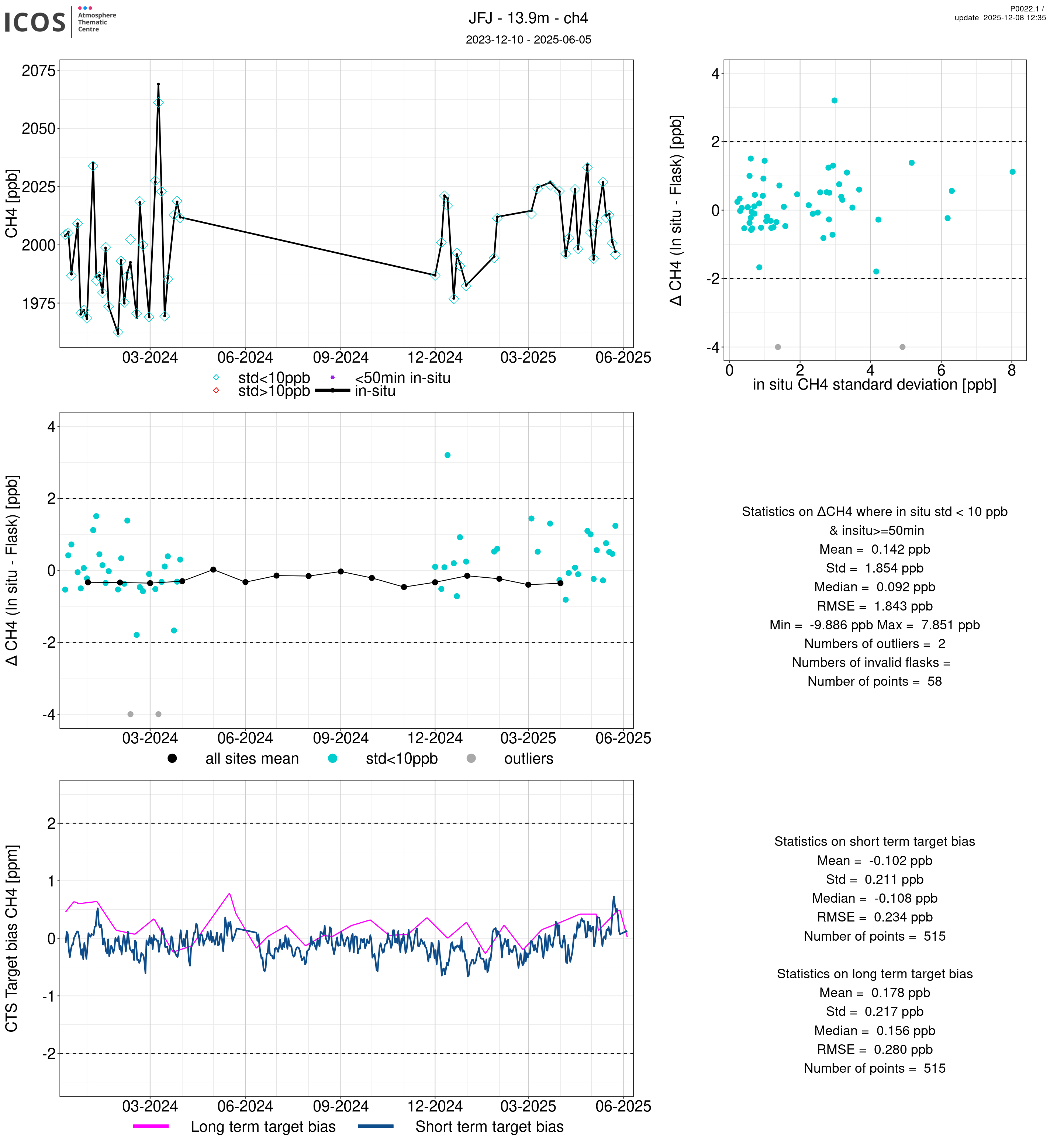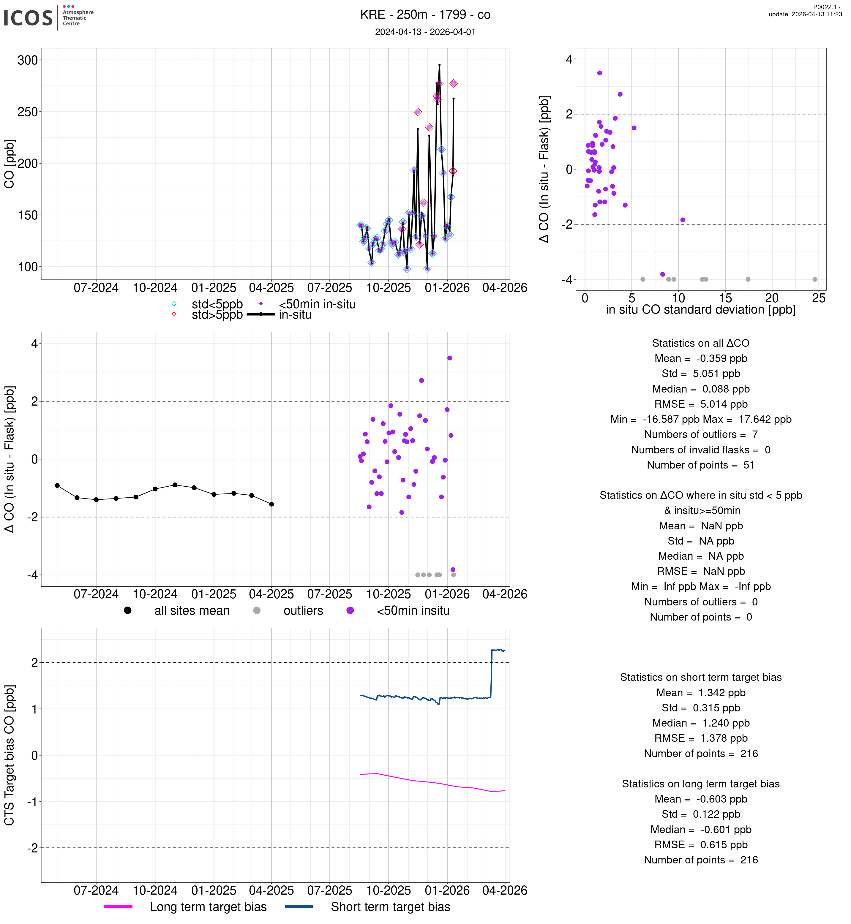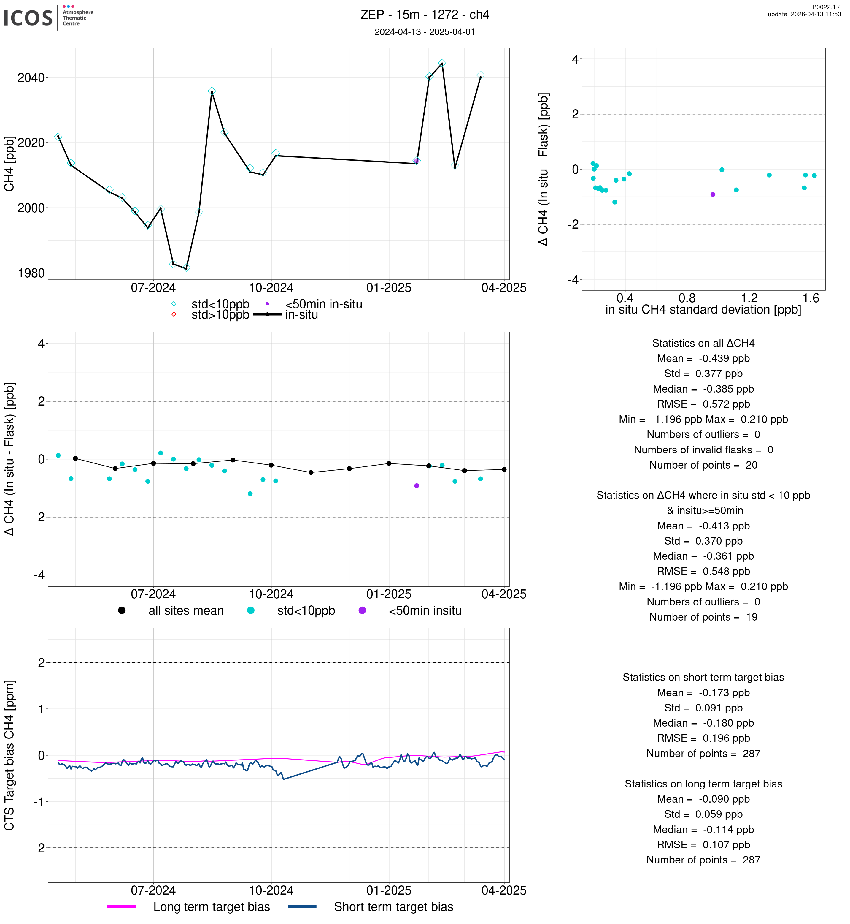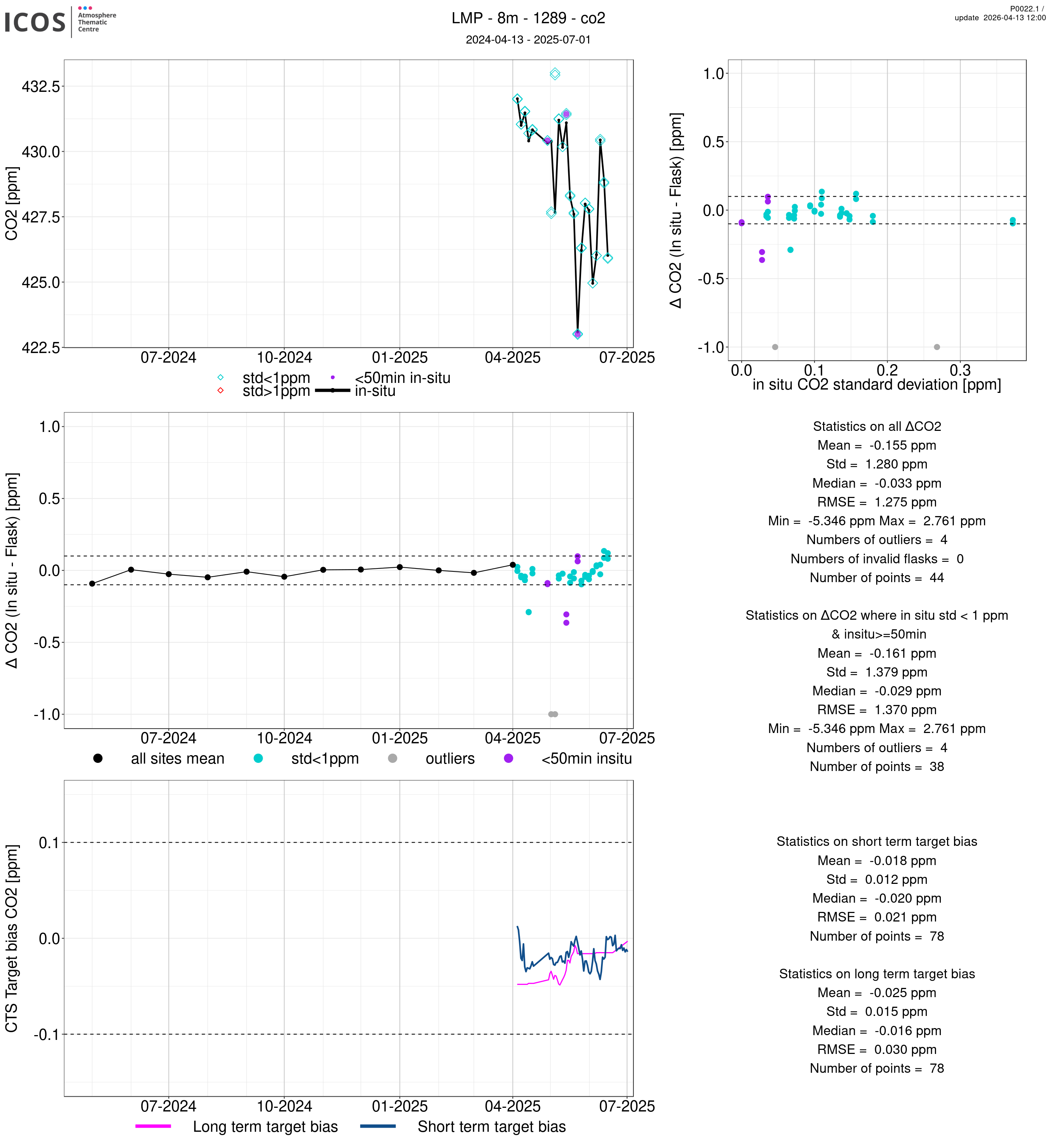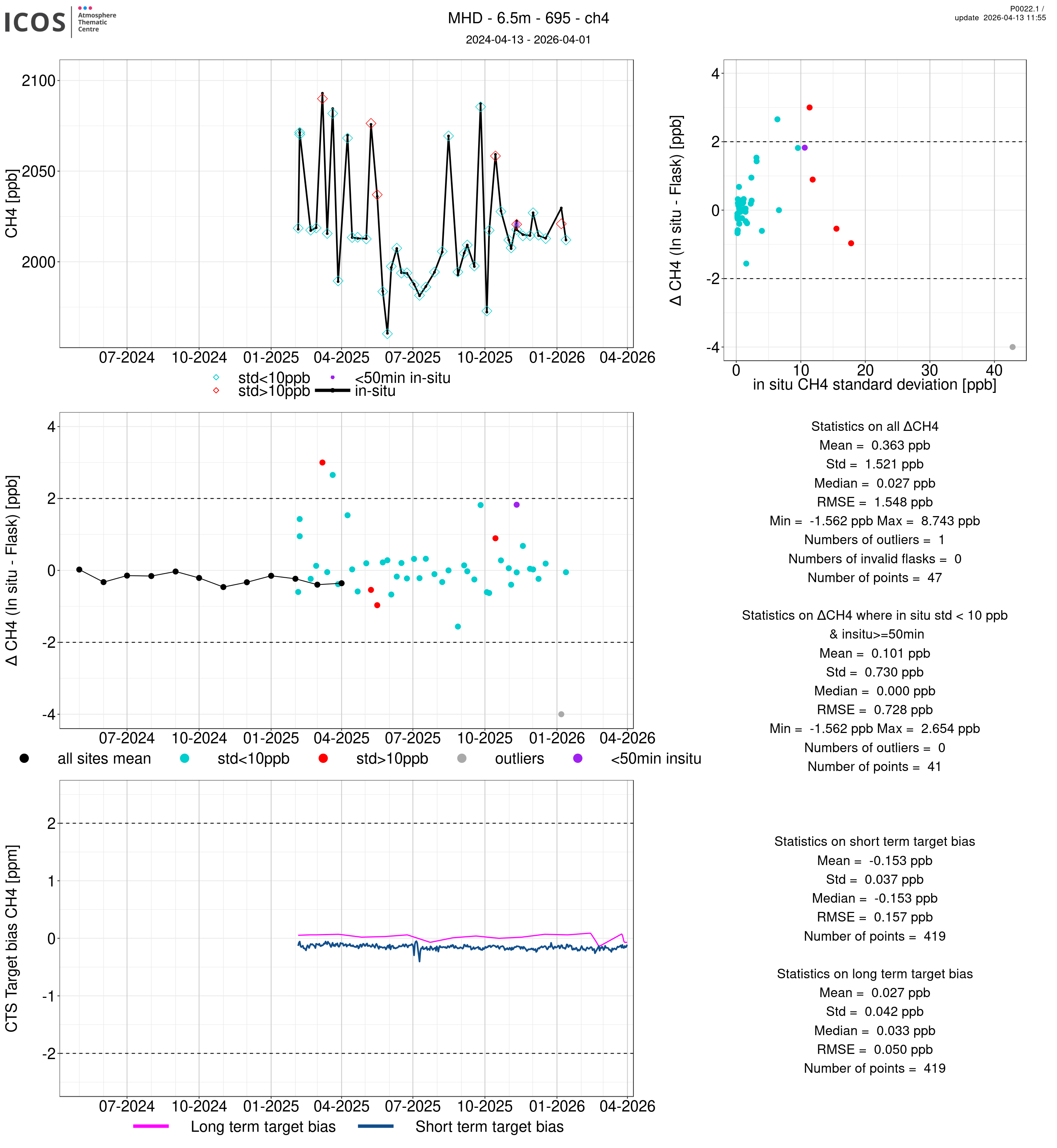P0022.1 product shows the ambient air -flask difference over one year. For the given site and instrument/CTS, the upper left box plot displays the timeseries of air and flask species ; the middle left box shows the air-flask difference over time while the lower left box plot shows the LT and ST bias. The upper right box plot shows the air- flask difference versus the air standard deviation. Colors show the standard deviation categories. Grey points indicates data that are outside the y-axis.
