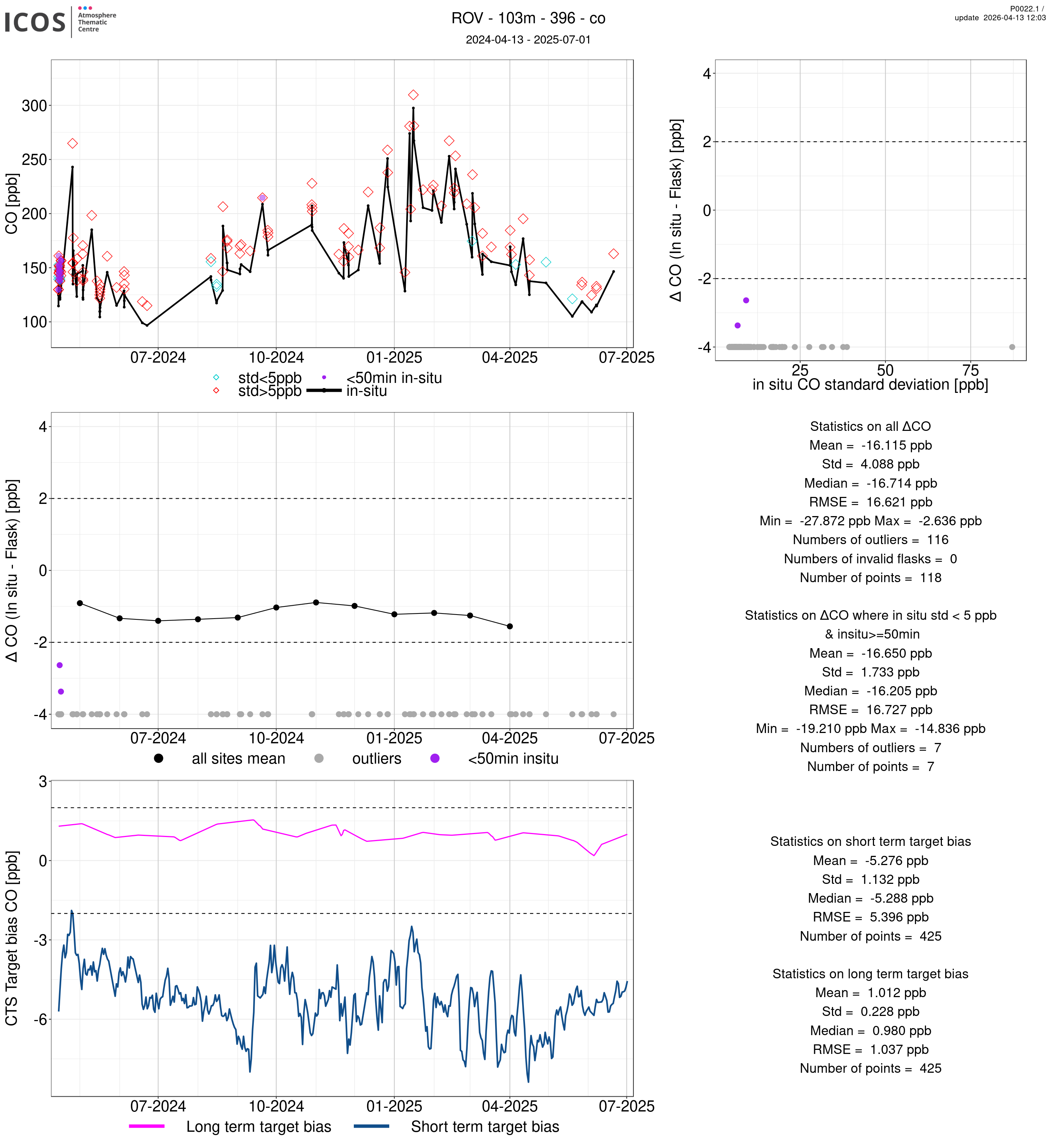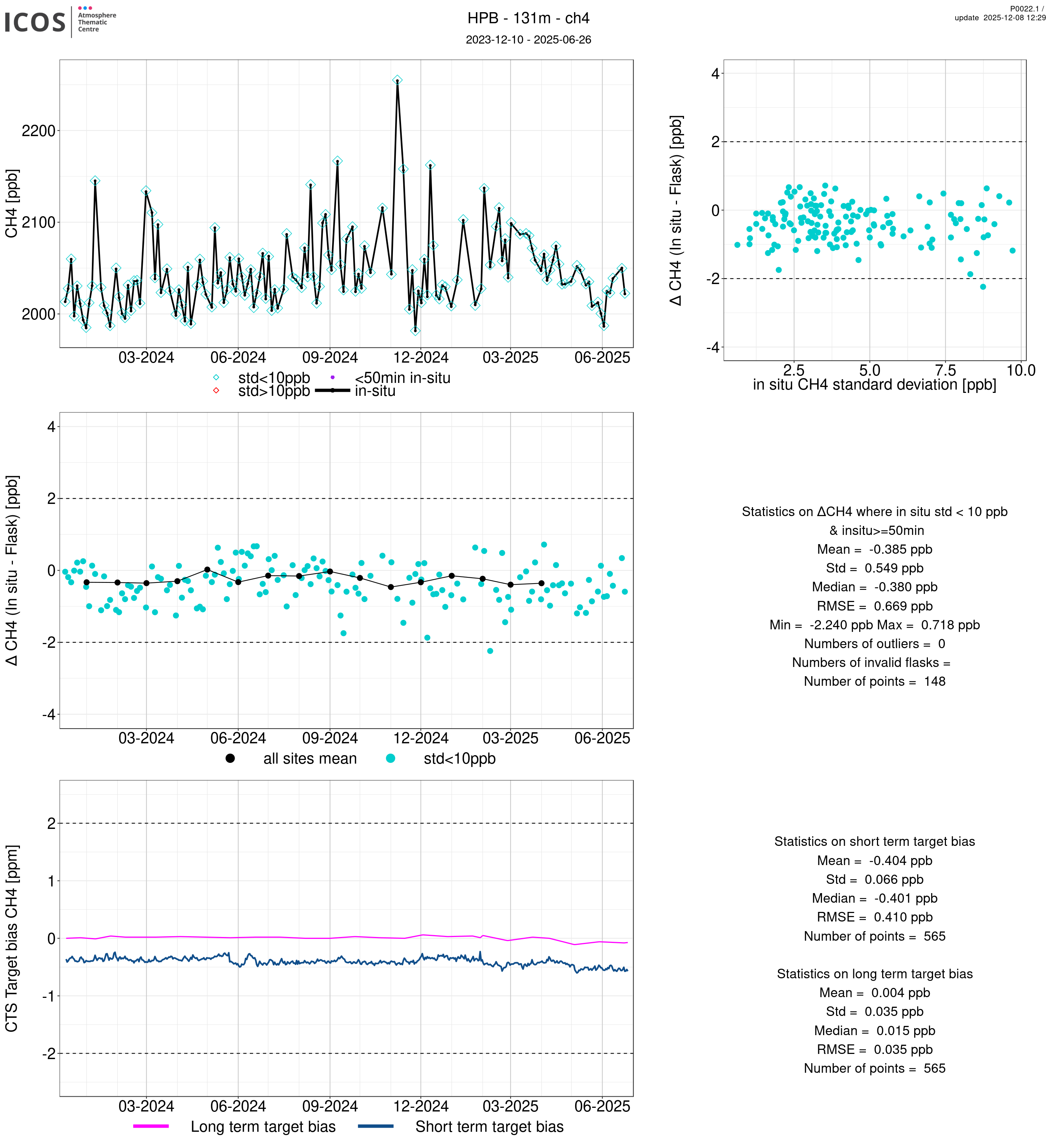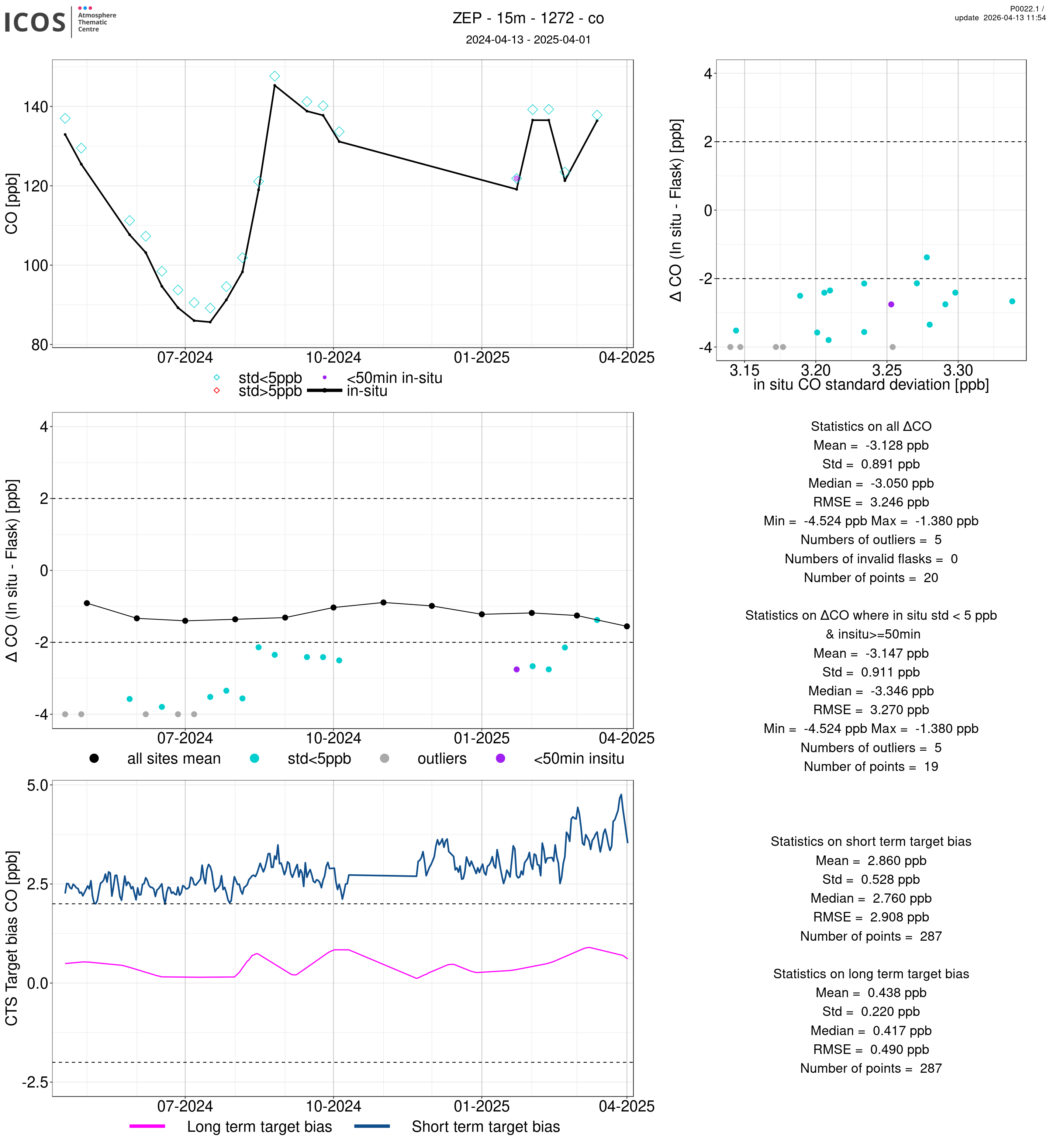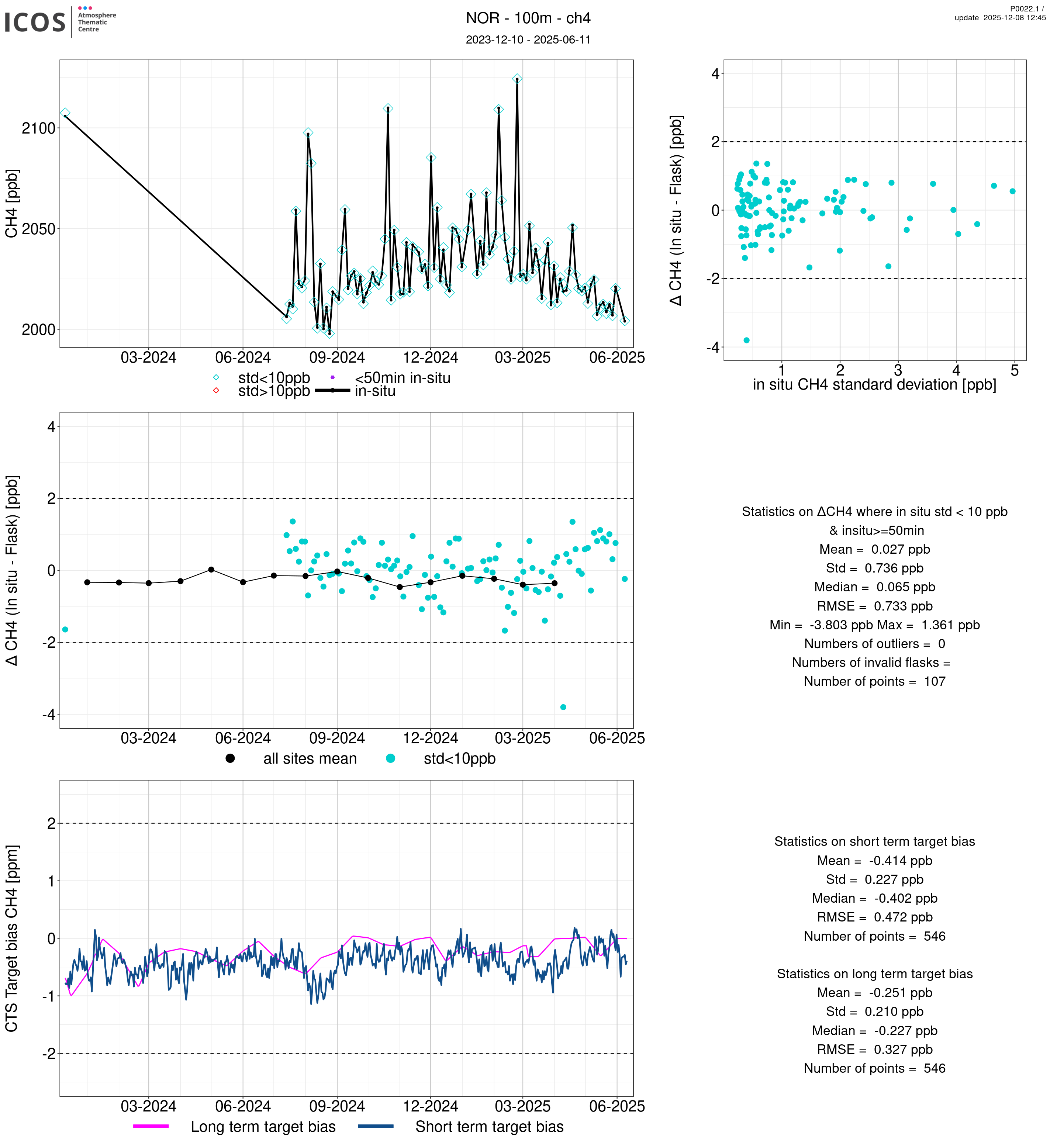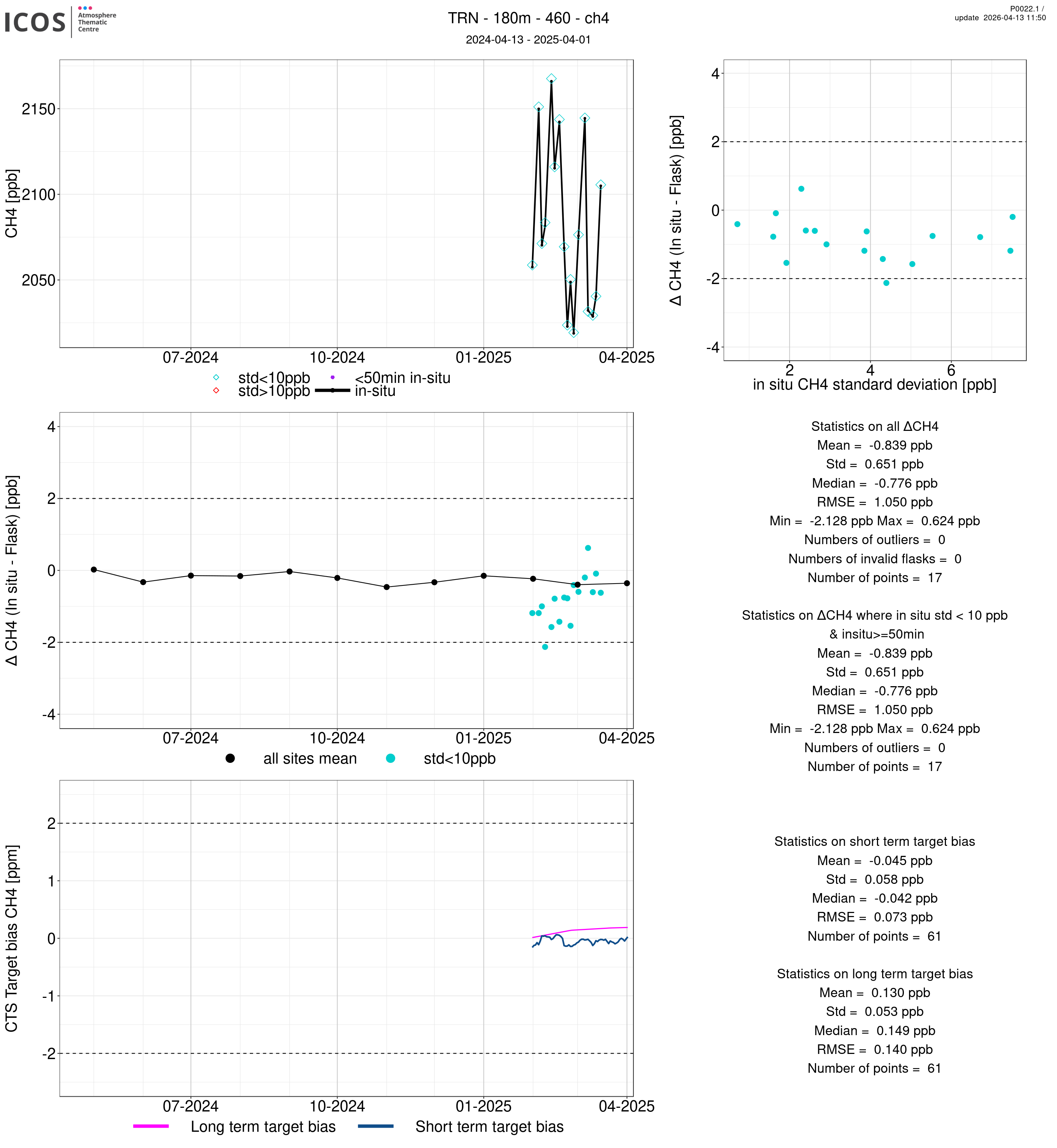 P0022.1 product shows the ambient air -flask difference over one year. For the given site and instrument/CTS, the upper left box plot displays the timeseries of air and flask species ; the middle left box shows the air-flask difference over time while the lower left box plot shows the LT and ST bias. The upper right box plot shows the air- flask difference versus the air standard deviation. Colors show the standard deviation categories. Grey points indicates data that are outside the y-axis.