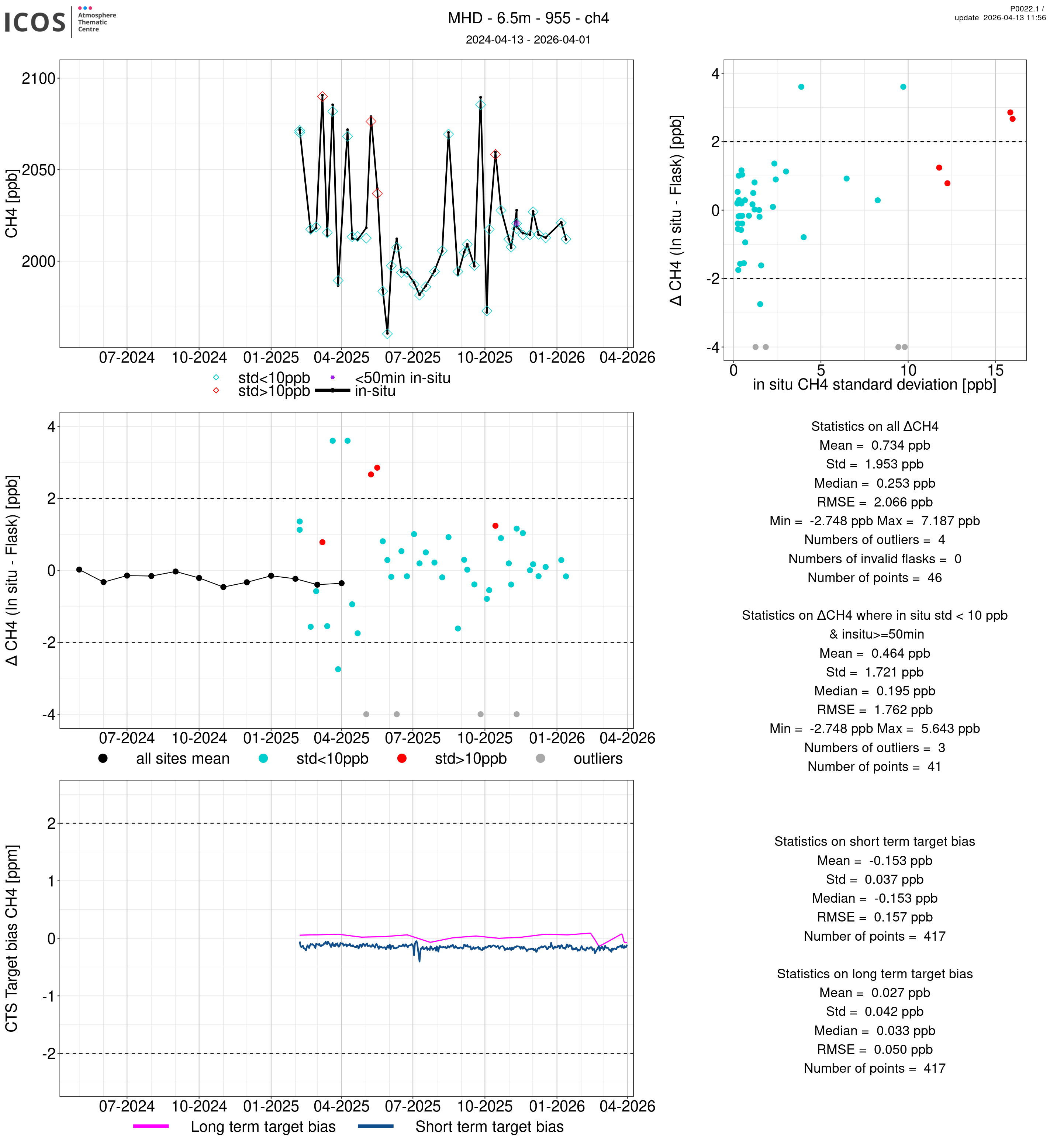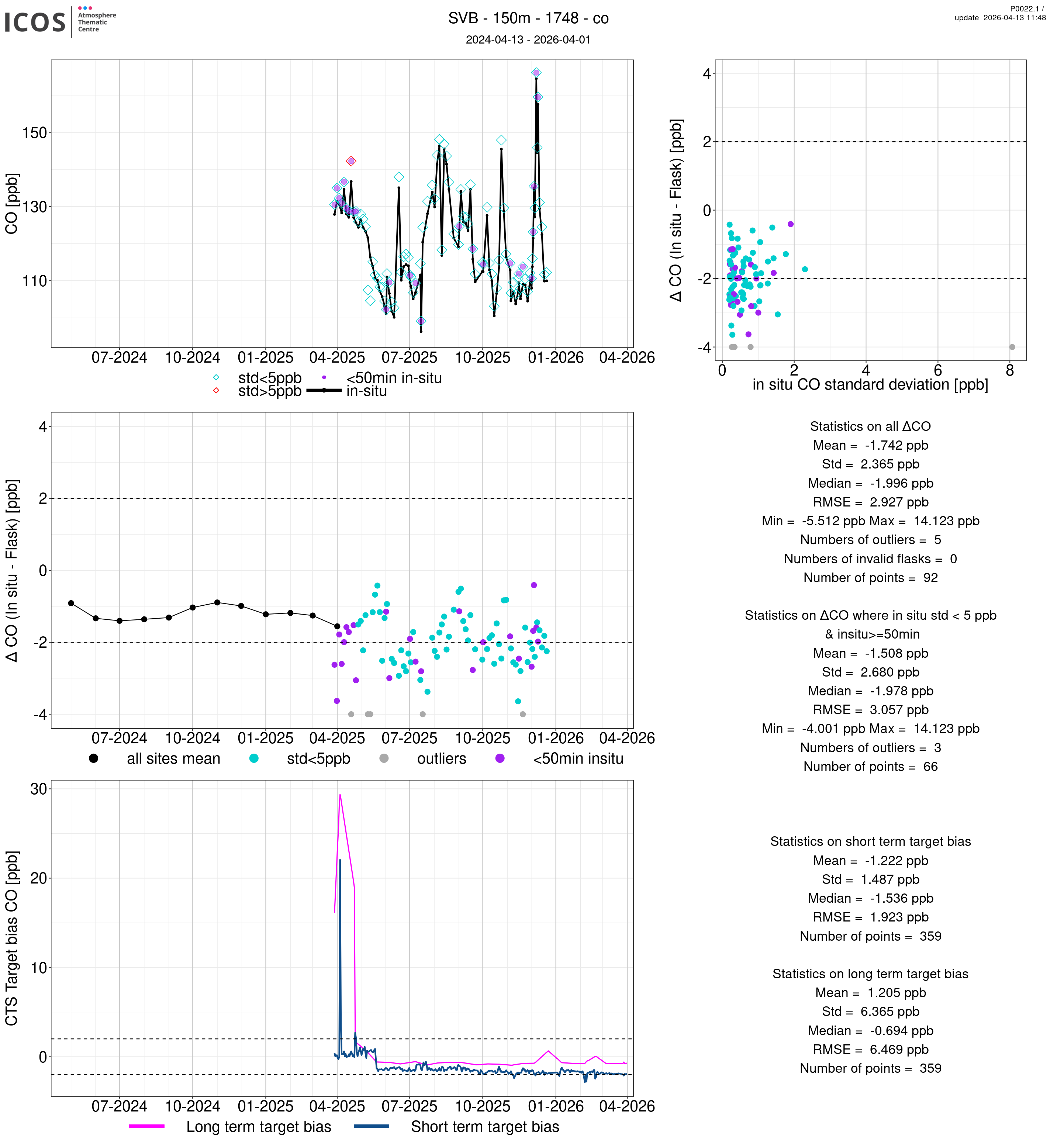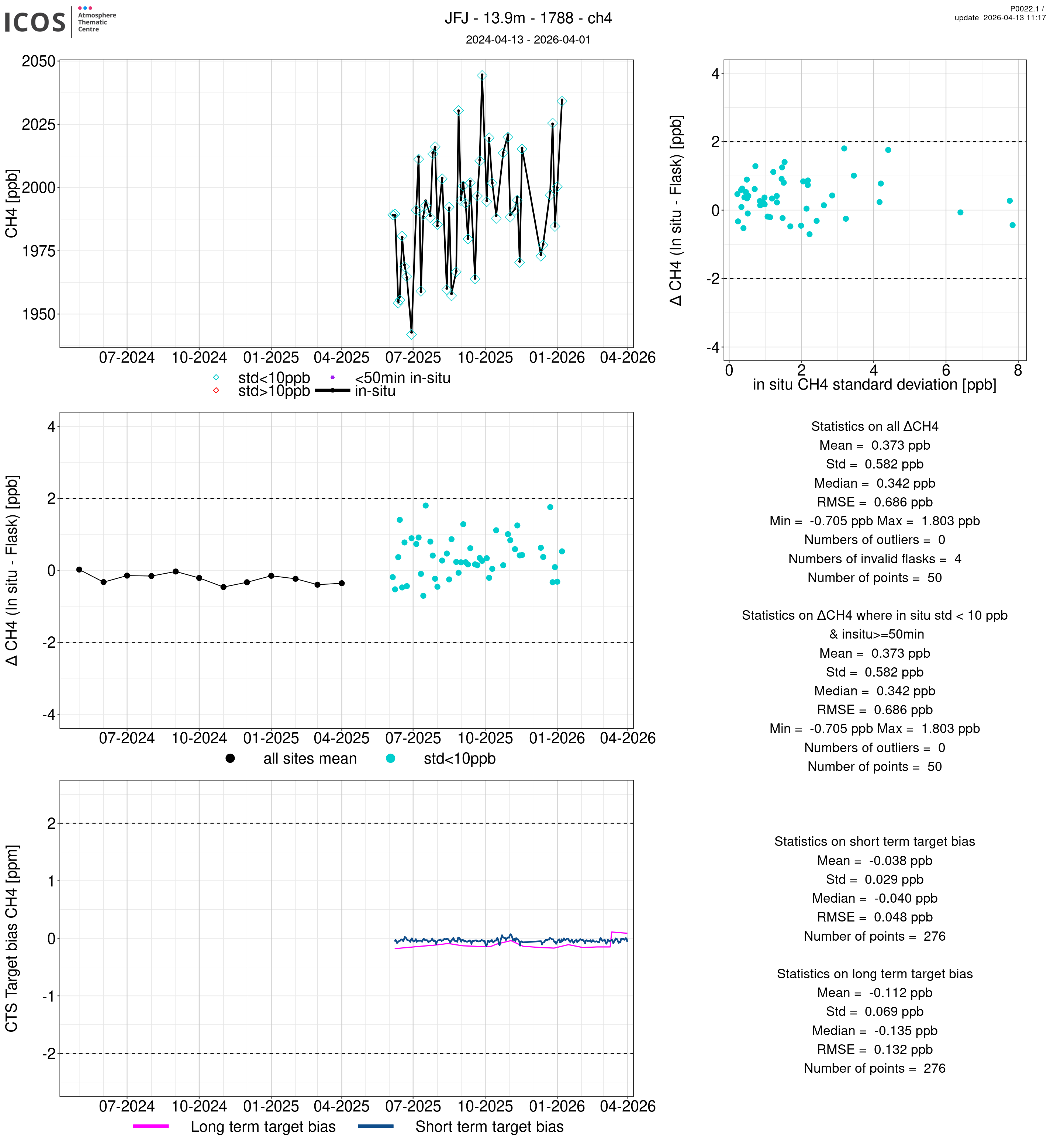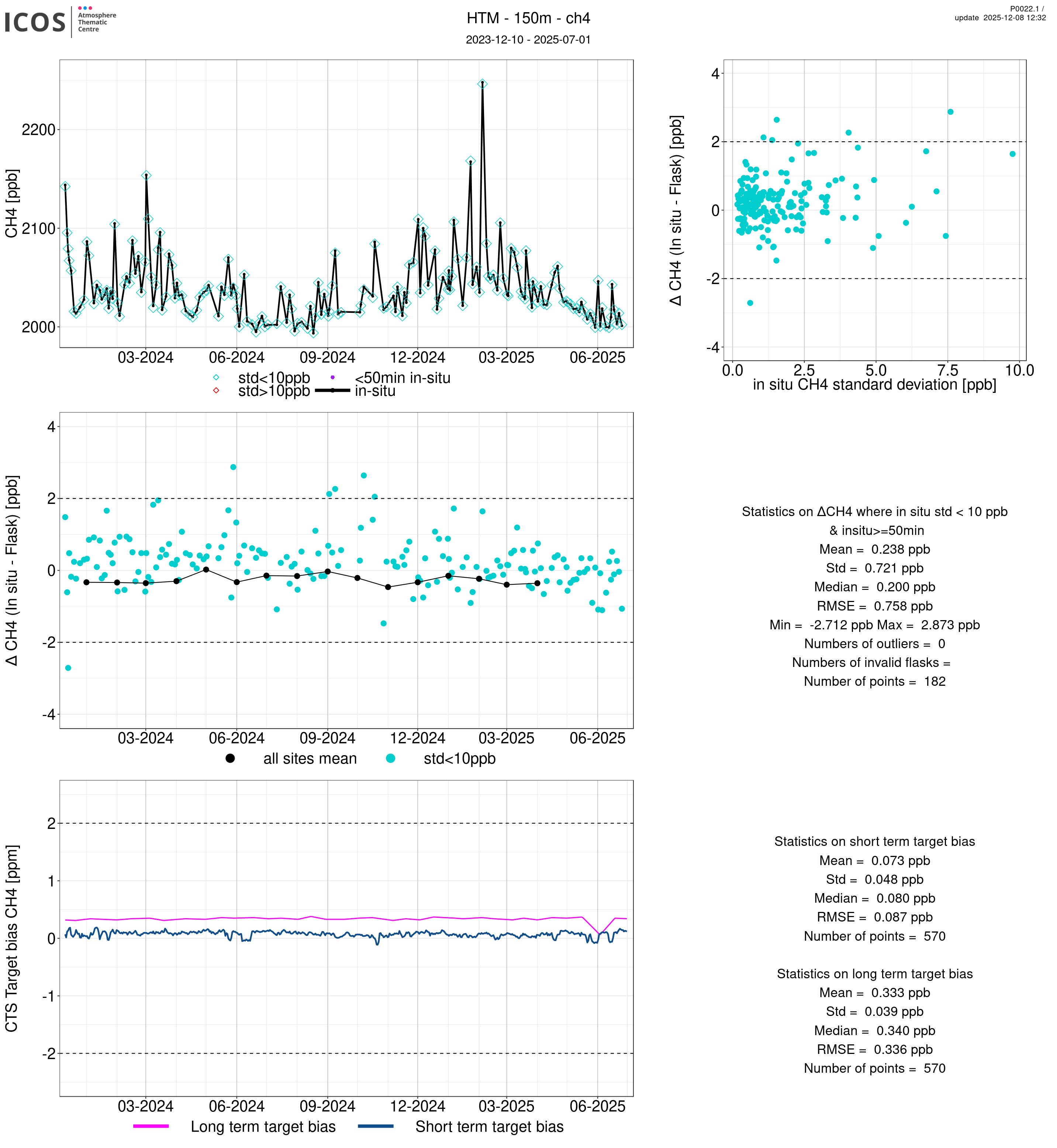 P0022.1 product shows the ambient air -flask difference over one year. For the given site and instrument/CTS, the upper left box plot displays the timeseries of air and flask species ; the middle left box shows the air-flask difference over time while the lower left box plot shows the LT and ST bias. The upper right box plot shows the air- flask difference versus the air standard deviation. Colors show the standard deviation categories. Grey points indicates data that are outside the y-axis.