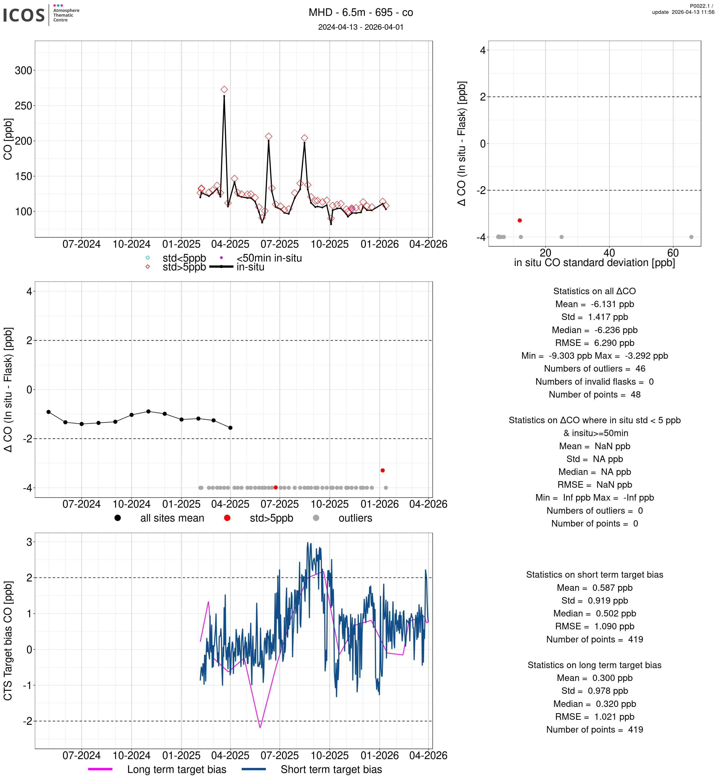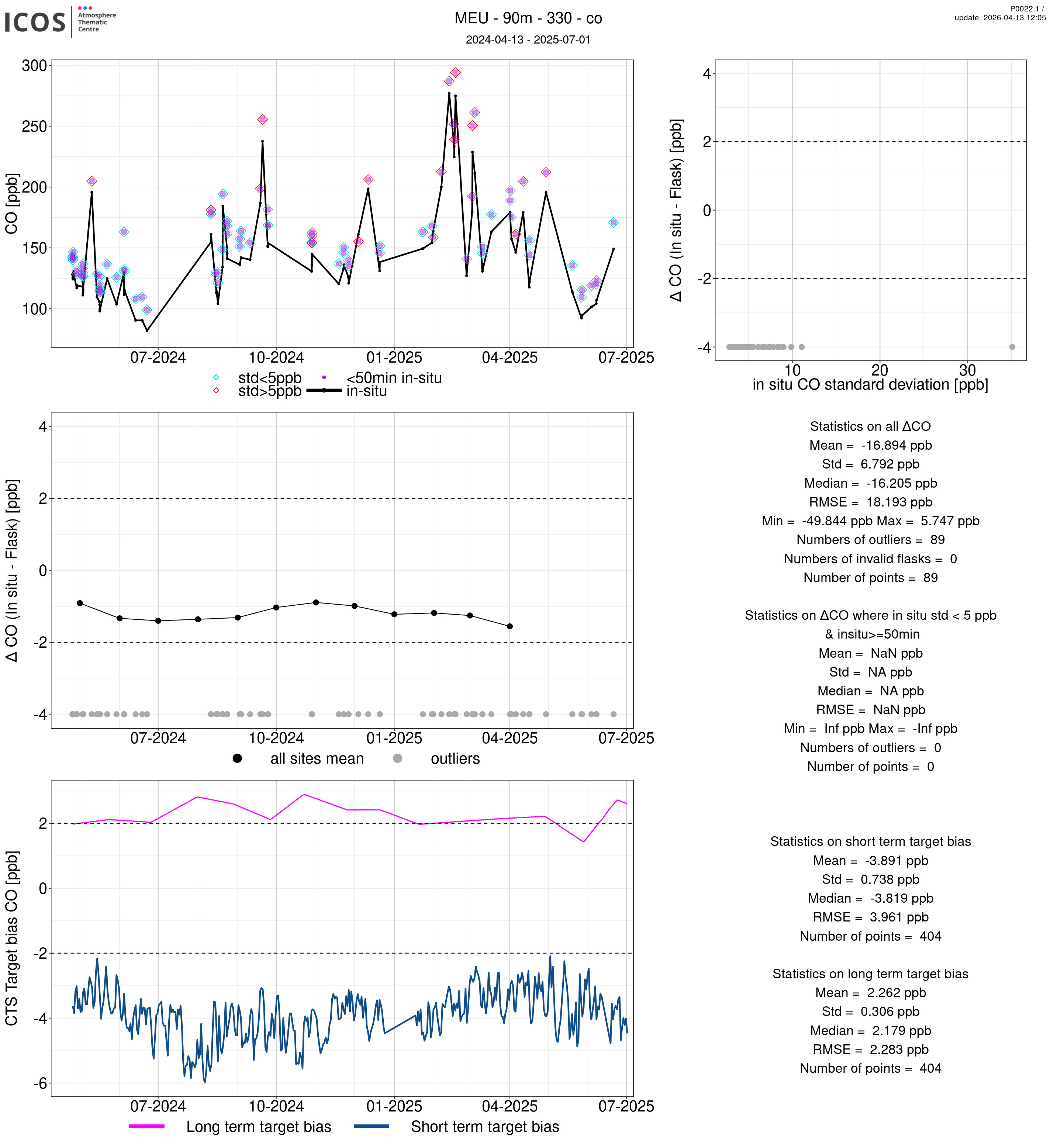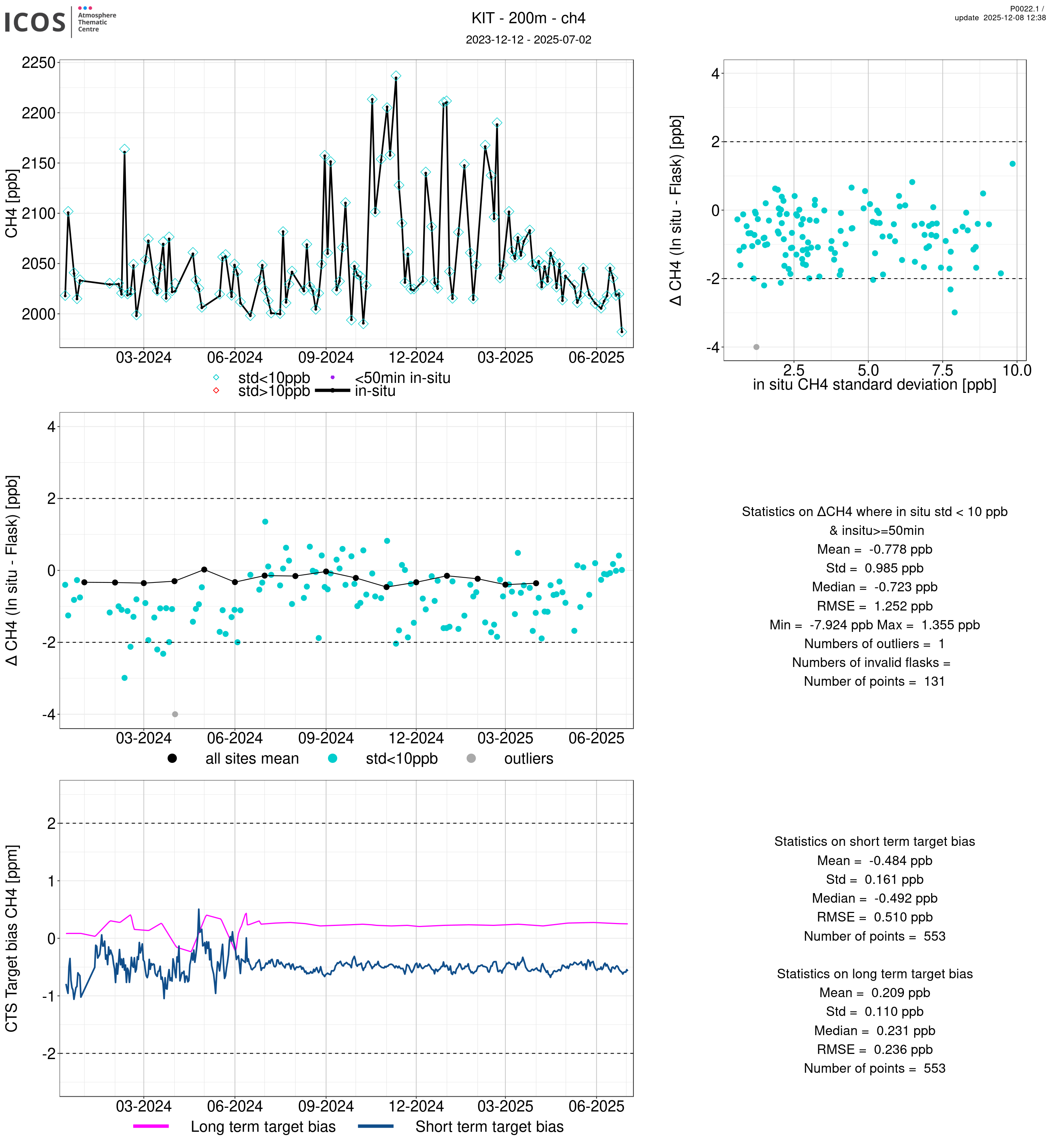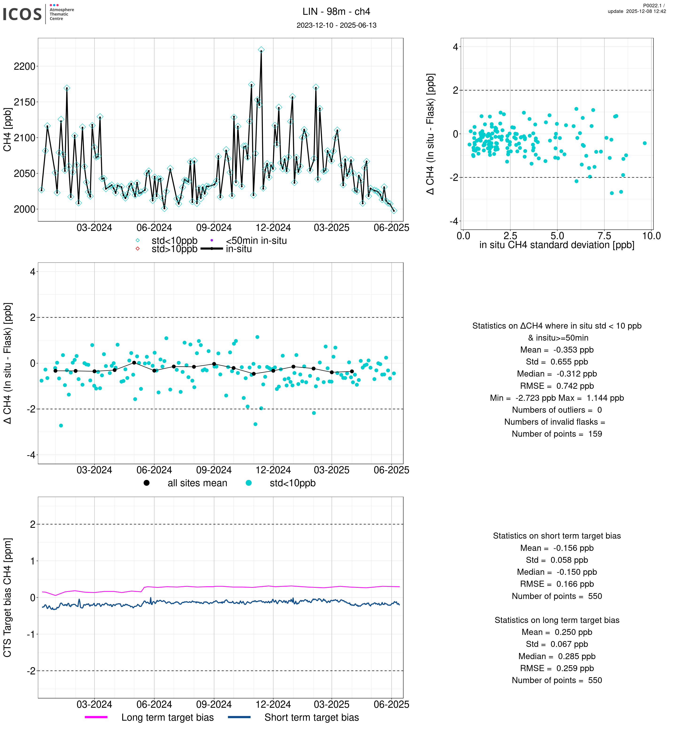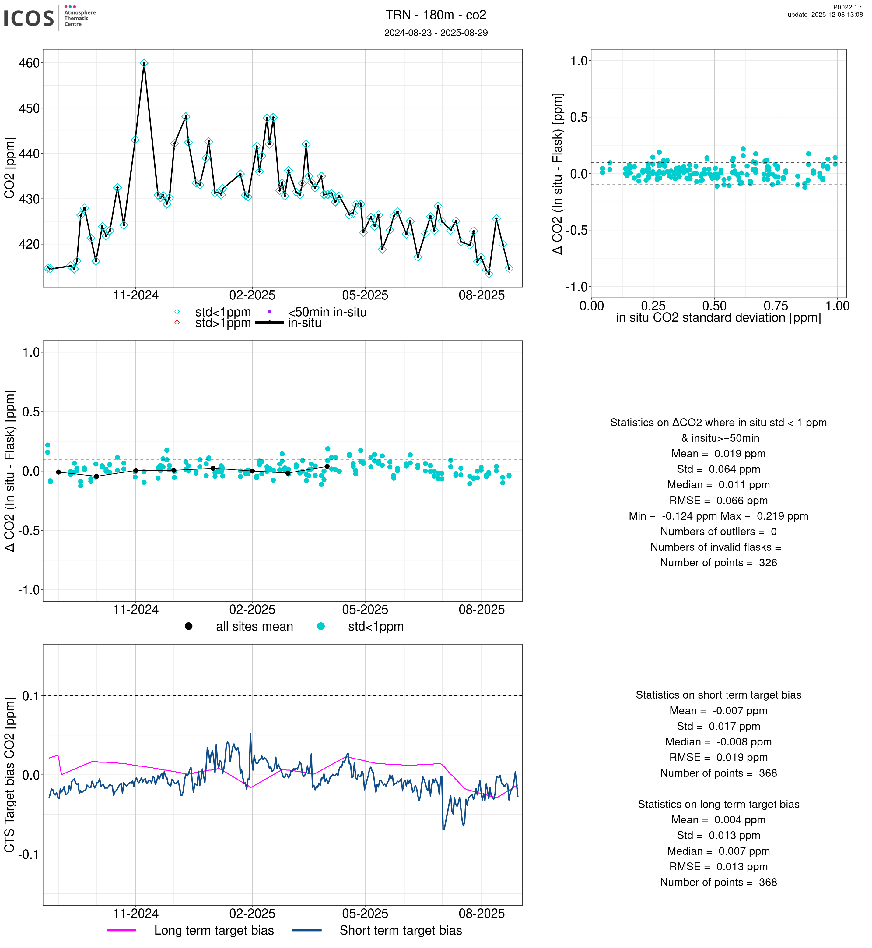 P0022.1 product shows the ambient air -flask difference over one year. For the given site and instrument/CTS, the upper left box plot displays the timeseries of air and flask species ; the middle left box shows the air-flask difference over time while the lower left box plot shows the LT and ST bias. The upper right box plot shows the air- flask difference versus the air standard deviation. Colors show the standard deviation categories. Grey points indicates data that are outside the y-axis.