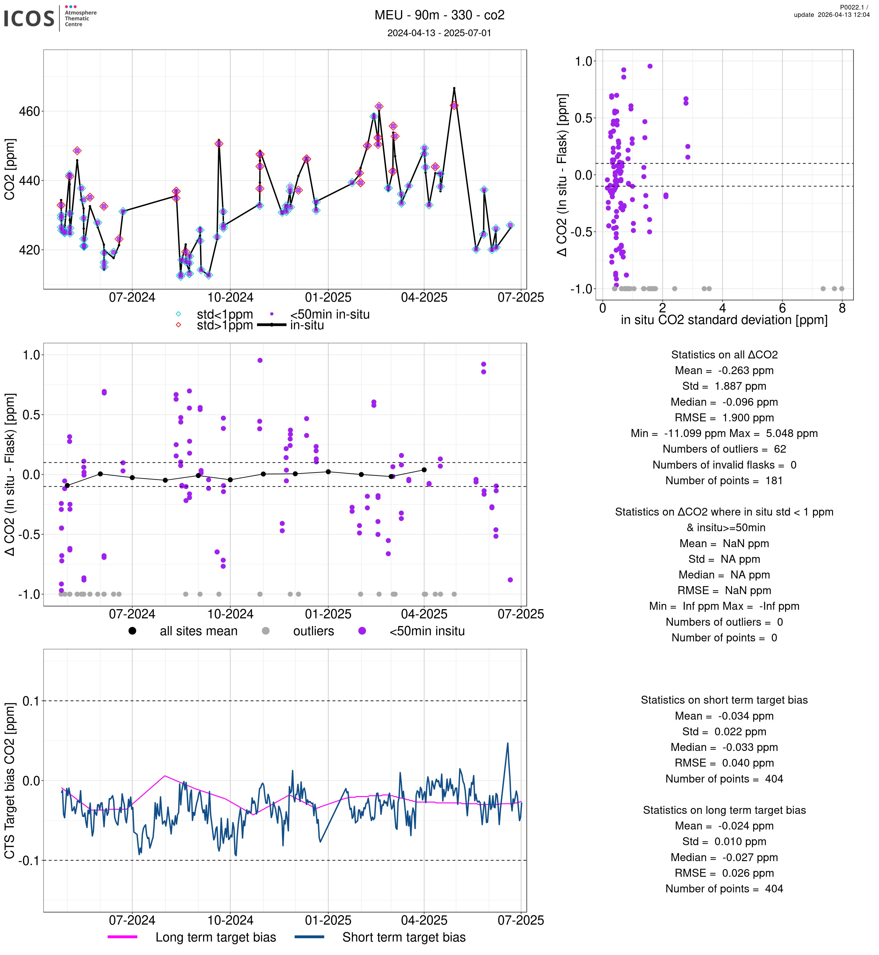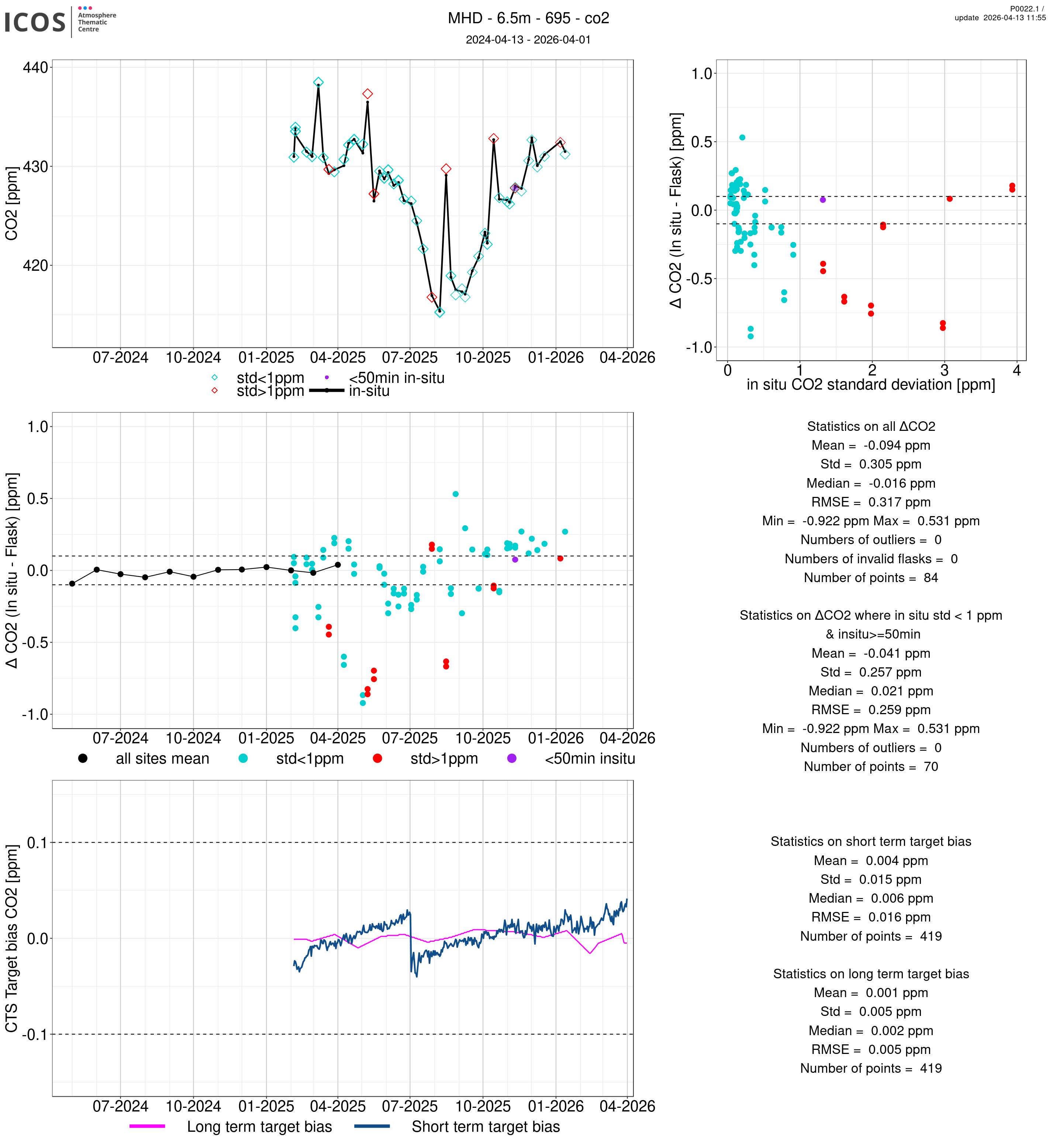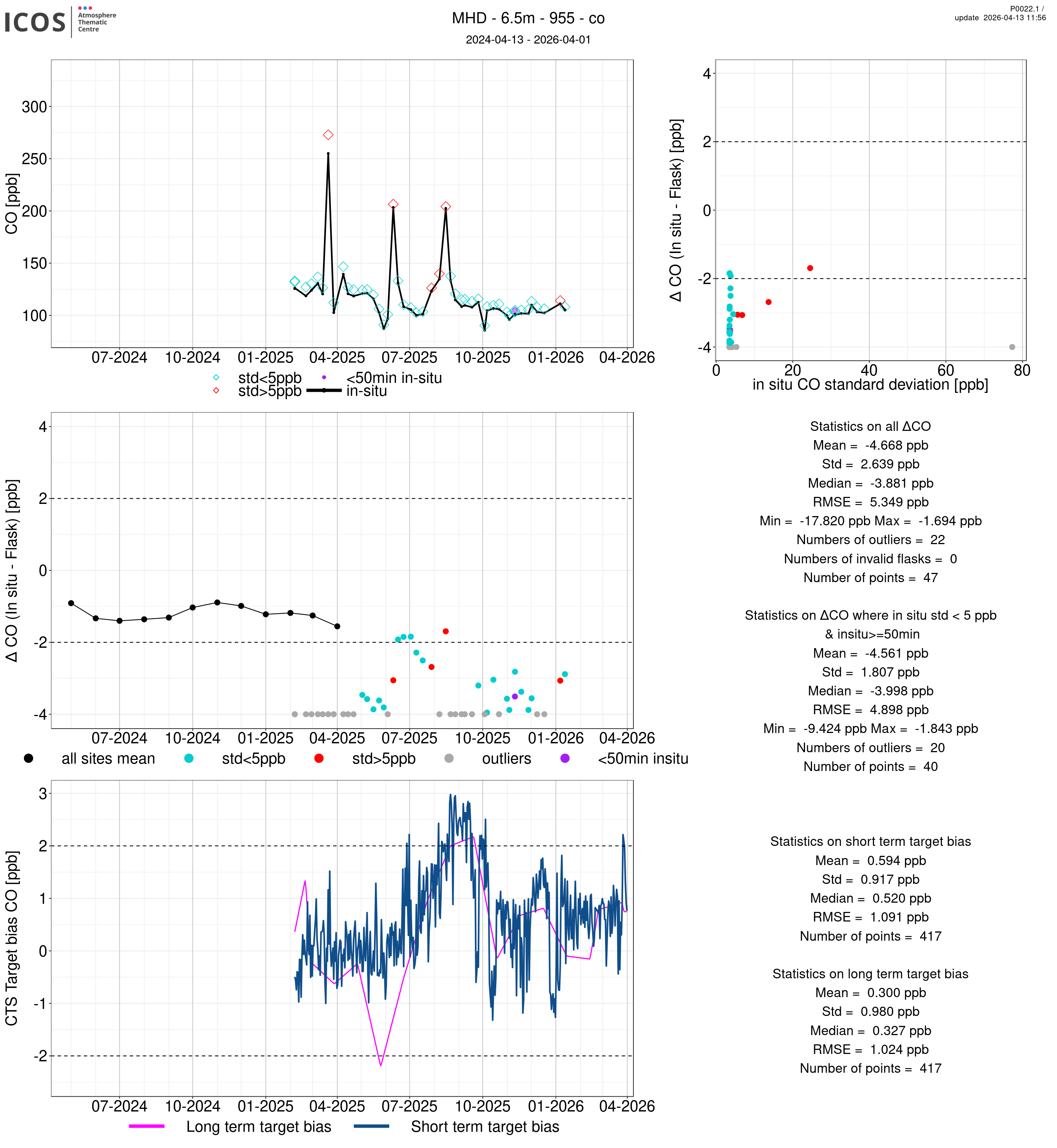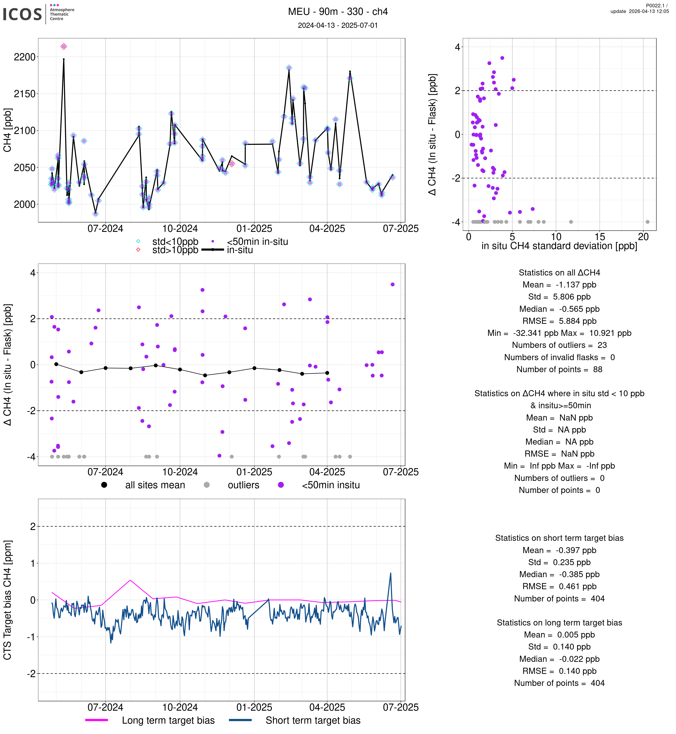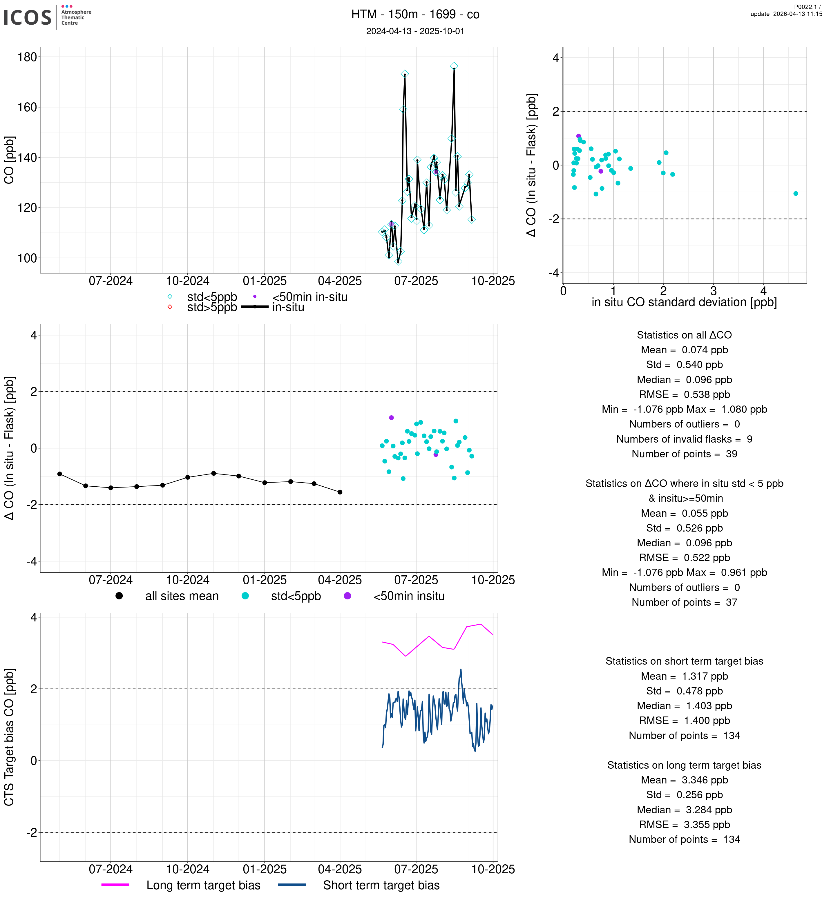 P0022.1 product shows the ambient air -flask difference over one year. For the given site and instrument/CTS, the upper left box plot displays the timeseries of air and flask species ; the middle left box shows the air-flask difference over time while the lower left box plot shows the LT and ST bias. The upper right box plot shows the air- flask difference versus the air standard deviation. Colors show the standard deviation categories. Grey points indicates data that are outside the y-axis.