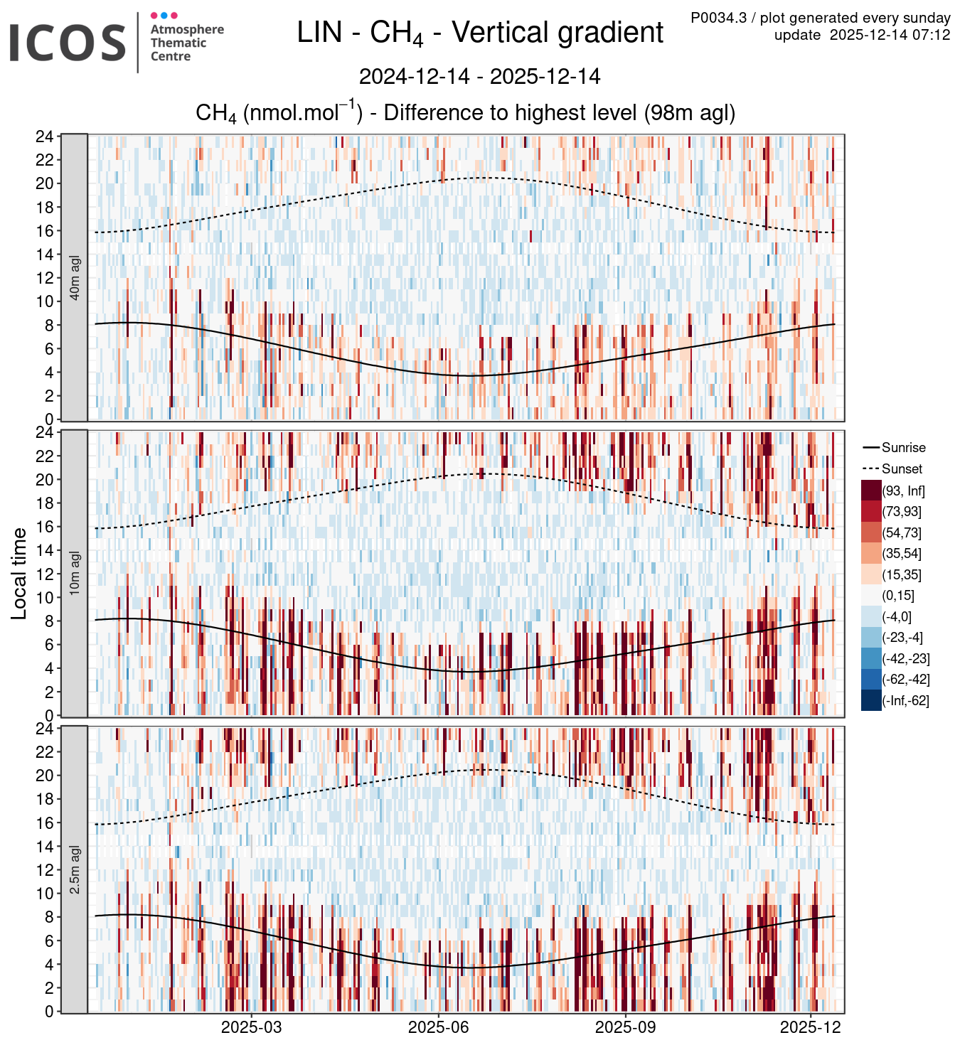 - Data used: hourly mean of GHG air data's molar fraction, continuous time series. Each tick represents: [hourly mean of current sampling height] - [hourly mean of highest sampling height]