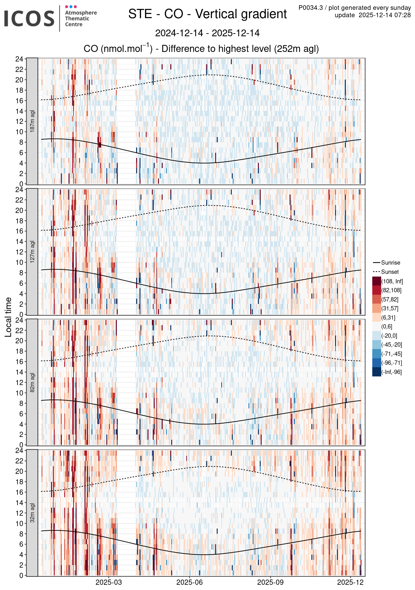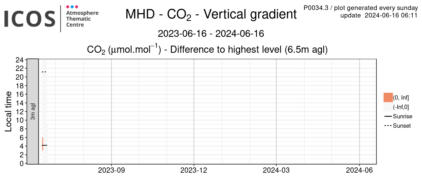 P0034.3 product shows the evolution of the molar fraction difference to highest level hour-by-hour, for each day of the year, for the given site/species. Each box plot displays the difference between the molar fraction of the air measured at the sampling height named in Y-axis title, and the molar fraction of the air measured at the site's maximum sampling height. The black (dotted) lines represents the time of the sunrise and sunset for each day.